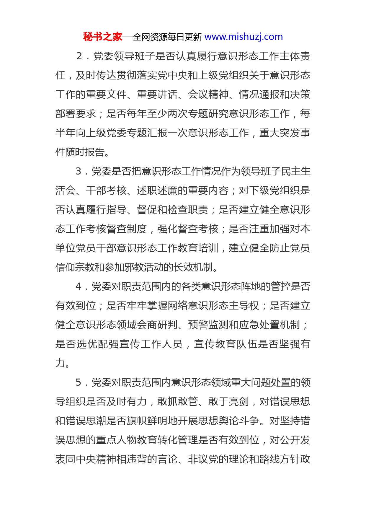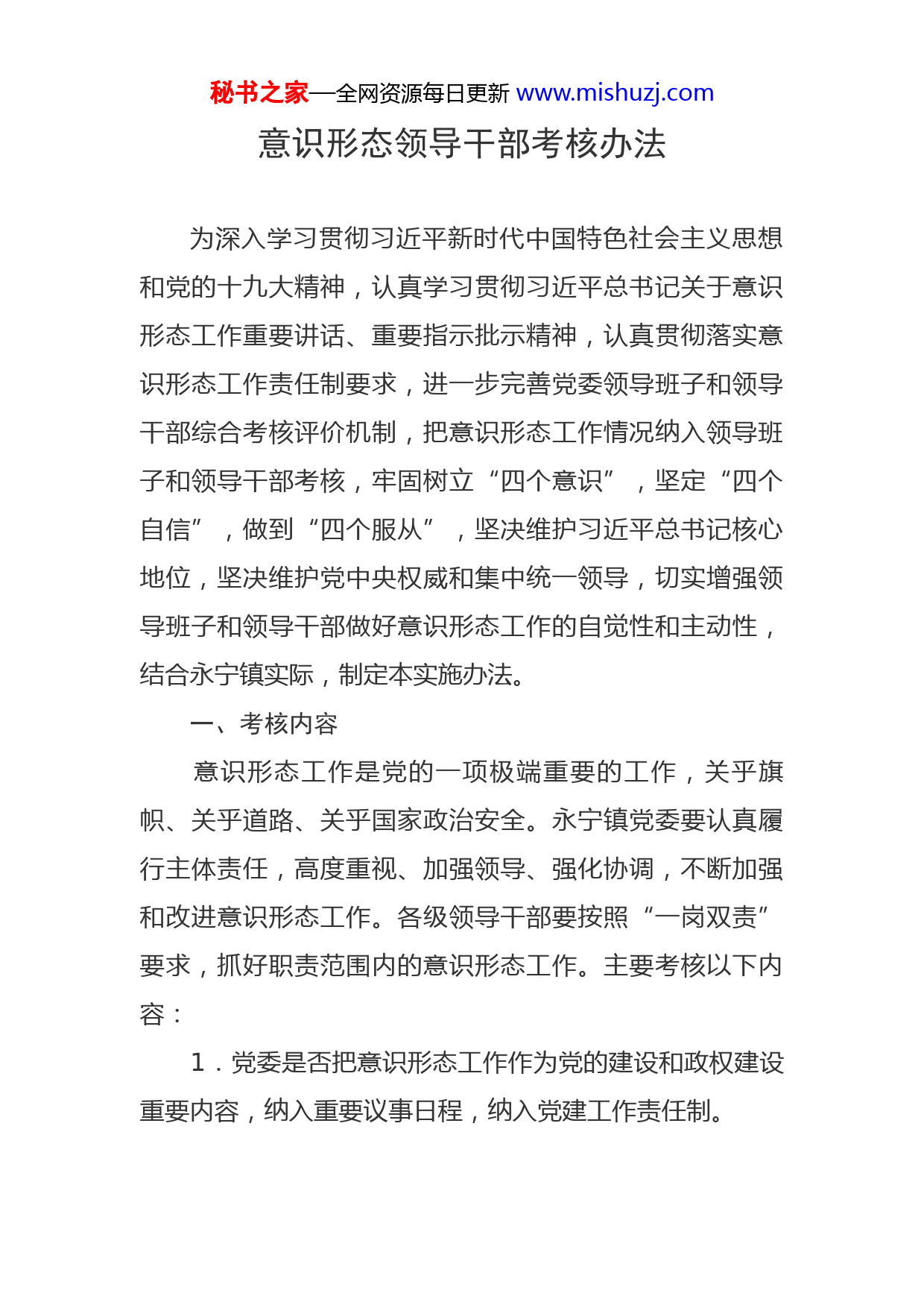 秘书之家—全网资源每日更新www.mishuzj.com意识形态领导干部考核办法为深入学习贯彻习近平新时代中国特色社会主义思想和党的十九大精神,认真学习贯彻习近平总书记关于意识形态工作重要讲话、重要指示批示精神,认真贯彻落实意识形态工作责任制要求,进一步完善党委领导班子和领导干部综合考核评价机制,把意识形态工作情况纳入领导班子和领导干部考核,牢固树立“四个意识”,坚定“四个自信”,做到“四个服从”,坚决维护习近平总书记核心地位,坚决维护党中央权威和集中统一领导,切实增强领导班子和领导干部做好意识形态工作的自觉性和主动性,结合永宁镇实际,制定本实施办法。一、考核内容意识形态工作是党的一项极端重要的工作,关乎旗帜、关乎道路、关乎国家政治安全。永宁镇党委要认真履行主体责任,高度重视、加强领导、强化协调,不断加强和改进意识形态工作。各级领导干部要按照“一岗双责”要求,抓好职责范围内的意识形态工作。主要考核以下内容:1.党委是否把意识形态工作作为党的建设和政权建设重要内容,纳入重要议事日程,纳入党建工作责任制。秘书之家—全网资源每日更新www.mishuzj.com2.党委领导班子是否认真履行意识形态工作主体责任,及时传达贯彻落实党中央和上级党组织关于意识形态工作的重要文件、重要讲话、会议精神、情况通报和决策部署要求;是否每年至少两次专题研究意识形态工作,每半年向上级党委专题汇报一次意识形态工作,重大突发事件随时报告。3.党委是否把意识形态工作情况作为领导班子民主生活会、干部考核、述职述廉的重要内容;对下级党组织是否认真履行指导、督促和检查职责;是否建立健全意识形态工作考核督查制度,强化督查考核;是否注重加强对本单位党员干部意识形态工作教育培训,建立健全防止党员信仰宗教和参加邪教活动的长效机制。4.党委对职责范围内的各类意识形态阵地的管控是否有效到位;是否牢牢掌握网络意识形态主导权;是否建立健全意识形态领域会商研判、预警监测和应急处置机制;是否选优配强宣传工作人员,宣传教育队伍是否坚强有力。5.党委对职责范围内意识形态领域重大问题处置的领导组织是否及时有力,敢抓敢管、敢于亮剑,对错误思想和错误思潮是否旗帜鲜明地开展思想舆论斗争。对坚持错误思想的重点人物教育转化管理是否有效到位,对公开发表同中央精神相违背的言论、非议党的理论和路线方针政秘书之家—全网资源每日更新www.mishuzj.com策及重大决策部署、散布传播政治谣言的党员干部处理是否及时到位,对履行意识形态工作职责不力,导致发生重大问题、造成严重影响的领导干部追责问责是否及时到位。6.党委书记是否落实第一责任人责任,做到重要工作亲自部署、重要问题亲自过问、重大事件亲自处置;分管领导是否落实直接责任人责任,班子其他成员是否履行“一岗双责”,抓好职责范围内的意识形态工作。7.领导干部是否牢固树立马克思主义信仰、认真学习贯彻习近平新时代中国特色社会主义思想和党的十九大精神;是否具有共产主义远大理想和中国特色社会主义共同理想;是否存在理想信念动摇淡化沦丧、搞封建迷信、烧香拜佛、看风水、“不信马列信鬼神”的现象。8.领导干部是否把意识形态工作作为民主生活会和述职报告的重要内容;是否定期到分管办公室和挂点村作形势政策报告和讲党课。9.领导干部是否存有在茶余饭后、生活圈、微信圈口无遮拦,发布“小道”消息,散播政治谣言和不当言论,甚至诋毁党的政策和形象等言行。10.领导干部是否存有爱惜羽毛、鸵鸟心态,对错误思想和言论不闻不问的现象,是否能够发扬斗争精神,对秘书之家—全网资源每日更新www.mishuzj.com否定中国共产党的领导、攻击中国特色社会主义制度等错误思潮和言论,敢抓敢管、敢于亮剑。11.领导干部是否自觉贯彻落实党的宗教工作方针政策;是否不信仰任何形式的宗教;是否带头反对抵制各种形式的邪教、敢于同邪教作斗争。12.领导班子和领导干部在履行意识形态工作职责中受到表扬表彰或责任追究的情况。二、考核对象全镇领导班子和领导干部。三、考核组织实施镇党委、宣传办配合,具体做好意识形态工作具体考核实施,充分发挥职能作用,密切协作配合,全面、准确、客观地做好考核工作,把中央和省委、市委的各项要求落到实处。1.对干部进行“政治体检”,在领导班子和领导干部年度考核、任期考核、干部考察等工作中,把意识形态工作情况作为重要内容,贯穿到领导班子和领导干部考核考察的全过程。把意识形态工作作为党的建设的重要内容,定期考核调度。把意识形态工作作为民主生活会(组织生活会)对照检查材料和个人发言的重要内容,督导跟踪了解情况。年度考核个人述职要述意识形态工作情况,民主测评时测意识形态工作情况,民意调查中着重了解意识形秘书之家—全网资源每日更新www.mishuzj.com态工作情况,广泛深入地了解掌握考核对象做好意识形态工作的实绩。把意识形态工作情况纳入基层党组织书记抓基层党建工作述职评议考核内容。2.建立意识形态工作情况协调通报机制,调度汇总领导班子和领导干部落实意识形态工作责任制情况,加强分析研判。对领导干部在意识形态领域重大突发问题处置方面的表现