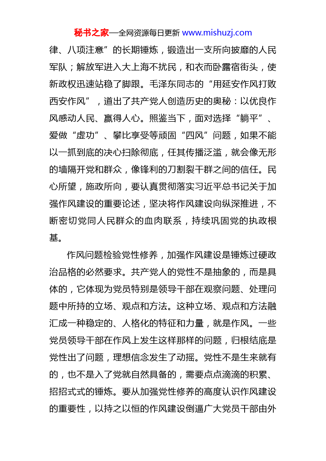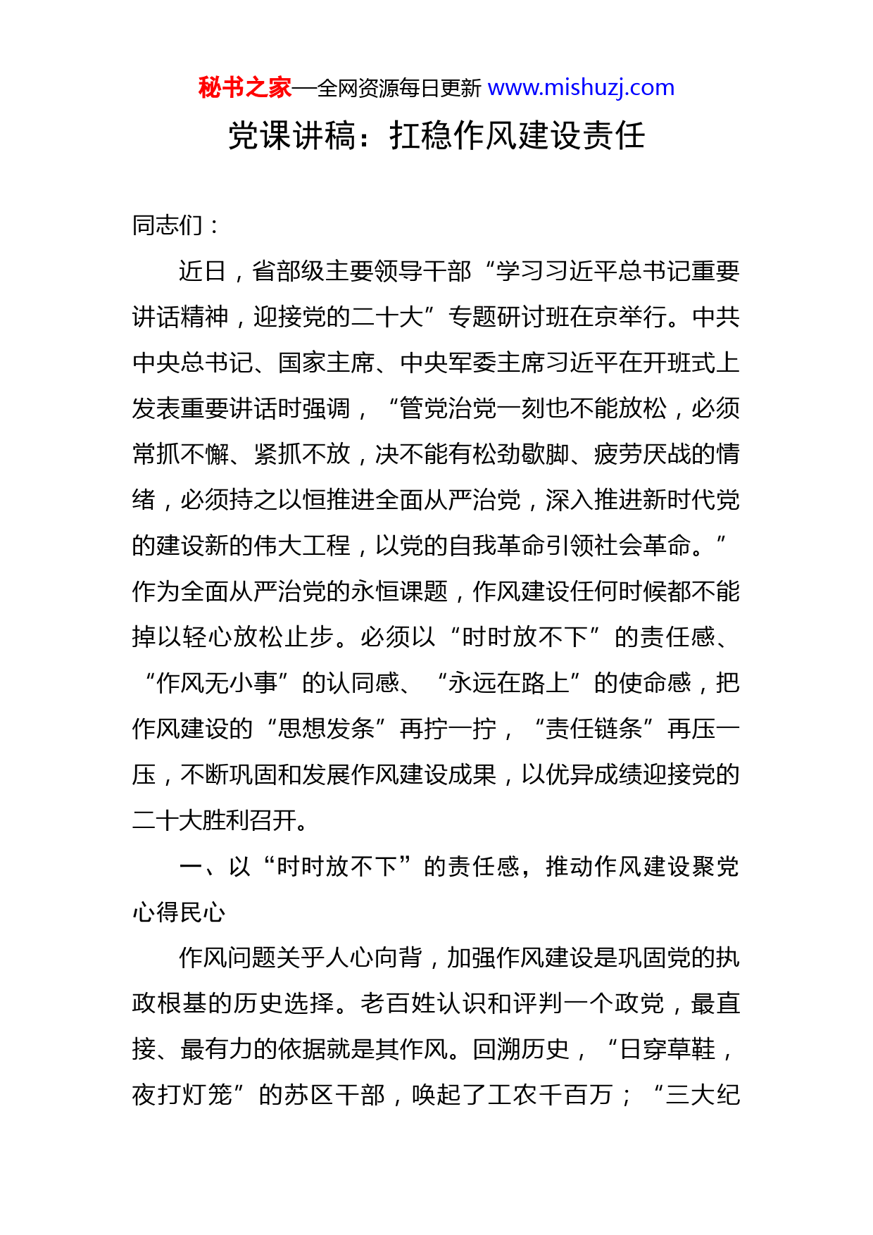秘书之家—全网资源每日更新www.mishuzj.com党课讲稿:扛稳作风建设责任同志们:近日,省部级主要领导干部“学习习近平总书记重要讲话精神,迎接党的二十大”专题研讨班在京举行。中共中央总书记、国家主席、中央军委主席习近平在开班式上发表重要讲话时强调,“管党治党一刻也不能放松,必须常抓不懈、紧抓不放,决不能有松劲歇脚、疲劳厌战的情绪,必须持之以恒推进全面从严治党,深入推进新时代党的建设新的伟大工程,以党的自我革命引领社会革命。”作为全面从严治党的永恒课题,作风建设任何时候都不能掉以轻心放松止步。必须以“时时放不下”的责任感、“作风无小事”的认同感、“永远在路上”的使命感,把作风建设的“思想发条”再拧一拧,“责任链条”再压一压,不断巩固和发展作风建设成果,以优异成绩迎接党的二十大胜利召开。一、以“时时放不下”的责任感,推动作风建设聚党心得民心作风问题关乎人心向背,加强作风建设是巩固党的执政根基的历史选择。老百姓认识和评判一个政党,最直接、最有力的依据就是其作风。回溯历史,“日穿草鞋,夜打灯笼”的苏区干部,唤起了工农千百万;“三大纪秘书之家—全网资源每日更新www.mishuzj.com律、八项注意”的长期锤炼,锻造出一支所向披靡的人民军队;解放军进入大上海不扰民,和衣而卧露宿街头,使新政权迅速站稳了脚跟。毛泽东同志的“用延安作风打败西安作风”,道出了共产党人创造历史的奥秘:以优良作风感动人民、赢得人心。照鉴当下,面对选择“躺平”、爱做“虚功”、攀比享受等顽固“四风”问题,如果不能以一抓到底的决心扫除彻底,任其传播泛滥,就会像无形的墙隔开党和群众,像锋利的刀割裂干群之间的信任。民心所望,施政所向,要认真贯彻落实习近平总书记关于加强作风建设的重要论述,坚决将作风建设向纵深推进,不断密切党同人民群众的血肉联系,持续巩固党的执政根基。作风问题检验党性修养,加强作风建设是锤炼过硬政治品格的必然要求。共产党人的党性不是抽象的,而是具体的,它体现为党员特别是领导干部在观察问题、处理问题中所持的立场、观点和方法。这种立场、观点和方法融汇成一种稳定的、人格化的特征和力量,就是作风。一些党员领导干部在作风上发生这样那样的问题,归根结底是党性出了问题,理想信念发生了动摇。党性不是生来就有的,也不是入了党就自然具备的,需要点点滴滴的积累、招招式式的锤炼。要从加强党性修养的高度认识作风建设的重要性,以持之以恒的作风建设倒逼广大党员干部由外秘书之家—全网资源每日更新www.mishuzj.com至内、由表及里转变作风,着力锤炼出过硬的政治品格,从根上消除“四风”问题。作风问题决定事业成败,加强作风建设是推动党和人民事业发展的重要保障。越是爬山过坎,越是需要“滚石上山”的扎实作风,凝聚克难攻坚的奋进合力。任何不求有功、但求无过的“撞钟和尚”式作风,推一下动一下的“提线木偶”式作风,遇到问题推、看到矛盾绕的“太极大师”式作风,口号喊得响、行动轻飘飘“说唱歌手”式作风,脚不沾地、鞋不沾泥的“墙上芦苇”式作风,都是党和人民事业发展的“拦路虎”和“绊脚石”,必须彻底清除。要牢记习近平总书记“时时放心不下”的谆谆教诲,深刻认识作风建设的重要性和紧迫性,自觉把思想和行动统一到党中央的重大决策部署上来,把作风建设引向深入,为全面建设社会主义现代化国家提供坚强纪律和作风保障。二、以“作风无小事”的认同感,推动作风建设走深走实以作风建设服务“稳字当头、稳中求进”的工作总基调。今年经济社会发展任务重、挑战多,要坚决按照以习近平同志为核心的党中央部署要求,坚持稳字当头、稳中求进,扎实做好各项工作,推动高质量发展。市场主体是发展的关键元素,要以市场主体需求为导向,完善服务企秘书之家—全网资源每日更新www.mishuzj.com业“直通车”制度,围绕“高效办成一件事”,纵深推进“五减”“四办”(减时间、减环节、减材料、减成本、减次数;马上办、网上办、就近办、一次办),深入开展“清减降”专项行动。着力整治中小企业融资、工程建设项目审批等方面的顽瘴痼疾,让更多市场主体切实感受到作风建设成果。基层是抓落实的“最后一公里”,要聚焦“层层加码”问题,大力纠治文山会海、随意开展督查检查考核、痕迹管理过度、“指尖上的形式主义”等问题,真正把基层干部从形式主义和官僚主义的桎梏、“套路”中解脱出来,努力营造真抓实干、抓好落实的干事环境。以作风建设守住“生命至上、责重如山”的安全底线。安全是发展的前提,没有安全的基石,发展就无从谈起。在疫情防控方面,各级党组织和广大党员干部要紧紧围绕常态化疫情防控强化作风建设,坚决克服麻痹思想、厌战情绪、侥幸心理、松劲心态,坚决守护来之不易的防疫成果。在安全生产方面,要凝聚“安全生产责重如山”的共识,居安思危、防范在前,压紧压实各级职能部门的监管责任、属地责任等,以守土有责、守土尽责的良好作风抓好安全生产责任落实。在社会稳定方面,要认真做好送上门的群众工作,善于从信访举报中发现作风问题,严字当头整治作风问题,坚决将危害社会稳定的苗头性问题扼杀在摇篮之中。秘书之家—