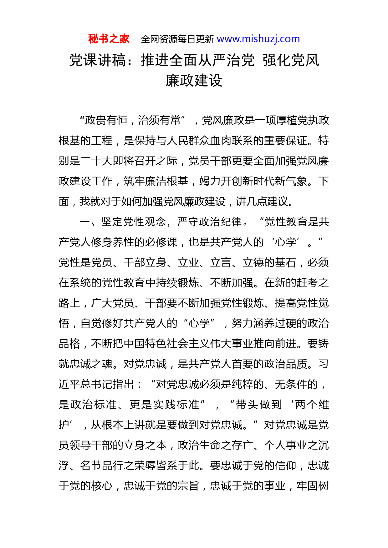 秘书之家—全网资源每日更新www.mishuzj.com党课讲稿:推进全面从严治党强化党风廉政建设“政贵有恒,治须有常”,党风廉政是一项厚植党执政根基的工程,是保持与人民群众血肉联系的重要保证。特别是二十大即将召开之际,党员干部更要全面加强党风廉政建设工作,筑牢廉洁根基,竭力开创新时代新气象。下面,我就对于如何加强党风廉政建设,讲几点建议。一、坚定党性观念,严守政治纪律。“党性教育是共产党人修身养性的必修课,也是共产党人的‘心学’。”党性是党员、干部立身、立业、立言、立德的基石,必须在系统的党性教育中持续锻炼、不断加强。在新的赶考之路上,广大党员、干部要不断加强党性锻炼、提高党性觉悟,自觉修好共产党人的“心学”,努力涵养过硬的政治品格,不断把中国特色社会主义伟大事业推向前进。要铸就忠诚之魂。对党忠诚,是共产党人首要的政治品质。习近平总书记指出:“对党忠诚必须是纯粹的、无条件的,是政治标准、更是实践标准”,“带头做到‘两个维护’,从根本上讲就是要做到对党忠诚。”对党忠诚是党员领导干部的立身之本,政治生命之存亡、个人事业之沉浮、名节品行之荣辱皆系于此。要忠诚于党的信仰,忠诚于党的核心,忠诚于党的宗旨,忠诚于党的事业,牢固树秘书之家—全网资源每日更新www.mishuzj.com立“四个意识”,自觉做到“四个服从”,坚定不移地在思想上政治上行动上同以习近平同志为核心的党中央保持高度一致,为党和人民事业尽忠职守。要坚定理想信念。理想信念动摇是最危险的动摇,理想信念滑坡是最危险的滑坡。习近平总书记指出,修身立德是为政之基,从不敢、不能到不想,要靠铸牢理想信念这个共产党人的魂。用坚定理想信念练就“金刚不坏之身”,干部才能在大是大非面前旗帜鲜明,在风浪考验面前无所畏惧,在各种诱惑面前立场坚定,平时能看得出来,关键时刻能站得出来,生死关头能豁得出来。作为党员领导干部要时刻牢记“我是谁、为了谁、依靠谁”,切实做到在重大政治考验面前立场坚定、是非分明;对工作极端负责,在急难险重任务面前勇挑重担;吃苦在前、享受在后,拒腐蚀、永不沾,永葆共产党人的先进性、纯洁性。要有好的精神状态。对于共产党员和领导干部来说,精神状态问题其实是党性修养问题,是能否保持先进性的问题。现在一些单位、一些部门工作打不开局面,多少年来面貌依旧,甚至问题越积越多,形成积重难返之势,不是那里的客观条件比别的地方差,关键是那里的领导班子特别是主要领导同志精神状态有问题。他们之中,有的热衷于跑官要官,根本不把主要心思用在工作上;有的绞尽脑汁以权谋私,在群众中威信扫地;有的存在畏难情绪,干工作不求有功但秘书之家—全网资源每日更新www.mishuzj.com求无过,敢于维持现状,当“太平官”。志存高远,肩担道义,以为人民服务为宗旨,以民族复兴为己任,自然就会有一个好的精神状态;而只有保持一个良好的精神状态,所立下的壮志才能实现,所担负的使命才能完成,人民群众也才会满意。要坚持以人民为中心。始终把人民对美好生活的向往作为勇于担当作为的出发点和落脚点。加快补齐民生短板,落实好各项惠民政策,着力解决就业、社保、养老、食品药品安全等群众关注的操心事、烦心事、揪心事,不断增强人民群众的获得感、幸福感、安全感。二、敢于担当作为,认真履职尽责。习近平总书记在讲话中多次强调党员干部要有担当精神。他指出,责任担当是领导干部必备的基本素质。干部就要有担当,有多大担当才能干多大事业,尽多大责任才会有多大成就。要有担当意识,遇事不推诿、不逃避、不说谎,向组织说真话道实情,勇于承担责任。要在大是大非面前敢于担当、敢于坚持原则。坚持原则、敢于担当是党的干部必须具备的基本素质。必须在学习理论和科学文化知识的同时,十分注重增强自己的开拓创新意识,在开拓创新中增长才干,在开拓创新中发挥先锋模范作用。要敢于担当。古人云:“士不可以不弘毅,任重而道远,仁义为己任,不亦重乎?死而后已,不亦远乎?”党员干部的担当精神,直接秘书之家—全网资源每日更新www.mishuzj.com关系到工作目标和任务的成功与失败。在大事要事面前,尤其是在那些重大事件或突发事件发生时,党员干部要义无反顾、敢于决断、敢于担当、敢于负责,在促进当地经济社会发展,解决涉及广大群众的揪心事、烦心事、堵心事等方面做出自己应有的贡献,同时要主动发挥党员干部的先锋模范带头作用。要践行为民初心。全心全意为人民服务,这是我们党的宗旨。这不应只是一句口号,而应该是我们全体党员一以贯之的行动准则。心中有人民,生活想人民,工作为人民,在社会主义建设中紧紧依靠人民、服务人民、富足人民,人民才能拥护党,才能更有干劲地建设祖国,实现民族的伟大复兴。要结合个人的思想现状,通过学习,明白什么能做,什么不能做,始终做到把人民放在心上,做到警钟长鸣,勤廉从业。要使自己尽快成为本职工作的行家、专家,使自己的思想观念和知识水平能够跟上时代发展的步伐,同时要注意在实践中学习,不断增长才干,在各种考验中磨练意志,努力做业务工作的行家里手,做能驾驭全局和有魅力的领导,不断提高自己的工作能力和领导水平,坚持对党负责与对人民负责
