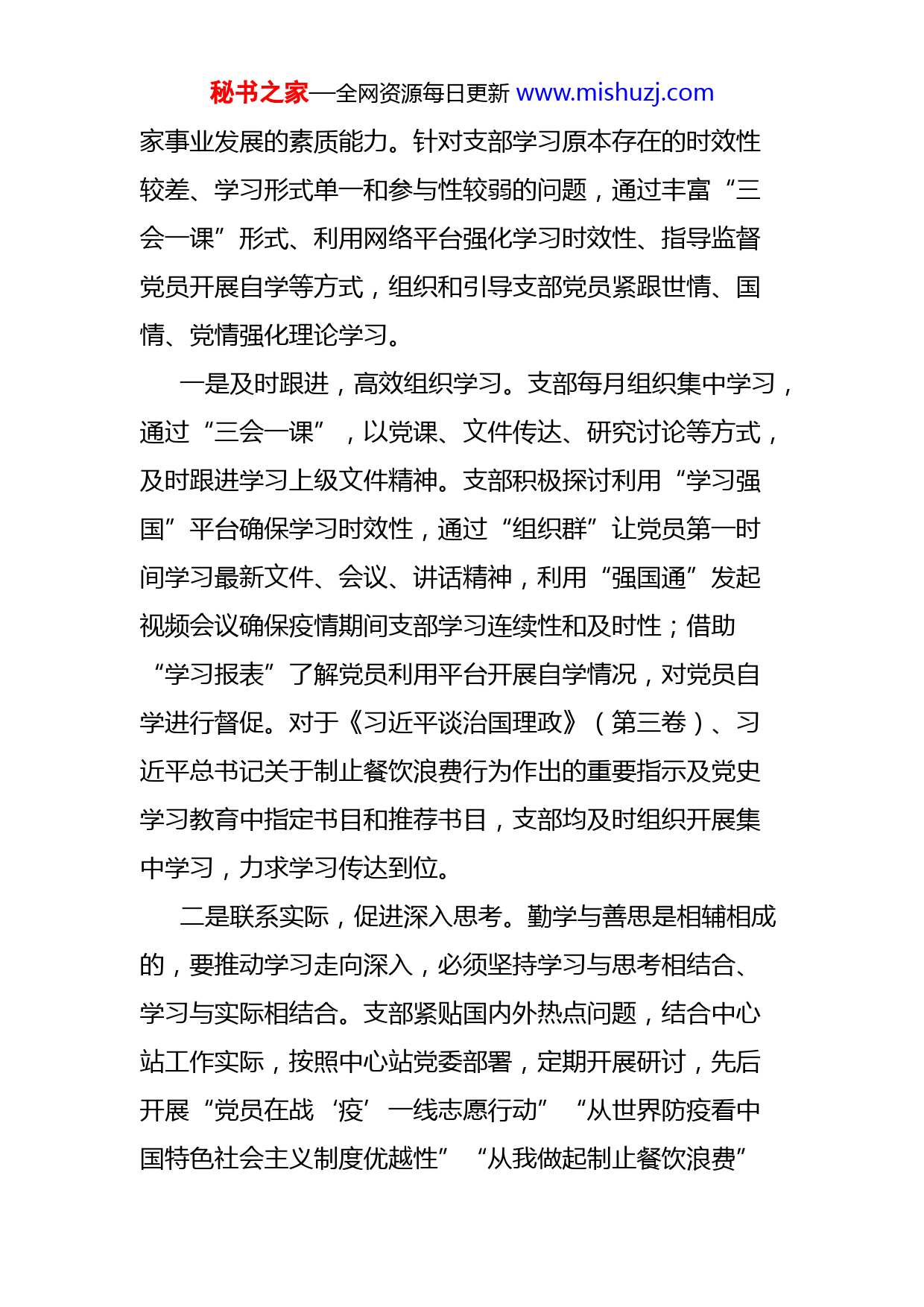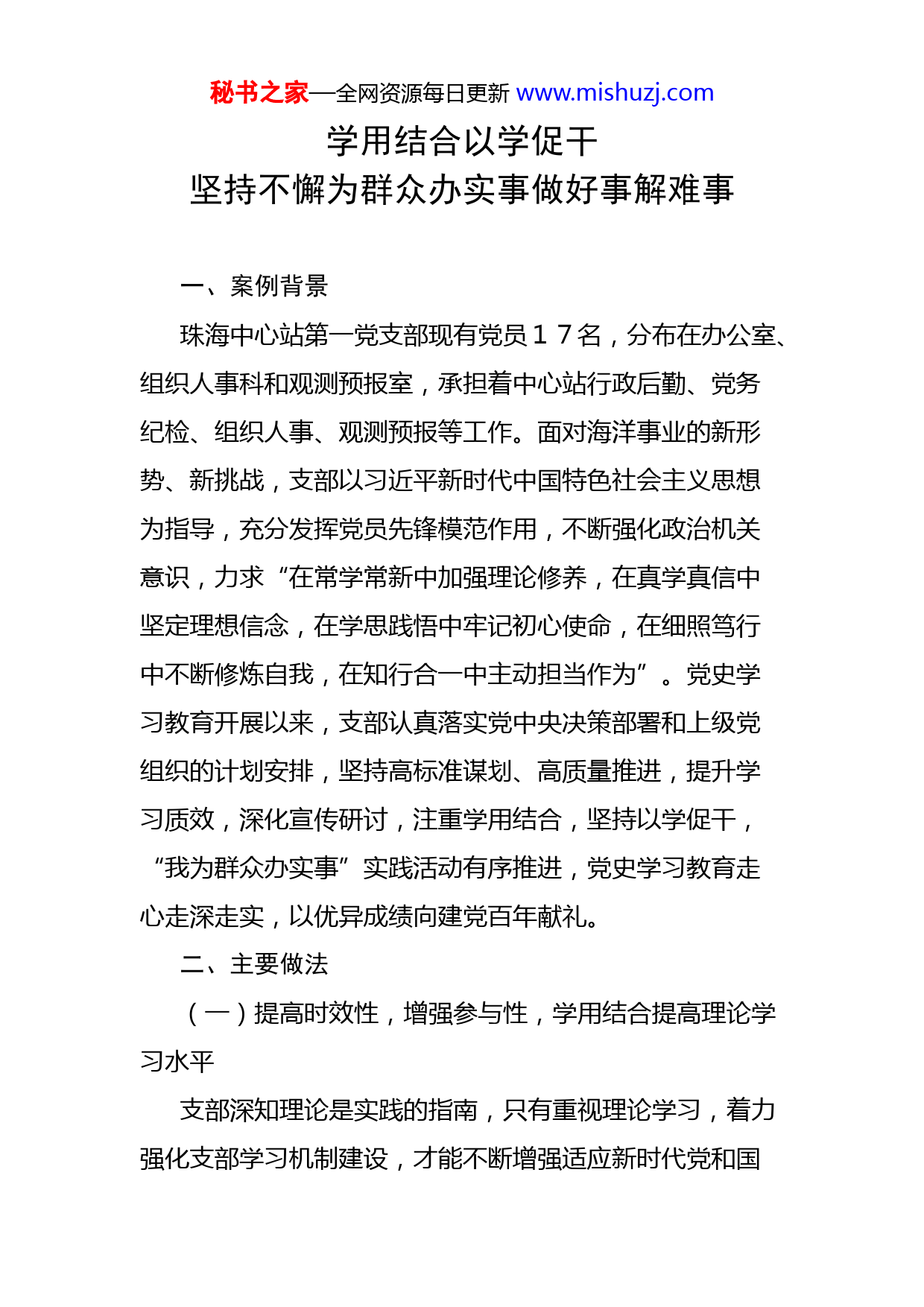 秘书之家—全网资源每日更新www.mishuzj.com学用结合以学促干坚持不懈为群众办实事做好事解难事一、案例背景珠海中心站第一党支部现有党员17名,分布在办公室、组织人事科和观测预报室,承担着中心站行政后勤、党务纪检、组织人事、观测预报等工作。面对海洋事业的新形势、新挑战,支部以习近平新时代中国特色社会主义思想为指导,充分发挥党员先锋模范作用,不断强化政治机关意识,力求“在常学常新中加强理论修养,在真学真信中坚定理想信念,在学思践悟中牢记初心使命,在细照笃行中不断修炼自我,在知行合一中主动担当作为”。党史学习教育开展以来,支部认真落实党中央决策部署和上级党组织的计划安排,坚持高标准谋划、高质量推进,提升学习质效,深化宣传研讨,注重学用结合,坚持以学促干,“我为群众办实事”实践活动有序推进,党史学习教育走心走深走实,以优异成绩向建党百年献礼。二、主要做法(一)提高时效性,增强参与性,学用结合提高理论学习水平支部深知理论是实践的指南,只有重视理论学习,着力强化支部学习机制建设,才能不断增强适应新时代党和国秘书之家—全网资源每日更新www.mishuzj.com家事业发展的素质能力。针对支部学习原本存在的时效性较差、学习形式单一和参与性较弱的问题,通过丰富“三会一课”形式、利用网络平台强化学习时效性、指导监督党员开展自学等方式,组织和引导支部党员紧跟世情、国情、党情强化理论学习。一是及时跟进,高效组织学习。支部每月组织集中学习,通过“三会一课”,以党课、文件传达、研究讨论等方式,及时跟进学习上级文件精神。支部积极探讨利用“学习强国”平台确保学习时效性,通过“组织群”让党员第一时间学习最新文件、会议、讲话精神,利用“强国通”发起视频会议确保疫情期间支部学习连续性和及时性;借助“学习报表”了解党员利用平台开展自学情况,对党员自学进行督促。对于《习近平谈治国理政》(第三卷)、习近平总书记关于制止餐饮浪费行为作出的重要指示及党史学习教育中指定书目和推荐书目,支部均及时组织开展集中学习,力求学习传达到位。二是联系实际,促进深入思考。勤学与善思是相辅相成的,要推动学习走向深入,必须坚持学习与思考相结合、学习与实际相结合。支部紧贴国内外热点问题,结合中心站工作实际,按照中心站党委部署,定期开展研讨,先后开展“党员在战‘疫’一线志愿行动”“从世界防疫看中国特色社会主义制度优越性”“从我做起制止餐饮浪费”秘书之家—全网资源每日更新www.mishuzj.com“讲述亲闻亲历的优良家风故事”“基层科技工作大家谈”等专题研讨;在党史学习教育中,不仅是停留在讲故事、听故事的层面,更是在“悟”上下功夫,把握历史发展主线、理解重大历史问题、深刻感悟初心宗旨,组织党员轮流发言和重点发言相结合,引导党员干部在经历中学习,将理论学习融会贯通,通过人人参与、人人思考、人人表达的方式,促进支部党员多思多想、学深悟透,理论学习广度、热度、深度不断强化。三是以学促干,转化学习成效。支部力促学用结合,将理论学习研讨成果转化为提升工作能力、改进工作方法的实践。“从我做起制止餐饮浪费”专题学习讨论中,党员对中心站制止餐饮浪费措施建言献策,并当天被采纳用于职工食堂的管理;在“加强年轻干部的教育培养着力锤炼锻造‘七种能力’”专题学习讨论中,党员干部特别是年轻干部对本单位和南海局建设出谋划策,提出意见建议,形成交流成果;开展专业能力学习研讨,着力探讨推动预报防灾减灾能力建设、全力做好海洋灾害防御工作的方式方法。(二)开展志愿服务,主动担当作为,为群众办实事做好事解难事“行”是“知”的外化和拓展,支部立足工作实际,从身边事出发,把党史学习同总结经验、推动工作结合起来,秘书之家—全网资源每日更新www.mishuzj.com从党史中汲取精神力量,在实践中践行初心使命,鼓励党员干部在知行合一中主动担当作为,强化公仆意识、为民情怀,用心用情用力解决基层困难事、群众烦心事,展现党员领导干部示范带头作用和党员先锋模范作用。一是开展党员志愿服务,参与社区防疫卡点值守。2020年,新冠疫情暴发蔓延全球,疫情就是命令,防控就是责任,社区是疫情联防联控的第一线。2至3月,节后返岗人员的逐渐增多,社区防控工作压力巨大。支部联系驻地共建党支部——珠海香洲区吉大街道洲仔社区网格第一党支部,了解到社区防疫值班工作任务重、压力大,立即号召支部党员参与驻地社区防控工作。倡议发出后,得到支部党员的热烈响应,当日即成立志愿者队伍参与社区防疫卡点值守。初春的珠海,寒风肆虐,湿冷交加。设置防疫卡点、测量出入人员体温、登记来源地信息、宣贯隔离政策,一项项工作有条不紊地开展。自2月7日至3月11日,支部作为防疫卡点值班主力,15名党员全部参加值守工作,战斗在这场没有硝烟的战“疫”一线,成为社区居民守护者,人均参与值守3个班次,协助社区顺利完成联防工作任务。关于活动开展情况的通讯稿《我也是社区联防党员志愿者》,先后在新南海公众号、《中国自然资源报》、党建网、观沧海公众号等媒体上刊发。秘书之家—全网资源每日更新www.mishuzj.com二是贯彻新发展理念,扎实履行防灾减灾工作