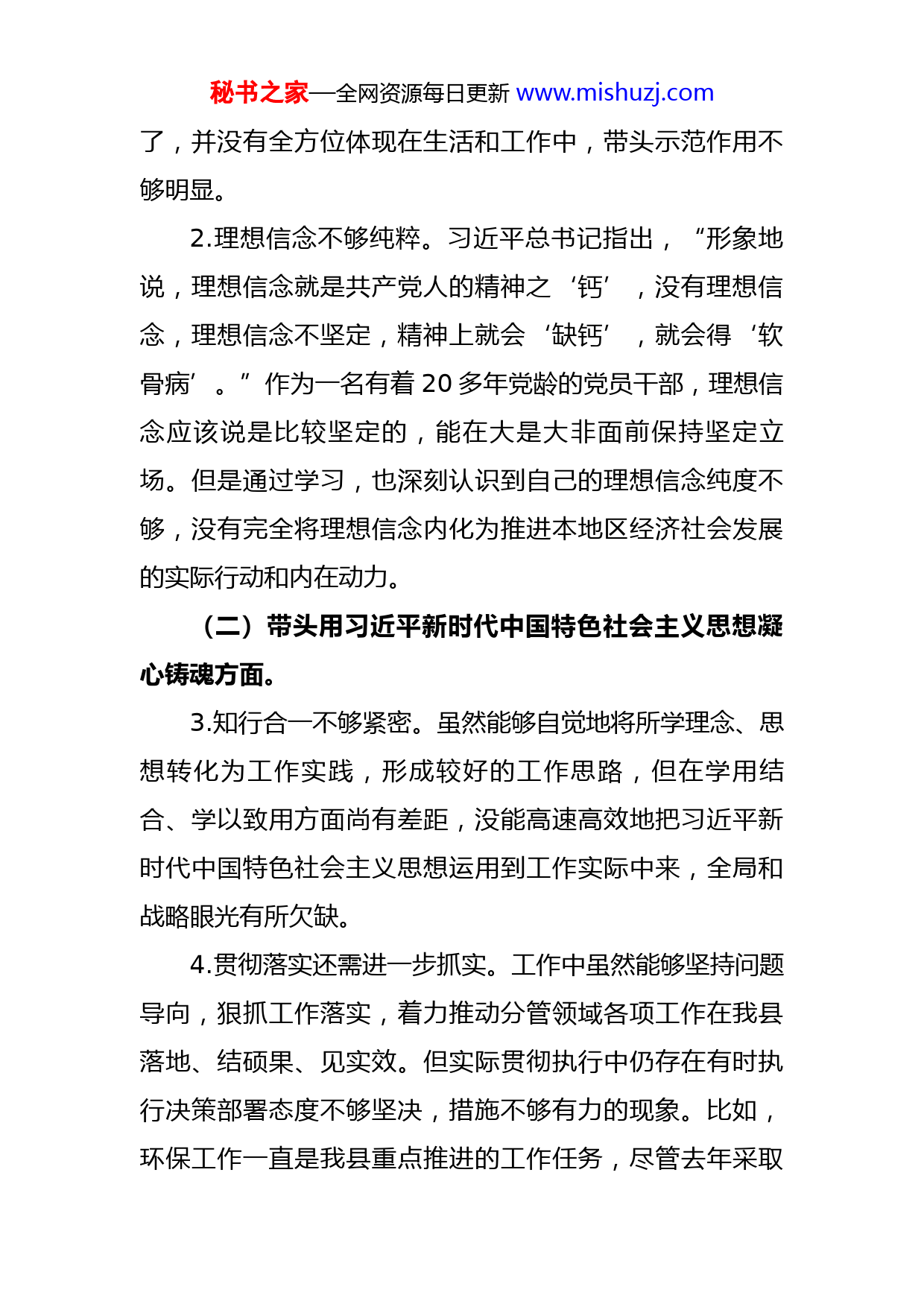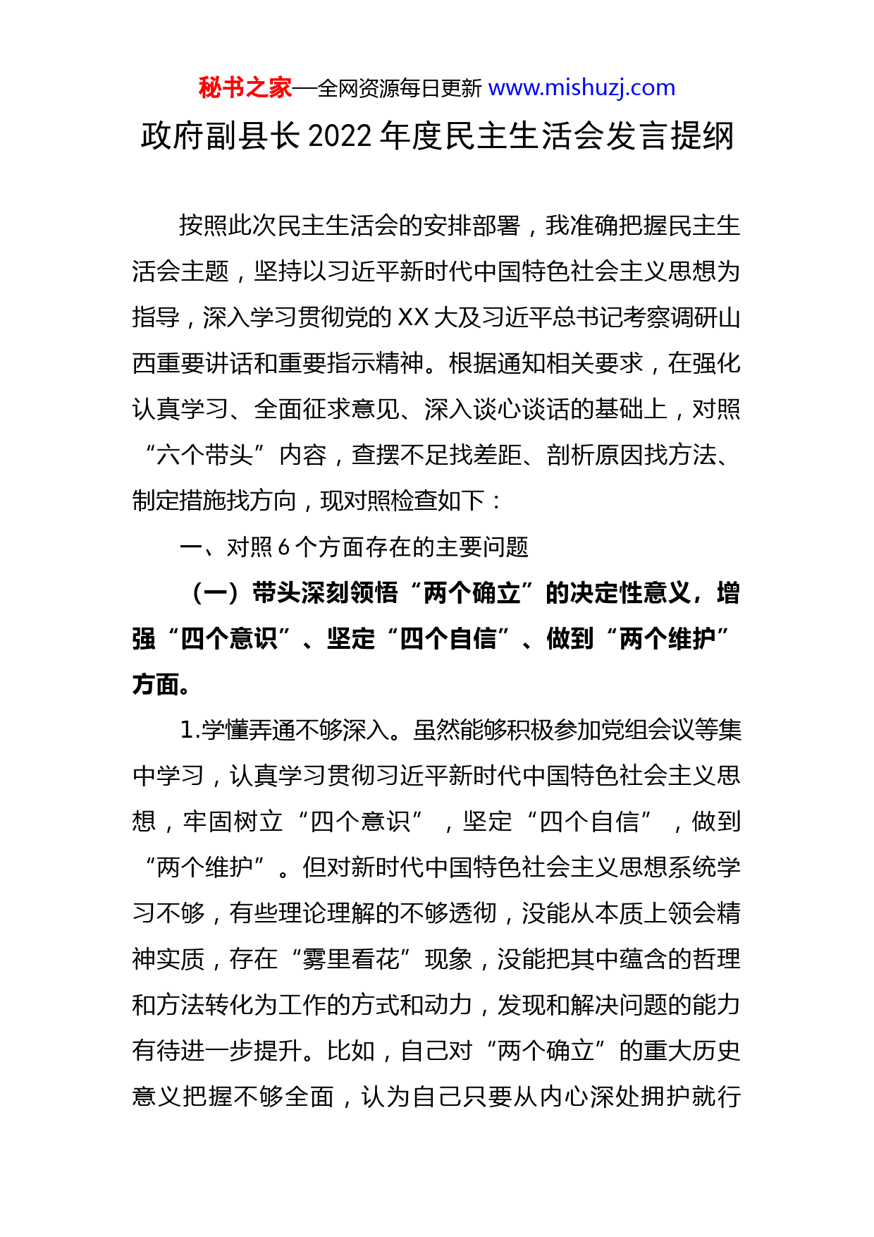 秘书之家—全网资源每日更新www.mishuzj.com政府副县长2022年度民主生活会发言提纲按照此次民主生活会的安排部署,我准确把握民主生活会主题,坚持以习近平新时代中国特色社会主义思想为指导,深入学习贯彻党的XX大及习近平总书记考察调研山西重要讲话和重要指示精神。根据通知相关要求,在强化认真学习、全面征求意见、深入谈心谈话的基础上,对照“六个带头”内容,查摆不足找差距、剖析原因找方法、制定措施找方向,现对照检查如下:一、对照6个方面存在的主要问题(一)带头深刻领悟“两个确立”的决定性意义,增强“四个意识”、坚定“四个自信”、做到“两个维护”方面。1.学懂弄通不够深入。虽然能够积极参加党组会议等集中学习,认真学习贯彻习近平新时代中国特色社会主义思想,牢固树立“四个意识”,坚定“四个自信”,做到“两个维护”。但对新时代中国特色社会主义思想系统学习不够,有些理论理解的不够透彻,没能从本质上领会精神实质,存在“雾里看花”现象,没能把其中蕴含的哲理和方法转化为工作的方式和动力,发现和解决问题的能力有待进一步提升。比如,自己对“两个确立”的重大历史意义把握不够全面,认为自己只要从内心深处拥护就行秘书之家—全网资源每日更新www.mishuzj.com了,并没有全方位体现在生活和工作中,带头示范作用不够明显。2.理想信念不够纯粹。习近平总书记指出,“形象地说,理想信念就是共产党人的精神之‘钙’,没有理想信念,理想信念不坚定,精神上就会‘缺钙’,就会得‘软骨病’。”作为一名有着20多年党龄的党员干部,理想信念应该说是比较坚定的,能在大是大非面前保持坚定立场。但是通过学习,也深刻认识到自己的理想信念纯度不够,没有完全将理想信念内化为推进本地区经济社会发展的实际行动和内在动力。(二)带头用习近平新时代中国特色社会主义思想凝心铸魂方面。3.知行合一不够紧密。虽然能够自觉地将所学理念、思想转化为工作实践,形成较好的工作思路,但在学用结合、学以致用方面尚有差距,没能高速高效地把习近平新时代中国特色社会主义思想运用到工作实际中来,全局和战略眼光有所欠缺。4.贯彻落实还需进一步抓实。工作中虽然能够坚持问题导向,狠抓工作落实,着力推动分管领域各项工作在我县落地、结硕果、见实效。但实际贯彻执行中仍存在有时执行决策部署态度不够坚决,措施不够有力的现象。比如,环保工作一直是我县重点推进的工作任务,尽管去年采取秘书之家—全网资源每日更新www.mishuzj.com了一系列举措,可以说环保方面考核指标仍旧是制约我县高质量发展考核指标排名的重要因素。这说明在实际推动环保工作中仍旧存在措施不到位、督促乏力、效果不好等问题。(三)带头坚持和加强党的全面领导方面。5.民主集中制质量不够高。作为新任副县长,能够以强烈的事业心和高度的责任感推进自己分管领域的事务,但工作中习惯于用既有经验、既有办法解决问题,有时不能很好地结合别人意见,虽然勇于攻坚克难,但面对工作中出现的新情况、新问题有时会洞察不足。6.党的建设抓得不紧。推动党的建设对于推进治理能力现代化有至关重要的作用,进一步巩固了党和国家的长治久安。自己在工作中高度重视党的建设,对抓党建有很强的责任感和使命感,能够积极参加组织生活会,有效剖析自身问题,明确改进方向,但有时候存在准备不充分问题。比如,党内政治生活中更加习惯于摘录或者传达文件和上级的原文原句,从而忽视了对于精神实质的理解,在安排部署相关工作的时候就可能缺乏吸引力和凝聚力。(四)带头坚持以人民为中心的发展思想,推动改革发展稳定方面。7.为民服务质效尚有差距。办好民生实事就是帮群众解难题、为群众增福祉,就要用心用情用力办好暖心民生秘书之家—全网资源每日更新www.mishuzj.com事,把群众小事当成不容懈怠的大事。自己始终把办好办实民生实事作为头等大事,着力推动分管领域民生实事办理。但在工作决策部署和精力投入上尚有差距,个别问题解决不够彻底,一定程度上影响了人民群众的幸福感。8.情感融入群众尚有差距。近期的工作重点放在文旅行业、工业经济等方面偏多,对民生改善、社会事业投入精力偏少。还没有完全将感情融入群众,从群众角度思考和解决问题的能力有待进一步加强,没能很好地做到“问计于民、问政于民、问需于民”。(五)带头发扬斗争精神,防范化解风险挑战方面。9.意识形态领域斗争认识不足。自己专门抽时间研读了习近平总书记关于意识形态工作的重要论述,坚持在学懂弄通、真学真用上下功夫,进一步织牢意识形态“责任网”,耕好意识形态“责任田”,守好意识形态“主阵地”。但在意识形态领域斗争的严峻性、挑战性方面认识不足,特别是新媒体时代的网络意识形态工作。10.难点问题破解还不够有效。我县作为人口大县、发展强县,近年来的发展成就有目共睹,进一步推进文旅产业提档升级,推进农业产业做强做大,推进工业产业转型壮大,推进乡村振兴有效衔接,推进民生实事见实见效,推进社会稳定有形有果。但自己在破解发展难题方面还有短板。比如,在能耗双控、“双碳”目标紧约束的背景秘书之家—全网资源每日更新www.mishuzj.com下,我县铸造、煤焦、橡胶、农产品加工等