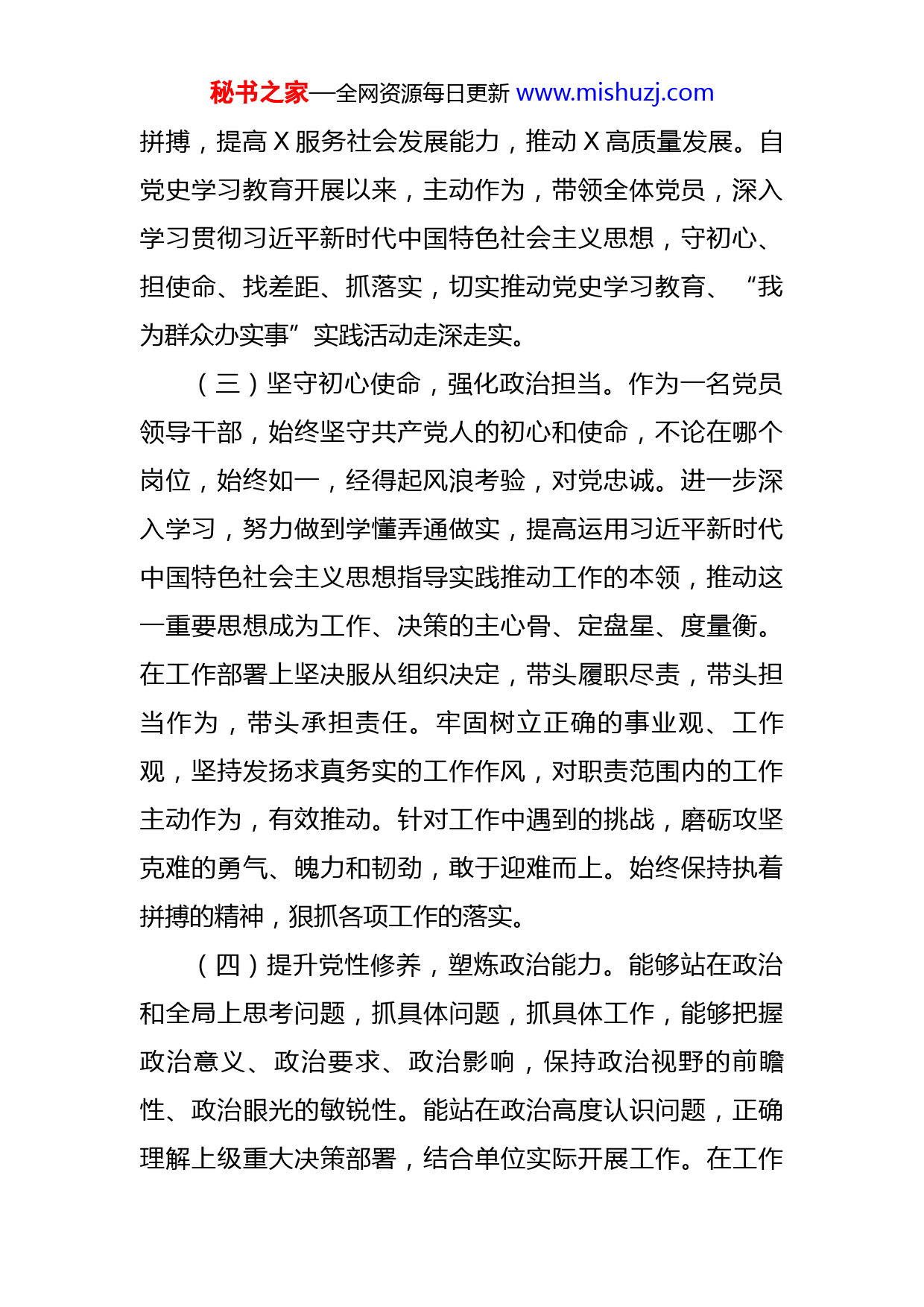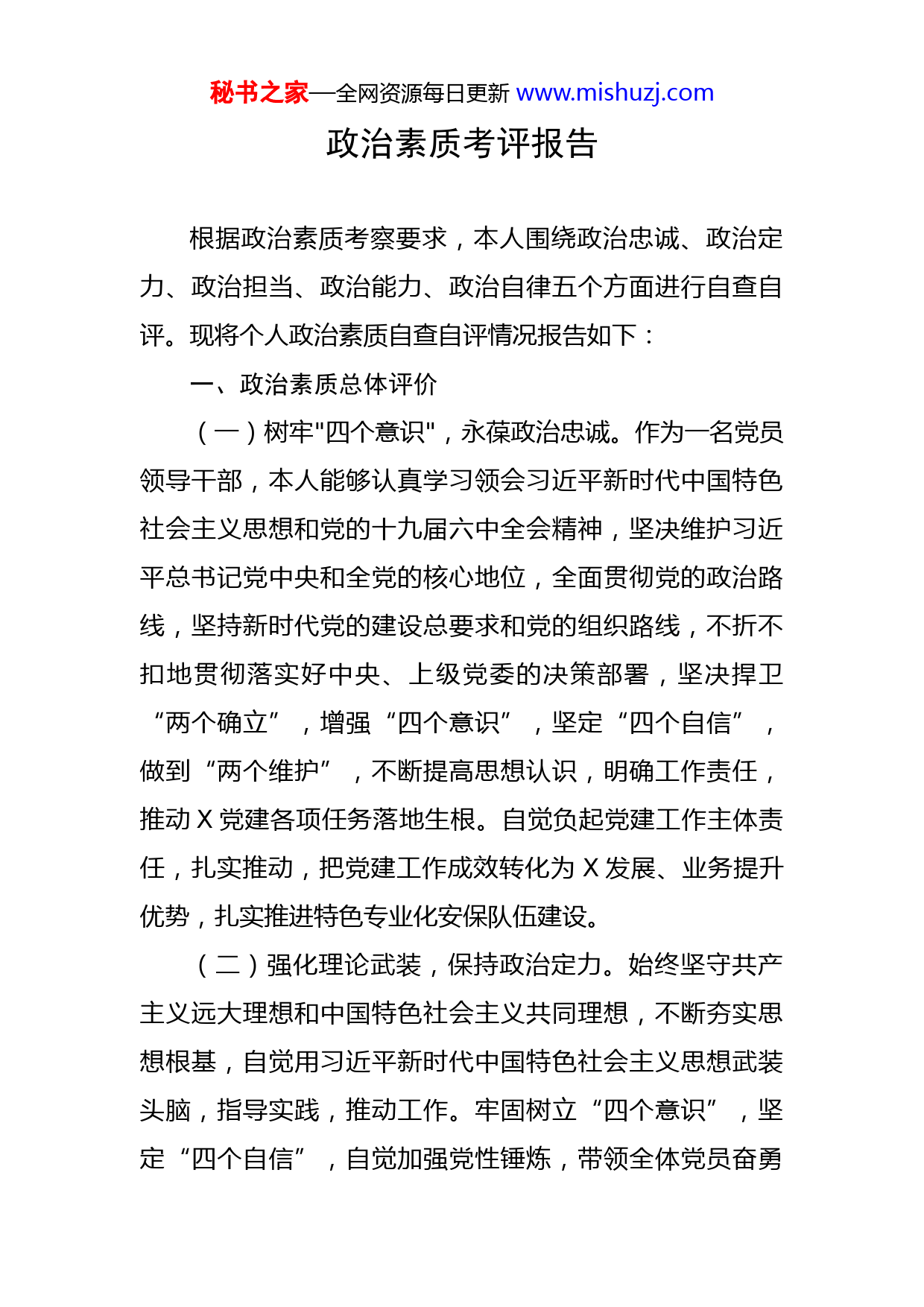 秘书之家—全网资源每日更新www.mishuzj.com政治素质考评报告根据政治素质考察要求,本人围绕政治忠诚、政治定力、政治担当、政治能力、政治自律五个方面进行自查自评。现将个人政治素质自查自评情况报告如下:一、政治素质总体评价(一)树牢"四个意识",永葆政治忠诚。作为一名党员领导干部,本人能够认真学习领会习近平新时代中国特色社会主义思想和党的十九届六中全会精神,坚决维护习近平总书记党中央和全党的核心地位,全面贯彻党的政治路线,坚持新时代党的建设总要求和党的组织路线,不折不扣地贯彻落实好中央、上级党委的决策部署,坚决捍卫“两个确立”,增强“四个意识”,坚定“四个自信”,做到“两个维护”,不断提高思想认识,明确工作责任,推动X党建各项任务落地生根。自觉负起党建工作主体责任,扎实推动,把党建工作成效转化为X发展、业务提升优势,扎实推进特色专业化安保队伍建设。(二)强化理论武装,保持政治定力。始终坚守共产主义远大理想和中国特色社会主义共同理想,不断夯实思想根基,自觉用习近平新时代中国特色社会主义思想武装头脑,指导实践,推动工作。牢固树立“四个意识”,坚定“四个自信”,自觉加强党性锤炼,带领全体党员奋勇秘书之家—全网资源每日更新www.mishuzj.com拼搏,提高X服务社会发展能力,推动X高质量发展。自党史学习教育开展以来,主动作为,带领全体党员,深入学习贯彻习近平新时代中国特色社会主义思想,守初心、担使命、找差距、抓落实,切实推动党史学习教育、“我为群众办实事”实践活动走深走实。(三)坚守初心使命,强化政治担当。作为一名党员领导干部,始终坚守共产党人的初心和使命,不论在哪个岗位,始终如一,经得起风浪考验,对党忠诚。进一步深入学习,努力做到学懂弄通做实,提高运用习近平新时代中国特色社会主义思想指导实践推动工作的本领,推动这一重要思想成为工作、决策的主心骨、定盘星、度量衡。在工作部署上坚决服从组织决定,带头履职尽责,带头担当作为,带头承担责任。牢固树立正确的事业观、工作观,坚持发扬求真务实的工作作风,对职责范围内的工作主动作为,有效推动。针对工作中遇到的挑战,磨砺攻坚克难的勇气、魄力和韧劲,敢于迎难而上。始终保持执着拼搏的精神,狠抓各项工作的落实。(四)提升党性修养,塑炼政治能力。能够站在政治和全局上思考问题,抓具体问题,抓具体工作,能够把握政治意义、政治要求、政治影响,保持政治视野的前瞻性、政治眼光的敏锐性。能站在政治高度认识问题,正确理解上级重大决策部署,结合单位实际开展工作。在工作秘书之家—全网资源每日更新www.mishuzj.com中,能够牢固树立大局意识和全局观念,树立正确的义利观,处理好整体与部分、个人与集体,当前与长远的利益关系。(五)筑牢思想防线,严格政治自律。始终严格要求自己,遵守党的政治纪律和政治规矩,带头落实“八项“规定,坚决防止个人主义、自由主义问题滋生。同时在生活上能严格要求自己,能对自己负责、对家庭和对单位负责。在廉洁自律方面做到清清白白,不以公谋私,淡薄物质生活,注重精神生活,能团结同事、相互帮助,宽以待人、严于律己。二、存在的差距不足一是学深悟透欠火候。对学习满足于学好,在用好方面思考的少,学习吸收转化率还有待提高,导致结合X实际提出创新举措较少。二是党性锻炼要求不高。存在以推动工作替代党性锻炼的想法,作为一名领导干部,同时也是一名党员的意识还不够强,总认为只要按照规定程序开展组织生活就行,对“三会一课”质量,组织生活实效没有严格要求自己和他人。三、今后的努力方向和整改措施(一)强化理论武装,坚定理想信念。坚持以习近平新时代中国特色社会主义思想为指导,深入学习贯彻党的十九届六中全会精神,不断坚定理想信念,践行宗旨意秘书之家—全网资源每日更新www.mishuzj.com识,增强党性观念,提高政治素养,进一步牢固树立“四个意识”,坚定“四个自信”,做到“两个维护”。坚持把理论学习与企业管理、分管工作结合起来,真正把新思想、新观点、新论断、新要求体现在党建工作中,自觉在大局下想问题、做工作。(二)提升政治能力,汇聚干事创业的强大合力。强化“抓党建是本职、不抓党建是失职、抓不好党建是不称职”的责任担当,不断加强思想建设、组织建设、作风建设,进一步发挥好基层党组织战斗堡垒作用和共产党员先锋模范作用。认真抓好思想政治工作,经常性与其他班子成员交心谈心。(三)带头遵规守纪,永葆清廉形象。带头贯彻落实中央八项规定和实施细则精神,坚持艰苦朴素、厉行节约、勤俭办事,进一步发扬艰苦奋斗的优良作风。严格落实个人有关事项报告制度,重大问题、重要事项按规定向组织请示报告。坚决防范团团伙伙、拉帮结派,对破坏政治纪律和政治规矩的、不按照规矩程序办事的行为坚决抵制、勇于斗争。坚持严以律己,以身作则,带头管好自己,管好亲属,管好身边的工作人员。(四)勇于担当作为,强化责任意识。敢于担当、积极作为,紧盯制约X发展的瓶颈问题、职工反映强烈的热点难点问题、党的建设面临的紧迫问题,不断更新观念、秘书之家—全网资源每日更新www.mishuzj.com创新方法,加快推进重点领域改革,创造性地提出解决思路和办法,努力