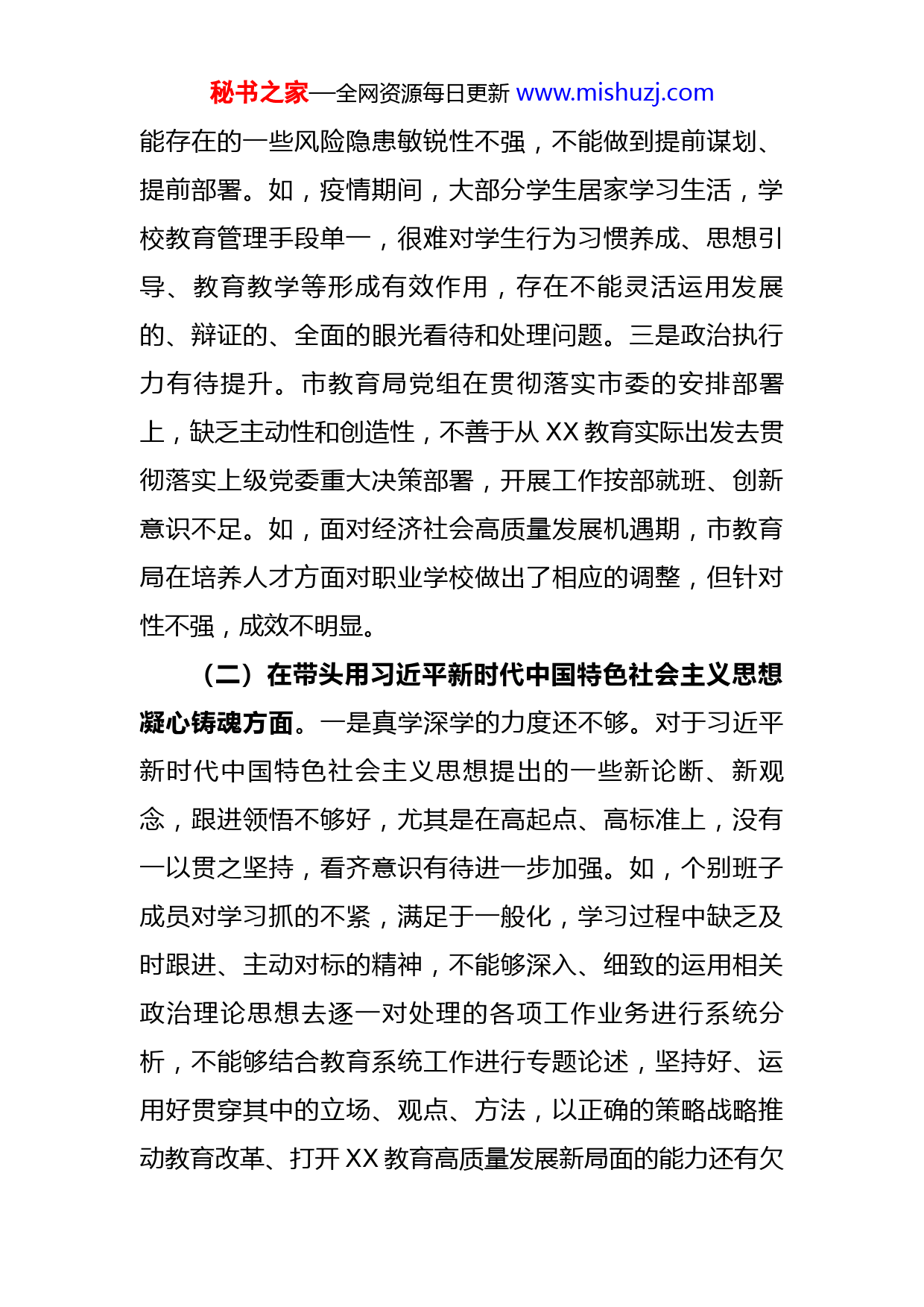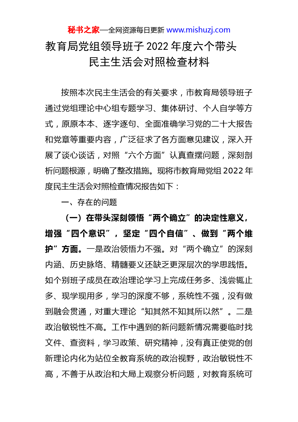 秘书之家—全网资源每日更新www.mishuzj.com教育局党组领导班子2022年度六个带头民主生活会对照检查材料按照本次民主生活会的有关要求,市教育局领导班子通过党组理论中心组专题学习、集体研讨、个人自学等方式,原原本本、逐字逐句、全面准确学习党的二十大报告和党章等重要内容,广泛征求了各方面意见建议,深入开展了谈心谈话,对照“六个方面”认真查摆问题,深刻剖析问题根源,明确了整改措施。现将市教育局党组2022年度民主生活会对照检查情况报告如下:一、存在的问题(一)在带头深刻领悟“两个确立”的决定性意义,增强“四个意识”,坚定“四个自信”、做到“两个维护”方面。一是政治领悟力不强。对“两个确立”的深刻内涵、历史脉络、精髓要义还缺乏更深层次的学思践悟。如个别班子成员在政治理论学习上完成任务多、浅尝辄止多、现学现用多,学习的深度不够,系统性不强,没有做到融会贯通,对重大理论“知其然不知其所以然”。二是政治敏锐性不高。工作中遇到的新问题新情况需要临时找文件、查资料,学习政策、研究精神,没有真正使党的创新理论内化为站位全教育系统的政治视野,政治敏锐性不高,不善于从政治和大局上观察分析问题,对教育系统可秘书之家—全网资源每日更新www.mishuzj.com能存在的一些风险隐患敏锐性不强,不能做到提前谋划、提前部署。如,疫情期间,大部分学生居家学习生活,学校教育管理手段单一,很难对学生行为习惯养成、思想引导、教育教学等形成有效作用,存在不能灵活运用发展的、辩证的、全面的眼光看待和处理问题。三是政治执行力有待提升。市教育局党组在贯彻落实市委的安排部署上,缺乏主动性和创造性,不善于从XX教育实际出发去贯彻落实上级党委重大决策部署,开展工作按部就班、创新意识不足。如,面对经济社会高质量发展机遇期,市教育局在培养人才方面对职业学校做出了相应的调整,但针对性不强,成效不明显。(二)在带头用习近平新时代中国特色社会主义思想凝心铸魂方面。一是真学深学的力度还不够。对于习近平新时代中国特色社会主义思想提出的一些新论断、新观念,跟进领悟不够好,尤其是在高起点、高标准上,没有一以贯之坚持,看齐意识有待进一步加强。如,个别班子成员对学习抓的不紧,满足于一般化,学习过程中缺乏及时跟进、主动对标的精神,不能够深入、细致的运用相关政治理论思想去逐一对处理的各项工作业务进行系统分析,不能够结合教育系统工作进行专题论述,坚持好、运用好贯穿其中的立场、观点、方法,以正确的策略战略推动教育改革、打开XX教育高质量发展新局面的能力还有欠秘书之家—全网资源每日更新www.mishuzj.com缺。二是强化理论武装的创新精神还不强。面对新形势、新变化、新情况,对党员理论教育抓得不牢,教育形式缺乏创新,理论教育缺乏吸引力和感染力,信息化手段运用不足,理论学习效果不理想。如,局机关党组理论中心组学习、干部每周学习等政治理论基本上是通读原文,没有综合运用线上线下资源、采取走出去、请进来等创新方式,学习形式单一,干部对学习内容体会不深,没有切实做到入脑入心;三是理论指导实践、知行合一的能力不够强。班子成员想问题、做决策、抓工作时没有切实做到理论与实践的有机结合,将对本部门本行业本领域工作重要论述和指示批示精神转化为工作动能,解决问题的能力有待提高。如,在落实市委重大决策部署时,个别班子成员在落实工作要求时,多停留在精神传达、责任分解、和分管工作任务落实上,对于自己分管范围外的工作缺乏相应的深入思考和谋划,不能够正确运用党的创新理论去统筹指导教育工作,着力解决工作中的问题的能力还不够。(三)在带头坚持和加强党的全面领导方面。一是党建统领业务工作力度不够。机关党建和业务工作有机融合的切入点找的不精准,对党建工作投入的精力不多,存在重业务轻党建现象。如,在安排部署工作时,党建工作与业务工作结合不紧密,对县(市)及地直学校的行政工作安排较多,忽视了党建与业务工作的相互促进的关系,导秘书之家—全网资源每日更新www.mishuzj.com致在推动党建引领业务、促进业务上,成效还不是十分显著。二是对党建工作的系统性把握上还有差距。对硬性任务、指标重视程度高,推动力度大,但是对一些长期性的工作谋划不深,抓落实不够,督促和推动力度不够,一定程度上影响了工作质效。如,在机关党支部规范化建设上,缺乏全面统筹谋划,虽然开展了标准化规范化党支部创建,但是如何发挥创建结果的示范引领作用,引导广大党员干部争做优秀党员需要加强。三是锤炼党性修养还不够。存在求稳怕乱思想,指导创新的能力有待提高,对一些重大问题深层次研究不够,破解难题的新思路、新举措不多。如,个别班子成员有安于现状、求稳、怕出问题的思想存在,参与重大决策的积极性和主动性不高,在工作中,面对新形势新挑战,在吸收新思想新知识,借鉴新经验上不够深入,在不适应教师管理、培训方面,缺乏主动去想办法、主动去解决问题、主动去推动工作的“钉钉子”精神,成效不明显。(四)在带头坚持以人民为中心的发展思想,推动改革发展稳定方面。一是深化教育改革还有待突破,创造性抓落实不足。表现为照搬照抄的多,结合实际创