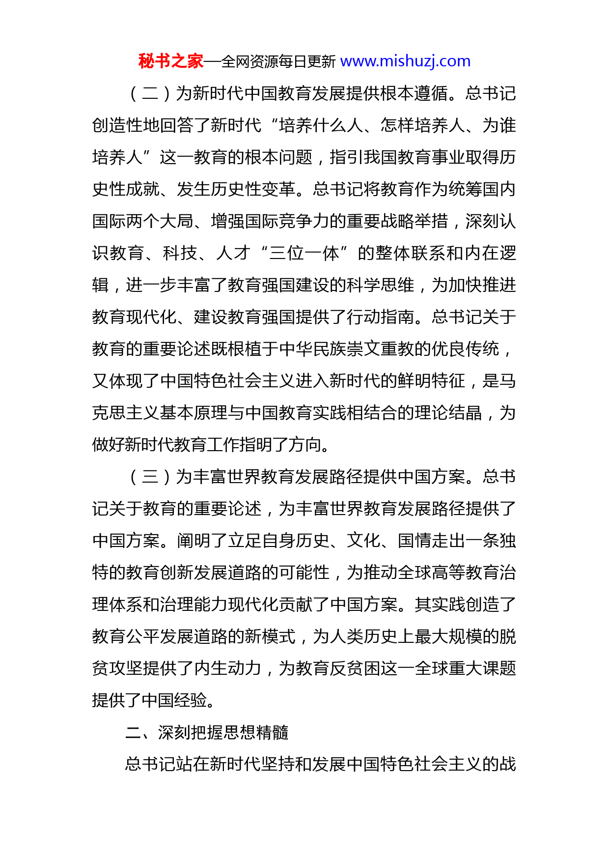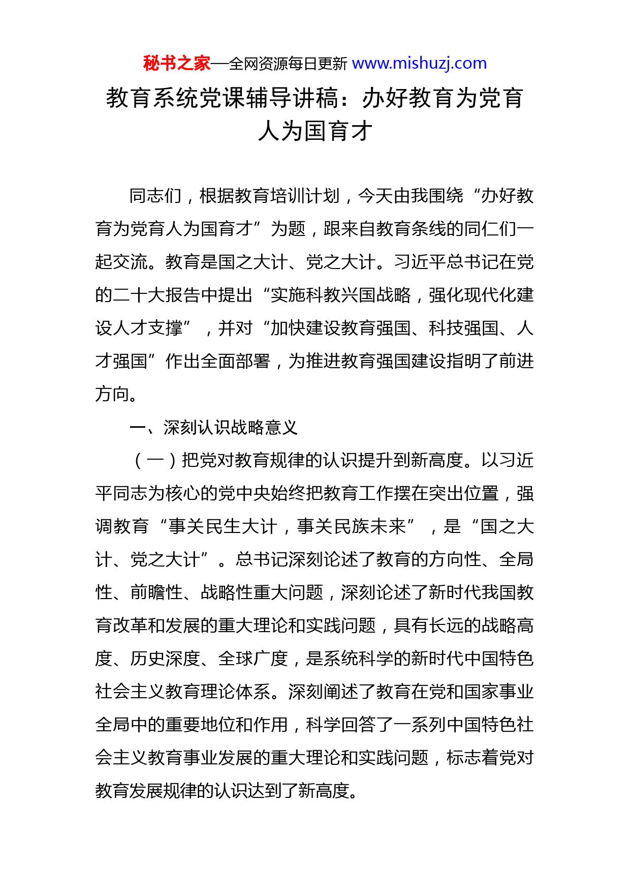 秘书之家—全网资源每日更新www.mishuzj.com教育系统党课辅导讲稿:办好教育为党育人为国育才同志们,根据教育培训计划,今天由我围绕“办好教育为党育人为国育才”为题,跟来自教育条线的同仁们一起交流。教育是国之大计、党之大计。习近平总书记在党的二十大报告中提出“实施科教兴国战略,强化现代化建设人才支撑”,并对“加快建设教育强国、科技强国、人才强国”作出全面部署,为推进教育强国建设指明了前进方向。一、深刻认识战略意义(一)把党对教育规律的认识提升到新高度。以习近平同志为核心的党中央始终把教育工作摆在突出位置,强调教育“事关民生大计,事关民族未来”,是“国之大计、党之大计”。总书记深刻论述了教育的方向性、全局性、前瞻性、战略性重大问题,深刻论述了新时代我国教育改革和发展的重大理论和实践问题,具有长远的战略高度、历史深度、全球广度,是系统科学的新时代中国特色社会主义教育理论体系。深刻阐述了教育在党和国家事业全局中的重要地位和作用,科学回答了一系列中国特色社会主义教育事业发展的重大理论和实践问题,标志着党对教育发展规律的认识达到了新高度。秘书之家—全网资源每日更新www.mishuzj.com(二)为新时代中国教育发展提供根本遵循。总书记创造性地回答了新时代“培养什么人、怎样培养人、为谁培养人”这一教育的根本问题,指引我国教育事业取得历史性成就、发生历史性变革。总书记将教育作为统筹国内国际两个大局、增强国际竞争力的重要战略举措,深刻认识教育、科技、人才“三位一体”的整体联系和内在逻辑,进一步丰富了教育强国建设的科学思维,为加快推进教育现代化、建设教育强国提供了行动指南。总书记关于教育的重要论述既根植于中华民族崇文重教的优良传统,又体现了中国特色社会主义进入新时代的鲜明特征,是马克思主义基本原理与中国教育实践相结合的理论结晶,为做好新时代教育工作指明了方向。(三)为丰富世界教育发展路径提供中国方案。总书记关于教育的重要论述,为丰富世界教育发展路径提供了中国方案。阐明了立足自身历史、文化、国情走出一条独特的教育创新发展道路的可能性,为推动全球高等教育治理体系和治理能力现代化贡献了中国方案。其实践创造了教育公平发展道路的新模式,为人类历史上最大规模的脱贫攻坚提供了内生动力,为教育反贫困这一全球重大课题提供了中国经验。二、深刻把握思想精髓总书记站在新时代坚持和发展中国特色社会主义的战秘书之家—全网资源每日更新www.mishuzj.com略高度,系统总结了推进我国教育改革发展的“九个坚持”,即坚持党对教育事业的全面领导,坚持把立德树人作为根本任务,坚持优先发展教育事业,坚持社会主义办学方向,坚持扎根中国大地办教育,坚持以人民为中心发展教育,坚持深化教育改革创新,坚持把服务中华民族伟大复兴作为教育的重要使命,坚持把教师队伍建设作为基础工作。“九个坚持”为加快推进教育现代化、建设教育强国、办好人民满意的教育提供了根本遵循,为新时代新征程教育服务全面建成社会主义现代化强国、实现第二个百年奋斗目标,以中国式现代化全面推进中华民族伟大复兴指明了方向。(一)始终坚持党对教育事业的全面领导。加强党对教育工作的全面领导,是办好教育的根本保证。坚持党的全面领导是中国特色社会主义教育的灵魂和根基,是坚持社会主义办学方向的根本保证。我们要站在培养社会主义建设者和接班人的政治高度,始终坚持党对教育事业的全面领导,把坚持党的全面领导置于教育“九个坚持”之首,始终聚焦“为党育人,为国育才”的社会主义办学方向不偏离,要有高度政治自觉,把思想政治工作贯穿学校教育管理全过程,使教育领域成为坚持党的领导的坚强阵地。(二)始终坚持以人民为中心办教育。坚持以人民为秘书之家—全网资源每日更新www.mishuzj.com中心发展教育,是总书记和党中央坚持人民至上、坚持以人民为中心的发展思想在教育领域的集中体现。教育是实现人民对美好生活向往的现实基础,要将人民满意作为衡量教育事业发展的根本标尺,将满足人民群众对更加公平、更高质量教育的新期待和依靠人民推动教育改革创新作为发展教育事业的重要准则。教育作为民生工程,发展教育事业就是要解决为什么人、由谁享有这个根本问题。坚持以人民为中心发展教育,教育公平是社会公平的重要基础,不断促进教育事业发展成果更多更公平惠及全体人民。(三)始终坚持立德树人根本任务。以习近平同志为核心的党中央高度重视培养社会主义建设者和接班人,坚持把立德树人作为中心环节,开创了我国教育事业发展新局面。教育的根本任务是立德树人,要把立德树人作为检验学校一切工作的根本标准,内化到学校建设和管理各领域。要构建德智体美劳全面培养的教育体系,把立德树人融入思想道德教育、文化知识教育、社会实践教育各环节,贯穿基础教育、职业教育、高等教育各领域,形成更高水平的人才培养体系。(四)始终坚持教育与经济社会协调发展。总书记始终强调将教育摆在经济社会发展的优先位置,聚焦关键环节、筑牢强师之基,推动教育更好服务经济社会发展,为秘书之家—全网资源每日更新www.mishuzj.com民族复