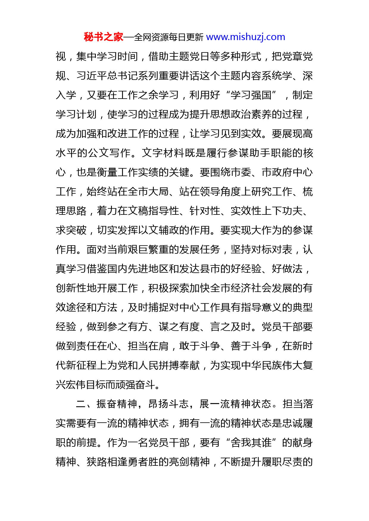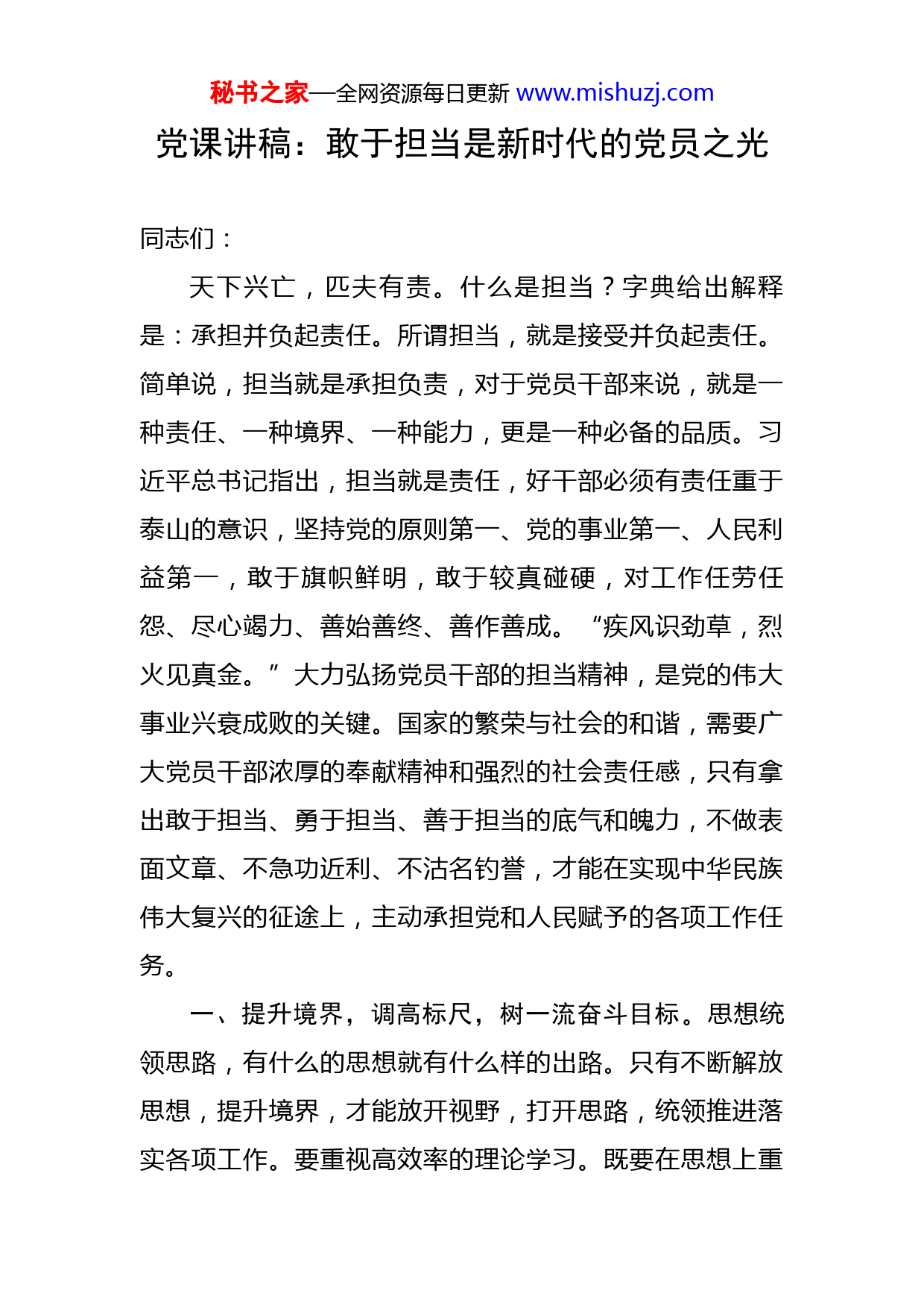 秘书之家—全网资源每日更新www.mishuzj.com党课讲稿:敢于担当是新时代的党员之光同志们:天下兴亡,匹夫有责。什么是担当?字典给出解释是:承担并负起责任。所谓担当,就是接受并负起责任。简单说,担当就是承担负责,对于党员干部来说,就是一种责任、一种境界、一种能力,更是一种必备的品质。习近平总书记指出,担当就是责任,好干部必须有责任重于泰山的意识,坚持党的原则第一、党的事业第一、人民利益第一,敢于旗帜鲜明,敢于较真碰硬,对工作任劳任怨、尽心竭力、善始善终、善作善成。“疾风识劲草,烈火见真金。”大力弘扬党员干部的担当精神,是党的伟大事业兴衰成败的关键。国家的繁荣与社会的和谐,需要广大党员干部浓厚的奉献精神和强烈的社会责任感,只有拿出敢于担当、勇于担当、善于担当的底气和魄力,不做表面文章、不急功近利、不沽名钓誉,才能在实现中华民族伟大复兴的征途上,主动承担党和人民赋予的各项工作任务。一、提升境界,调高标尺,树一流奋斗目标。思想统领思路,有什么的思想就有什么样的出路。只有不断解放思想,提升境界,才能放开视野,打开思路,统领推进落实各项工作。要重视高效率的理论学习。既要在思想上重秘书之家—全网资源每日更新www.mishuzj.com视,集中学习时间,借助主题党日等多种形式,把党章党规、习近平总书记系列重要讲话这个主题内容系统学、深入学,又要在工作之余学习,利用好“学习强国”,制定学习计划,使学习的过程成为提升思想政治素养的过程,成为加强和改进工作的过程,让学习见到实效。要展现高水平的公文写作。文字材料既是履行参谋助手职能的核心,也是衡量工作实绩的关键。要围绕市委、市政府中心工作,始终站在全市大局、站在领导角度上研究工作、梳理思路,着力在文稿指导性、针对性、实效性上下功夫、求突破,切实发挥以文辅政的作用。要实现大作为的参谋作用。面对当前艰巨繁重的发展任务,坚持对标对表,认真学习借鉴国内先进地区和发达县市的好经验、好做法,创新性地开展工作,积极探索加快全市经济社会发展的有效途径和方法,及时捕捉对中心工作具有指导意义的典型经验,做到参之有方、谋之有度、言之及时。党员干部要做到责任在心、担当在肩,敢于斗争、善于斗争,在新时代新征程上为党和人民拼搏奉献,为实现中华民族伟大复兴宏伟目标而顽强奋斗。二、振奋精神,昂扬斗志,展一流精神状态。担当落实需要有一流的精神状态,拥有一流的精神状态是忠诚履职的前提。作为一名党员干部,要有“舍我其谁”的献身精神、狭路相逢勇者胜的亮剑精神,不断提升履职尽责的秘书之家—全网资源每日更新www.mishuzj.com精气神。要齐心协力、合力攻坚。要强化大局意识,一切以工作为重,精诚团结,密切配合,最大限度消除不和谐因素,合力弹奏一心一意谋发展的和谐乐章。要做好与市政府办公室其他科室的协调沟通,自觉与其他科室搞好协调配合,形成办公室工作整体合力。要勇挑重担、敢于担当。我们每个调研文秘人员都要强化担当意识,对自己份内的工作和领导交给的任务,不论困难多大,都要迎难而上,以不达目的誓不罢休的志气攻坚克难、争创一流。要服务提质、工作提效。调研文秘工作是领导的“左右手”,要协助领导处理各种事务,积极协调各方矛盾,“快”字当头,提高效率,努力掌握“第一手情况”,开展“第一道研判”,实现“第一时间报送”。要进一步强化公文规范管理,精简文件简报,严格把好文件审核关,不断提高办文质量。三、忠诚坚定,率先垂范,创一流党支部。一个支部就是一面旗帜,一个党员就是一盏明灯,我们要认清肩上的重任,全面加快推进支部建设。要忠诚坚定、锻造品质。天下之德,莫过于忠”。我们在办公室工作,不直接抓经济、做工程、干项目,主要是搞政策研究、从事文字工作,必须把政治过硬作为基本条件,对党绝对忠诚作为工作的首要政治原则。要精心组织、建强堡垒。认真贯彻习近平总书记关于基层党组织建设的重要指示精神,始终秘书之家—全网资源每日更新www.mishuzj.com把党建工作与业务工作有机结合起来,精心组织好主题党日活动、“三会一课”学习教育活动,着力提升党建工作水平。要率先垂范、廉洁自律。坚持挺纪在前,严格落实中央八项规定等各项制度规定,时刻自重、自省、自警、自励,做到言不出格、行不逾规,认真遵守社会公德、职业道德和家庭美德,真正做到生活正派、情趣健康、洁身自好,保持良好的自身形象。新时代赋予我们新使命,新使命需要我们有新担当。党员干部担当作为既是政治品格,也是从政本分,要以对党忠诚、为党分忧、为党尽职、为民造福的政治担当,满怀激情地投入到新时代中国特色社会主义伟大实践;以时不我待、只争朝夕、勇立潮头的历史担当,干在实处,走在前列,勇闯改革创新新路,勇于战胜各种艰难险阻和风险挑战;以守土有责、守土负责、守土尽责的责任担当,在其位、尽其责、求其效,努力作出无愧于时代、无愧于人民、无愧于历史的业绩,向党和人民交上一份满意的答卷。