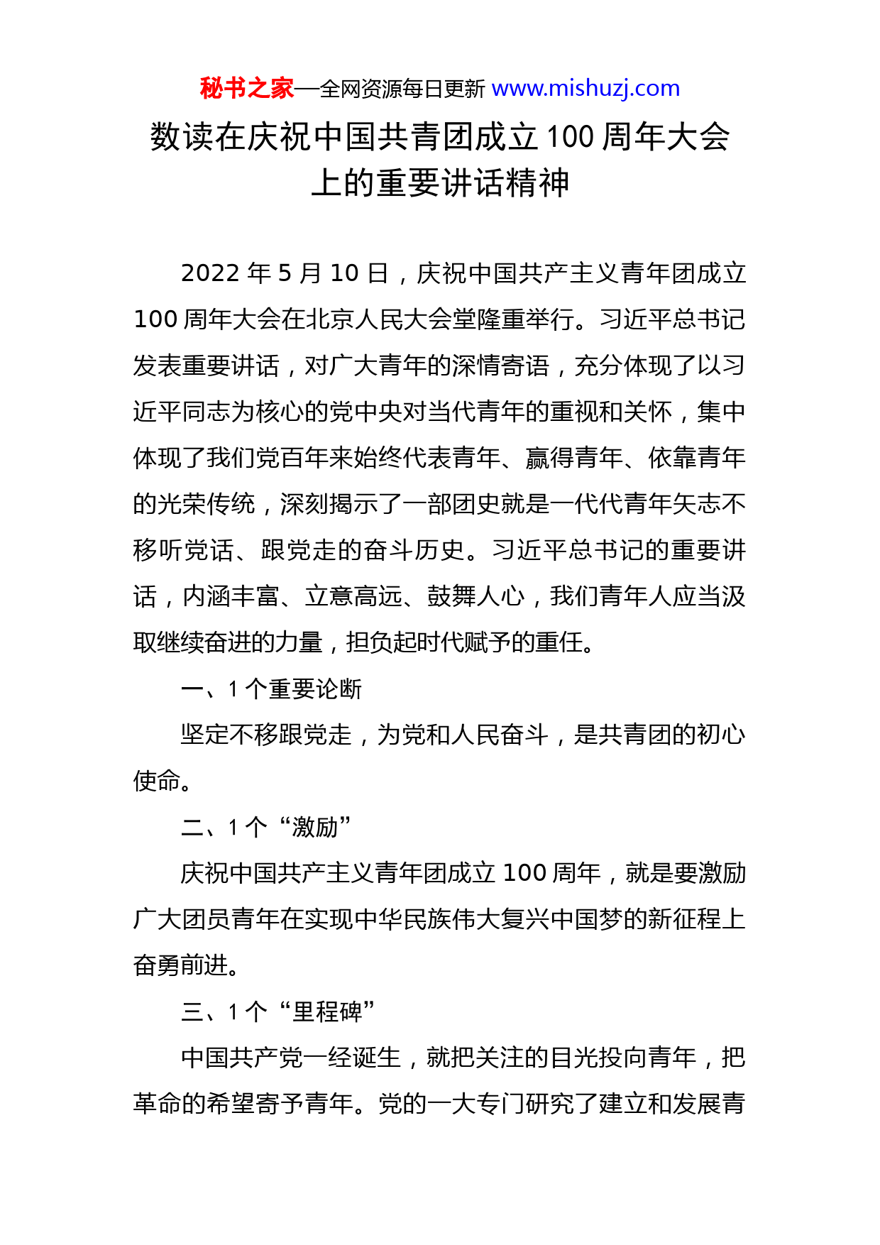 秘书之家—全网资源每日更新www.mishuzj.com数读在庆祝中国共青团成立100周年大会上的重要讲话精神2022年5月10日,庆祝中国共产主义青年团成立100周年大会在北京人民大会堂隆重举行。习近平总书记发表重要讲话,对广大青年的深情寄语,充分体现了以习近平同志为核心的党中央对当代青年的重视和关怀,集中体现了我们党百年来始终代表青年、赢得青年、依靠青年的光荣传统,深刻揭示了一部团史就是一代代青年矢志不移听党话、跟党走的奋斗历史。习近平总书记的重要讲话,内涵丰富、立意高远、鼓舞人心,我们青年人应当汲取继续奋进的力量,担负起时代赋予的重任。一、1个重要论断坚定不移跟党走,为党和人民奋斗,是共青团的初心使命。二、1个“激励”庆祝中国共产主义青年团成立100周年,就是要激励广大团员青年在实现中华民族伟大复兴中国梦的新征程上奋勇前进。三、1个“里程碑”中国共产党一经诞生,就把关注的目光投向青年,把革命的希望寄予青年。党的一大专门研究了建立和发展青秘书之家—全网资源每日更新www.mishuzj.com年团作为党的预备学校的问题。1922年5月5日,在中国共产党直接关怀和领导下,中国共产主义青年团宣告成立。这在中国革命史和青年运动史上具有里程碑意义!四、1个“重要遵循”越是往前走、向上攀,越是要善于从走过的路中汲取智慧、提振信心、增添力量。一百年来,共青团坚定理想、矢志不渝,形成了宝贵经验。这是共青团面向未来、再立新功的重要遵循。五、1个“重大课题”在新的征程上,如何更好把青年团结起来、组织起来、动员起来,为实现第二个百年奋斗目标、实现中华民族伟大复兴的中国梦而奋斗,是新时代中国青年运动和青年工作必须回答的重大课题。六、2个“不愧为”历史和实践充分证明,中国共青团不愧为中国青年运动的先锋队,不愧为党的忠实助手和可靠后备军!七、2个“殷切期待”1937年,毛泽东同志为陕北公学成立题词时说:“要造就一大批人,这些人是革命的先锋队。这些人具有政治远见。这些人充满着斗争精神和牺牲精神。这些人是胸怀坦白的,忠诚的,积极的,与正直的。这些人不谋私利,唯一的为着民族与社会的解放。这些人不怕困难,在困难秘书之家—全网资源每日更新www.mishuzj.com面前总是坚定的,勇敢向前的。这些人不是狂妄分子,也不是风头主义者,而是脚踏实地富于实际精神的人们。中国要有一大群这样的先锋分子,中国革命的任务就能够顺利的解决。”今天,党和人民同样需要一大批这样的先锋分子,党中央殷切希望共青团能够培养出一大批这样的先锋分子。这是党的殷切期待,也是祖国和人民的殷切期待!八、3种“人”各级党委(党组)要倾注极大热忱研究青年成长规律和时代特点,拿出极大精力抓青年工作,做青年朋友的知心人、青年工作的热心人、青年群众的引路人。各级党组织要落实党建带团建制度机制,经常研究解决共青团工作中的重大问题,热情关心、严格要求团干部,支持共青团按照群团工作特点和规律创造性地开展工作。九、3个“力”在新的征程上,如何更好把青年团结起来、组织起来、动员起来,为实现第二个百年奋斗目标、实现中华民族伟大复兴的中国梦而奋斗,是新时代中国青年运动和青年工作必须回答的重大课题。共青团要增强引领力、组织力、服务力,团结带领广大团员青年成长为有理想、敢担当、能吃苦、肯奋斗的新时代好青年,用青春的能动力和创造力激荡起民族复兴的澎湃春潮,用青春的智慧和汗水秘书之家—全网资源每日更新www.mishuzj.com打拼出一个更加美好的中国!十、4个“重要功勋”1.新民主主义革命时期共青团广泛传播马克思主义,用先进思想启迪青年觉醒、凝聚青春力量,团结带领广大团员青年踊跃投身反帝反封建的工人运动、农民运动、学生运动,积极参加党领导的革命武装,在打倒军阀、抗日救亡、推翻国民党反动统治的伟大斗争中冲锋陷阵,展现出不怕牺牲、浴血斗争的精神风貌。刀光剑影,枪林弹雨,广大团员青年对党忠贞不渝,经受住了生与死的考验,为中国革命胜利贡献了青春、建立了重要功勋!2.社会主义革命和建设时期共青团积极参与中华民族有史以来最为广泛而深刻的社会变革,组建青年突击队、青年垦荒队、青年扫盲队,开展学雷锋活动,团结带领广大团员青年激发“敢教日月换新天”的豪情,喊出“把青春献给祖国”的响亮口号,向科学进军,向困难进军,向荒原进军,展现出敢于拼搏、辛勤劳动的精神风貌。艰难困苦,千难万险,广大团员青年主动作为、勇挑重担,哪里最困难、哪里就有团的旗帜,哪里有需要、哪里就有团员青年的身影,为祖国建设贡献了青春、建立了重要功勋!3.改革开放和社会主义现代化建设新时期秘书之家—全网资源每日更新www.mishuzj.com共青团适应党和国家工作中心战略转移,解放思想,锐意进取,广泛开展争当新长征突击手、“五讲四美三热爱”、希望工程、青年志愿者、青年文明号、保护母亲河等一大批青春气息浓烈的创造性活动,团结带领广大团员青年发出“团结起来、振兴中华”的时代强音,在现代化建设各条战线上勇立潮头,展现出敢闯敢干、引领风尚的精神风貌。革故鼎新,建设四化,广大团员青年勇作改革闯将,开风气之先,为改革开放和社会主义现代化建设贡献了青春、建立