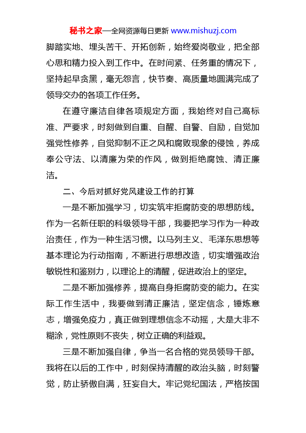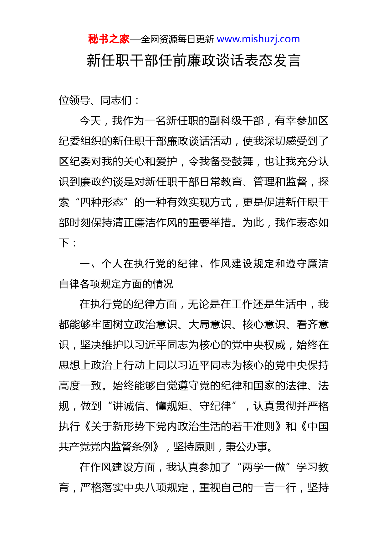 秘书之家—全网资源每日更新www.mishuzj.com新任职干部任前廉政谈话表态发言位领导、同志们:今天,我作为一名新任职的副科级干部,有幸参加区纪委组织的新任职干部廉政谈话活动,使我深切感受到了区纪委对我的关心和爱护,令我备受鼓舞,也让我充分认识到廉政约谈是对新任职干部日常教育、管理和监督,探索“四种形态”的一种有效实现方式,更是促进新任职干部时刻保持清正廉洁作风的重要举措。为此,我作表态如下:一、个人在执行党的纪律、作风建设规定和遵守廉洁自律各项规定方面的情况在执行党的纪律方面,无论是在工作还是生活中,我都能够牢固树立政治意识、大局意识、核心意识、看齐意识,坚决维护以习近平同志为核心的党中央权威,始终在思想上政治上行动上同以习近平同志为核心的党中央保持高度一致。始终能够自觉遵守党的纪律和国家的法律、法规,做到“讲诚信、懂规矩、守纪律”,认真贯彻并严格执行《关于新形势下党内政治生活的若干准则》和《中国共产党党内监督条例》,坚持原则,秉公办事。在作风建设方面,我认真参加了“两学一做”学习教育,严格落实中央八项规定,重视自己的一言一行,坚持秘书之家—全网资源每日更新www.mishuzj.com脚踏实地、埋头苦干、开拓创新,始终爱岗敬业,把全部心思和精力投入到工作中。在时间紧、任务重的情况下,坚持起早贪黑,毫无怨言,快节奏、高质量地圆满完成了领导交办的各项工作任务。在遵守廉洁自律各项规定方面,我始终对自己高标准、严要求,时刻做到自重、自醒、自警、自励,自觉加强党性修养,自觉抑制不正之风和腐败现象的侵蚀,养成奉公守法、以清廉为荣的作风,做到拒绝腐蚀、清正廉洁。二、今后对抓好党风建设工作的打算一是不断加强学习,切实筑牢拒腐防变的思想防线。作为一名新任职的科级领导干部,我要把学习作为一种政治责任,作为一种生活习惯。以马列主义、毛泽东思想等基本理论为行动指南,不断进行思想改造,切实增强政治敏锐性和鉴别力,以理论上的清醒,促进政治上的坚定。二是不断加强修养,提高自身拒腐防变的能力。在实际工作生活中,我要做到清正廉洁,坚定信念,锤炼意志,增强免疫力,真正做到理想信念不动摇,大是大非不糊涂,党性原则不丧失,树立正确的利益观。三是不断加强自律,争当一名合格的党员领导干部。我将在以后的工作中,时刻保持清醒的政治头脑,时刻警觉,防止骄傲自满,狂妄自大。牢记党纪国法,严格按国秘书之家—全网资源每日更新www.mishuzj.com家有关规定,认真践行“两学一做”,正确对待小事、小节、小利,自觉净化社交圈、生活圈、朋友圈,以信念、人格、实干立身,永葆共产党员的先进性和纯洁性,做一个干干净净、清清白白的人。进一步改进工作作风,树立开拓创新的精神,认真完成好本职工作,永葆工作激情和活力。三、对全区以及所在部门党风廉政建设工作的意见和建议一是进一步加大学习教育力度。提高全区党员领导干部的党风廉政建设意识,大力宣扬求真务实、艰苦奋斗、廉洁奉公的优良作风。二是进一步加强廉政文化建设。通过开展多种形式的廉政文化活动,在全社会营造崇尚廉洁的良好氛围。三是进一步发挥典型示范作用。用身边的事教育身边的人,起到带动、示范、警示教育的作用。总之,在今后的工作生活中,我我将以此次廉政谈话为新起点,警示自己,防微杜渐,警钟长鸣,努力做好本职工作,为xx各项事业发展作出自己应有的贡献。