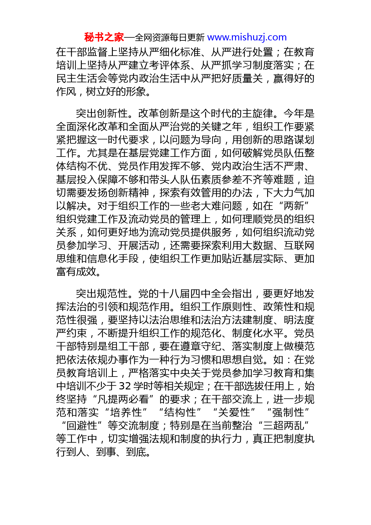 秘书之家—全网资源每日更新www.mishuzj.com新常态下组织工作应坚持“五个突出”党的十八大以来,党中央治国理政、管党治党呈现新的时代特征,主要体现在三个新常态:即经济发展新常态从严治党新常态、作风建设新常态。特别是习近平总书记“四个全面”的治国理政方略布局,对组织工作提出了更高的要求。面对新任务新挑战,做好新常态下的组织工作应重点突出五个方面的特性。突出政治性。政治性是组织工作的根和魂。习近平总书记在全国组织工作会议上,对组织工作提出明确要求,首要一条就是“讲政治”。坚持把政治属性作为全面从严治党的核心要求。具体到一个地方,要推动经济转型创新发展在新常态下取得新突破,就离不开组织人才的支撑和保障。而这种支撑和保障主要是政治支撑和政治保障。讲政治,就是要站稳政治立场、严守政治纪律、履行政治责任。比如:在选拔任用干部中要坚持政治标准、考察政治表现;整治“三超两乱”工作中要坚定政治立场、严格政治要求;整治“四风”问题上要严肃政治纪律、强化政治责任;在人才工作中要注重政治引领,加强对知识分子的政治引导和政治吸纳;基层党建要强化政治功能,从政治上教育引导党员群众。突出严肃性。组织工作是一项严肃的事业,需要严谨的作风来保障和推动。刘云山同志在全国组织部长会议上强调,要突出全面从严治党主线,坚持思想教育从严、干部管理从严、作风要求从严、组织建设从严、制度执行从严,统筹推进党的建设和组织工作各项任务。这“五个从严”的落实,需要组织部门和广大组工干部更加主动担当积极作为,在认识上到位、能力上提高、方法上改进、作风上过硬,把从严治党要求全面落实到每一项具体工作中如:在“三级联述联评联考”中坚持从严评议、从严考核在发展党员时坚持从严把好入口关、从严落实工作责任;秘书之家—全网资源每日更新www.mishuzj.com在干部监督上坚持从严细化标准、从严进行处置;在教育培训上坚持从严建立考评体系、从严抓学习制度落实;在民主生活会等党内政治生活中从严把好质量关,赢得好的作风,树立好的形象。突出创新性。改革创新是这个时代的主旋律。今年是全面深化改革和全面从严治党的关键之年,组织工作要紧紧把握这一时代要求,以问题为导向,用创新的思路谋划工作。尤其是在基层党建工作方面,如何破解党员队伍整体结构不优、党员作用发挥不够、党内政治生活不严肃、基层投入保障不够和带头人队伍素质参差不齐等难题,迫切需要发扬创新精神,探索有效管用的办法,下大力气加以解决。对于组织工作的一些老大难问题,如在“两新”组织党建工作及流动党员的管理上,如何理顺党员的组织关系,如何更好地为流动党员提供服务,如何组织流动党员参加学习、开展活动,还需要探索利用大数据、互联网思维和信息化手段,使组织工作更加贴近基层实际、更加富有成效。突出规范性。党的十八届四中全会指出,要更好地发挥法治的引领和规范作用。组织工作原则性、政策性和规范性很强,要坚持以法治思维和法治方法建制度、明法度严约束,不断提升组织工作的规范化、制度化水平。党员干部特别是组工干部,要在遵章守纪、落实制度上做模范把依法依规办事作为一种行为习惯和思想自觉。如:在党员教育培训上,严格落实中央关于党员参加学习教育和集中培训不少于32学时等相关规定;在干部选拔任用上,始终坚持“凡提两必看”的要求;在干部交流上,进一步规范和落实“培养性”“结构性”“关爱性”“强制性”“回避性”等交流制度;特别是在当前整治“三超两乱”等工作中,切实增强法规和制度的执行力,真正把制度执行到人、到事、到底。秘书之家—全网资源每日更新www.mishuzj.com突出细致性。“组织工作无小事”,任何的纰漏和草率都会使工作陷于被动,造成难以弥补的影响甚至无可挽回的损失。因此,组织工作要注重做好基础性工作,部署工作从小处着手,落实任务严格按程序、步骤推进。坚持求真务实,力戒形式主义,严禁弄虚作假,做到见微知著如:调查研究工作要脚踏实地、深入基层;干部考察上要周密严谨、用心细致;对于工作中的问题和细节要坚持守口如瓶,对档案和资料的密级规定要严格执行,始终严格履行党的保密纪律。做到在锐意进取中严谨求实,在大胆创新中细致周密,不断提高组织工作科学化水平。