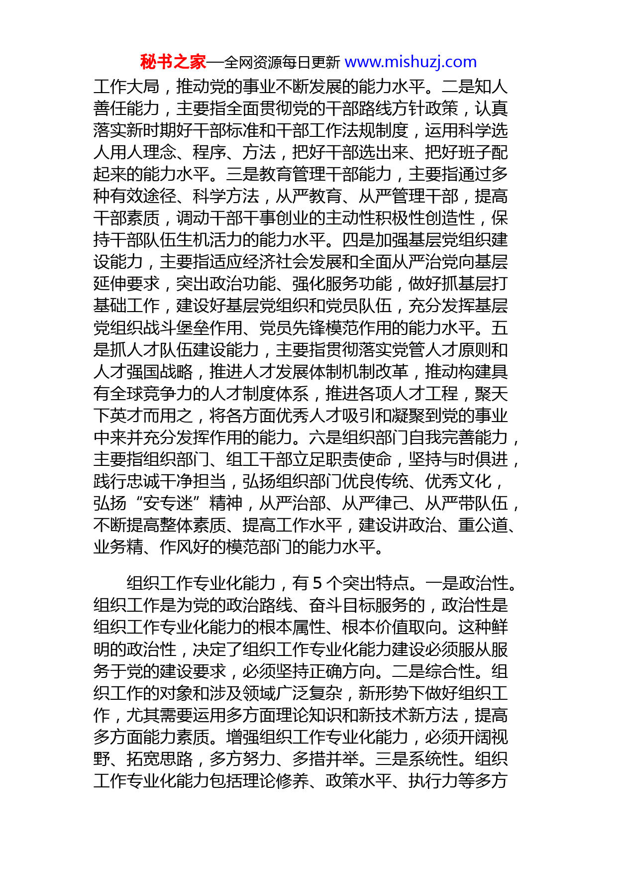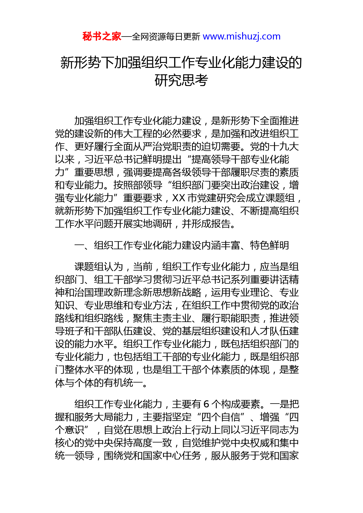 秘书之家—全网资源每日更新www.mishuzj.com新形势下加强组织工作专业化能力建设的研究思考加强组织工作专业化能力建设,是新形势下全面推进党的建设新的伟大工程的必然要求,是加强和改进组织工作、更好履行全面从严治党职责的迫切需要。党的十九大以来,习近平总书记鲜明提出“提高领导干部专业化能力”重要思想,强调要提高各级领导干部履职尽责的素质和专业能力。按照部领导“组织部门要突出政治建设,增强专业化能力”重要要求,XX市党建研究会成立课题组,就新形势下加强组织工作专业化能力建设、不断提高组织工作水平问题开展实地调研,并形成报告。一、组织工作专业化能力建设内涵丰富、特色鲜明课题组认为,当前,组织工作专业化能力,应当是组织部门、组工干部学习贯彻习近平总书记系列重要讲话精神和治国理政新理念新思想新战略,运用专业理论、专业知识、专业思维和专业方法,在组织工作中贯彻党的政治路线和组织路线,聚焦主责主业、履行职能职责,推进领导班子和干部队伍建设、党的基层组织建设和人才队伍建设的能力水平。组织工作专业化能力,既包括组织部门的专业化能力,也包括组工干部的专业化能力,既是组织部门整体水平的体现,也是组工干部个体素质的体现,是整体与个体的有机统一。组织工作专业化能力,主要有6个构成要素。一是把握和服务大局能力,主要指坚定“四个自信”、增强“四个意识”,自觉在思想上政治上行动上同以习近平同志为核心的党中央保持高度一致,自觉维护党中央权威和集中统一领导,围绕党和国家中心任务,服从服务于党和国家秘书之家—全网资源每日更新www.mishuzj.com工作大局,推动党的事业不断发展的能力水平。二是知人善任能力,主要指全面贯彻党的干部路线方针政策,认真落实新时期好干部标准和干部工作法规制度,运用科学选人用人理念、程序、方法,把好干部选出来、把好班子配起来的能力水平。三是教育管理干部能力,主要指通过多种有效途径、科学方法,从严教育、从严管理干部,提高干部素质,调动干部干事创业的主动性积极性创造性,保持干部队伍生机活力的能力水平。四是加强基层党组织建设能力,主要指适应经济社会发展和全面从严治党向基层延伸要求,突出政治功能、强化服务功能,做好抓基层打基础工作,建设好基层党组织和党员队伍,充分发挥基层党组织战斗堡垒作用、党员先锋模范作用的能力水平。五是抓人才队伍建设能力,主要指贯彻落实党管人才原则和人才强国战略,推进人才发展体制机制改革,推动构建具有全球竞争力的人才制度体系,推进各项人才工程,聚天下英才而用之,将各方面优秀人才吸引和凝聚到党的事业中来并充分发挥作用的能力。六是组织部门自我完善能力,主要指组织部门、组工干部立足职责使命,坚持与时俱进,践行忠诚干净担当,弘扬组织部门优良传统、优秀文化,弘扬“安专迷”精神,从严治部、从严律己、从严带队伍,不断提高整体素质、提高工作水平,建设讲政治、重公道、业务精、作风好的模范部门的能力水平。组织工作专业化能力,有5个突出特点。一是政治性。组织工作是为党的政治路线、奋斗目标服务的,政治性是组织工作专业化能力的根本属性、根本价值取向。这种鲜明的政治性,决定了组织工作专业化能力建设必须服从服务于党的建设要求,必须坚持正确方向。二是综合性。组织工作的对象和涉及领域广泛复杂,新形势下做好组织工作,尤其需要运用多方面理论知识和新技术新方法,提高多方面能力素质。增强组织工作专业化能力,必须开阔视野、拓宽思路,多方努力、多措并举。三是系统性。组织工作专业化能力包括理论修养、政策水平、执行力等多方秘书之家—全网资源每日更新www.mishuzj.com面要素,这些要素密切关联、彼此影响、交互作用,又与党的建设和组织工作的整体水平、与社会发展整体状况息息相关,因此具有很强的系统性。四是规范性。组织工作专业化能力建设,必须在党的路线方针政策的指引下开展,必须遵循严格的制度规矩、采用规范的程序方法,必须符合党的纪律要求,同时应当有着明确而具体的内涵、重点、标准和要求,严谨而又规范。五是实践性。组织工作专业化能力,归根结底,是在实践中获得并逐步提升的。相关建设的成效,最重要的,要体现在运用相关规律指导组织工作实践的水平上,体现在破解组织工作重点难点问题、推动组织工作不断创新发展上。同时,组织工作专业化能力建设,也是一个动态过程。党和国家事业的不断发展,形势任务的不断变化,党员干部群众对于党的组织工作期盼的不断提升,必然要求组织工作专业化能力建设不断与时俱进、提高水平。二、党的十九大以来组织工作专业化能力建设步履坚实、成效明显能力建设是组织工作的永恒主题。十九大以来,在以习近平同志为核心的党中央坚强领导下,组织部门紧紧围绕协调推进“四个全面”战略布局、贯彻落实新发展理念,着力加强专业化能力建设,推动组织工作专业化能力迈上新台阶。一是强化理论武装,把坚定理想信念、增强“四个自信”作为增强组织工作专业化能力的根本。采取中心组学习、专题辅导、举办轮训班、开展理论研讨等形式,组织组工干部深入学习党的十九大和十九届三中、四中、五中全会精