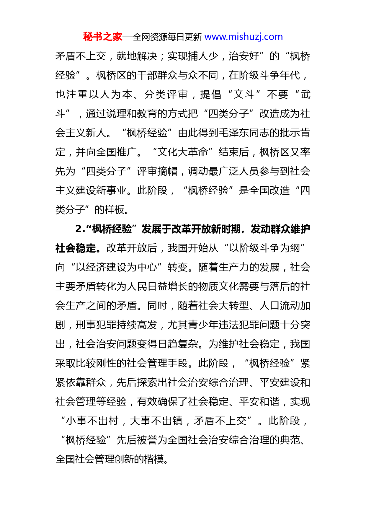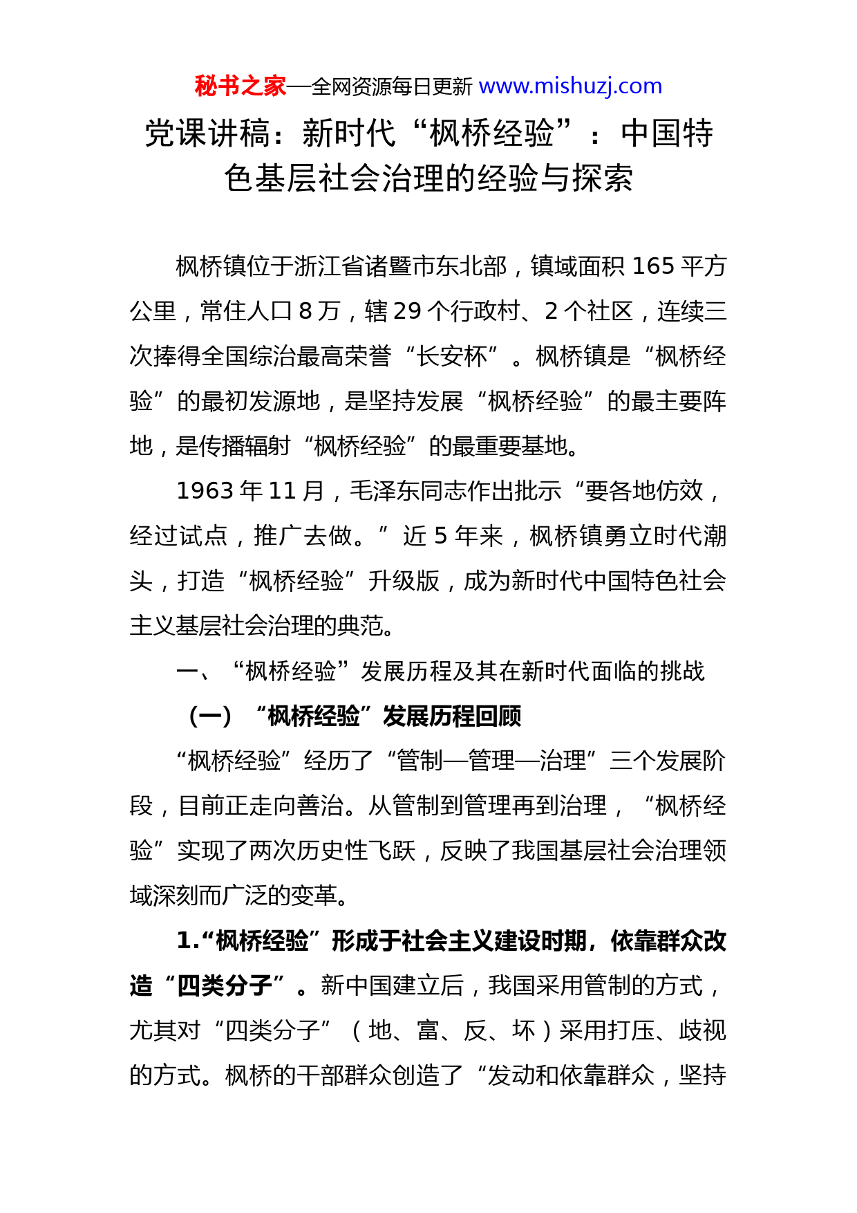 秘书之家—全网资源每日更新www.mishuzj.com党课讲稿:新时代“枫桥经验”:中国特色基层社会治理的经验与探索枫桥镇位于浙江省诸暨市东北部,镇域面积165平方公里,常住人口8万,辖29个行政村、2个社区,连续三次捧得全国综治最高荣誉“长安杯”。枫桥镇是“枫桥经验”的最初发源地,是坚持发展“枫桥经验”的最主要阵地,是传播辐射“枫桥经验”的最重要基地。1963年11月,毛泽东同志作出批示“要各地仿效,经过试点,推广去做。”近5年来,枫桥镇勇立时代潮头,打造“枫桥经验”升级版,成为新时代中国特色社会主义基层社会治理的典范。一、“枫桥经验”发展历程及其在新时代面临的挑战(一)“枫桥经验”发展历程回顾“枫桥经验”经历了“管制—管理—治理”三个发展阶段,目前正走向善治。从管制到管理再到治理,“枫桥经验”实现了两次历史性飞跃,反映了我国基层社会治理领域深刻而广泛的变革。1.“枫桥经验”形成于社会主义建设时期,依靠群众改造“四类分子”。新中国建立后,我国采用管制的方式,尤其对“四类分子”(地、富、反、坏)采用打压、歧视的方式。枫桥的干部群众创造了“发动和依靠群众,坚持秘书之家—全网资源每日更新www.mishuzj.com矛盾不上交,就地解决;实现捕人少,治安好”的“枫桥经验”。枫桥区的干部群众与众不同,在阶级斗争年代,也注重以人为本、分类评审,提倡“文斗”不要“武斗”,通过说理和教育的方式把“四类分子”改造成为社会主义新人。“枫桥经验”由此得到毛泽东同志的批示肯定,并向全国推广。“文化大革命”结束后,枫桥区又率先为“四类分子”评审摘帽,调动最广泛人员参与到社会主义建设新事业。此阶段,“枫桥经验”是全国改造“四类分子”的样板。2.“枫桥经验”发展于改革开放新时期,发动群众维护社会稳定。改革开放后,我国开始从“以阶级斗争为纲”向“以经济建设为中心”转变。随着生产力的发展,社会主要矛盾转化为人民日益增长的物质文化需要与落后的社会生产之间的矛盾。同时,随着社会大转型、人口流动加剧,刑事犯罪持续高发,尤其青少年违法犯罪问题十分突出,社会治安问题变得日趋复杂。为维护社会稳定,我国采取比较刚性的社会管理手段。此阶段,“枫桥经验”紧紧依靠群众,先后探索出社会治安综合治理、平安建设和社会管理等经验,有效确保了社会稳定、平安和谐,实现“小事不出村,大事不出镇,矛盾不上交”。此阶段,“枫桥经验”先后被誉为全国社会治安综合治理的典范、全国社会管理创新的楷模。秘书之家—全网资源每日更新www.mishuzj.com3.“枫桥经验”深化于中国特色社会主义新时代,以人民为中心创新社会治理。党的十八大以来,中央推进国家治理体系和治理能力现代化,改“社会管理”为“社会治理”。在这样的背景下,“枫桥经验”逐步转型,着力创新基层社会治理,加快推进基层社会治理现代化步伐,创新了“基层党建引领、基层法治建设、社会组织培育、乡村道德重塑、矛盾纠纷多元化解、基层治理四个平台、最多跑一次”等新经验,努力实现“矛盾不上交,平安不出事,服务不缺位”。此阶段,“枫桥经验”是中国特色社会主义基层治理的典型代表。(二)“枫桥经验”在新时代面临的新挑战1.多元化时代来临,基层迫切需要改变党政包揽的做法。基层多以党委政府包揽、行政式推动为主。最终导致的结果是:第一,政府管理的事情越来越多、越来越庞杂,囊括了群众生老病死的方方面面,花费了大量的人力、物力和财力。但这并没有效提高人民群众对政府的满意度,反而出现少数群众抱怨政府、坐等思想严重等情况。第二,社会组织数量很少,呈“低小散”现象,且大多数属于文体类社会组织,没有积极参与到公共事务发挥作用。2.法治化时代来临,基层迫切需要加强法治配套建设。基层虽然已经有了法治思维,但因为法治配套性措施秘书之家—全网资源每日更新www.mishuzj.com的缺乏,法治方法还没有切实运用起来。一是基层政府缺乏专门的法治机构(如法治办);二是基层村干部的法治水平较低;三是基层群众的法治自觉和法治素养有待提升,甚至部分群众“信访不信法”,扰乱社会秩序和法治环境。3.互联网时代来临,基层迫切需要提高智慧化治理手段。枫桥镇虽然是乡镇,但信息化进程快,移动互联网快速发展,上网非常便捷,微信、微博、QQ等通讯工具成为群众获取信息和网上社交的主要手段,同时群众对政务服务、政府管理、矛盾化解的诉求越来越要求便捷化,人人都是自媒体,随时会到网上去曝光。但与群众纷繁复杂的需求相比,基层政府的智能化治理手段仍然匮乏,当时也没有真正有效建立起统一的数据平台,解决问题的效率有待提升。4.精细化时代来临,基层迫切需要加强专业化人才培养。党的十八届五中全会提出“社会治理精细化”,精细化治理除了要依靠技术手段,还要依靠专业人才。但乡镇一级政府跟上级对基层的精细化、专业化治理的高要求不相匹配。一是缺乏综治专业人才。二是缺乏专业社工人才。枫桥镇有百树、天竺2个集镇社区,有28个农村社区,但在2015年之前,这些农村社区的专职服务人员普遍由老文书担任。另外,枫桥镇2015年已经培育了近30个秘书之家—全网资源每日更新www.mishuzj.com社会组织,但当时没有一个专业的社工来