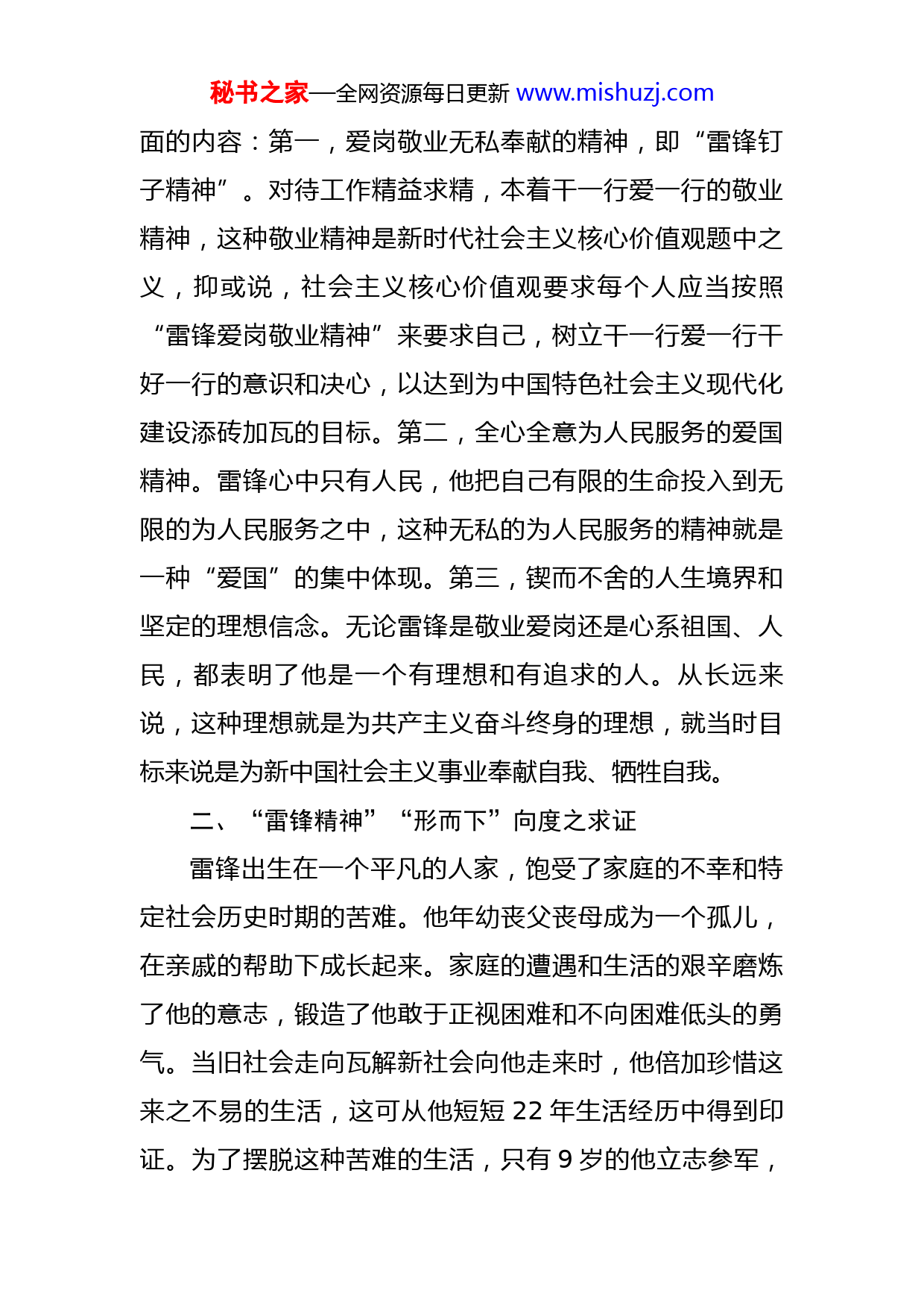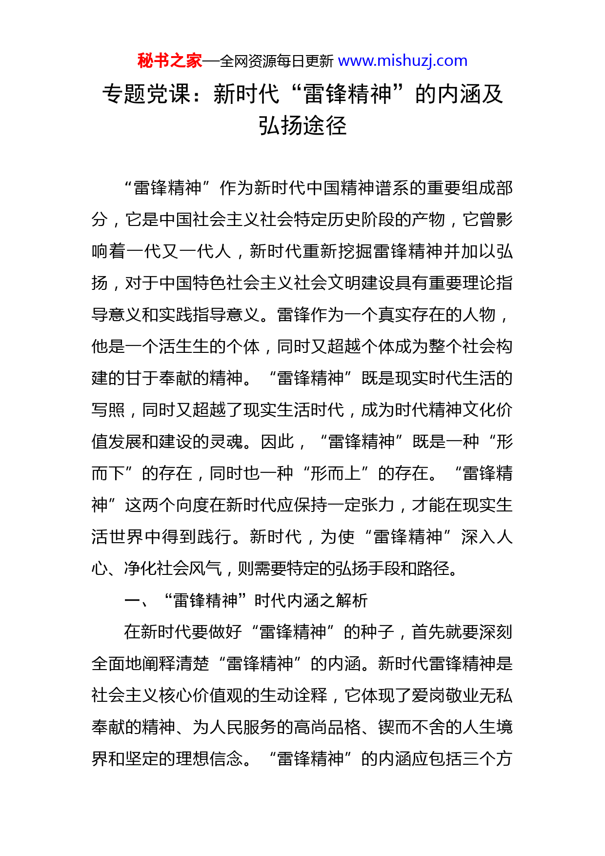 秘书之家—全网资源每日更新www.mishuzj.com专题党课:新时代“雷锋精神”的内涵及弘扬途径“雷锋精神”作为新时代中国精神谱系的重要组成部分,它是中国社会主义社会特定历史阶段的产物,它曾影响着一代又一代人,新时代重新挖掘雷锋精神并加以弘扬,对于中国特色社会主义社会文明建设具有重要理论指导意义和实践指导意义。雷锋作为一个真实存在的人物,他是一个活生生的个体,同时又超越个体成为整个社会构建的甘于奉献的精神。“雷锋精神”既是现实时代生活的写照,同时又超越了现实生活时代,成为时代精神文化价值发展和建设的灵魂。因此,“雷锋精神”既是一种“形而下”的存在,同时也一种“形而上”的存在。“雷锋精神”这两个向度在新时代应保持一定张力,才能在现实生活世界中得到践行。新时代,为使“雷锋精神”深入人心、净化社会风气,则需要特定的弘扬手段和路径。一、“雷锋精神”时代内涵之解析在新时代要做好“雷锋精神”的种子,首先就要深刻全面地阐释清楚“雷锋精神”的内涵。新时代雷锋精神是社会主义核心价值观的生动诠释,它体现了爱岗敬业无私奉献的精神、为人民服务的高尚品格、锲而不舍的人生境界和坚定的理想信念。“雷锋精神”的内涵应包括三个方秘书之家—全网资源每日更新www.mishuzj.com面的内容:第一,爱岗敬业无私奉献的精神,即“雷锋钉子精神”。对待工作精益求精,本着干一行爱一行的敬业精神,这种敬业精神是新时代社会主义核心价值观题中之义,抑或说,社会主义核心价值观要求每个人应当按照“雷锋爱岗敬业精神”来要求自己,树立干一行爱一行干好一行的意识和决心,以达到为中国特色社会主义现代化建设添砖加瓦的目标。第二,全心全意为人民服务的爱国精神。雷锋心中只有人民,他把自己有限的生命投入到无限的为人民服务之中,这种无私的为人民服务的精神就是一种“爱国”的集中体现。第三,锲而不舍的人生境界和坚定的理想信念。无论雷锋是敬业爱岗还是心系祖国、人民,都表明了他是一个有理想和有追求的人。从长远来说,这种理想就是为共产主义奋斗终身的理想,就当时目标来说是为新中国社会主义事业奉献自我、牺牲自我。二、“雷锋精神”“形而下”向度之求证雷锋出生在一个平凡的人家,饱受了家庭的不幸和特定社会历史时期的苦难。他年幼丧父丧母成为一个孤儿,在亲戚的帮助下成长起来。家庭的遭遇和生活的艰辛磨炼了他的意志,锻造了他敢于正视困难和不向困难低头的勇气。当旧社会走向瓦解新社会向他走来时,他倍加珍惜这来之不易的生活,这可从他短短22年生活经历中得到印证。为了摆脱这种苦难的生活,只有9岁的他立志参军,秘书之家—全网资源每日更新www.mishuzj.com并在1959年如愿参加了中国人民解放军。1956年,年满16岁的他参加了工作,他在乡政府做通信员,次年被评为“机关模范工作者”。1958年春天,雷锋来到团山湖农场当了一名拖拉机手,同年9月,雷锋来到鞍钢做了一名推土机手。在其工作期间,获得了“红旗手”“劳动模范”等各种荣誉称号,尤其是在鞍钢,他3次被评为“先进生产者”,5次被评为“红旗手”,18次被评为“标兵”。这些荣誉称号彰显了他工作的态度,同时更是他人生观、世界观和价值观的真实写照。对待工作,他干一行爱一行,这种爱岗敬业的精神也彰显了他的爱国精神。他能够发自内心地把“爱岗”和“爱国”很好地融合在一起,这与他正确的世界观、人生观和价值观有密切的关系。面对生活的不幸和苦难,他能以“不经风雨,长不成大树;不受百炼,难以成钢”的人生观去加以战胜,这种人生观在现代社会中可能只是一种“名言”,但在雷锋那里却是他生命和生活的写照。这种永不退缩、积极奋发的人生观,不是大思想家或伟人生命的写照,而是一个弱小的平凡的雷锋生命的写照,这是让世人震撼的。一个小小的身躯承载着一个时代内涵和精神;这是让世人敬畏的,这种人生观与他的世界观和价值观是密不可分的。他的世界观、人生观和价值观达到了高度一致,使得他个人生活价值在社会集体中得到实现。雷锋是一颗永远发光的“螺丝钉”,秘书之家—全网资源每日更新www.mishuzj.com这颗螺丝钉找到了他的人生价值和社会价值。毋庸置疑,“雷锋”作为一个个体,他是真实存在的,这是“雷锋精神”得以真实存在的基础。在此意义上,“雷锋精神”正如雷锋本人一样也不是社会虚构,它是社会真实存在的精神,可以说“雷锋精神”也是一种“形而下”的存在。因此研究雷锋精神必须正视这种“形而下”的向度。只有让众人了解知晓这一“形而下”的精神才能建构更加符合现代社会实际的“形而上”的“雷锋精神”。由此而知,“雷锋精神”“形而下”的向度主要体现两个层面的内涵,一是就雷锋本人而言,他是一个活生生的个体,他的生活经历磨砺了他的坚强品格,他生活的社会奠定了他人生的发展轨迹,他个人的生活日记记载了他对新社会的热爱和奉献精神,这是最“形而下”的向度。二是就“雷锋精神”而言,“雷锋精神”已超越了他个人的界限,影响了一代又一代人,成为整个社会塑造和追求的精神,在社会中真实存在并将继续存在。在新时代中国特色社会主义建设中,“雷锋精神”不断地与社会主义核心价值观践行紧密结