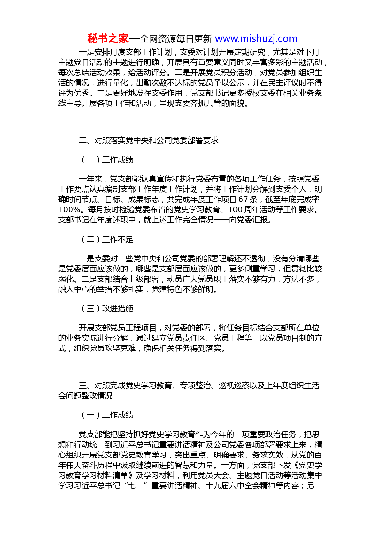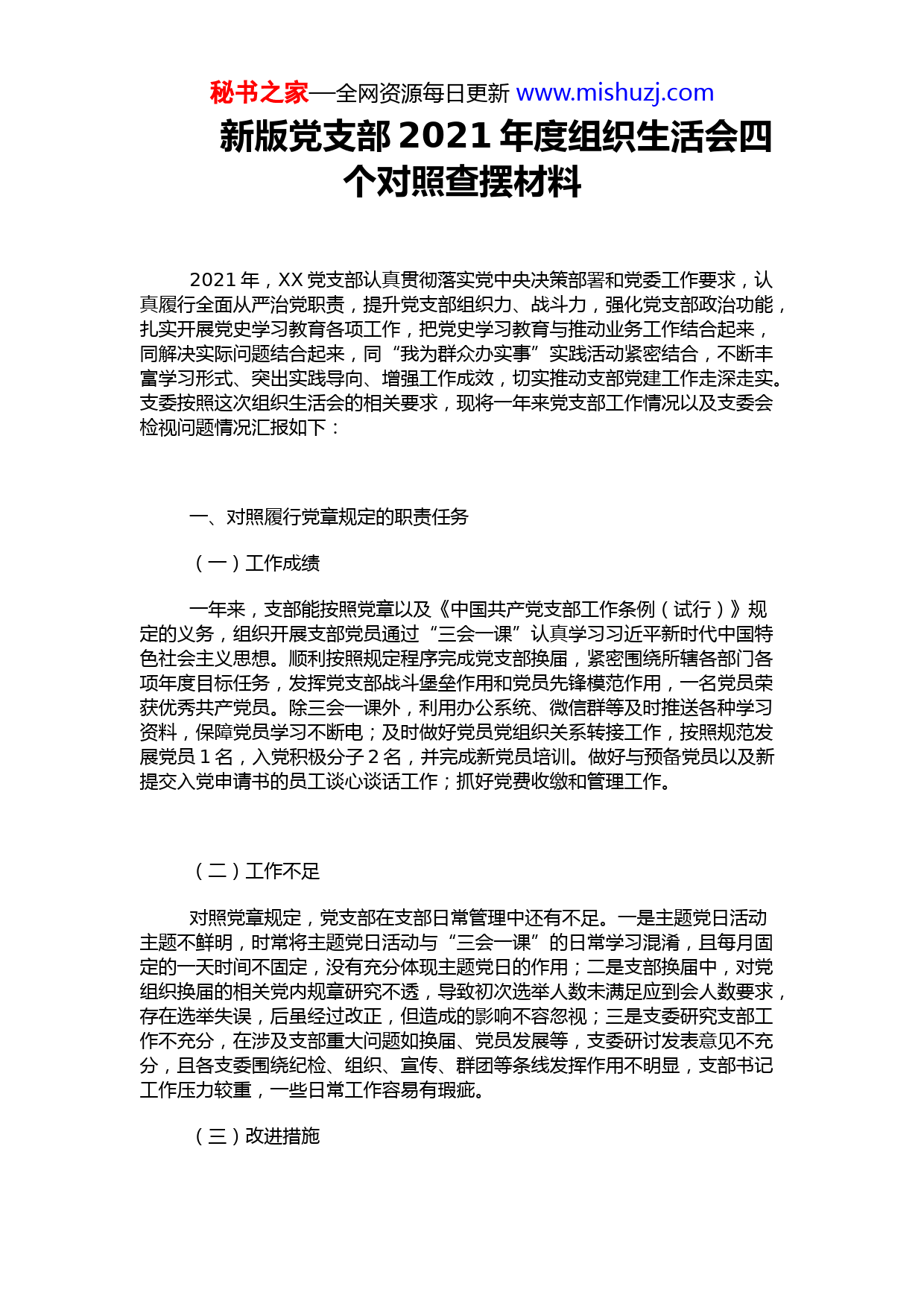 秘书之家—全网资源每日更新www.mishuzj.com新版党支部2021年度组织生活会四个对照查摆材料2021年,XX党支部认真贯彻落实党中央决策部署和党委工作要求,认真履行全面从严治党职责,提升党支部组织力、战斗力,强化党支部政治功能,扎实开展党史学习教育各项工作,把党史学习教育与推动业务工作结合起来,同解决实际问题结合起来,同“我为群众办实事”实践活动紧密结合,不断丰富学习形式、突出实践导向、增强工作成效,切实推动支部党建工作走深走实。支委按照这次组织生活会的相关要求,现将一年来党支部工作情况以及支委会检视问题情况汇报如下:一、对照履行党章规定的职责任务(一)工作成绩一年来,支部能按照党章以及《中国共产党支部工作条例(试行)》规定的义务,组织开展支部党员通过“三会一课”认真学习习近平新时代中国特色社会主义思想。顺利按照规定程序完成党支部换届,紧密围绕所辖各部门各项年度目标任务,发挥党支部战斗堡垒作用和党员先锋模范作用,一名党员荣获优秀共产党员。除三会一课外,利用办公系统、微信群等及时推送各种学习资料,保障党员学习不断电;及时做好党员党组织关系转接工作,按照规范发展党员1名,入党积极分子2名,并完成新党员培训。做好与预备党员以及新提交入党申请书的员工谈心谈话工作;抓好党费收缴和管理工作。(二)工作不足对照党章规定,党支部在支部日常管理中还有不足。一是主题党日活动主题不鲜明,时常将主题党日活动与“三会一课”的日常学习混淆,且每月固定的一天时间不固定,没有充分体现主题党日的作用;二是支部换届中,对党组织换届的相关党内规章研究不透,导致初次选举人数未满足应到会人数要求,存在选举失误,后虽经过改正,但造成的影响不容忽视;三是支委研究支部工作不充分,在涉及支部重大问题如换届、党员发展等,支委研讨发表意见不充分,且各支委围绕纪检、组织、宣传、群团等条线发挥作用不明显,支部书记工作压力较重,一些日常工作容易有瑕疵。(三)改进措施秘书之家—全网资源每日更新www.mishuzj.com一是安排月度支部工作计划,支委对计划开展定期研究,尤其是对下月主题党日活动的主题进行明确,开展具有重要意义同时又丰富多彩的主题活动,每次总结活动效果,给活动评分。二是开展党员积分活动,对党员参加组织生活的情况,进行量化,出勤次数不达标的党员予以公示,并在民主评议时不得评为优秀。三是更好地发挥支委作用,党支部书记更多授权支委在相关业务条线主导开展各项工作和活动,呈现支委齐抓共管的面貌。二、对照落实党中央和公司党委部署要求(一)工作成绩一年来,党支部能认真宣传和执行党委布置的各项工作任务,按照党委工作要点认真编制支部工作年度工作计划,并将工作计划分解到支委个人,明确时间节点、目标、成果标志,共完成年度工作项目67条,截至年底完成率100%。每月按时检验党委布置的党史学习教育、100周年活动等工作要求。支部书记在年度述职中,就上述工作完全情况一一向党委汇报。(二)工作不足一是支委对一些党中央和公司党委的部署理解还不透彻,没有分清哪些是党委层面应该做的,哪些是支部层面应该做的,更多侧重学习,但贯彻比较弱化。二是支部结合上级部署,动员广大党员职工落实不够有力,方法不多,融入中心的举措不够扎实,党建特色不够鲜明。(三)改进措施开展支部党员工程项目,对党委的部署,将任务目标结合支部所在单位的业务实际进行分解,通过建立党员责任区、党员工程等,以党员项目制的方式,组织党员攻坚克难,确保相关任务得到落实。三、对照完成党史学习教育、专项整治、巡视巡察以及上年度组织生活会问题整改情况(一)工作成绩党支部能把坚持抓好党史学习教育作为今年的一项重要政治任务,把思想和行动统一到习近平总书记重要讲话精神及公司党委各项部署要求上来,精心组织开展党支部党史教育学习,突出重点、明确要求、务求实效,从党的百年伟大奋斗历程中汲取继续前进的智慧和力量。一方面,党支部下发《党史学习教育学习材料清单》及学习材料,利用党员大会、主题党日活动等活动集中学习习近平总书记“七一”重要讲话精神、十九届六中全会精神等内容;另一秘书之家—全网资源每日更新www.mishuzj.com方面,组织党员收看“七一”庆祝中国共产党成立100周年大会直播,组织党员前往纪念馆开展党史学习教育。(二)工作不足在组织开展党史学习教育方面,理论学习还不够深入系统,对《中国共产党简史》等的学习不够深入,读原著、学原文、悟原理还有待加强,熟练运用党史中的宝贵经验指导实际工作方面还需要进一步提升。(三)改进措施把党史学习教育作为增强党性修养的基本功,常态化抓紧抓好,从党史中汲取宝贵历史经验,坚定不移向党中央看齐,不断提高政治判断力、政治领悟力、政治执行力,严明政治纪律和政治规矩,推动党员干部政治意识明显增强、政治觉悟明显提高。高质量安排好党支部中心组学习,邀请公司党委委员讲党课,进一步增强以史为鉴、开创未来的责任感。四、对照职工群众的新期待(一)工作成绩突出实践导向,切实推动“我为群众办实事”重点项目。注重将党史学习教育与开展“我为群众办实事”实践活动密切结合起来,与公司年度目标任务密