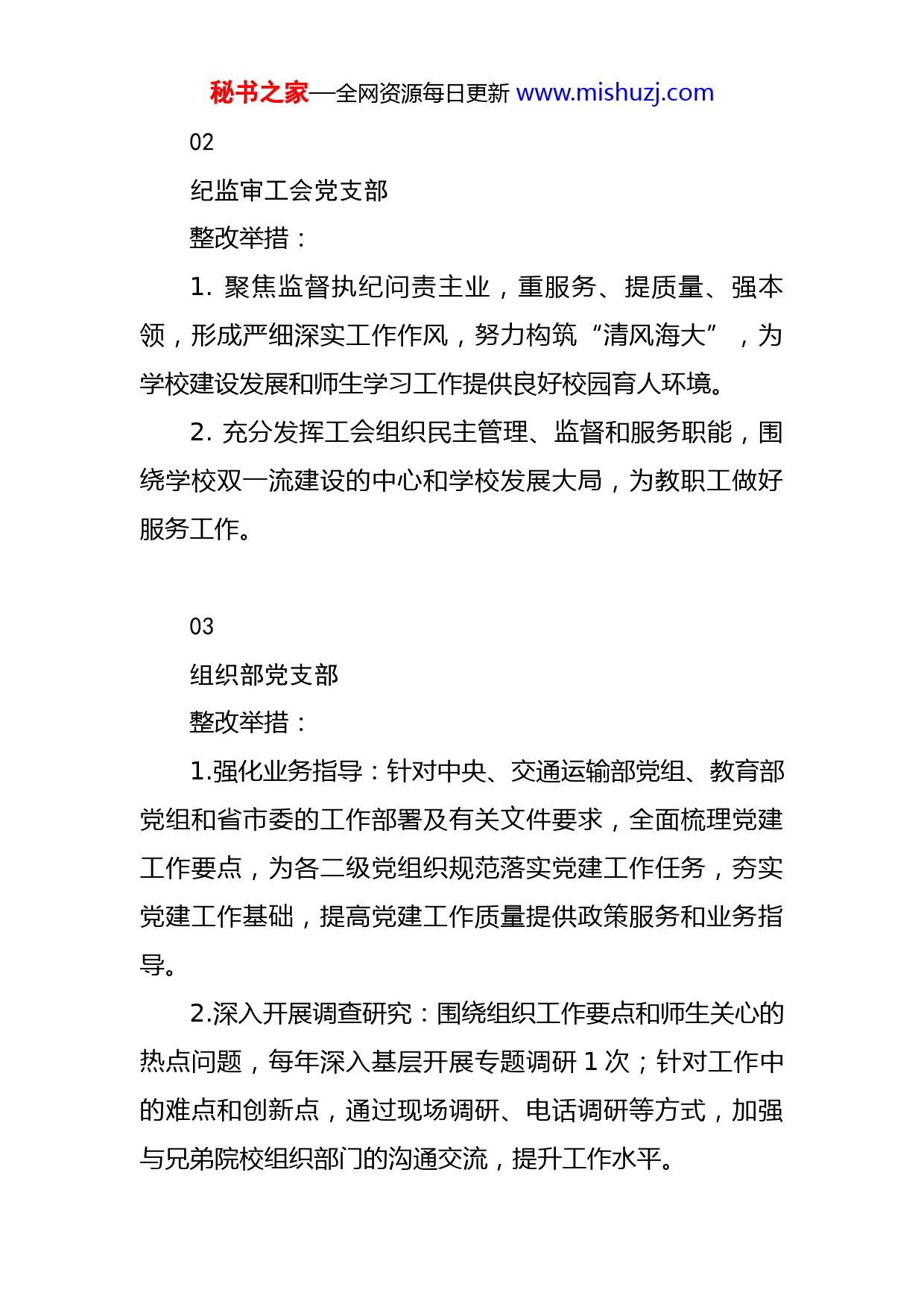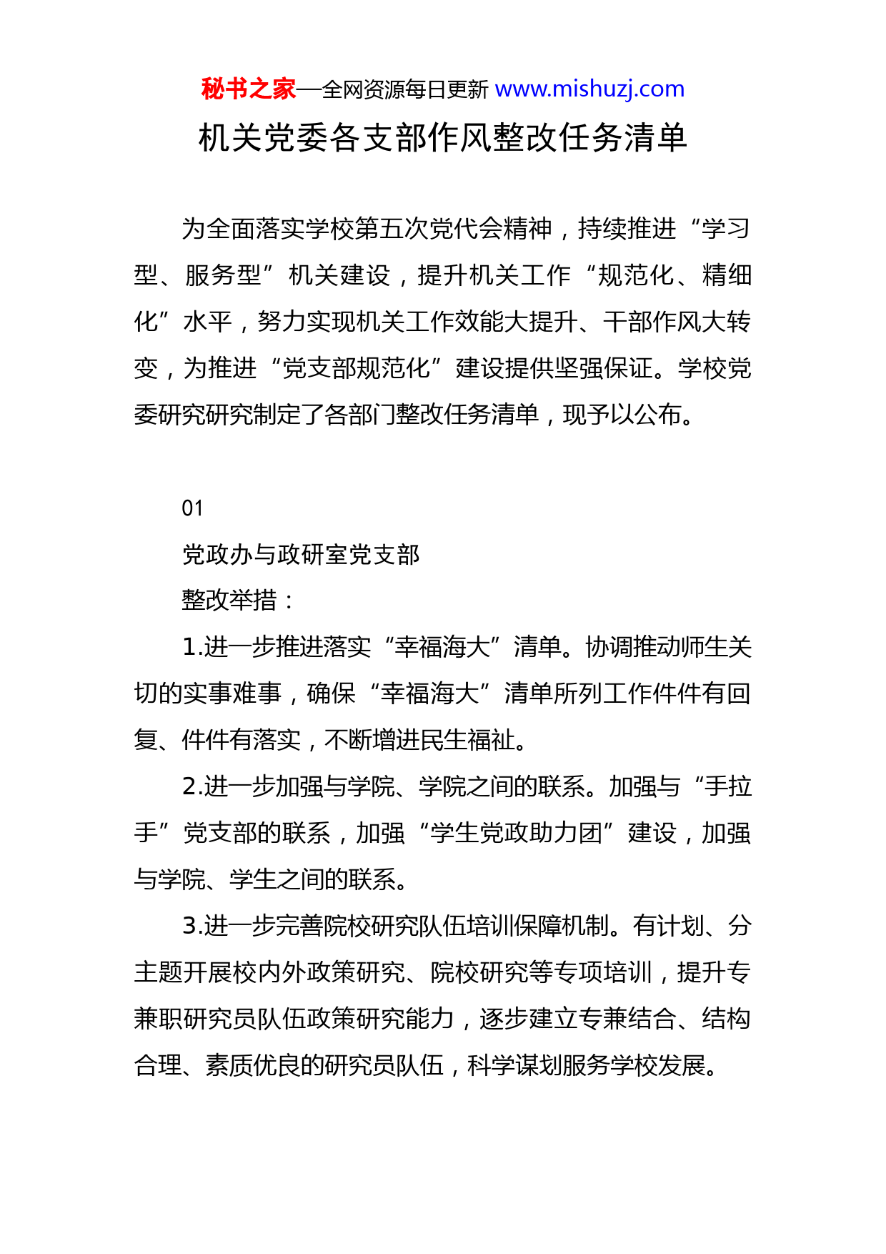 秘书之家—全网资源每日更新www.mishuzj.com机关党委各支部作风整改任务清单为全面落实学校第五次党代会精神,持续推进“学习型、服务型”机关建设,提升机关工作“规范化、精细化”水平,努力实现机关工作效能大提升、干部作风大转变,为推进“党支部规范化”建设提供坚强保证。学校党委研究研究制定了各部门整改任务清单,现予以公布。01党政办与政研室党支部整改举措:1.进一步推进落实“幸福海大”清单。协调推动师生关切的实事难事,确保“幸福海大”清单所列工作件件有回复、件件有落实,不断增进民生福祉。2.进一步加强与学院、学院之间的联系。加强与“手拉手”党支部的联系,加强“学生党政助力团”建设,加强与学院、学生之间的联系。3.进一步完善院校研究队伍培训保障机制。有计划、分主题开展校内外政策研究、院校研究等专项培训,提升专兼职研究员队伍政策研究能力,逐步建立专兼结合、结构合理、素质优良的研究员队伍,科学谋划服务学校发展。秘书之家—全网资源每日更新www.mishuzj.com02纪监审工会党支部整改举措:1.聚焦监督执纪问责主业,重服务、提质量、强本领,形成严细深实工作作风,努力构筑“清风海大”,为学校建设发展和师生学习工作提供良好校园育人环境。2.充分发挥工会组织民主管理、监督和服务职能,围绕学校双一流建设的中心和学校发展大局,为教职工做好服务工作。03组织部党支部整改举措:1.强化业务指导:针对中央、交通运输部党组、教育部党组和省市委的工作部署及有关文件要求,全面梳理党建工作要点,为各二级党组织规范落实党建工作任务,夯实党建工作基础,提高党建工作质量提供政策服务和业务指导。2.深入开展调查研究:围绕组织工作要点和师生关心的热点问题,每年深入基层开展专题调研1次;针对工作中的难点和创新点,通过现场调研、电话调研等方式,加强与兄弟院校组织部门的沟通交流,提升工作水平。秘书之家—全网资源每日更新www.mishuzj.com04宣传部(统战部)党支部整改举措:进一步强化服务意识,提升服务效能。围绕学校中心工作,结合本部门服务职责范围,到学院、机关职能部门等单位和部门开展调研,征求他们对本部门的意见和建议,了解服务需求。针对不同单位的不同需求,开展“订单式”宣传和统战工作服务。05学生工作部(武装部)党支部整改举措:1.加强学生工作干部队伍建设,提高职业能力。开展培训工作常态化,坚持“请进来”,邀请专家学者定期来校举办“引航计划”系列培训,坚持“走出去”选派优秀学生工作干部参加全国思想政治工作骨干示范培训班;开展工作交流定期化,单周召开学生工作例会,双周开展“学工论坛”活动,每月组织“学工沙龙”活动;推进《大连海事大学指导员队伍建设实施办法》落地,完善配套政策制度。秘书之家—全网资源每日更新www.mishuzj.com2.整合服务资源,创新服务方式。坚持立德树人根本任务,实施“人人思政工程”,制定工作实施方案,牵头完善全程全方位协同育人体系。全面加强学风建设,制定学业预警与帮扶工作办法,组建学校学业咨询中心,创办“教授午餐会”等新型助学形式;实施“文明素养提升工程”,通过主题教育、文明实践、氛围宣教、文化育人、典型培树等途径,提升学生综合素质;推进学生服装改款与质量升级,提升学生获得感与幸福感;强化征兵工作专兼职队伍建设,组建国防教育学生委员会,创新征兵宣传载体与渠道,完善学生退伍安置政策;开展“点亮微心愿”、“乘风·远航”游学实践等新型活动载体,创新资助育人形式,实现显性资助与隐性资助的有机融合;新建本科招生网站,开通本科招生微信公众号、手机微网站,编印相关宣传资料,保障招生宣传工作的顺利开展。3.加强与学生联系,提高服务质量。在密切联系学生上下功夫,落实学校“蔚蓝计划”党政管理人员联系班级制度,坚持围绕学生、服务学生、关照学生。遵循学生成长规律,了解他们的思想动态、价值取向、行为模式、生活方式。推进校领导联系班级制度,真正走近学生,把学校各级领导力量、管理力量、服务力量、思政力量压到教育管理服务学生第一线,打通育人“最后一公里”,形成全秘书之家—全网资源每日更新www.mishuzj.com员全方位全过程育人合力。06人事处党支部整改举措:1.会同相关部门梳理报到流程;简化入职手续,制作“入职资源包”;每月固定时间会同相关职能部门联合办公,采取“一站式”办理入职手续。2.编制《大连海事大学教师工作手册》,会同相关部门梳理涉及教师的培训、晋升、考核、职业发展、福利待遇、教育教学、科研、财务等制度,为教师办理各项事务提供工作指南,实现政策、工作程序、负责部门等信息的“一键查询”。手册为新入职教师免费发放,并上传校园网便于全校教师查阅使用。07教务处党支部整改举措:为顺应信息化社会发展趋势,积极推广“互联网+教育”的教学改革模式。在此过程中,教务处坚持“服务师生、深入基层”的工作理念,推出“MET论坛”系列活动,从往年开展全校范围内现代化教学培训,转变为深入秘书之家—全网资源每日更新www.mishuzj.com到各教学单位(现已深入至航海学院、轮机工程学院、外国语学院、理学院等),逐一开展交流、研讨,极大提升了培训效果,且得到广大教师的好评。科技处:党