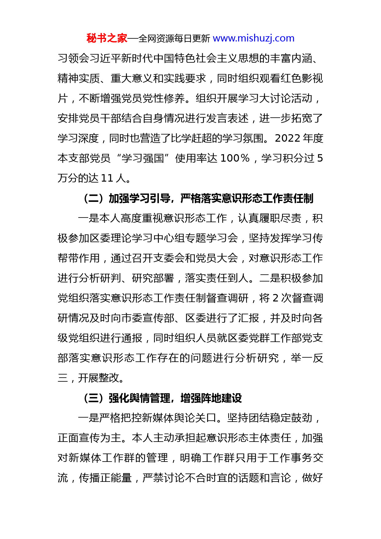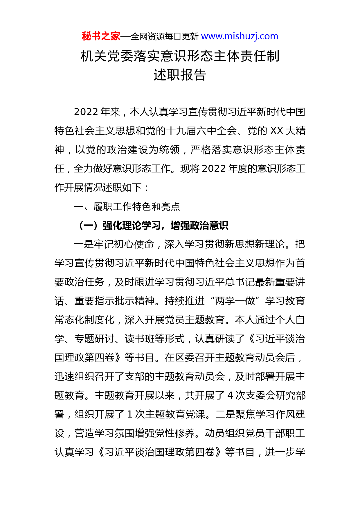秘书之家—全网资源每日更新www.mishuzj.com机关党委落实意识形态主体责任制述职报告2022年来,本人认真学习宣传贯彻习近平新时代中国特色社会主义思想和党的十九届六中全会、党的XX大精神,以党的政治建设为统领,严格落实意识形态主体责任,全力做好意识形态工作。现将2022年度的意识形态工作开展情况述职如下:一、履职工作特色和亮点(一)强化理论学习,增强政治意识一是牢记初心使命,深入学习贯彻新思想新理论。把学习宣传贯彻习近平新时代中国特色社会主义思想作为首要政治任务,及时跟进学习贯彻习近平总书记最新重要讲话、重要指示批示精神。持续推进“两学一做”学习教育常态化制度化,深入开展党员主题教育。本人通过个人自学、专题研讨、读书班等形式,认真研读了《习近平谈治国理政第四卷》等书目。在区委召开主题教育动员会后,迅速组织召开了支部的主题教育动员会,及时部署开展主题教育。主题教育开展以来,共开展了4次支委会研究部署,组织开展了1次主题教育党课。二是聚焦学习作风建设,营造学习氛围增强党性修养。动员组织党员干部职工认真学习《习近平谈治国理政第四卷》等书目,进一步学秘书之家—全网资源每日更新www.mishuzj.com习领会习近平新时代中国特色社会主义思想的丰富内涵、精神实质、重大意义和实践要求,同时组织观看红色影视片,不断增强党员党性修养。组织开展学习大讨论活动,安排党员干部结合自身情况进行发言表述,进一步拓宽了学习深度,同时也营造了比学赶超的学习氛围。2022年度本支部党员“学习强国”使用率达100%,学习积分过5万分的达11人。(二)加强学习引导,严格落实意识形态工作责任制一是本人高度重视意识形态工作,认真履职尽责,积极参加区委理论学习中心组专题学习会,坚持发挥学习传帮带作用,通过召开支委会和党员大会,对意识形态工作进行分析研判、研究部署,落实责任到人。二是积极参加党组织落实意识形态工作责任制督查调研,将2次督查调研情况及时向市委宣传部、区委进行了汇报,并及时向各级党组织进行通报,同时组织人员就区委党群工作部党支部落实意识形态工作存在的问题进行分析研究,举一反三,开展整改。(三)强化舆情管理,增强阵地建设一是严格把控新媒体舆论关口。坚持团结稳定鼓劲,正面宣传为主。本人主动承担起意识形态主体责任,加强对新媒体工作群的管理,明确工作群只用于工作事务交流,传播正能量,严禁讨论不合时宜的话题和言论,做好秘书之家—全网资源每日更新www.mishuzj.com重要信息的传导和解释,积极传递新时代正能量,例如:及时转发扫黄打非、扫黑除恶等宣传资料,普及法律法规知识,切实提升党员、干部知晓率。同时,严格落实群成员实行实名制,明确专人负责工作群的日常管理工作,定期对群内人员进行清理规范。三是建好管好用好各类宣传文化阵地。围绕工作职责,积极做好各项法规政策措施的宣传解读工作,把握正确舆论导向。结合部门职能,制定完善落实《“XX宣传”微信公众号管理制度》等各项规章制度,加强对“XX宣传”微信公众号的管理。开展党支部联建活动,指导帮助联建的XX社区建设宣传文化长廊、农家书屋等。二、存在主要问题及原因分析一是理论学习深度不够。本人对宣传文化思想工作内涵的把握和认识不够系统深入,理论学习的广度和深度还需要进一步拓展。二是党员干部的工作能力和理论水平有待进一步提高,主要存在流动性大、兼职多和系统性的接受学习教育不够完善等,从而在意识形态上把握程度不高,且业务水平与新形势发展不够适应。三是结合部门职能对其他各部门的指导作用发挥还不够明显。对网站、微信公众号等新媒体的应用和引导管理还不够有力。存在上述问题的原因主要是:本人对意识形态工作思考谋划不够深,在先进性发挥引领作用上办法不多,引导舆论方式方秘书之家—全网资源每日更新www.mishuzj.com法不够灵活。三、下一步工作思路和主要措施一是坚持不懈学习宣传贯彻习近平新时代中国特色社会主义思想和党的十九届六中全会、党的XX大精神,着力在掌握精神实质上下功夫,在学深学透上下功夫,在融会贯通上下功夫。二是加强教育培训,筑牢思想基础。继续把意识形态作为党员干部学习教育的重要内容,纳入到党员教育培训和专题党课学习,通过学习研讨会、谈心谈话等形式,让每一名党员时刻紧绷意识形态这根弦。三是抓好宣讲活动。充分发挥新时代文明实践中心和新时代文明实践中心所(站)平台作用,深入基层,开展宣传习近平新时代中国特色社会主义思想和党的XX大精神宣讲活动,推动习近平新时代中国特色社会主义思想深入人心。四是加强意识形态阵地建设。从严把好关口,防止出现影响本支部本单位形象的不利舆论和报道,牢牢掌握意识形态的领导权、主动权、话语权和管理权,推动意识形态工作再上新台阶。