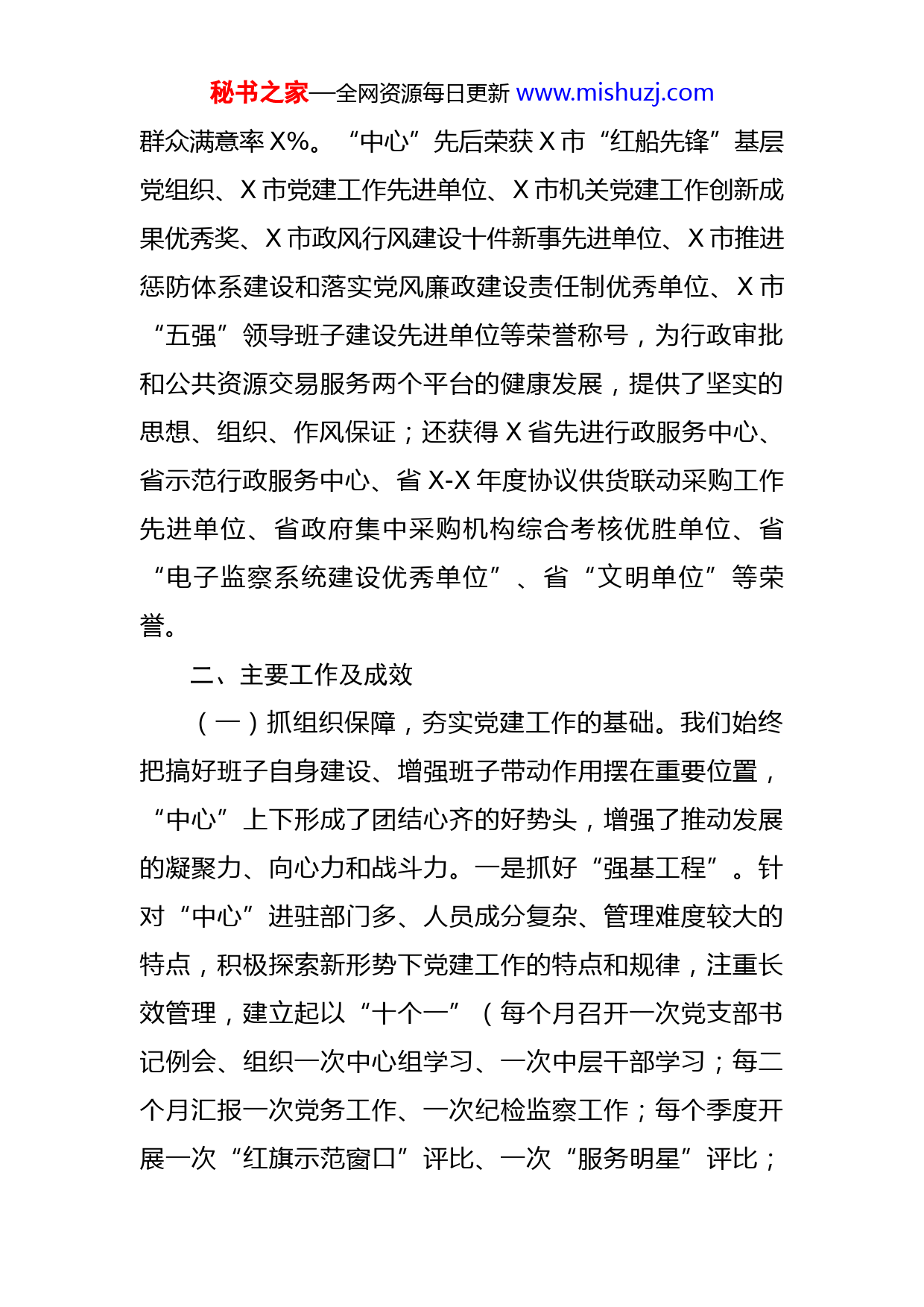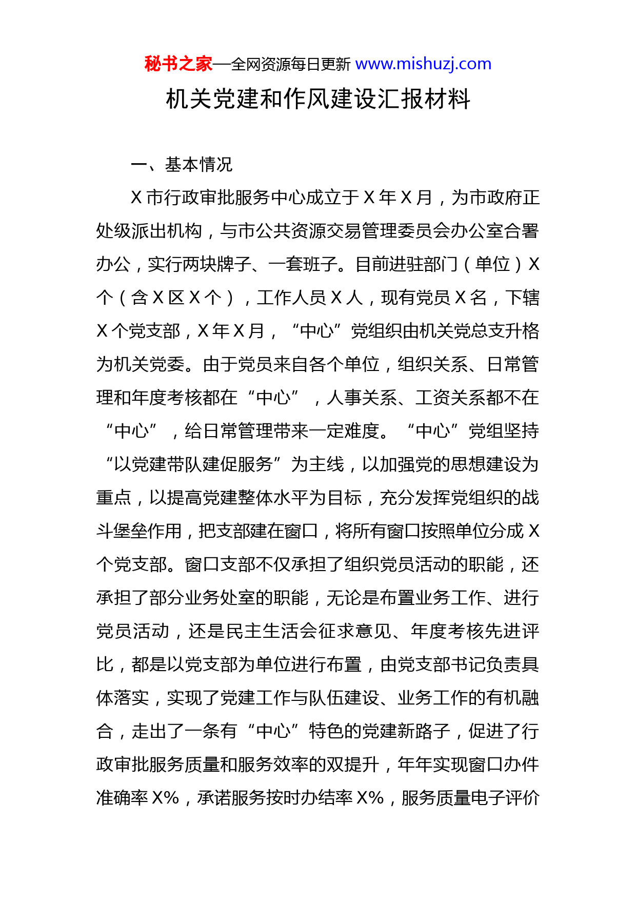 秘书之家—全网资源每日更新www.mishuzj.com机关党建和作风建设汇报材料一、基本情况X市行政审批服务中心成立于X年X月,为市政府正处级派出机构,与市公共资源交易管理委员会办公室合署办公,实行两块牌子、一套班子。目前进驻部门(单位)X个(含X区X个),工作人员X人,现有党员X名,下辖X个党支部,X年X月,“中心”党组织由机关党总支升格为机关党委。由于党员来自各个单位,组织关系、日常管理和年度考核都在“中心”,人事关系、工资关系都不在“中心”,给日常管理带来一定难度。“中心”党组坚持“以党建带队建促服务”为主线,以加强党的思想建设为重点,以提高党建整体水平为目标,充分发挥党组织的战斗堡垒作用,把支部建在窗口,将所有窗口按照单位分成X个党支部。窗口支部不仅承担了组织党员活动的职能,还承担了部分业务处室的职能,无论是布置业务工作、进行党员活动,还是民主生活会征求意见、年度考核先进评比,都是以党支部为单位进行布置,由党支部书记负责具体落实,实现了党建工作与队伍建设、业务工作的有机融合,走出了一条有“中心”特色的党建新路子,促进了行政审批服务质量和服务效率的双提升,年年实现窗口办件准确率X%,承诺服务按时办结率X%,服务质量电子评价秘书之家—全网资源每日更新www.mishuzj.com群众满意率X%。“中心”先后荣获X市“红船先锋”基层党组织、X市党建工作先进单位、X市机关党建工作创新成果优秀奖、X市政风行风建设十件新事先进单位、X市推进惩防体系建设和落实党风廉政建设责任制优秀单位、X市“五强”领导班子建设先进单位等荣誉称号,为行政审批和公共资源交易服务两个平台的健康发展,提供了坚实的思想、组织、作风保证;还获得X省先进行政服务中心、省示范行政服务中心、省X-X年度协议供货联动采购工作先进单位、省政府集中采购机构综合考核优胜单位、省“电子监察系统建设优秀单位”、省“文明单位”等荣誉。二、主要工作及成效(一)抓组织保障,夯实党建工作的基础。我们始终把搞好班子自身建设、增强班子带动作用摆在重要位置,“中心”上下形成了团结心齐的好势头,增强了推动发展的凝聚力、向心力和战斗力。一是抓好“强基工程”。针对“中心”进驻部门多、人员成分复杂、管理难度较大的特点,积极探索新形势下党建工作的特点和规律,注重长效管理,建立起以“十个一”(每个月召开一次党支部书记例会、组织一次中心组学习、一次中层干部学习;每二个月汇报一次党务工作、一次纪检监察工作;每个季度开展一次“红旗示范窗口”评比、一次“服务明星”评比;秘书之家—全网资源每日更新www.mishuzj.com每年组织一次党员、员工思想动态调查分析、一次下基层上门便民服务活动、一次党代表视察活动)为主要内容的党建长效管理机制,健全完善了了党组、机关党委、支部三级组织建设,确保了“三会一课”、民主生活会、联系服务群众等各项制度的落实,加强了党员日常教育和严格管理。尤其是针对“中心”工作人员来自全市X个不同部门的实际,建立了“一季一周”谈心谈话和党组成员联系窗口等关心关爱制度,同时做好职工食堂等后勤保障工作,对工作人员给予人性化服务,努力营造温馨和谐的工作环境,调动了广大干部职工服务的积极性。二是抓好队伍建设。坚持把提高全体干部的综合素质作为党建工作的首要任务来抓,通过“中心论坛”和“道德讲堂”等,加强干部队伍教育和培训,不断强化队伍建设。坚持把工会、共青团、妇委会工作列为机关党建经常性工作,统筹安排,加强领导,充分发挥群团组织桥梁纽带作用,建立了羽毛球、乒乓球、太极拳、游泳、摄影等兴趣小组,积极开展各类活动,加强文化建设。定期听取工青妇工作汇报,对其活动给予大力支持,经费上给予充分保障,注重工青妇活动与机关党委活动的有机结合,有效地带动了工会工作、青年工作、妇联工作的开展,进一步增强了“中心”大家庭的凝聚力和战斗力。三是抓好作风建设。近年来,认真扎实地开展了机关作风和效能建设活动、学习实秘书之家—全网资源每日更新www.mishuzj.com践科学发展观、创先争优活动、党的群众路线教育实践活动等,切实加强正风肃纪力度,不断提高工作效率,改进机关工作作风,在全市率先树立起了团结、高效、文明、争先、廉洁的机关形象,收到了良好的社会效果。严格落实窗口“八不准”工作纪律,实行日巡查、周互查、一月一评、一季一考、一年一议,并将考评结果与绩效奖惩挂钩。同时还专门聘请了X位社会监督员,切实加强对中心工作人员的行风评议和监督。根据中央八项规定、省委“X条办法”和“六项禁令”以及市委“X条办法”要求,“中心”党组和机关党委领导班子率先垂范,带头执行,并要求全体党员必须严格遵守。每年开展“共产党员示范岗”、“党员闪光言行”等评比活动,涌现出了许多先进模范个人和典型事例。定期与结对的东栅街道云阳社区、余新镇农庄村、王店镇假山村开展结对共建活动,协助推进三改一拆、五水共治等重点工作。在结对共建的基础上,机关党委对口帮扶X户贫困家庭,帮助困难党员群众解决实际问题。(二)抓改革创新,体现党建工作的执行力。党建工作的成效同样体现在改革工作的落实程度上。我们始终围