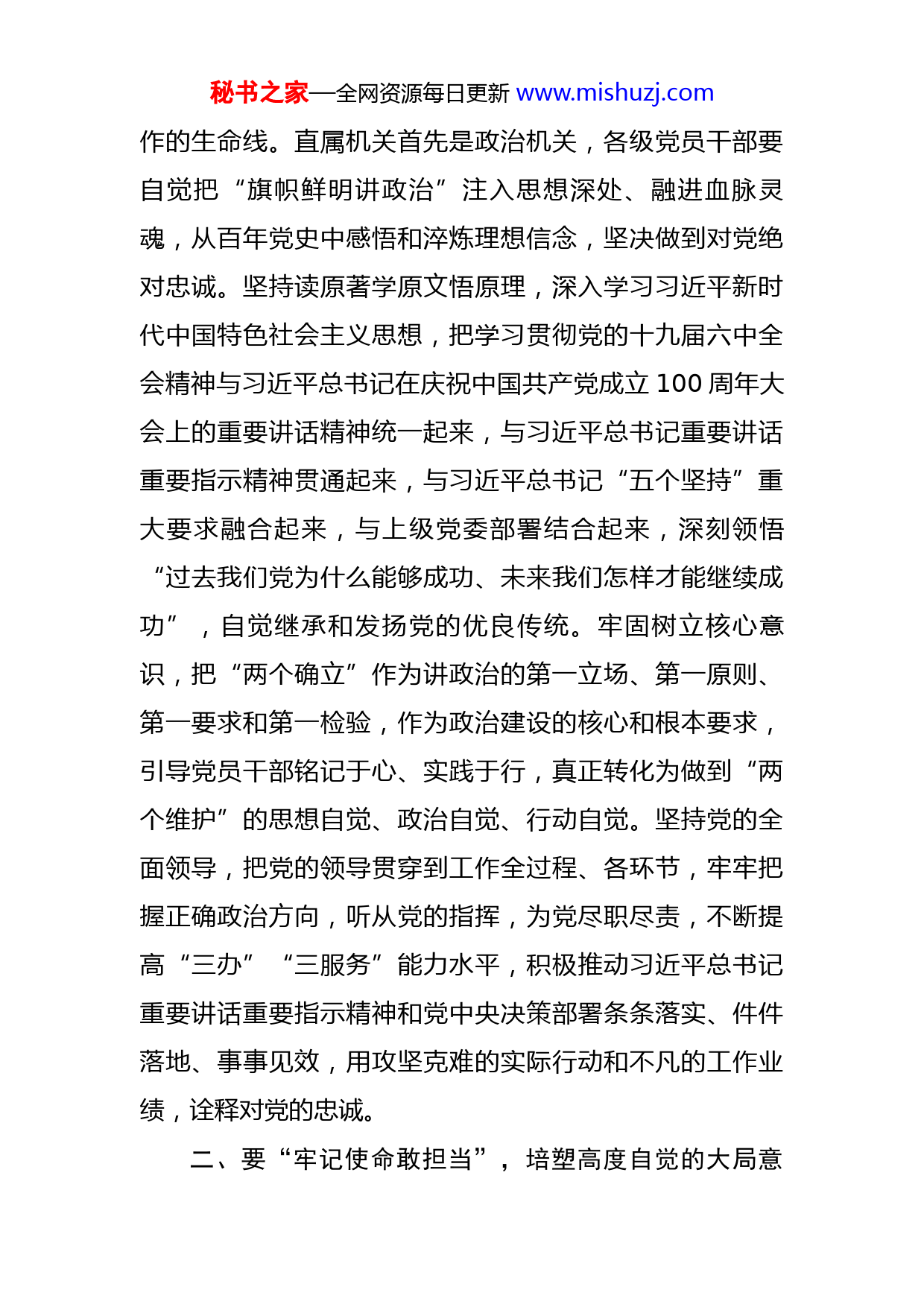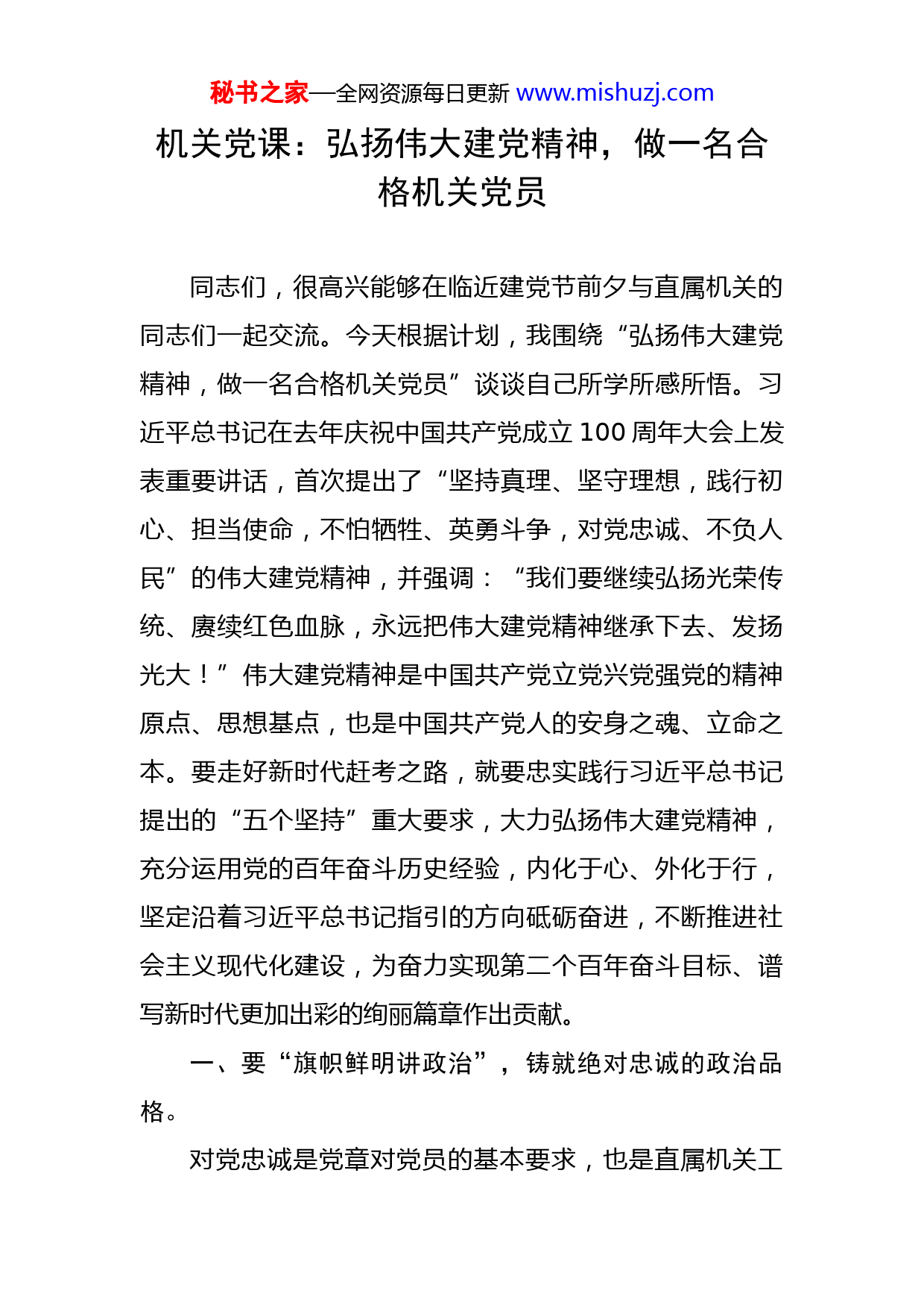 秘书之家—全网资源每日更新www.mishuzj.com机关党课:弘扬伟大建党精神,做一名合格机关党员同志们,很高兴能够在临近建党节前夕与直属机关的同志们一起交流。今天根据计划,我围绕“弘扬伟大建党精神,做一名合格机关党员”谈谈自己所学所感所悟。习近平总书记在去年庆祝中国共产党成立100周年大会上发表重要讲话,首次提出了“坚持真理、坚守理想,践行初心、担当使命,不怕牺牲、英勇斗争,对党忠诚、不负人民”的伟大建党精神,并强调:“我们要继续弘扬光荣传统、赓续红色血脉,永远把伟大建党精神继承下去、发扬光大!”伟大建党精神是中国共产党立党兴党强党的精神原点、思想基点,也是中国共产党人的安身之魂、立命之本。要走好新时代赶考之路,就要忠实践行习近平总书记提出的“五个坚持”重大要求,大力弘扬伟大建党精神,充分运用党的百年奋斗历史经验,内化于心、外化于行,坚定沿着习近平总书记指引的方向砥砺奋进,不断推进社会主义现代化建设,为奋力实现第二个百年奋斗目标、谱写新时代更加出彩的绚丽篇章作出贡献。一、要“旗帜鲜明讲政治”,铸就绝对忠诚的政治品格。对党忠诚是党章对党员的基本要求,也是直属机关工秘书之家—全网资源每日更新www.mishuzj.com作的生命线。直属机关首先是政治机关,各级党员干部要自觉把“旗帜鲜明讲政治”注入思想深处、融进血脉灵魂,从百年党史中感悟和淬炼理想信念,坚决做到对党绝对忠诚。坚持读原著学原文悟原理,深入学习习近平新时代中国特色社会主义思想,把学习贯彻党的十九届六中全会精神与习近平总书记在庆祝中国共产党成立100周年大会上的重要讲话精神统一起来,与习近平总书记重要讲话重要指示精神贯通起来,与习近平总书记“五个坚持”重大要求融合起来,与上级党委部署结合起来,深刻领悟“过去我们党为什么能够成功、未来我们怎样才能继续成功”,自觉继承和发扬党的优良传统。牢固树立核心意识,把“两个确立”作为讲政治的第一立场、第一原则、第一要求和第一检验,作为政治建设的核心和根本要求,引导党员干部铭记于心、实践于行,真正转化为做到“两个维护”的思想自觉、政治自觉、行动自觉。坚持党的全面领导,把党的领导贯穿到工作全过程、各环节,牢牢把握正确政治方向,听从党的指挥,为党尽职尽责,不断提高“三办”“三服务”能力水平,积极推动习近平总书记重要讲话重要指示精神和党中央决策部署条条落实、件件落地、事事见效,用攻坚克难的实际行动和不凡的工作业绩,诠释对党的忠诚。二、要“牢记使命敢担当”,培塑高度自觉的大局意秘书之家—全网资源每日更新www.mishuzj.com识。高度自觉的大局意识是我们党的政治优势,也是开展工作的重大原则。直属机关作为政府工作的“参谋助手”“服务员”“督办员”,机关党员干部要自觉把“国之大者”放在心上、抓在手上,胸怀“两个大局”,牢牢把握新时代新征程的使命任务,始终牢记中国共产党是什么、要干什么这个根本问题。坚持全面贯彻党的基本理论、基本路线、基本方略,始终保持同人民群众的血肉联系,义无反顾担负起党和人民、历史和时代赋予的使命,解放思想、转变观念,加强学习、提高能力,履职尽责、务实重干,立足新发展阶段,贯彻新发展理念,紧抓构建新发展格局战略机遇,聚焦省委、省政府提出的重大改革、重大举措、重大工程决策部署,牵头研究建立“两个确保”指标体系,积极推动“十大战略”工程化、项目化、具体化,把“规划图”变成“施工图”,把学习焕发出来的政治热情和智慧力量转化为推动工作、促进发展的强大动力,推动中央和省委、省政府决策部署落地生根。三、要“知责担责抓落实”,锤炼极端负责的工作作风。极端负责的工作作风是我们党的优良传统,也是直属机关开展工作的根本态度。直属机关肩负着确政令畅通、推动工作落实的重要职责,要牢牢坚持以人民为中心,把秘书之家—全网资源每日更新www.mishuzj.com对上负责和对下负责统一起来,强化服务意识,端正服务态度,提升服务水平,以极端负责的工作态度服务好省委、省政府中心工作和发展大局。大兴调查研究之风,围绕“十大战略”、区域经济发展等事关发展全局的重大战略谋划和群众反映强烈、舆论关注度高的热点难点问题深入开展调查研究,充分发挥参谋作用,为党委组织决策提供高质量建议。搞好信息服务,围绕上级明确的目标任务要求,总结提炼富有特色的亮点经验,收集撰写上报有深度、高质量的信息,及时反映我省工作最新进展、最新成果。抓实精文减会,严格落实文件“十不发”、会议“八不开”负面清单,履行好机关系统精文减会责任,推动各项工作提质增效。加强督查督办,突出工作重点、民生领域堵点,充实加强督查力量,厅级领导带队开展督查,切实增强督查针对性和时效性,着力解决存在的问题。四、要“坚守初心善作为”,发扬无怨无悔的奉献精神。无怨无悔的奉献精神是我们党的宝贵财富,也是直属机关党员干部的价值取向。江山就是人民,人民就是江山。百年党史描绘了一代代共产党人“立党为公、执政为民”的奉献身影,深刻诠释了共产党人扎根群众、依靠群众、服务群众的初心使命。省委号召全体党员干部厚植人民情怀,扎实开展“我为群众