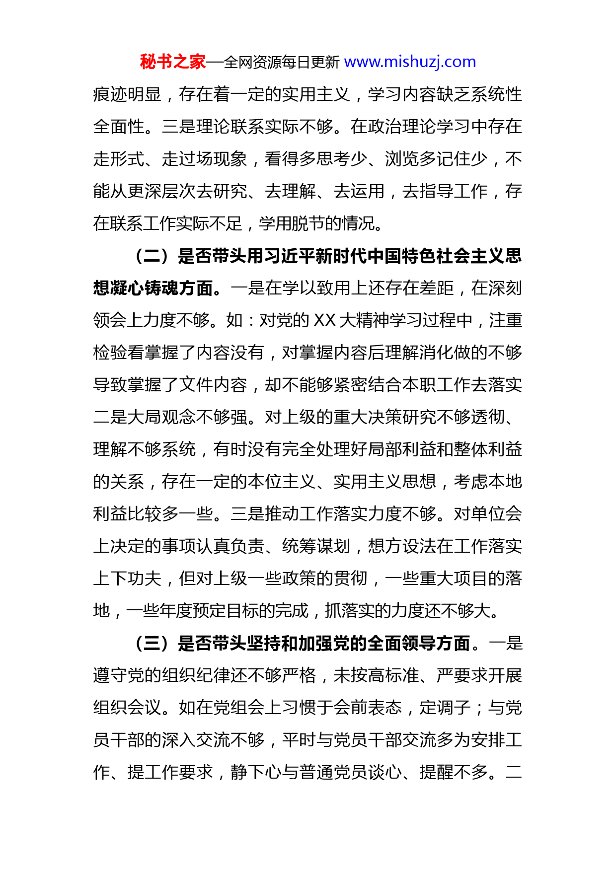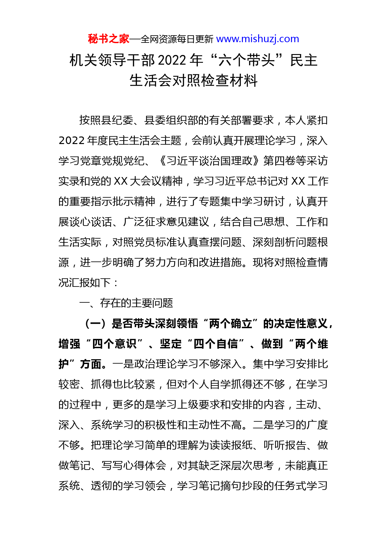 秘书之家—全网资源每日更新www.mishuzj.com机关领导干部2022年“六个带头”民主生活会对照检查材料按照县纪委、县委组织部的有关部署要求,本人紧扣2022年度民主生活会主题,会前认真开展理论学习,深入学习党章党规党纪、《习近平谈治国理政》第四卷等采访实录和党的XX大会议精神,学习习近平总书记对XX工作的重要指示批示精神,进行了专题集中学习研讨,认真开展谈心谈话、广泛征求意见建议,结合自己思想、工作和生活实际,对照党员标准认真查摆问题、深刻剖析问题根源,进一步明确了努力方向和改进措施。现将对照检查情况汇报如下:一、存在的主要问题(一)是否带头深刻领悟“两个确立”的决定性意义,增强“四个意识”、坚定“四个自信”、做到“两个维护”方面。一是政治理论学习不够深入。集中学习安排比较密、抓得也比较紧,但对个人自学抓得还不够,在学习的过程中,更多的是学习上级要求和安排的内容,主动、深入、系统学习的积极性和主动性不高。二是学习的广度不够。把理论学习简单的理解为读读报纸、听听报告、做做笔记、写写心得体会,对其缺乏深层次思考,未能真正系统、透彻的学习领会,学习笔记摘句抄段的任务式学习秘书之家—全网资源每日更新www.mishuzj.com痕迹明显,存在着一定的实用主义,学习内容缺乏系统性全面性。三是理论联系实际不够。在政治理论学习中存在走形式、走过场现象,看得多思考少、浏览多记住少,不能从更深层次去研究、去理解、去运用,去指导工作,存在联系工作实际不足,学用脱节的情况。(二)是否带头用习近平新时代中国特色社会主义思想凝心铸魂方面。一是在学以致用上还存在差距,在深刻领会上力度不够。如:对党的XX大精神学习过程中,注重检验看掌握了内容没有,对掌握内容后理解消化做的不够导致掌握了文件内容,却不能够紧密结合本职工作去落实二是大局观念不够强。对上级的重大决策研究不够透彻、理解不够系统,有时没有完全处理好局部利益和整体利益的关系,存在一定的本位主义、实用主义思想,考虑本地利益比较多一些。三是推动工作落实力度不够。对单位会上决定的事项认真负责、统筹谋划,想方设法在工作落实上下功夫,但对上级一些政策的贯彻,一些重大项目的落地,一些年度预定目标的完成,抓落实的力度还不够大。(三)是否带头坚持和加强党的全面领导方面。一是遵守党的组织纪律还不够严格,未按高标准、严要求开展组织会议。如在党组会上习惯于会前表态,定调子;与党员干部的深入交流不够,平时与党员干部交流多为安排工作、提工作要求,静下心与普通党员谈心、提醒不多。二秘书之家—全网资源每日更新www.mishuzj.com是贯彻民主集中制有时还不充分。比如:对一些时间要求紧、比较紧急的事项,有时讨论还不够充分,征求意见还不够到位。(四)是否带头坚持以人民为中心的发展思想,推动改革发展稳定方面。一是宗旨观念有所淡化,在实际工作中,总是把工作业务放在先,没有把深入基层、及时与群众沟通交流、了解诉求作为重点工作。有时虽能走访入户但是走访也是流于形式,走走样子,没有带着问题、带着政策、带着解决问题心态去走访,达不到预期的效果。二是调查研究不够实在。把下基层执行调研作为一种形式,注重场面热闹,不注重调研实效,存在走马观花、蜻蜓点水和雾里看花等问题。(五)是否带头发扬斗争精神,防范化解风险挑战方面。一是节约意识不够。艰苦奋斗精神保持不够,缺乏过“紧日子”的思想性,对水、电、办公用纸等公共资源缺乏节俭意识,标准执行还不够严格。二是对身边工作人员教育、引导和监督做得还不够到位。虽然平时对自己要求很严格,但在对身边人咬咬耳朵、扯扯袖子等方面做得还不够。三是执行纪律不严。对党的政治纪律内涵有时认识不清,理解不深、不透,甚至有偏差,错误地认为遵守政治纪律是高级别领导干部的事,自己作为中层干部,不可能有问题,甚至简单认为只要在思想上、行动上与中央保秘书之家—全网资源每日更新www.mishuzj.com持一致即可,其它的无所谓。(六)是否带头落实全面从严治党政治责任方面。一是性子急躁,修养不够。批评下属不顾情面,安排的工作没有落实就爱啰嗦,甚至发脾气。主动到上级汇报思想、交流工作较少。只顾埋头工作,不顾抬头望路,怕给领导添麻烦,怕耽误领导办大事,担心自己不善言辞反而“坏事”,有简单做事的心理,忽视了“磨刀不误砍柴工”的道理。二是激情减退不愿担当。随着从严管党治党的不断深入,权力空间小了,监督问责严了,乡村振兴、产业发展、项目建设,工作压力越来越大,岗位风险越来越高,存在畏难厌战,不愿吃苦,干事既缺乏激情,又缺乏韧劲的现象。二、产生问题的原因分析针对上述问题,深刻反思自身存在的突出问题,不管是被动适应,还是随波逐流,都是主观上出了问题。(一)从学习上讲,忽视了理论学习,放松了主观世界的自我改造。共产党员的纯洁性、先进性来自于不断地自觉改造主观世界。只有不断地加强政治理论学习,才能坚定社会主义理想信念,提升自身的党性修养。由于放松了学习,自觉不自觉淡化了“三观”教育,忽视了主观世界的改造,导致工作满足于现状,创新意识不强,缺少应有的进取精神,从而产生了这样那样的问题。秘书之家—
