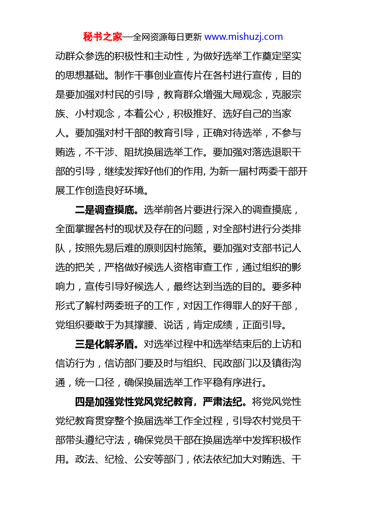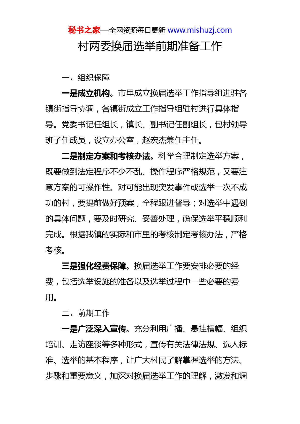 秘书之家—全网资源每日更新www.mishuzj.com村两委换届选举前期准备工作一、组织保障一是成立机构。市里成立换届选举工作指导组进驻各镇街指导协调,各镇街成立工作指导组驻村进行具体指导。党委书记任组长,镇长、副书记任副组长,包村领导班子任成员,设立办公室,赵宏杰兼任主任。二是制定方案和考核办法。科学合理制定选举方案,既要做到法定程序不少不乱、操作程序严格规范,又要注意方案的可操作性。对可能出现突发事件或选举一次不成功的村,要提前做好预案,全程跟进督导;对选举中遇到的具体问题,要及时研究、妥善处理,确保选举平稳顺利完成。根据我镇的实际和市里的考核制定考核办法,严格考核。三是强化经费保障。换届选举工作要安排必要的经费,包括选举设施的准备以及选举过程中一些必要的费用。二、前期工作一是广泛深入宣传。充分利用广播、悬挂横幅、组织培训、走访座谈等多种形式,宣传有关法律法规、选人标准、选举的基本程序,让广大村民了解掌握选举的方法、步骤和重要意义,加深对换届选举工作的理解,激发和调秘书之家—全网资源每日更新www.mishuzj.com动群众参选的积极性和主动性,为做好选举工作奠定坚实的思想基础。制作干事创业宣传片在各村进行宣传,目的是要加强对村民的引导,教育群众增强大局观念,克服宗族、小村观念,本着公心,积极推好、选好自己的当家人。要加强对村干部的教育引导,正确对待选举,不参与贿选,不干涉、阻扰换届选举工作。要加强对落选退职干部的引导,继续发挥好他们的作用,为新一届村两委干部开展工作创造良好环境。二是调查摸底。选举前各片要进行深入的调查摸底,全面掌握各村的现状及存在的问题,对全部村进行分类排队,按照先易后难的原则因村施策。要加强对支部书记人选的把关,严格做好候选人资格审查工作,通过组织的影响力,宣传引导好候选人,最终达到当选的目的。要多种形式了解村两委班子的工作,对因工作得罪人的好干部,党组织要敢于为其撑腰、说话,肯定成绩,正面引导。三是化解矛盾。对选举过程中和选举结束后的上访和信访行为,信访部门要及时与组织、民政部门以及镇街沟通,统一口径,确保换届选举工作平稳有序进行。四是加强党性党风党纪教育,严肃法纪。将党风党性党纪教育贯穿整个换届选举工作全过程,引导农村党员干部带头遵纪守法,确保党员干部在换届选举中发挥积极作用。政法、纪检、公安等部门,依法依纪加大对贿选、干秘书之家—全网资源每日更新www.mishuzj.com扰阻止选举行为的打击力度,及时严肃查处选举中的违法违纪行为。五是抓好业务培训。要层层抓好业务知识培训工作,重点培训驻村指导选举的镇街干部和村选举委员会成员,使每个选举工作人员真正做到懂法、知法、依法,熟练掌握选举的具体程序和基本环节,并在选举工作中充分发挥指导作用。六是做好换届离任审计。