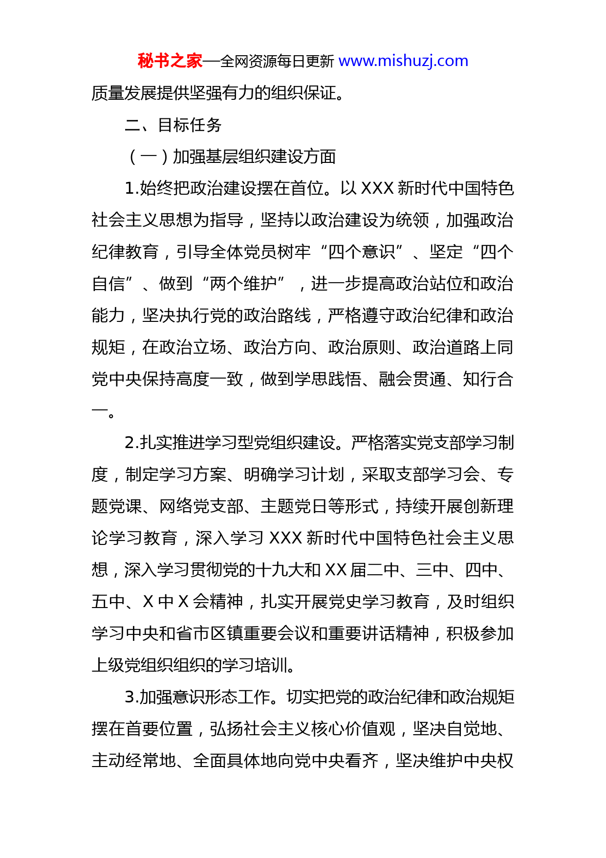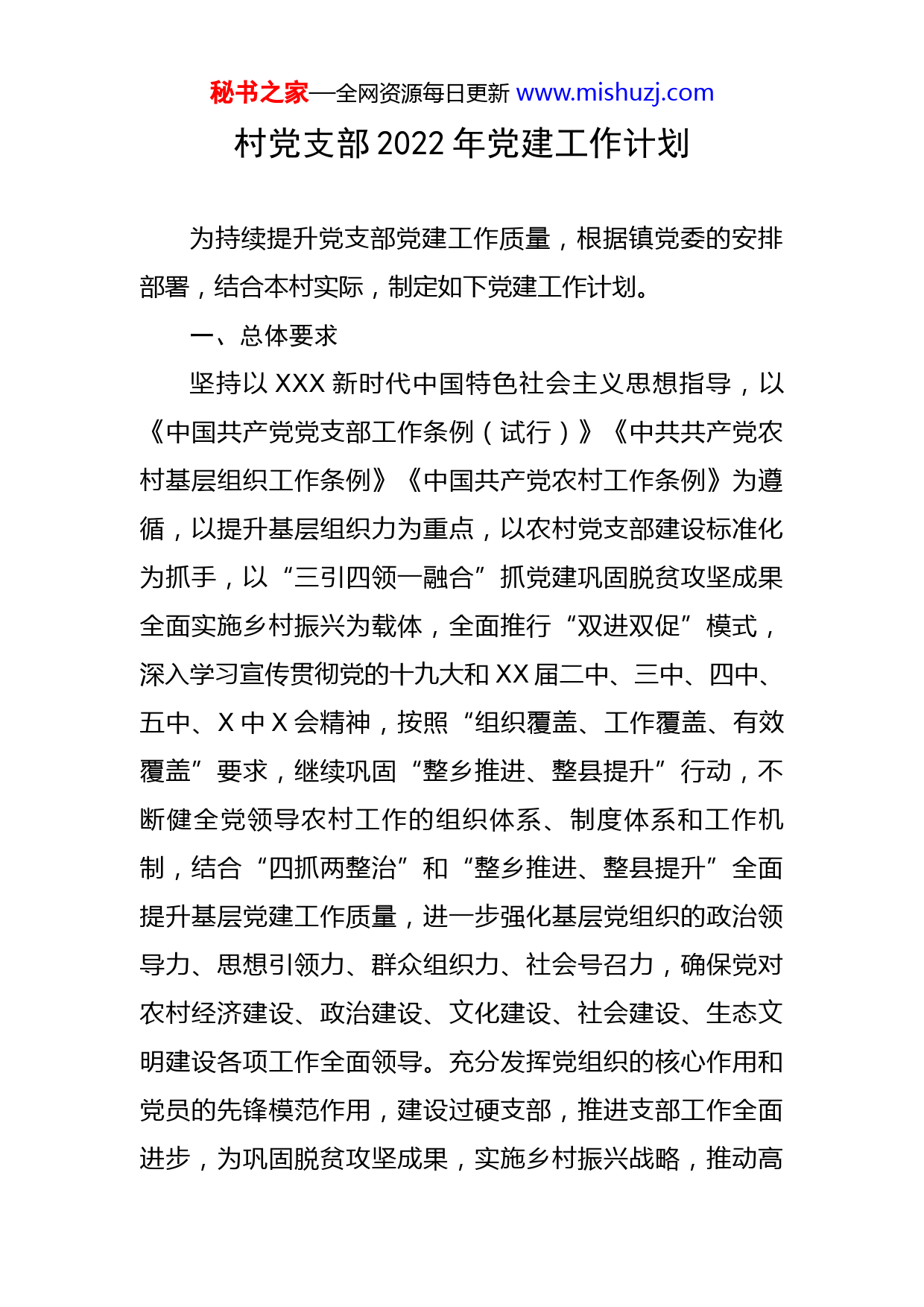 秘书之家—全网资源每日更新www.mishuzj.com村党支部2022年党建工作计划为持续提升党支部党建工作质量,根据镇党委的安排部署,结合本村实际,制定如下党建工作计划。一、总体要求坚持以XXX新时代中国特色社会主义思想指导,以《中国共产党党支部工作条例(试行)》《中共共产党农村基层组织工作条例》《中国共产党农村工作条例》为遵循,以提升基层组织力为重点,以农村党支部建设标准化为抓手,以“三引四领一融合”抓党建巩固脱贫攻坚成果全面实施乡村振兴为载体,全面推行“双进双促”模式,深入学习宣传贯彻党的十九大和XX届二中、三中、四中、五中、X中X会精神,按照“组织覆盖、工作覆盖、有效覆盖”要求,继续巩固“整乡推进、整县提升”行动,不断健全党领导农村工作的组织体系、制度体系和工作机制,结合“四抓两整治”和“整乡推进、整县提升”全面提升基层党建工作质量,进一步强化基层党组织的政治领导力、思想引领力、群众组织力、社会号召力,确保党对农村经济建设、政治建设、文化建设、社会建设、生态文明建设各项工作全面领导。充分发挥党组织的核心作用和党员的先锋模范作用,建设过硬支部,推进支部工作全面进步,为巩固脱贫攻坚成果,实施乡村振兴战略,推动高秘书之家—全网资源每日更新www.mishuzj.com质量发展提供坚强有力的组织保证。二、目标任务(一)加强基层组织建设方面1.始终把政治建设摆在首位。以XXX新时代中国特色社会主义思想为指导,坚持以政治建设为统领,加强政治纪律教育,引导全体党员树牢“四个意识”、坚定“四个自信”、做到“两个维护”,进一步提高政治站位和政治能力,坚决执行党的政治路线,严格遵守政治纪律和政治规矩,在政治立场、政治方向、政治原则、政治道路上同党中央保持高度一致,做到学思践悟、融会贯通、知行合一。2.扎实推进学习型党组织建设。严格落实党支部学习制度,制定学习方案、明确学习计划,采取支部学习会、专题党课、网络党支部、主题党日等形式,持续开展创新理论学习教育,深入学习XXX新时代中国特色社会主义思想,深入学习贯彻党的十九大和XX届二中、三中、四中、五中、X中X会精神,扎实开展党史学习教育,及时组织学习中央和省市区镇重要会议和重要讲话精神,积极参加上级党组织组织的学习培训。3.加强意识形态工作。切实把党的政治纪律和政治规矩摆在首要位置,弘扬社会主义核心价值观,坚决自觉地、主动经常地、全面具体地向党中央看齐,坚决维护中央权秘书之家—全网资源每日更新www.mishuzj.com威,保证中央政令畅通。定期研究意识形态工作,进行综合分析研判,及时报告重大情况和突发事件,引导全村党员坚定理想信念,站稳政治立场。4.严肃党支部组织生活。全覆盖、常态化抓好“三会一课”、“主题党日”、组织生活会、民主评议党员、谈心谈话等制度的落实,用好批评与自我批评这个有力武器,增强党内生活的政治性、时代性、原则性、战斗性。5.固化主题教育成果。持续用力抓好主题教育,全力推动主题教育不断走深走实。坚持把“不忘初心、牢记使命”作为加强党的建设的永恒课题和全体党员的终身课题,建立形成长效机制,坚持不懈锤炼党员忠诚干净担当的政治品格。6.全面开展疫情防控工作。准确把握外防输入、全面恢复、精准施策防控原则,落实网格责任,织密网格,紧盯六类人员,持续坚持“日报告”、“零报告”制度,充分发挥党组织组织引领作用和党员示范带头作用,毫不放松抓紧抓实抓细各项防控工作。(二)党建引领脱贫攻坚方面7.巩固拓展脱贫攻坚成果与乡村振兴有效衔接。继续严格落实XXX“摘帽不摘责任、摘帽不摘政策、摘帽不摘帮扶、摘帽不摘监管”的“四个不摘”要求,坚持工作机制不变、责任不改、力度不减,深入贯彻深入推进“三步六秘书之家—全网资源每日更新www.mishuzj.com法”防贫监测帮扶机制,继续保持尽锐出战、全力以赴攻坚的势头,在巩固脱贫攻坚成果上下功夫、在激发内生动力上做文章、在发展产业上谋出路,在有效衔接乡村振兴上见实效。同时,充分发挥党组织和党员作用,全面开展农村人居环境综合整治,努力建设生态宜居的美丽乡村。8.健全基层组织体系。加大在农民专业合作社等各类新型经营主体中党组织组建力度,深入开展党组织设置调整规范专项整治,深化拓展“双培双带”工程、“三链”建设,全面推行“双进双促”模式,推动农村基层党组织和党员充分发挥示范引领作用,不断培育壮大富民产业,拓宽贫困群众增收渠道,实现党建和经济双赢的目的。9.增强融合共建实效。深化拓展“支部融合共建、党群互带共促”模式,深入开展“城乡结对、支部共建”活动,组织推动帮扶单位党组织和党员干部经常性深入贫困群众听民意、知民情、解民忧,着力解决义务教育、基本医疗、住房安全等热点难点问题,积极破解信息、科技、资金、培训等瓶颈问题,使融合共建成果更多地惠及广大群众。10.提升基层治理水平。积极推进乡村治理体系和治理能力现代化,规范加强村务监督委员会建设,全面落实党务、村务公开制度,对关系村级发展的重大事项必须按“四议两公开”工作法讨论决定。建立红白理事会、道德秘书之家—全网资源每日更新www.mishuzj.com评议会等村民自治组织,着力构