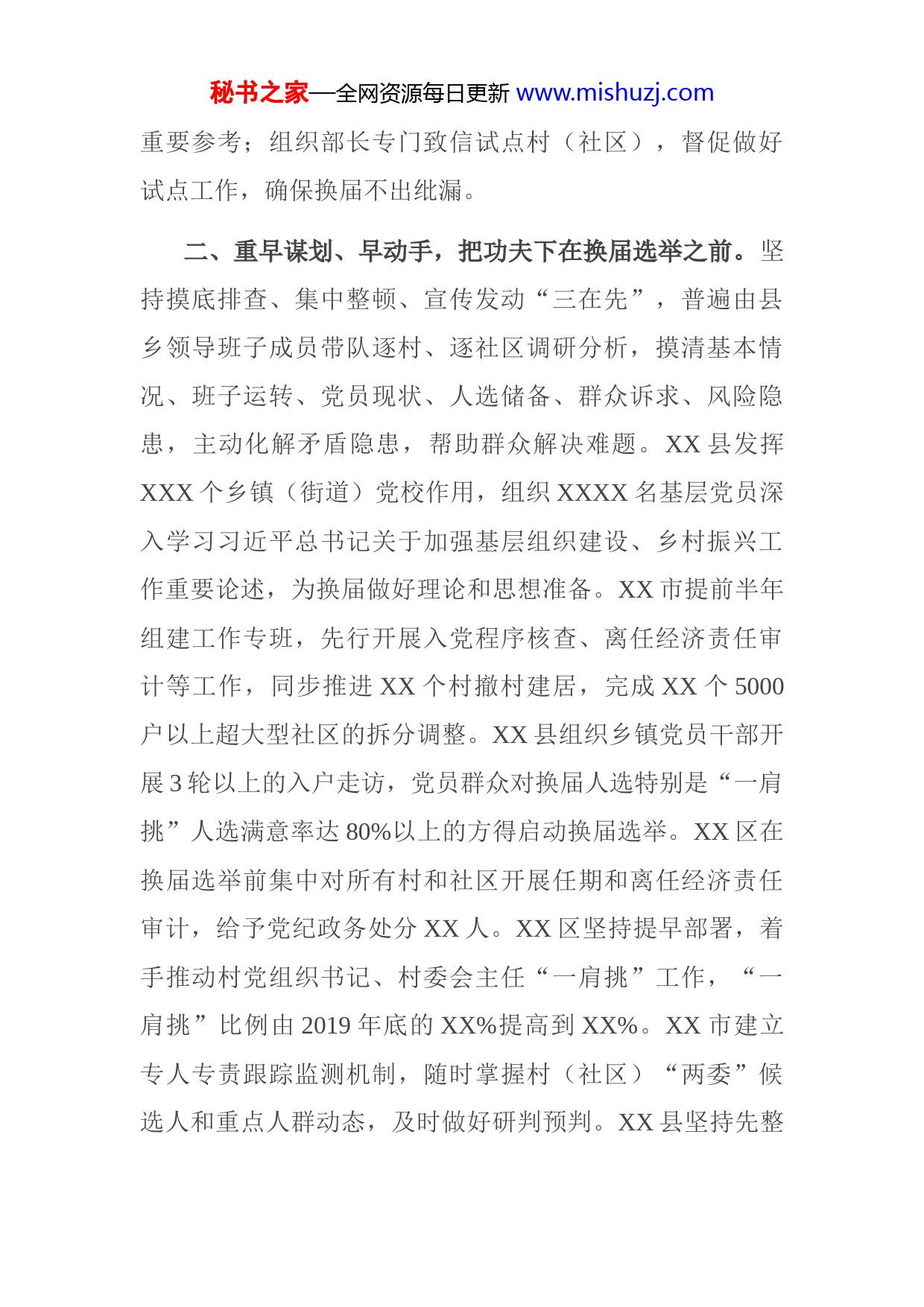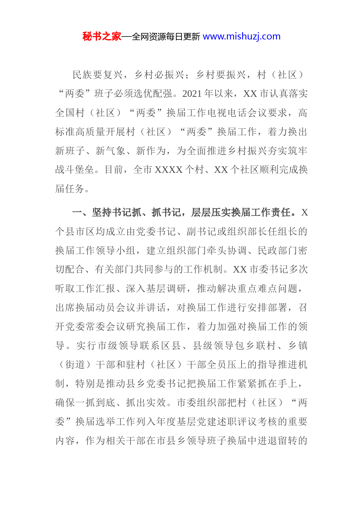 秘书之家—全网资源每日更新www.mishuzj.com民族要复兴,乡村必振兴;乡村要振兴,村(社区)“两委”班子必须选优配强。2021年以来,XX市认真落实全国村(社区)“两委”换届工作电视电话会议要求,高标准高质量开展村(社区)“两委”换届工作,着力换出新班子、新气象、新作为,为全面推进乡村振兴夯实筑牢战斗堡垒。目前,全市XXXX个村、XX个社区顺利完成换届任务。一、坚持书记抓、抓书记,层层压实换届工作责任。X个县市区均成立由党委书记、副书记或组织部长任组长的换届工作领导小组,建立组织部门牵头协调、民政部门密切配合、有关部门共同参与的工作机制。XX市委书记多次听取工作汇报、深入基层调研,推动解决重点难点问题,出席换届动员会议并讲话,对换届工作进行安排部署,召开党委常委会议研究换届工作,着力加强对换届工作的领导。实行市级领导联系区县、县级领导包乡联村、乡镇(街道)干部和驻村(社区)干部全员压上的指导推进机制,特别是推动县乡党委书记把换届工作紧紧抓在手上,确保一抓到底、抓出实效。市委组织部把村(社区)“两委”换届选举工作列入年度基层党建述职评议考核的重要内容,作为相关干部在市县乡领导班子换届中进退留转的秘书之家—全网资源每日更新www.mishuzj.com重要参考;组织部长专门致信试点村(社区),督促做好试点工作,确保换届不出纰漏。二、重早谋划、早动手,把功夫下在换届选举之前。坚持摸底排查、集中整顿、宣传发动“三在先”,普遍由县乡领导班子成员带队逐村、逐社区调研分析,摸清基本情况、班子运转、党员现状、人选储备、群众诉求、风险隐患,主动化解矛盾隐患,帮助群众解决难题。XX县发挥XXX个乡镇(街道)党校作用,组织XXXX名基层党员深入学习习近平总书记关于加强基层组织建设、乡村振兴工作重要论述,为换届做好理论和思想准备。XX市提前半年组建工作专班,先行开展入党程序核查、离任经济责任审计等工作,同步推进XX个村撤村建居,完成XX个5000户以上超大型社区的拆分调整。XX县组织乡镇党员干部开展3轮以上的入户走访,党员群众对换届人选特别是“一肩挑”人选满意率达80%以上的方得启动换届选举。XX区在换届选举前集中对所有村和社区开展任期和离任经济责任审计,给予党纪政务处分XX人。XX区坚持提早部署,着手推动村党组织书记、村委会主任“一肩挑”工作,“一肩挑”比例由2019年底的XX%提高到XX%。XX市建立专人专责跟踪监测机制,随时掌握村(社区)“两委”候选人和重点人群动态,及时做好研判预判。XX县坚持先整秘书之家—全网资源每日更新www.mishuzj.com顿后换届,对全县XX个软弱涣散村(社区)党组织进行集中整顿并完成验收,转化升级率达100%,为顺利启动换届工作奠定坚实基础。三、着眼高标准、划底线,拓宽渠道“下深水”选人。在严格政治标准前提下,大力选拔懂发展善治理、有干劲会干事、甘于奉献、敢闯敢拼、能够团结带领群众推进乡村振兴的优秀人员进入村(社区)“两委”班子。XX市注重“就地取材”与“开门揽才”相结合,制定鼓励大学生回乡任职9项措施,推动XXX余名35岁左右、大专以上学历的优秀分子进入村(社区)“两委”班子。XX市统筹XXX多个事业编制,公开选聘XX名熟悉农村情况、能力素质较高、愿意扎根基层的大学生,专职担任软弱涣散村和无合适人选村的党组织书记,入编为乡镇事业编干部,为换届储备高素质人选。XX区采取从乡土致富能手中培育一批、从现任优秀村组干部中留任一批、从外出返乡能人中回引一批、从机关企事业单位人员中选派一批、从服务基层项目人才中优选一批的“五个一批”办法,把工作实绩显著的党员、人才甄选出来。全面落实村(社区)党组织书记县级党委组织部门备案管理制度和“两委”成员资格联审制度,党组织书记人选由县乡联合考察、县委常委会会议研究,县级组织、民政部门会同有关部门对“两秘书之家—全网资源每日更新www.mishuzj.com委”候选人逐一联审“过筛子”,坚决取消不符合条件人员参选资格。XX区坚持“干中换、换中干”,对党组织书记人选反复比对、优中选优,列出人选负面清单,强化乡镇党委把关、筑牢“防火墙”。明确“政治觉悟不高、组织观念不强、不担当不作为”等10种负面情形,将XXX名不符合条件的人选挡在门外。四、突出规范化、精细化,全程依法依规操作。始终坚持党的领导、发扬民主、依法办事有机统一,严格遵循有关法律法规,紧盯选民登记、候选人提名、投票选举等关键节点,细化流程、规范操作,确保换届在政策框架和法律法规范围健康有序进行。XX市制定村(社区)党组织、村(居)委会换届工作流程图和民主推荐、选民登记、候选人产生及公示、选举组织、违法违纪行为处理等20余种规范性配套指南,为依法组织换届选举提供行为规范和基本遵循。印发“两委”换届选举工作手册2套2万册、简明流程图2幅4.5万张,将换届流程细化为5个阶段32个环节,逐一明确标准要求,确保工作有遵循、对照有标尺。XX县修改完善村(居)民委员会组织法办法,编印下发工作指导手册,明确选举程序和选举方式,制定工作流程图,细化选举委员会推选、选民登记、候选人提名、大会组织及投票选举等关键环节操作流程和参考样本,形成村“两秘书之家—全网资源每日更新www.mishuzj.com委”换