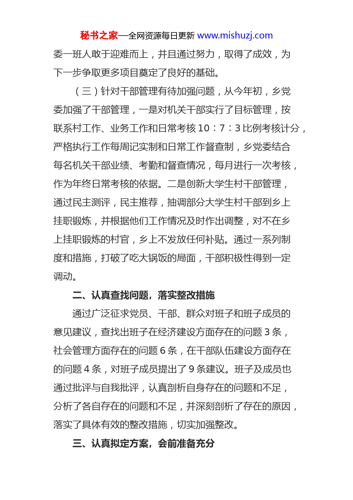 秘书之家—全网资源每日更新www.mishuzj.com某乡党委关于2022年班子民主生活会开展情况的报告我乡于2022年x月x日,xx乡党委召开了领导干部民主生活会,取得了良好成效。现将具体情况汇报如下:一、开展回头看,整改落实到位(一)针对学习上流于形式,重实干,轻学习问题,一年来,加强了党委班子和全体机关干部对各级重大会议精神的学习,学习了国家的方针、政策、法规,要求干部加强业务知识学习,鼓励机关干部参加函授,留足了年轻干部充分的学习时间,全体机关干部、特别是年轻干部政策水平和业务能力提高明显。(二)针对工作上无创新意识,在发展上存在为难情绪这一问题,一年来,党委班子积极探索,认真谋划,以立足发展,服务民生为导向,在努力完成县上下达目标任务的同时,全力向县委、政府及县上各部门争取资金x多万元,乡财列支x万余元,先后完成和正在完成xx村1.8公里、xx村3.7公里村组公路硬化,建提灌站1个,解决500多群众生产生活用水难问题,新修土坯公路3公里,为新入学大学生争取救助x万多元,改造危房30户,搬迁受灾房屋17户,排除危岩、危桥多处。这些项目工程都是在全年目标任务以外的实事、好事,虽然困难重重,但党秘书之家—全网资源每日更新www.mishuzj.com委一班人敢于迎难而上,并且通过努力,取得了成效,为下一步争取更多项目奠定了良好的基础。(三)针对干部管理有待加强问题,从今年初,乡党委加强了干部管理,一是对机关干部实行了目标管理,按联系村工作、业务工作和日常考核10︰7︰3比例考核计分,严格执行工作每周记实制和日常工作督查制,乡党委结合每名机关干部业绩、考勤和督查情况,每月进行一次考核,作为年终日常考核的依据。二是创新大学生村干部管理,通过民主测评,民主推荐,抽调部分大学生村干部到乡上挂职锻炼,并根据他们工作情况及时作出调整,对不在乡上挂职锻炼的村官,乡上不发放任何补贴。通过一系列制度和措施,打破了吃大锅饭的局面,干部积极性得到一定调动。二、认真查找问题,落实整改措施通过广泛征求党员、干部、群众对班子和班子成员的意见建议,查找出班子在经济建设方面存在的问题3条,社会管理方面存在的问题6条,在干部队伍建设方面存在的问题4条,对班子成员提出了9条建议。班子及成员也通过批评与自我批评,认真剖析自身存在的问题和不足,分析了各自存在的问题和不足,并深刻剖析了存在的原因,落实了具体有效的整改措施,切实加强整改。三、认真拟定方案,会前准备充分秘书之家—全网资源每日更新www.mishuzj.com1、拟定工作方案。按照《xx县乡镇和部门党员领导干部民主生活会实施办法(试行)》规定,结合实际,制定工作方案并上报县纪委、县委组织部。2、认真组织学习。学习《准则》、《关于领导干部报告个人有关事项的规定》等党纪条规;学习省第十次党代会报告,学习xx同志在省纪委九届九次全会上的讲话,进一步增强政治意识、大局意识、廉洁自律意识和遵纪守法观念。坚持自学和集中学习相结合,拓宽学习内容,进一步提高学习实效3、广泛征求意见。会前,通过召开座谈会、党务公开栏等形式向干部群众通报2021年度民主生活会整改措施落实情况,采取发放征求意见表、入户调研走访等形式,广泛征求党组织、党员干部群众、党代表对领导班子以及党员领导干部思想、工作、作风以及党风廉洁建设等方面的意见和上年度民主生活会整改落实情况方面的意见,梳理找出亟待解决的重点问题,并将意见如实反馈给领导班子和领导干部本人。4、开展会前谈心。乡党委书记切实发挥领导和表率作用,与班子成员逐一进行谈心,交流思想、查找问题、共同提高。班子成员之间相互开展谈心谈话,沟通情况,交换意见,做到充分交流思想、互相帮助提醒,进一步加深共识,增进团结。秘书之家—全网资源每日更新www.mishuzj.com5、撰写发言提纲。党员领导干部结合学习心得、个人实际和征求到的意见,紧紧围绕会议主题,联系思想和工作实际,认真开展党性分析,针对班子、个人和分管工作存在的问题认真撰写发言提纲。四、认真召开会议,取得显著成效1、召开会议。2022年x月x日,召开了党委民主生活会,会议由乡党委书记李成光同志主持。一是组织学习县纪委、县委组织部《关于开好2022年度党员领导干部民主生活会的通知》;二是乡党委书记反馈征求意见情况,通报上次民主生活会问题整改落实情况;三是班子成员对照存在的问题开展批评与自我批评;四是列席人员发言;五是对群众关心、反映强烈和民主生活会上查找出来的问题,制定针对性强的整改方案,落实整改责任和时限。2、取得的成效。一是扩大了民主。认真落实民主生活会旁听制度,邀请了党代表、人大代表和普通党员列席旁听民主生活会,自觉接受群众监督,受到党员、干部、群众好评。二是增进团结。在民主生活会上,班子成员之间,畅所欲言,开展了批评与自我批评,相互之间提出的意见建议诚恳、实在,又实事求是,不偏不倚,促进了班子成员的了解、沟通,增进了团结。秘书之家—全网资源每日更新www.mishuzj.com三是找出了问题。通过会前广泛征求意见建设和会上开展了批评与自我批评,查找出班子和个人存在的问题。班子存在的主要问题有。并落实了具体的整改措施。四是促进工作。通过开展批评与自我批评,班子及其成员明