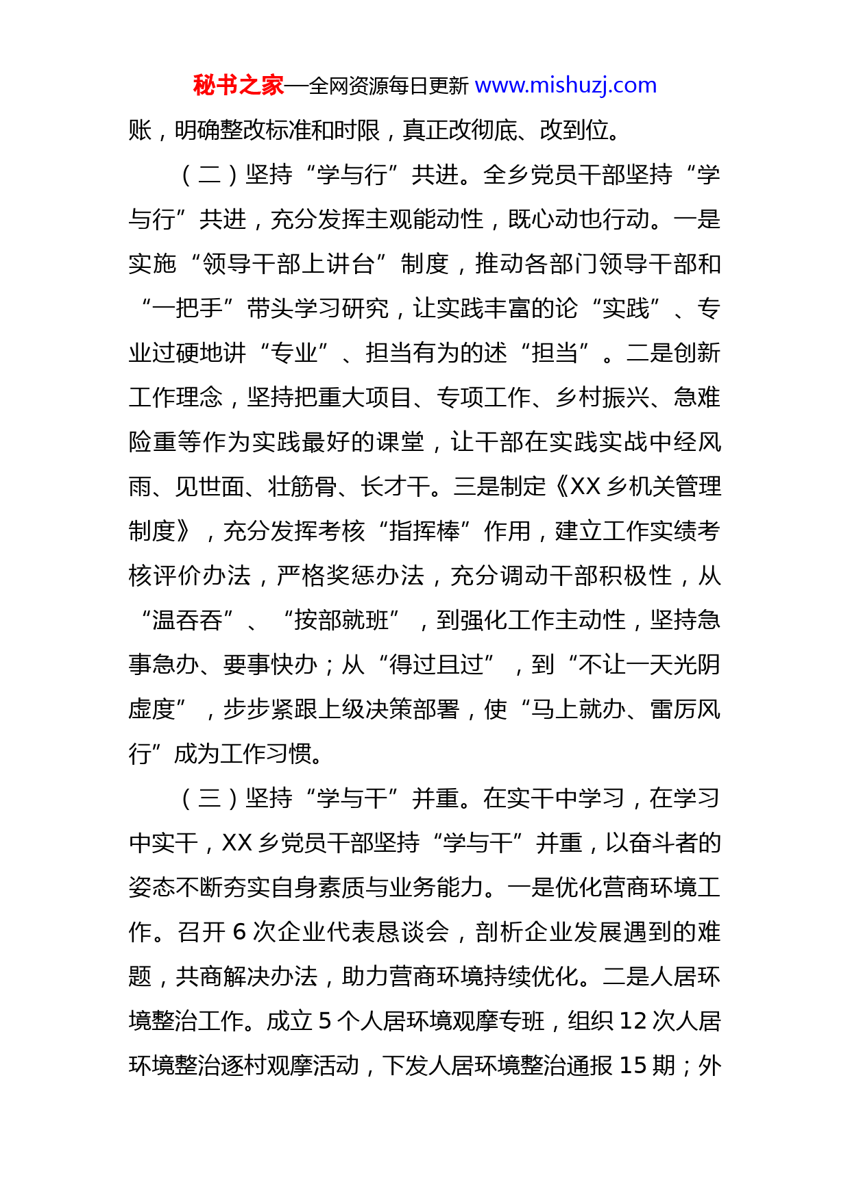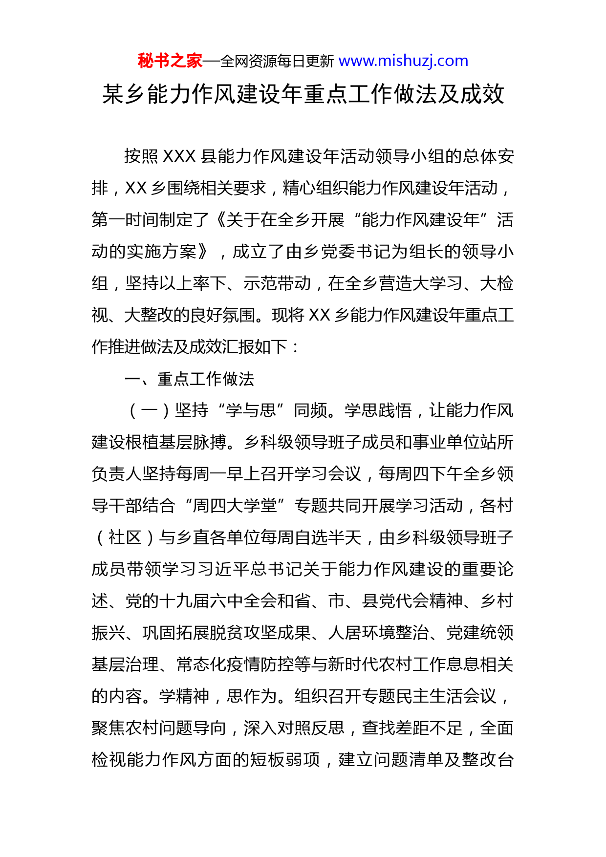 秘书之家—全网资源每日更新www.mishuzj.com某乡能力作风建设年重点工作做法及成效按照XXX县能力作风建设年活动领导小组的总体安排,XX乡围绕相关要求,精心组织能力作风建设年活动,第一时间制定了《关于在全乡开展“能力作风建设年”活动的实施方案》,成立了由乡党委书记为组长的领导小组,坚持以上率下、示范带动,在全乡营造大学习、大检视、大整改的良好氛围。现将XX乡能力作风建设年重点工作推进做法及成效汇报如下:一、重点工作做法(一)坚持“学与思”同频。学思践悟,让能力作风建设根植基层脉搏。乡科级领导班子成员和事业单位站所负责人坚持每周一早上召开学习会议,每周四下午全乡领导干部结合“周四大学堂”专题共同开展学习活动,各村(社区)与乡直各单位每周自选半天,由乡科级领导班子成员带领学习习近平总书记关于能力作风建设的重要论述、党的十九届六中全会和省、市、县党代会精神、乡村振兴、巩固拓展脱贫攻坚成果、人居环境整治、党建统领基层治理、常态化疫情防控等与新时代农村工作息息相关的内容。学精神,思作为。组织召开专题民主生活会议,聚焦农村问题导向,深入对照反思,查找差距不足,全面检视能力作风方面的短板弱项,建立问题清单及整改台秘书之家—全网资源每日更新www.mishuzj.com账,明确整改标准和时限,真正改彻底、改到位。(二)坚持“学与行”共进。全乡党员干部坚持“学与行”共进,充分发挥主观能动性,既心动也行动。一是实施“领导干部上讲台”制度,推动各部门领导干部和“一把手”带头学习研究,让实践丰富的论“实践”、专业过硬地讲“专业”、担当有为的述“担当”。二是创新工作理念,坚持把重大项目、专项工作、乡村振兴、急难险重等作为实践最好的课堂,让干部在实践实战中经风雨、见世面、壮筋骨、长才干。三是制定《XX乡机关管理制度》,充分发挥考核“指挥棒”作用,建立工作实绩考核评价办法,严格奖惩办法,充分调动干部积极性,从“温吞吞”、“按部就班”,到强化工作主动性,坚持急事急办、要事快办;从“得过且过”,到“不让一天光阴虚度”,步步紧跟上级决策部署,使“马上就办、雷厉风行”成为工作习惯。(三)坚持“学与干”并重。在实干中学习,在学习中实干,XX乡党员干部坚持“学与干”并重,以奋斗者的姿态不断夯实自身素质与业务能力。一是优化营商环境工作。召开6次企业代表恳谈会,剖析企业发展遇到的难题,共商解决办法,助力营商环境持续优化。二是人居环境整治工作。成立5个人居环境观摩专班,组织12次人居环境整治逐村观摩活动,下发人居环境整治通报15期;外秘书之家—全网资源每日更新www.mishuzj.com出观摩学习兄弟乡镇、办事处人居环境整治亮点村(社区)15个。在全县多次人居环境观摩活动中,排名靠前。三是常态化疫情防控工作。充分发挥“三支队伍”优势,整合“支部联支部”队伍、县直单位下沉一线帮扶队伍、村党支部队伍力量,充分发挥党组织战斗堡垒和广大党员干部先锋模范作用,汇聚起抗击疫情的强大合力。四是党员干部培训工作。制定并实施了《XX乡关于推进新时代基层干部主题培训行动计划的实施方案》,分层次、分岗位、分班次,科学设置课程,全面提升干部能力作风。目前,已举办培训班5期,参训党员干部337人次。五是应急演练工作。坚持“以练为主、贴近实战”的原则,锻炼应急队伍,积累实战经验,进一步提升了全乡应急管理工作水平,共开展防汛应急演练6次、全员核酸采集演练3次、消防演练5次。二、取得的成效(一)一心一意谋发展,交出了加压奋进、追赶跨越的优异答卷。XX乡紧紧抓住发展第一要务,坚持学习提升、奋力拼搏、扎实苦干,建设完成3万亩高标准农田、XX村14MW(兆瓦)分散式风力发电、泥河流域生态治理等一批影响深远的大项目,经济实力显著增强。圆满完成农村集体产权制度改革,全面消除集体经济“空壳村”,大力培育现代农业,初步形成了食品加工、花木茶秘书之家—全网资源每日更新www.mishuzj.com旅、空心贡面、牛羊(生猪)养殖、蔬菜(食用菌)、小龙虾(芡实)六大主导产业,其中蔬菜(食用菌)产业中的“歪把萝卜”和空心贡面成功入选全国名特优新农产品名录库。(二)坚定不移抓整治,交出了环境提升、颜值靓丽的优异答卷。坚定不移抓乡村人居环境整治,抓实首集乱象治理,深入开展“六清”、治理“六乱”活动,广泛开展“厕所革命”和“五美庭院”创建,卫生清扫、垃圾清运、日常保洁等管护机制基本形成,完成旱厕改造105户,拆除农村旱厕120座,农村生活垃圾村庄治理率达100%,整治占道经营行为36起,清除不规范菜园312个,评选“卫生文明户”66户,切实改善了村容村貌和群众生活环境。坚决打好污染防治攻坚战,统筹推进河长制、林长制,黑臭水体得到全面治理,入河排污口实现全域整治,不烧秸秆成为群众共识。创卫工作实现新突破。整治店外经营23户,拆除不规范店铺招牌48块。完成XX公路1公里人行步道铺设,同步配套绿化带、路沿石、路灯等基础设施,沿潢上路栽植观赏苗木4000余株,新安装路灯150余盏。XX社区、集镇污水管网实现全覆盖,国家卫生乡镇创建工作将于今年9月份迎接验收。(三)齐心协力保民生,交出了人民安居、社会和谐的优异答卷。面对新冠疫情,乡村两级党员干部同心聚