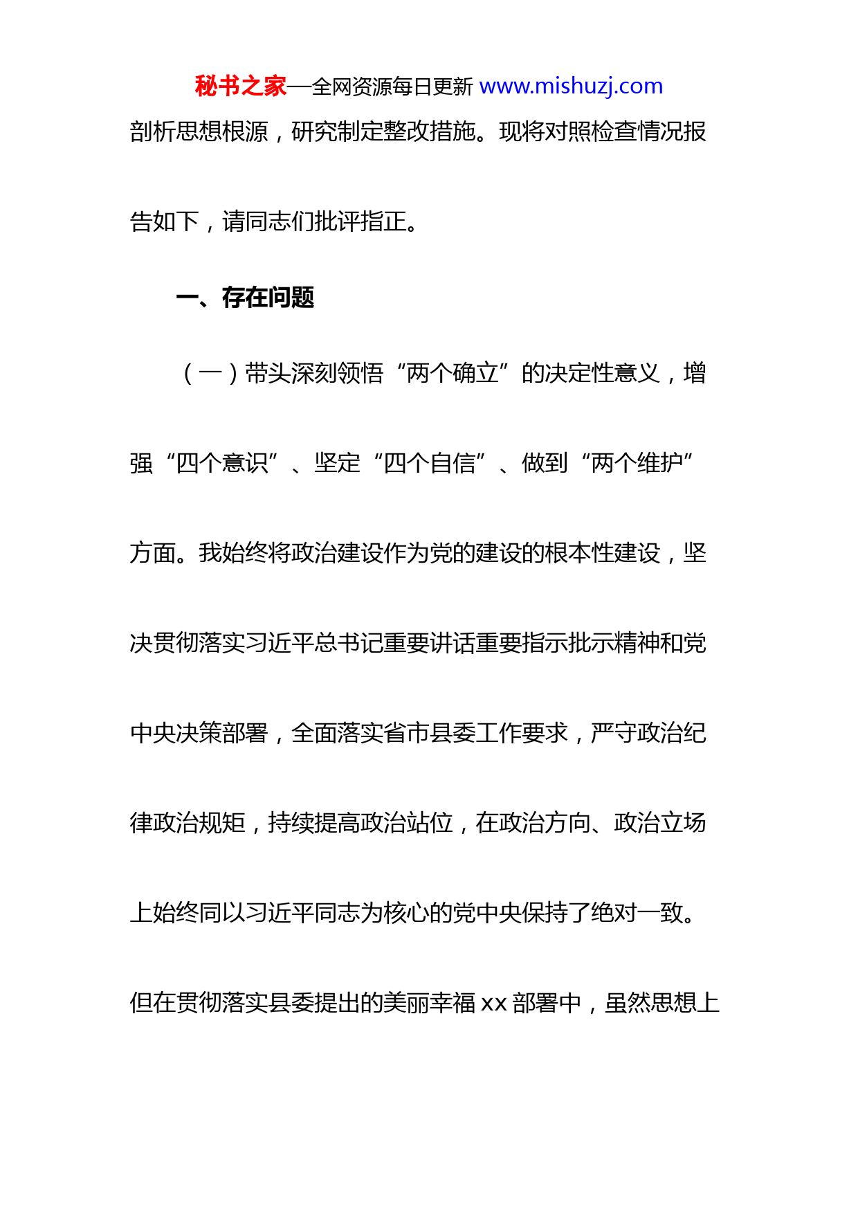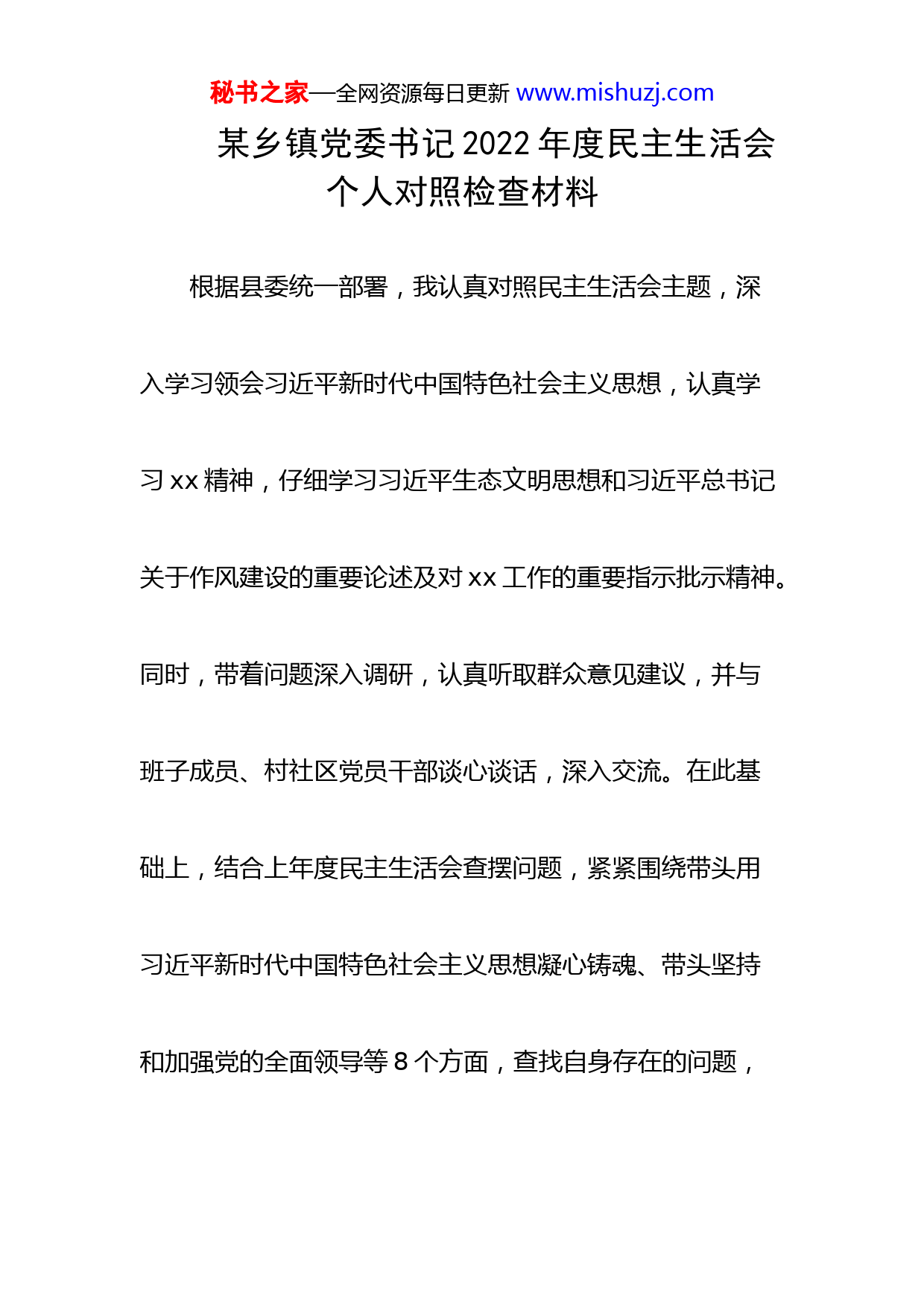 秘书之家—全网资源每日更新www.mishuzj.com某乡镇党委书记2022年度民主生活会个人对照检查材料根据县委统一部署,我认真对照民主生活会主题,深入学习领会习近平新时代中国特色社会主义思想,认真学习xx精神,仔细学习习近平生态文明思想和习近平总书记关于作风建设的重要论述及对xx工作的重要指示批示精神。同时,带着问题深入调研,认真听取群众意见建议,并与班子成员、村社区党员干部谈心谈话,深入交流。在此基础上,结合上年度民主生活会查摆问题,紧紧围绕带头用习近平新时代中国特色社会主义思想凝心铸魂、带头坚持和加强党的全面领导等8个方面,查找自身存在的问题,秘书之家—全网资源每日更新www.mishuzj.com剖析思想根源,研究制定整改措施。现将对照检查情况报告如下,请同志们批评指正。一、存在问题(一)带头深刻领悟“两个确立”的决定性意义,增强“四个意识”、坚定“四个自信”、做到“两个维护”方面。我始终将政治建设作为党的建设的根本性建设,坚决贯彻落实习近平总书记重要讲话重要指示批示精神和党中央决策部署,全面落实省市县委工作要求,严守政治纪律政治规矩,持续提高政治站位,在政治方向、政治立场上始终同以习近平同志为核心的党中央保持了绝对一致。但在贯彻落实县委提出的美丽幸福xx部署中,虽然思想上秘书之家—全网资源每日更新www.mishuzj.com高度重视,提出了xx镇要争当全县排头兵的目标,实际工作中也在按照县委安排有序推进,但是创造性地开展工作少,产业转型步伐还不快,可圈可点的工作还不突出,说明自身的思想认识、政治站位还不够高。(二)带头用习近平新时代中国特色社会主义思想凝心铸魂方面。虽然自身持续深化学习,努力用习近平新时代中国特色社会主义思想武装头脑,但面对习近平新时代中国特色社会主义思想博大精深的内容,结合工作实际深入研读和理解把握还不够透彻,特别是用习近平经济思想解决实际问题的能力还需进一步强化。学习的实效还不够突出,虽然自己带领班子成员坚决贯彻党中央的重大决策秘书之家—全网资源每日更新www.mishuzj.com部署和省市县委的要求,努力在学懂弄通做实上狠下功夫,但在学以致用,以供给侧结构性改革为主线加快我镇改革发展方面还有差距,主要体现在培育新的经济增长点,实现创新、协调、绿色发展,建设具有核心竞争力、循环绿色发展的现代经济方面的措施还不够具体,还需以学习的新成效促进工作的新提升。(三)带头坚持和加强党的全面领导方面。严格按照党委工作程序和组织原则,不断巩固党委在全镇工作中的核心作用。但通过认真反思,在严肃党内政治生活方面还有一些差距和不足。平时也想与党员干部多交流多沟通,听一听大家的想法建议,但由于临时性事务安排,参加支秘书之家—全网资源每日更新www.mishuzj.com部活动还是不够经常,达到规定次数后就有所懈怠、请假较多,静下心来与大家面对面交流沟通较少,了解掌握党员干部的生活、思想情况不够全面。对同志开展批评时,考虑到一些同志年龄较大、加班加点很辛苦,怕批评多了影响团结干事氛围,有时存在以点醒代替提醒、以建议代替批评的现象。反映出我在带头严格执行制度上表率作用发挥得不够,距离打通严肃党内政治生活“最后一公里”还有一定差距。(四)带头坚持以人民为中心的发展思想,推动改革发展稳定方面。始终把为民造福作为自己的初心和使命,想尽办法多为群众办点实事好事,让大家有更多的获得感、秘书之家—全网资源每日更新www.mishuzj.com幸福感。但这段时间通过深入基层与群众沟通交流、反思同志们对我提出的意见建议,深感自己还有一定差距。平时总感觉到有干不完的工作、开不完的会,几乎没有时间到基层哪个村上住几天,真正沉下身子体验脱贫村的实际生活,一户一户和群众拉一拉家常,听一听想法,对群众所需所盼了解得不够精准,特别是发展壮大村集体经济、建立工作机制上,还需深入研究解决。对群众来信来访批转多,主动接访、带案下访倾听群众诉求少针对群众反映强烈的物业管理服务问题,我们也采取了一些措施,也收到了一定成效,但投诉问题仍然居高不下,说明整治成效与群众的期盼还有较大差距。秘书之家—全网资源每日更新www.mishuzj.com(五)带头发扬斗争精神,防范化解风险挑战方面。面对部分企业生产经营困难、部分重点项目进度缓慢、融资难问题依然突出,光伏产业生产经营进入谷底等一系列困难和问题,虽然我们也想了一些办法,制定了相应措施,但也只是解决暂时的困难,还没有形成长期有效的措施,在着眼长远发展、统筹推进和创造性开展工作方面还需持续努力。面对招商引资难度不断增大,大项目、好项目竞争激烈以及企业创新能力不强,难以使我镇在全县更具竞争力等问题,我们学习借鉴、从实际出发分析解决问题的能力和工作执行力还需增强。全局意识还有待提高,考虑问题、研究事项精力主要集中到推动产业发展上,对涉及秘书之家—全网资源每日更新www.mishuzj.com周边农村、社区融合发展方面调查了解情况还不够深入,进一步发挥好辐射带动方面还需持续强化。(六)带头落实全面从严治党政治责任方面。坚持把把管党治党政治责任扛在肩上、抓在手上,严格落实党委全面从严治党主体责任清单,带头严守政治