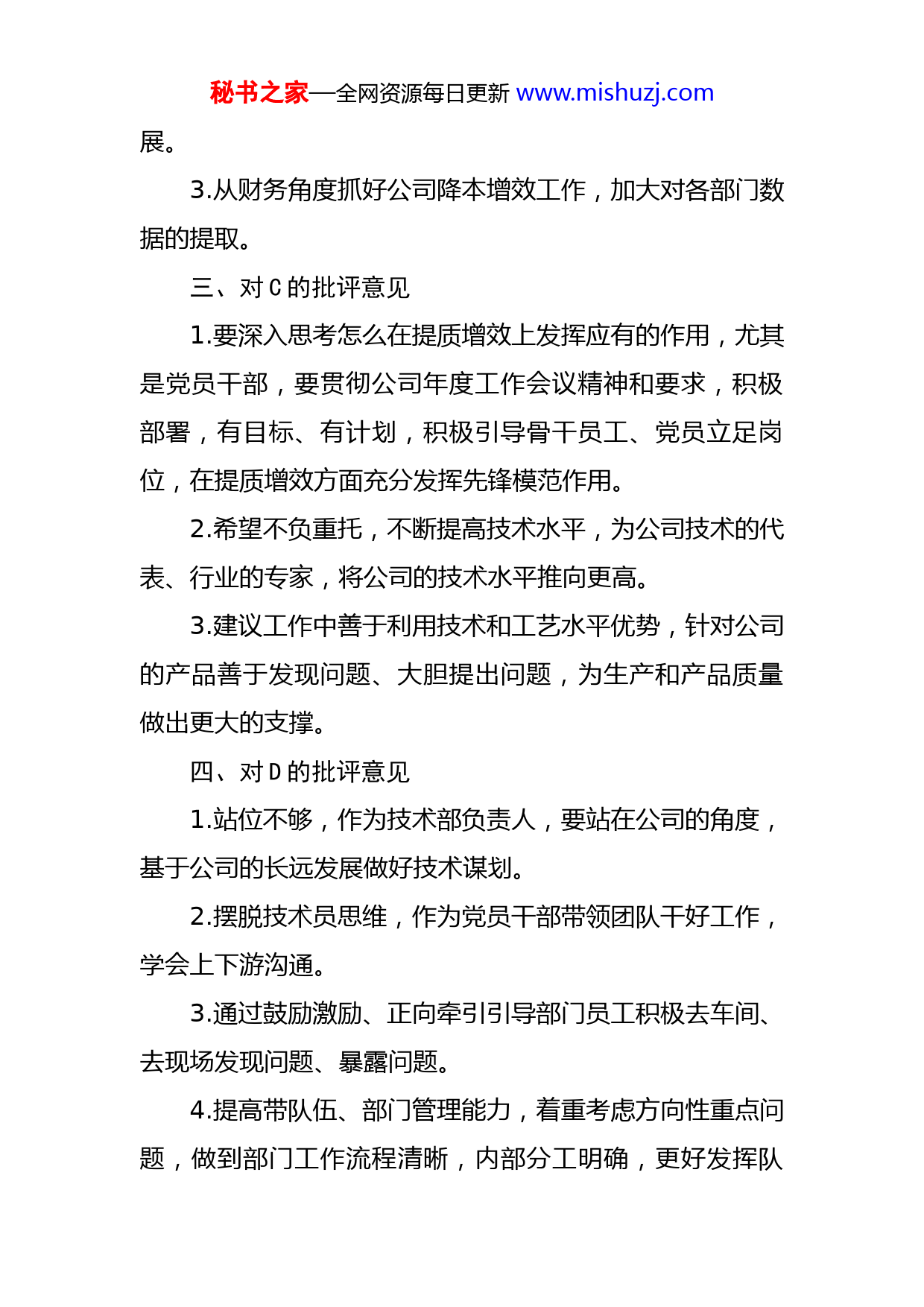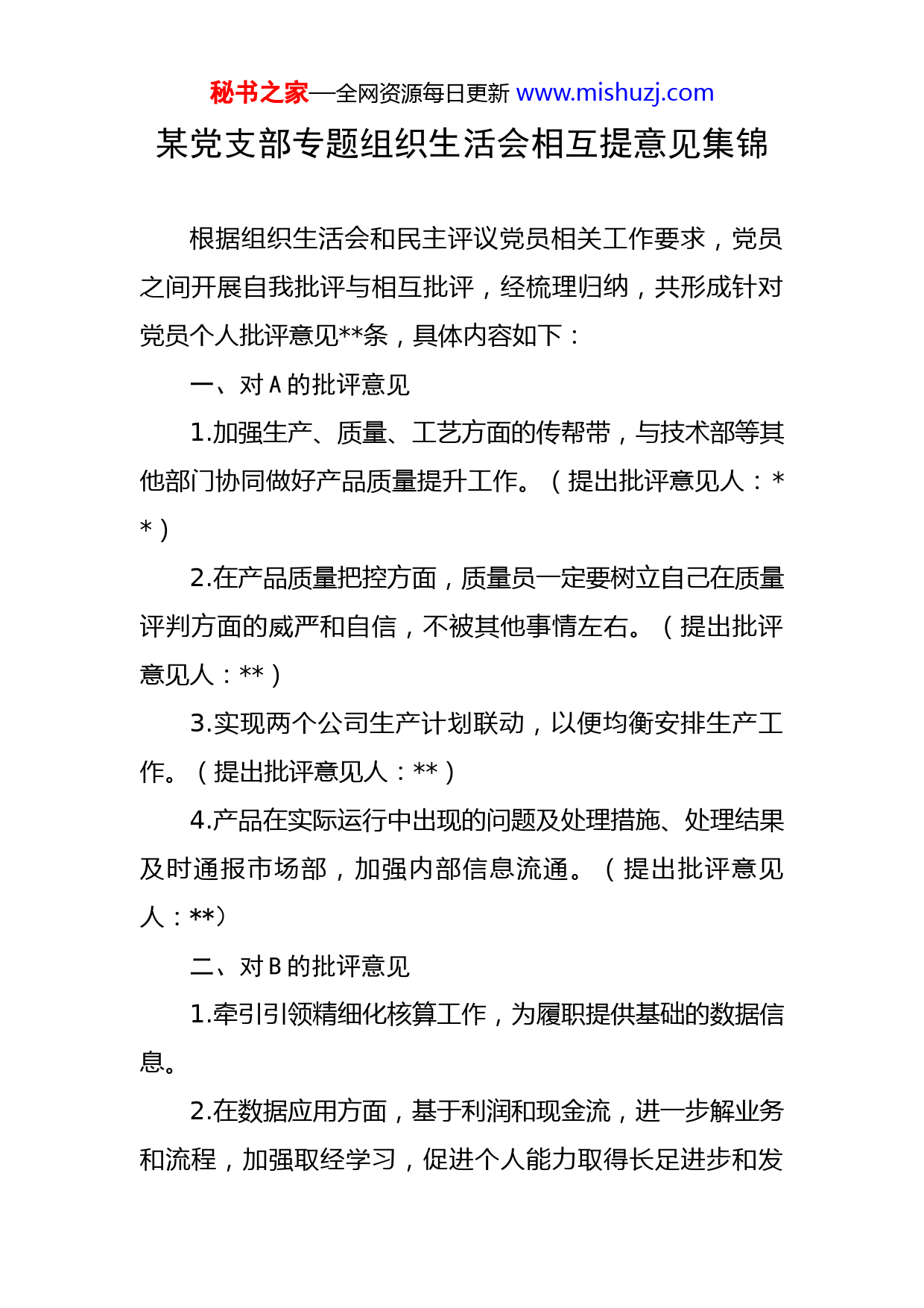 秘书之家—全网资源每日更新www.mishuzj.com某党支部专题组织生活会相互提意见集锦根据组织生活会和民主评议党员相关工作要求,党员之间开展自我批评与相互批评,经梳理归纳,共形成针对党员个人批评意见条,具体内容如下:一、对A的批评意见1.加强生产、质量、工艺方面的传帮带,与技术部等其他部门协同做好产品质量提升工作。(提出批评意见人:)2.在产品质量把控方面,质量员一定要树立自己在质量评判方面的威严和自信,不被其他事情左右。(提出批评意见人:)3.实现两个公司生产计划联动,以便均衡安排生产工作。(提出批评意见人:)4.产品在实际运行中出现的问题及处理措施、处理结果及时通报市场部,加强内部信息流通。(提出批评意见人:)二、对B的批评意见1.牵引引领精细化核算工作,为履职提供基础的数据信息。2.在数据应用方面,基于利润和现金流,进一步解业务和流程,加强取经学习,促进个人能力取得长足进步和发秘书之家—全网资源每日更新www.mishuzj.com展。3.从财务角度抓好公司降本增效工作,加大对各部门数据的提取。三、对C的批评意见1.要深入思考怎么在提质增效上发挥应有的作用,尤其是党员干部,要贯彻公司年度工作会议精神和要求,积极部署,有目标、有计划,积极引导骨干员工、党员立足岗位,在提质增效方面充分发挥先锋模范作用。2.希望不负重托,不断提高技术水平,为公司技术的代表、行业的专家,将公司的技术水平推向更高。3.建议工作中善于利用技术和工艺水平优势,针对公司的产品善于发现问题、大胆提出问题,为生产和产品质量做出更大的支撑。四、对D的批评意见1.站位不够,作为技术部负责人,要站在公司的角度,基于公司的长远发展做好技术谋划。2.摆脱技术员思维,作为党员干部带领团队干好工作,学会上下游沟通。3.通过鼓励激励、正向牵引引导部门员工积极去车间、去现场发现问题、暴露问题。4.提高带队伍、部门管理能力,着重考虑方向性重点问题,做到部门工作流程清晰,内部分工明确,更好发挥队秘书之家—全网资源每日更新www.mishuzj.com伍整体合力。5.转变工作思路,加强发现问题的主动性。五、对E的批评意见1.综合能力尚有很大的提升空间。一要克服自己朴素的观念、改进性格的腼腆;二是改善与沟通的策略、技巧、话术;三是加强工作沟通能力;四是不断加强个人学习。2.进一步提升执行力,分清轻重缓解、抓好工作落实,做到事事有回音、有反馈。3.根据工作角色的变化,进一步加强对产品的熟悉度。4.做好自我时间管理,工作中分清主次。5.提高工作站位要高,工作中善于立足生产交付全盘考虑,加强全流程思维模式。六、对F的批评意见1.提高站位,基于公司的长远发展做好技术谋划。2.转换思维,学会上下游工作沟通,改善沟通技巧与方式;学会倾听,善于虚心接受意见建议,善于换位思考。七、对G的批评意见1.积极解放思想,走出思维死角。2.主动转换角色,发挥先锋模范作用,带头做好传帮带。3.多贴近现场,放下身段,将贴近现场作为累积经验的有效方法。秘书之家—全网资源每日更新www.mishuzj.com4.加强自我情绪管理,做一个德高望重的专家。5.进一步培养自身严谨扎实的工作作风,多关输出文件的质量,部署的工作按照时间、按照计划完成,避免虎头蛇尾,强化执行与反馈,提高部门协同工作时的工作效率。6.保持谦虚的心态,善于听取外部的意见和建议,特别对其他厂家的产品抱着虚心的态度学习,工作中充分考虑客户需求。八、对H的批评意见1.畏难情绪与心理是带队伍最大的忌讳,深入剖析自我审视,学习控制情绪。2.分清工作任务的轻重缓解,合理配置内部资源,将合适的人放在合适的岗位,用科学的方法论及时有效完成重大的工作,包括顶层工作谋划。九、对I的批评意见1.明确职责定位,在做好工作规划和统筹设计方面多下功夫,更多的精力放在做好行动方案上,充分发挥所有党员的智慧,推动组织工作开展。2.提升策划和推动能力,采取有效措施做到党建工作全员参与、发力。3.学会有效控制情绪。4.加强与各部门主管沟通,充分挖掘党建工作与业务工秘书之家—全网资源每日更新www.mishuzj.com作有效融合、双向促进的结合点,做出工作亮点。5.加强与内外部联建,丰富党建活动形式。