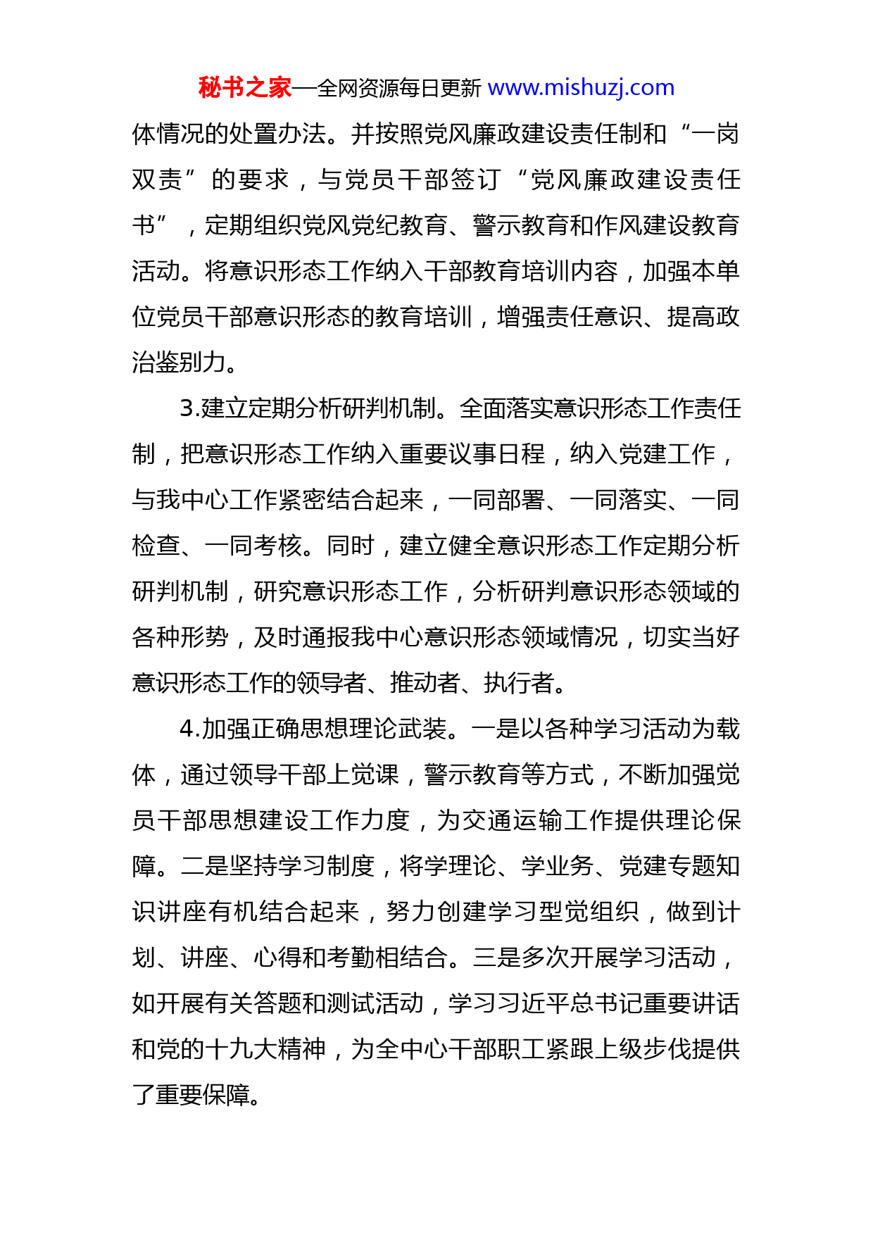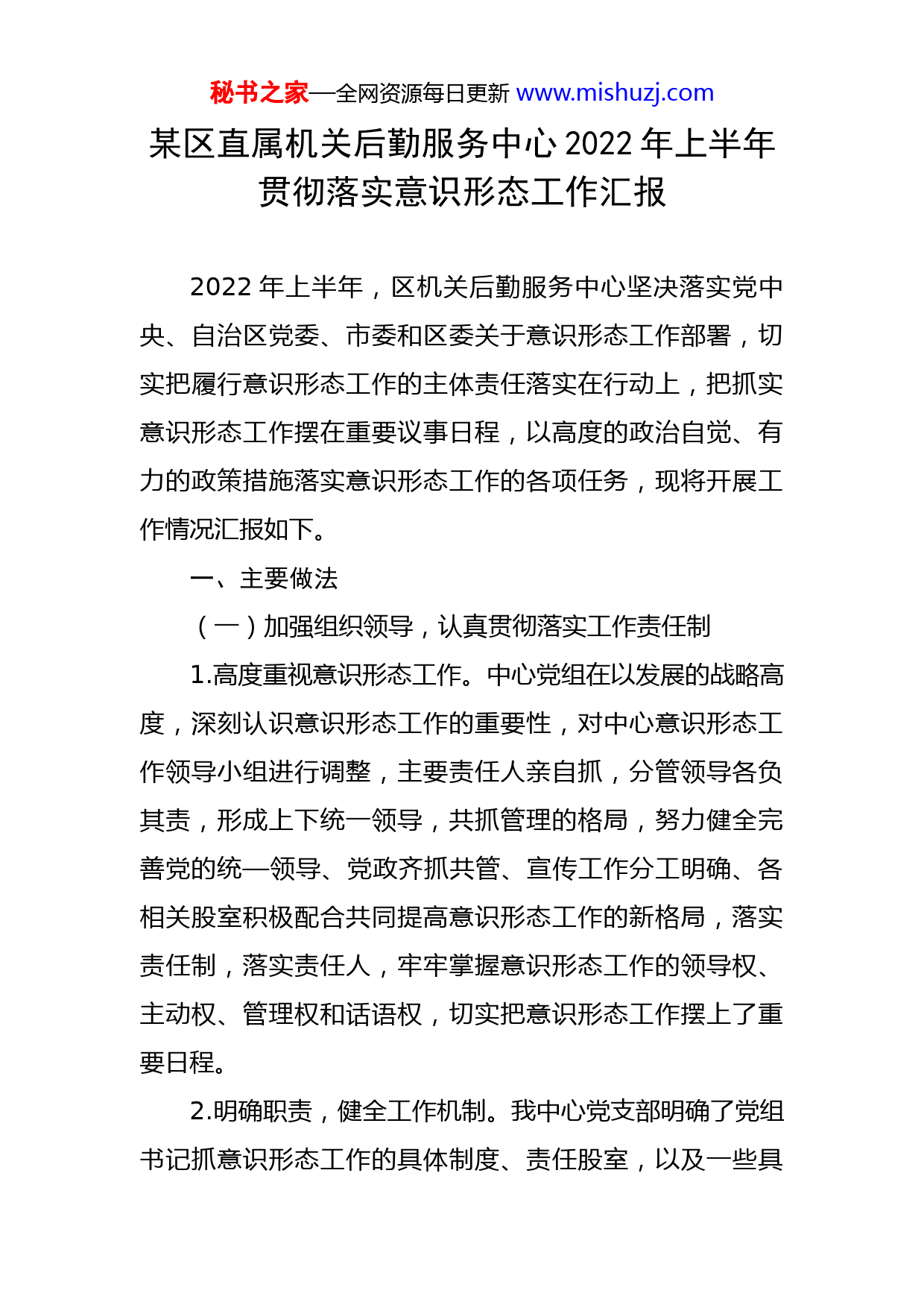 秘书之家—全网资源每日更新www.mishuzj.com某区直属机关后勤服务中心2022年上半年贯彻落实意识形态工作汇报2022年上半年,区机关后勤服务中心坚决落实党中央、自治区党委、市委和区委关于意识形态工作部署,切实把履行意识形态工作的主体责任落实在行动上,把抓实意识形态工作摆在重要议事日程,以高度的政治自觉、有力的政策措施落实意识形态工作的各项任务,现将开展工作情况汇报如下。一、主要做法(一)加强组织领导,认真贯彻落实工作责任制1.高度重视意识形态工作。中心党组在以发展的战略高度,深刻认识意识形态工作的重要性,对中心意识形态工作领导小组进行调整,主要责任人亲自抓,分管领导各负其责,形成上下统一领导,共抓管理的格局,努力健全完善党的统—领导、党政齐抓共管、宣传工作分工明确、各相关股室积极配合共同提高意识形态工作的新格局,落实责任制,落实责任人,牢牢掌握意识形态工作的领导权、主动权、管理权和话语权,切实把意识形态工作摆上了重要日程。2.明确职责,健全工作机制。我中心党支部明确了党组书记抓意识形态工作的具体制度、责任股室,以及一些具秘书之家—全网资源每日更新www.mishuzj.com体情况的处置办法。并按照党风廉政建设责任制和“一岗双责”的要求,与党员干部签订“党风廉政建设责任书”,定期组织党风党纪教育、警示教育和作风建设教育活动。将意识形态工作纳入干部教育培训内容,加强本单位党员干部意识形态的教育培训,增强责任意识、提高政治鉴别力。3.建立定期分析研判机制。全面落实意识形态工作责任制,把意识形态工作纳入重要议事日程,纳入党建工作,与我中心工作紧密结合起来,一同部署、一同落实、一同检查、一同考核。同时,建立健全意识形态工作定期分析研判机制,研究意识形态工作,分析研判意识形态领域的各种形势,及时通报我中心意识形态领域情况,切实当好意识形态工作的领导者、推动者、执行者。4.加强正确思想理论武装。一是以各种学习活动为载体,通过领导干部上觉课,警示教育等方式,不断加强觉员干部思想建设工作力度,为交通运输工作提供理论保障。二是坚持学习制度,将学理论、学业务、党建专题知识讲座有机结合起来,努力创建学习型觉组织,做到计划、讲座、心得和考勤相结合。三是多次开展学习活动,如开展有关答题和测试活动,学习习近平总书记重要讲话和党的十九大精神,为全中心干部职工紧跟上级步伐提供了重要保障。秘书之家—全网资源每日更新www.mishuzj.com(二)抓党建促进意识形态工作。1.科学部署党建工作。年初,组织全中心党员干部国绕新形势、新要求下党建工作的重点,制定了全年的党建工作计划。从建立觉建工作协调制度、完善党建工作例会、从开展“学政策、强作风、抓落实、创一流”活动等方面入手,制定了组织、宣传等工作计划,致力于促进党建工作规范化、制度化。2.详细分解工作责任。明确觉建工作分工,—把手负总责,班子其他成员结合分工抓好分管工作范围内的党建工作,用党建工作不断带动意识形态工作的开展。3.坚持监督检查严要求。对各项工作,做到了有布置必有检查,有检查必有通报。建立了工作纪律、对出现门题以及任务完成不及时、不达标的党员干部及时进行批评和劝诫,帮助他们分析原因、改进方法,提高自身的工作能力。4.提高思想认识,增强自觉行动。为了深入贯彻落实习近平总书记关于加强学习、建设学习大国重要指示精神,大力宣传新时代中国特色社会主义思想,我中心通过开展建设“学习强国”学习平台活动,多措并举确保广大党员干部学懂用活“学习强国”这个学习平台,汲取信仰的力量、真理的力量、担当的力量、人格的力量,树牢“四个意识”、坚定“四个自信”、践行“两个维护”,自觉做秘书之家—全网资源每日更新www.mishuzj.com习近平新时代中国特色社会主义思想的忠诚信奉者和坚定实践者。二、存在问题我中心意识形态工作虽然取得了一定的成绩,但同时也存在一些问题:一是对意识形态工作的重要性认识不足,思想认识存在偏差。二是互联网、手机微信等新兴媒体的应用和引导管理需要进一步探索。三是新形势下提高引导舆论的本领需要进一步增强。四是满足干部职工文化需求的工作有待加强;四是对外宣传工作还需进一步加强。三、下一步工作思路及意见建议下一步,我中心将始终围绕党管意识形态工作这一主线,以高度的政治自觉、思想自觉和行动自觉抓牢抓实抓细意识形态工作,推动中心工作再上新台阶。(一)强化政治引领。牢牢掌握意识形态工作领导权,以落实意识形态工作责任制为抓手,坚持不懈加强党的政治建设,持续用习近平新时代中国特色社会主义思想和党的十九大精神武装头脑、指导实践、推动工作,让党的创新理论深入我中心全体干部职工,为我中心工作开展提供思想支持、舆论支持。(二)加强导向管理。坚持党管宣传、党管意识形态、党管媒体,定期分析研判意识形态领域存在的问题,秘书之家—全网资源每日更新www.mishuzj.com坚持正确导向贯穿舆论宣传各环节,为我中心工作开展汇聚正能量。认真落实属地管理原则,开展意识形态“六进六育”主题活动,充分利用工作队、微信群等大力宣传活动开展情况,全方位、多层次、有重点地开展