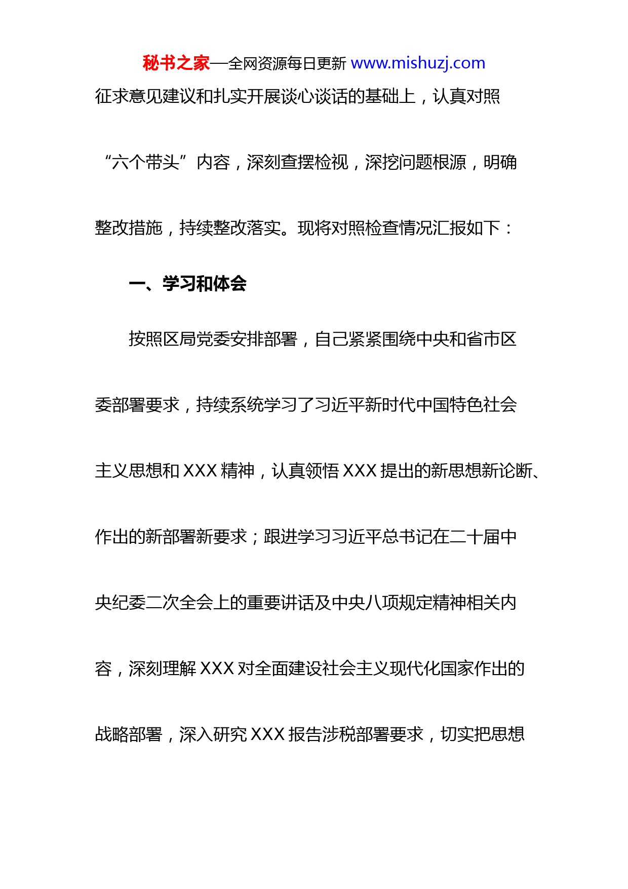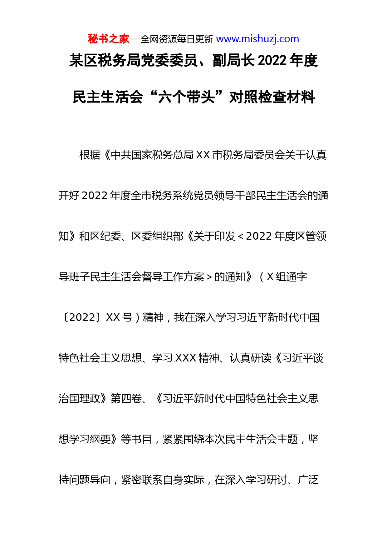 秘书之家—全网资源每日更新www.mishuzj.com某区税务局党委委员、副局长2022年度民主生活会“六个带头”对照检查材料根据《中共国家税务总局XX市税务局委员会关于认真开好2022年度全市税务系统党员领导干部民主生活会的通知》和区纪委、区委组织部《关于印发<2022年度区管领导班子民主生活会督导工作方案>的通知》(X组通字〔2022〕XX号)精神,我在深入学习习近平新时代中国特色社会主义思想、学习XXX精神、认真研读《习近平谈治国理政》第四卷、《习近平新时代中国特色社会主义思想学习纲要》等书目,紧紧围绕本次民主生活会主题,坚持问题导向,紧密联系自身实际,在深入学习研讨、广泛秘书之家—全网资源每日更新www.mishuzj.com征求意见建议和扎实开展谈心谈话的基础上,认真对照“六个带头”内容,深刻查摆检视,深挖问题根源,明确整改措施,持续整改落实。现将对照检查情况汇报如下:一、学习和体会按照区局党委安排部署,自己紧紧围绕中央和省市区委部署要求,持续系统学习了习近平新时代中国特色社会主义思想和XXX精神,认真领悟XXX提出的新思想新论断、作出的新部署新要求;跟进学习习近平总书记在二十届中央纪委二次全会上的重要讲话及中央八项规定精神相关内容,深刻理解XXX对全面建设社会主义现代化国家作出的战略部署,深入研究XXX报告涉税部署要求,切实把思想秘书之家—全网资源每日更新www.mishuzj.com和行动统一到党中央精神上来,把学习贯彻XXX精神成果转化为推动全区税收事业高质量发展的实际成效,打牢开好民主生活会的思想基础。通过党委集体学习研讨、聆听专题党课、个人深入自学、撰写心得体会等方式,进一步深刻领悟了“两个确立”的决定性意义,加深了对习近平新时代中国特色社会主义思想、中国式现代化等重大问题的认识,政治站位、理想信念、宗旨意识等得到了进一步提高,“四个意识”更加牢固,“四个自信”更加坚定,“两个维护”更加坚决,也为自己今后更好开展税收工作奠定了理论基础,增强了责任意识。作为新时代的一名税务干部,我将深入学秘书之家—全网资源每日更新www.mishuzj.com习贯彻XXX报告精神,认真落实新时代党的路线方针政策,始终秉承讲政治、重公道、业务精、作风好的理念,树牢为民初心,彰显税务担当。二、上年度民主生活会整改措施落实情况在2021年度“党史学习教育”专题民主生活会上,自己对照带头深刻感悟“两个确立”的决定性意义等X个方面逐条进行检视,共查摆出自身存在的问题XX条;市局巡察整改专题民主生活会上检视出问题XX条。针对这些问题,我认真制定整改方案,列出问题清单,明确整改内容、整改措施和整改时限,以强烈的政治责任感,勇于直面问题,主动担当作为,强化统筹协调,认真抓好分管领域各项工秘书之家—全网资源每日更新www.mishuzj.com作,同时严格落实全面从严治党责任,带头严守政治纪律和政治规矩,不断加强党性修养、改进工作作风。目前这些问题已全部整改到位,并取得明显成效。三、存在的主要问题(一)带头深刻领悟“两个确立”的决定性意义,增强“四个意识”、坚定“四个自信”、做到“两个维护”方面。能够带头深刻感悟“两个确立”的决定性意义,增强“四个意识”、坚定“四个自信”、做到“两个维护”,始终保持政治立场不移、政治方向不偏。但对照更高标准,反思仍存在三个差距:一是首位意识还不强。平时想问题、作决策、抓工作,习惯性从工作需要和客观实际出发,从秘书之家—全网资源每日更新www.mishuzj.com政治高度认识和把握上级决策部署相对不足,自觉站位大局角度来思考、谋划、推动工作还有欠缺。对政治判断力、政治领悟力、政治执行力的现实意义及内在联系认识还不够深,具体工作中潜意识里觉得只要把手头的任务执行好就行了,贯彻上级决策部署有时态度不够坚决,措施不够有力,导致有些工作与上级部署要求和群众期待还有一定差距。二是带头意识还不强。对上级决定的事项和部署的工作任务,能够坚持马上就办、狠抓落实,但遇到一些困难大、问题多的工作时,自己的思考深度、站位高度及协调、督促、推动的力度还不够大,发扬钉钉子精神相对不足,缺乏“一抓到底”的韧劲,导致自己分管的一些业务秘书之家—全网资源每日更新www.mishuzj.com工作进度滞后,完成效果不够理想。比如在往来款项清理工作中,随时有督促问询,但狠抓劲头不足,待上级紧急通知要求时才扑下身子加班加点全力采取措施进行清理,影响了工作质效。三是党性上的自省度还有差距。作为党员领导干部,能够做到对党忠诚老实,在实际工作中,实事求是地建言献策,讲实话真话。但对照剖析,仍存在一些不足。比如,对分管领域外的工作和一些全域重点工作关注程度不够,集体决策过程中发言不多,特别是在有交叉的工作上顾虑多,与其他班子成员主动沟通协调、敞开心扉谈思想讲问题少,衔接不力、共议不够,存在明哲保秘书之家—全网资源每日更新www.mishuzj.com身、被动应付的思想,积极主动为“一把手”当好参谋、做好助手方面还不够。(二)带头用习近平新时代中国特色社会主义思想凝心铸魂方面。一是学懂弄通还不到位。学习不够系统、不够深入等问题,存在着对XXX精精理解不够深刻、认识不够全面;对新修订的党章学习不够系统,存