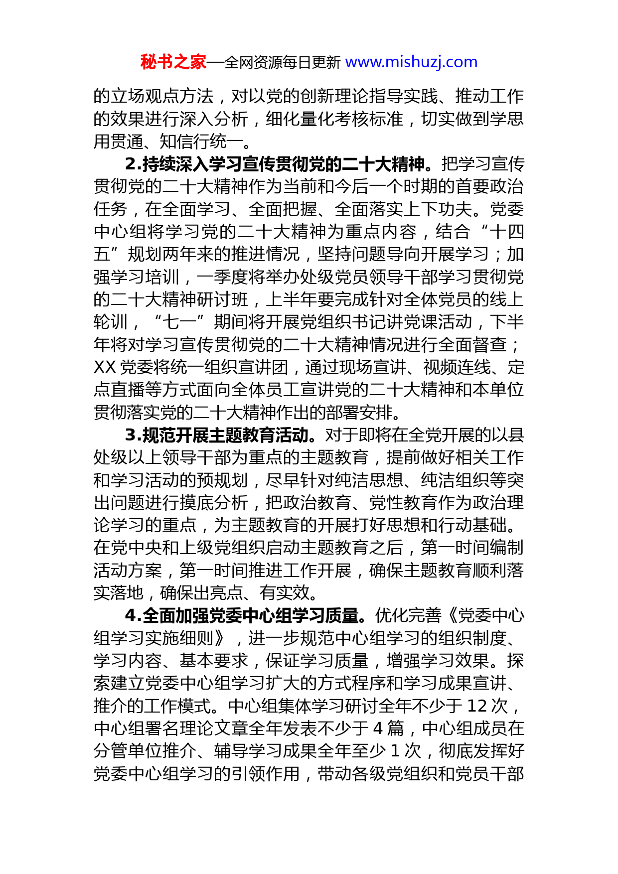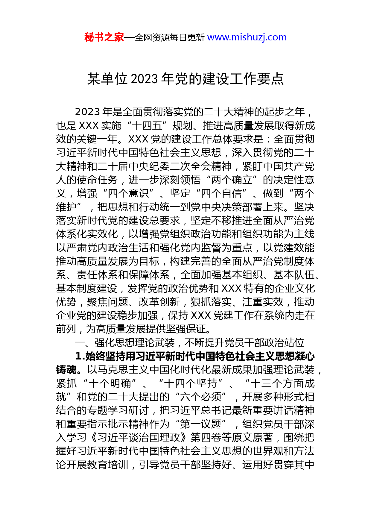 秘书之家—全网资源每日更新www.mishuzj.com某单位2023年党的建设工作要点2023年是全面贯彻落实党的二十大精神的起步之年,也是XXX实施“十四五”规划、推进高质量发展取得新成效的关键一年。XXX党的建设工作总体要求是:全面贯彻习近平新时代中国特色社会主义思想,深入贯彻党的二十大精神和二十届中央纪委二次全会精神,紧盯中国共产党人的使命任务,进一步深刻领悟“两个确立”的决定性意义,增强“四个意识”、坚定“四个自信”、做到“两个维护”,把思想和行动统一到党中央决策部署上来。坚决落实新时代党的建设总要求,坚定不移推进全面从严治党体系化实效化,以增强党组织政治功能和组织功能为主线以严肃党内政治生活和强化党内监督为重点,以党建效能推动高质量发展为目标,构建完善的全面从严治党制度体系、责任体系和保障体系,全面加强基本组织、基本队伍、基本制度建设,发挥党的政治优势和XXX特有的企业文化优势,聚焦问题、改革创新,狠抓落实、注重实效,推动企业党的建设稳步加强,保持XXX党建工作在系统内走在前列,为高质量发展提供坚强保证。一、强化思想理论武装,不断提升党员干部政治站位1.始终坚持用习近平新时代中国特色社会主义思想凝心铸魂。以马克思主义中国化时代化最新成果加强理论武装,紧抓“十个明确”、“十四个坚持”、“十三个方面成就”和党的二十大提出的“六个必须”,开展多种形式相结合的专题学习研讨,把习近平总书记最新重要讲话精神和重要指示批示精神作为“第一议题”,组织党员干部深入学习《习近平谈治国理政》第四卷等原文原著,围绕把握好习近平新时代中国特色社会主义思想的世界观和方法论开展教育培训,引导党员干部坚持好、运用好贯穿其中秘书之家—全网资源每日更新www.mishuzj.com的立场观点方法,对以党的创新理论指导实践、推动工作的效果进行深入分析,细化量化考核标准,切实做到学思用贯通、知信行统一。2.持续深入学习宣传贯彻党的二十大精神。把学习宣传贯彻党的二十大精神作为当前和今后一个时期的首要政治任务,在全面学习、全面把握、全面落实上下功夫。党委中心组将学习党的二十大精神为重点内容,结合“十四五”规划两年来的推进情况,坚持问题导向开展学习;加强学习培训,一季度将举办处级党员领导干部学习贯彻党的二十大精神研讨班,上半年要完成针对全体党员的线上轮训,“七一”期间将开展党组织书记讲党课活动,下半年将对学习宣传贯彻党的二十大精神情况进行全面督查;XX党委将统一组织宣讲团,通过现场宣讲、视频连线、定点直播等方式面向全体员工宣讲党的二十大精神和本单位贯彻落实党的二十大精神作出的部署安排。3.规范开展主题教育活动。对于即将在全党开展的以县处级以上领导干部为重点的主题教育,提前做好相关工作和学习活动的预规划,尽早针对纯洁思想、纯洁组织等突出问题进行摸底分析,把政治教育、党性教育作为政治理论学习的重点,为主题教育的开展打好思想和行动基础。在党中央和上级党组织启动主题教育之后,第一时间编制活动方案,第一时间推进工作开展,确保主题教育顺利落实落地,确保出亮点、有实效。4.全面加强党委中心组学习质量。优化完善《党委中心组学习实施细则》,进一步规范中心组学习的组织制度、学习内容、基本要求,保证学习质量,增强学习效果。探索建立党委中心组学习扩大的方式程序和学习成果宣讲、推介的工作模式。中心组集体学习研讨全年不少于12次,中心组署名理论文章全年发表不少于4篇,中心组成员在分管单位推介、辅导学习成果全年至少1次,彻底发挥好党委中心组学习的引领作用,带动各级党组织和党员干部秘书之家—全网资源每日更新www.mishuzj.com理论学习。二、从严干部管理监督,着力打造忠诚干净担当的领导班子和干部队伍5.坚持高标准选好配强班子。坚决落实新时代好干部标准,大力选拔政治过硬、对党忠诚的干部,业务精通、本领高强的干部,敢于担当、勇于负责的干部,敢于斗争、善于斗争的干部,作风优良、清正廉洁的干部,树立选人用人正确导向,继续完善《关于落实中办《推进干部能上能下规定》的实施办法》,推动形成能者上、优者奖、庸者下、劣者汰的良好局面。加强“一把手”培养锻炼、选拔配备和管理监督工作,培养和掌握一批既会经营、又懂党建的“一把手”后备人才。组织召开培养选拔年轻干部座谈会,印发《关于加强和改进优秀年轻干部培养选拔、加强政治锻炼常态化的实施意见》,掌握一批德才素质好发展潜力大的优秀年轻干部。6.不断加强领导人员管理监督。坚持严的主基调不动摇,从严从实加强对领导班子和领导干部的管理监督,加强政治监督、政治督查,强化年度考核、班子巡察,严格执行领导干部个人有关事项报告制度,起草《关于加强干部全方位管理和经常性监督的意见》,管好关键人、管到关键处、管住关键事,进一步激励干部发扬斗争精神、勇于担当作为。7.推进人才队伍建设整体水平提升。整合人才工作组织领导机构,建立党委统一领导、组织人事部门牵头抓总、各职能部门分工负责的人才工作格局。结合XXXX、XXX等业务发展实际,加快建设专家型人才队伍,落实名匠培育计划,培养造就高端技术技能领军人才