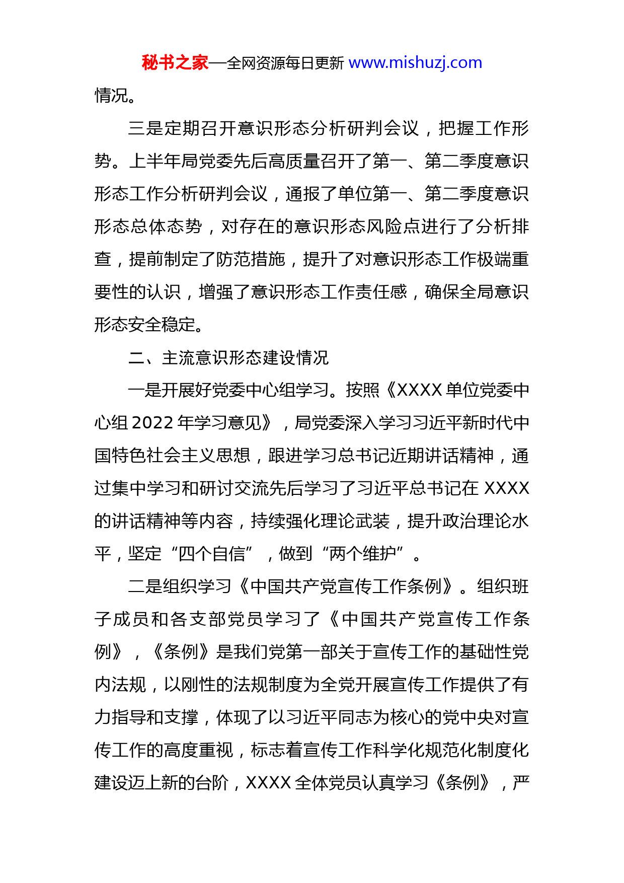 秘书之家—全网资源每日更新www.mishuzj.com某单位意识形态工作开展情况自查报告今年以来,XXXX单位坚持以习近平新时代中国特色社会主义思想为指导,认真贯彻落实市委关于意识形态工作的决策部署,严格落实意识形态工作责任制有关要求,把牢意识形态工作主动权,把牢阵地建设,扎实做好意识形态工作。现汇报如下:一、局党委意识形态工作责任制落实情况一是局党委高度重视,扎实落实党委履行意识形态工作的主体责任。局党委认真贯彻落实党中央和市委关于意识形态工作的决策部署及指示精神,牢牢把握正确政治方向,严守政治纪律和政治规矩,严守组织纪律和宣传纪律,把意识形态工作作为党的建设的重要内容,把意识形态工作同业务工作一同部署、同落实、同检查,同考核。二是局领导班子成员带头落实意识形态工作责任制,形成齐抓共管良好氛围。局党委书记旗帜鲜明地站在意识形态工作第一线,履行“第一责任人”的职责,带头抓意识形态工作,带头管阵地把导向强队伍,带头批评错误观点和错误倾向,以坚定的政治立场指导和督促班子成员抓好意识形态工作,明确工作相关制度,强化班子内部抓意识形态工作的责任意识和使命担当。其他班子成员根据工作分工,履行“一岗双责”,抓职责范围内意识形态工作秘书之家—全网资源每日更新www.mishuzj.com情况。三是定期召开意识形态分析研判会议,把握工作形势。上半年局党委先后高质量召开了第一、第二季度意识形态工作分析研判会议,通报了单位第一、第二季度意识形态总体态势,对存在的意识形态风险点进行了分析排查,提前制定了防范措施,提升了对意识形态工作极端重要性的认识,增强了意识形态工作责任感,确保全局意识形态安全稳定。二、主流意识形态建设情况一是开展好党委中心组学习。按照《XXXX单位党委中心组2022年学习意见》,局党委深入学习习近平新时代中国特色社会主义思想,跟进学习总书记近期讲话精神,通过集中学习和研讨交流先后学习了习近平总书记在XXXX的讲话精神等内容,持续强化理论武装,提升政治理论水平,坚定“四个自信”,做到“两个维护”。二是组织学习《中国共产党宣传工作条例》。组织班子成员和各支部党员学习了《中国共产党宣传工作条例》,《条例》是我们党第一部关于宣传工作的基础性党内法规,以刚性的法规制度为全党开展宣传工作提供了有力指导和支撑,体现了以习近平同志为核心的党中央对宣传工作的高度重视,标志着宣传工作科学化规范化制度化建设迈上新的台阶,XXXX全体党员认真学习《条例》,严秘书之家—全网资源每日更新www.mishuzj.com格遵守政治纪律、工作纪律,把思想和行动统一到党中央决策部署上来,营造良好的工作氛围。三是开展局领导讲党课活动。七一前夕,XXXX单位开展“喜迎二十大·奋进新时代”庆七一活动之局领导讲党课活动。局党委委员、副局长XXXX同志以—《XXXXXX》为题,为全体党员讲了一堂精彩的党课。XXXX局长三个方面讲述了什么是信仰、如何加强信仰建设,进一步引导了全体党员加强信仰建设、增强党性修养,筑牢共产党员的理想信念。四是用好“学习强国”等学习平台。积极动员全体干部职工利用好“学习强国”河南干部网络学院、微信公众号等,学习习近平新时代中国特色社会主义思想、党的十九届六中全会精神、党的创新理论、党章党规党纪和社会主义核心价值观等内容,进一步统一思想,提高认识,形成良好的学习氛围。五是大力弘扬社会主义核心价值观。以全国文明城市创建为抓手,以文明风景旅游区建设为载体,积极培育和践行社会主义核心价值观,开展“社会公德、个人品德”教育宣传讲座、家风主题、诚信教育讲座,在XXXX显著位置更换中国梦、社会主义核心价值观、“讲文明、树新风”的公益广告100余块,开展“微笑服务”主题活动,XXXX工作人员微笑为游客提供优质服务,引导游客文秘书之家—全网资源每日更新www.mishuzj.com明旅游行为,树立“游客为本、服务至诚”的服务理念。利用春节、清明、五一、端午等节假日,组织全体员工开展志愿服务活动,员工积极开展疫情防控、卫生维护、车辆引导、商户管理、游乐设施安全运行等方面的志愿服务活动,用优质的服务为游客营造“安全、有序、欢乐”的游园环境,以实际行动,大力弘扬社会主义核心价值观。三、意识形态风险防范化解情况一是严格管理XXXX意识形态主阵地。深入学习领会和宣传党的路线方针政策、大力弘扬社会主义核心价值观,坚决守好主阵地,坚持正面宣传,及时把握XXXX干部职工的思想动态。积极利用XXXX微信群、微信公众号、XXXX网站等,大力宣传主流媒体,发挥正能量,在干部职工中形成良好的价值导向。二是强化网络阵地管理。加强网站、微信公众号等网络平台建设、管理,严格落实信息发布审核制度。强化网络舆情引导,把好舆情搜索、研判处置和舆论引导重要关口,及时捕捉可能影响稳定的预警性、苗头性言论动向,排查安全隐患,旗帜鲜明开展网上意识形态斗争。开展文明上网活动,宣传文明上网、安全用网等文明理念,号召XXXX干部职工自觉抵制网络有害信息,养成良好上网习惯,共建风清气正的网络空间。三是加强舆论引导。用主流的思想占领网络阵地,加秘书之家—全网资源每日更新www.mishuzj.com强正面引导,积极
