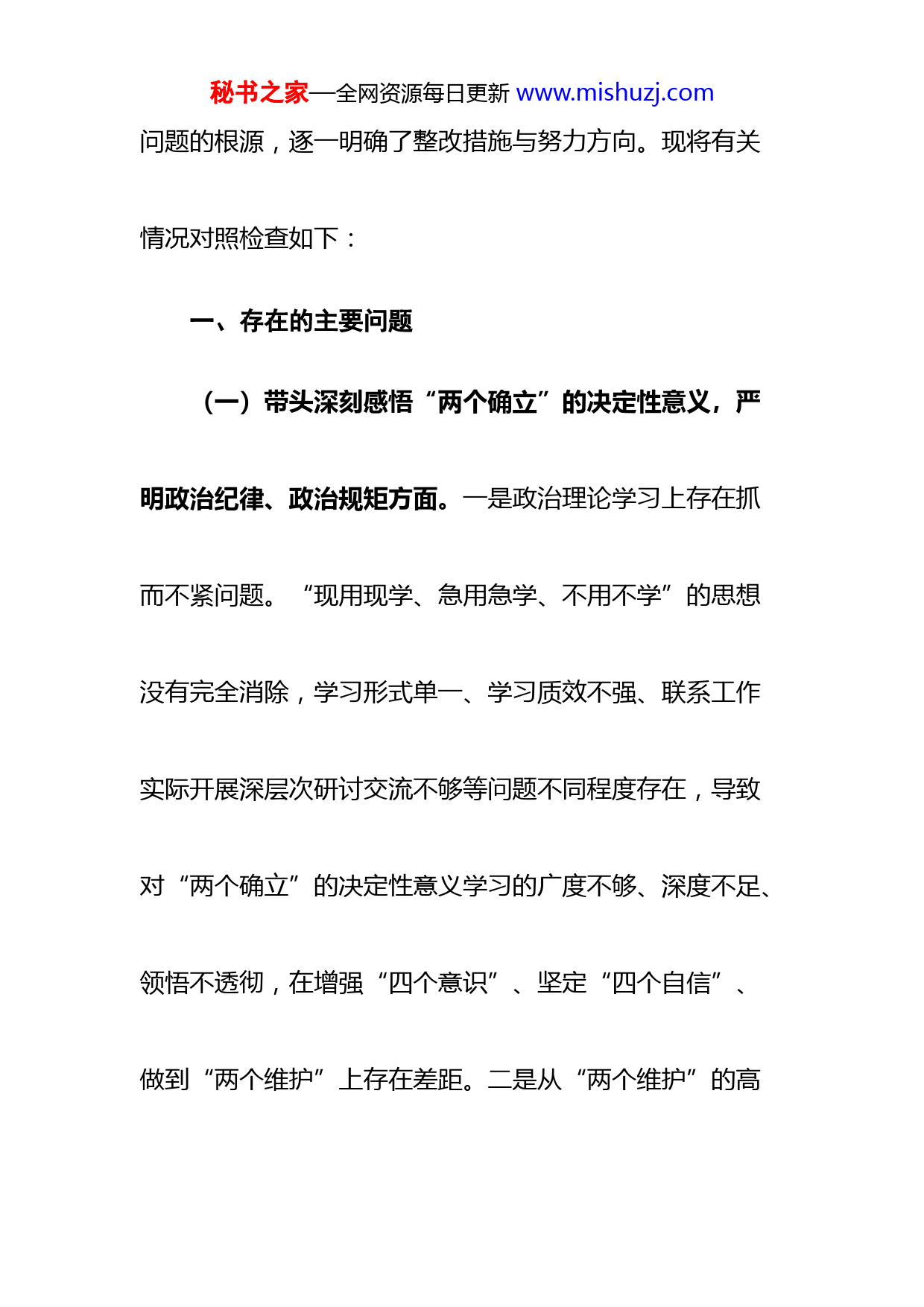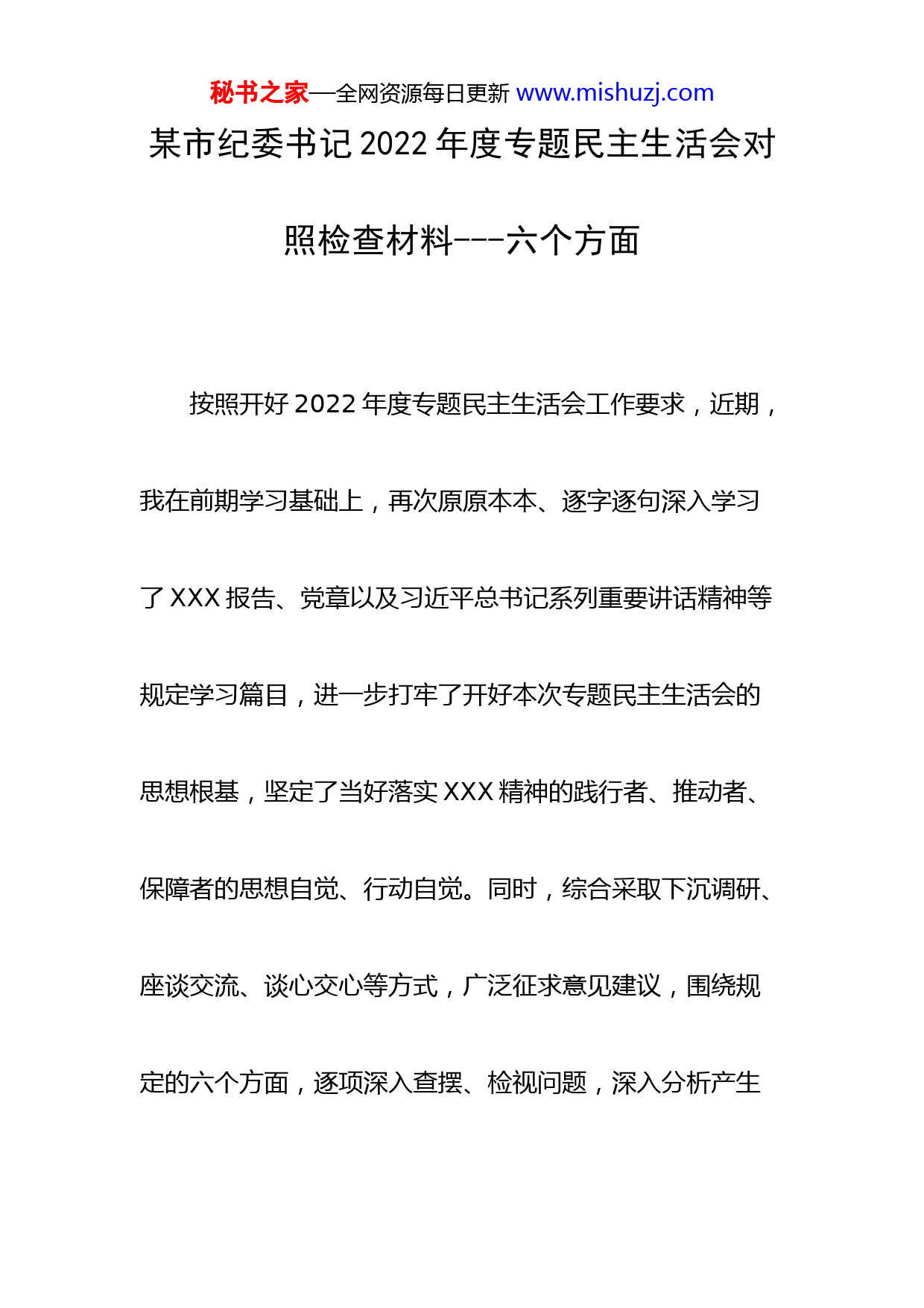 秘书之家—全网资源每日更新www.mishuzj.com某市纪委书记2022年度专题民主生活会对照检查材料---六个方面按照开好2022年度专题民主生活会工作要求,近期,我在前期学习基础上,再次原原本本、逐字逐句深入学习了XXX报告、党章以及习近平总书记系列重要讲话精神等规定学习篇目,进一步打牢了开好本次专题民主生活会的思想根基,坚定了当好落实XXX精神的践行者、推动者、保障者的思想自觉、行动自觉。同时,综合采取下沉调研、座谈交流、谈心交心等方式,广泛征求意见建议,围绕规定的六个方面,逐项深入查摆、检视问题,深入分析产生秘书之家—全网资源每日更新www.mishuzj.com问题的根源,逐一明确了整改措施与努力方向。现将有关情况对照检查如下:一、存在的主要问题(一)带头深刻感悟“两个确立”的决定性意义,严明政治纪律、政治规矩方面。一是政治理论学习上存在抓而不紧问题。“现用现学、急用急学、不用不学”的思想没有完全消除,学习形式单一、学习质效不强、联系工作实际开展深层次研讨交流不够等问题不同程度存在,导致对“两个确立”的决定性意义学习的广度不够、深度不足、领悟不透彻,在增强“四个意识”、坚定“四个自信”、做到“两个维护”上存在差距。二是从“两个维护”的高秘书之家—全网资源每日更新www.mishuzj.com度来审视和推进纪检监察工作的政治自觉、思想自觉和行动自觉有待进一步增强。受限于政治理论素养先天不足,导致自身在政治判断力、政治领悟力、政治执行力上存在差距,在面临新要求新挑战时,对新形势的研判不足,推动工作思路不开阔,方向不精准,明显缺乏系统思维、全周期管理理念。三是在严明政治纪律政治规矩上还有不足。履行监督执纪问责、监督调查处置职能时从政治的高度思考、处理问题不够。比如:在审查调查工作中,更多精力用在了查处违反纪律和职务违法、职务犯罪上,案件查办上没有先从政治上来审视问题,2022年,全市仅查处XX起违反政治纪律政治规矩案件,且主要集中在党员信教、秘书之家—全网资源每日更新www.mishuzj.com对抗组织审查等问题,反映出在查处违反政治纪律政治规矩问题上用力不足、指导不够、效果不彰。(二)在带头用习近平新时代中国特色社会主义思想凝心铸魂方面。一是对习近平新时代中国特色社会主义思想“常学常新”“真信真用”不深不透,多是满足于完成“规定动作”,结合新时期纪检监察工作实际创新学习方式少,对新的历史条件下管党治党、改革发展的重要理论、重大部署被动传达学习多,主动研究思考少,在学思践悟、融会贯通上存在差距。二是学思用、知信行还未真正统一。主动运用习近平新时代中国特色社会主义思想中蕴含的立场观点方法指导纪检监察工作不够到位,学习成效没能及秘书之家—全网资源每日更新www.mishuzj.com时转化为解决实际问题的有效办法和务实举措,开展工作时有时仍存在依赖老经验、老办法问题,以创新思维推进工作、解决问题方法不多,用新思想新理念推动纪检监察工作高质量发展的本领不足。比如,在市委开展的2022年度改革创新优秀课题评选中,纪检监察系统课题没有一例入选,说明以新理念创新推动工作的意识和能力还需增强,改革创新的先导、突破、创立作用发挥仍需强化。(三)带头坚持和加强党的全面领导方面。一是贯彻民主集中制还不够坚决到位。对一些“三重一大”事项特别是小额政府采购事项,有时觉得额度较少,待上常委会研究后再实施影响工作进度,存在补签会议纪要的情况。秘书之家—全网资源每日更新www.mishuzj.com同时,以普通党员身份参加党内组织生活不够及时经常,批评与自我批评武器运用不到位,在民主生活会或组织生活会上,有时顾面子、讲人情,侧重于自我批评,对他人批评力度不足,在“红红脸、出出汗”方面还需要加强。二是推动机关党建工作落实不够细致精准。对做好新形势下机关党建工作,结合纪检监察工作实际,深入系统研究不够,探索新方法、新举措不多,在开展工作时思路不新、方法不优,工作成效不够明显,基层党组织的战斗堡垒作用尚未有效发挥,在夯实党执政根基上用力不足。同时,临时党支部工作开展制度不够健全完善,个别临时党支部组织生活不够规范,党支部的战斗堡垒作用发挥的还不够秘书之家—全网资源每日更新www.mishuzj.com充分。三是机关内部管党治党主体责任夯实还不够有力。对系统内党员干部的思想政治教育抓得还不够紧不够实,谈心谈话质量不高,咬耳扯袖不够及时经常,日常监督管理质量还需提高,特别是对一些抽调外出的专案组、巡察组干部,有效的监督手段不多,还没有真正做到抓早抓小、动辄则咎,导致一些突出问题发现不及时,督促整改不到位。(四)带头践行以人民为中心的发展思想方面。一是还没有真正将人民至上的工作理念贯穿纪检监察工作始终。2022年以来,虽然通过“小切口”推动“大治理”的方式持续整治群众身边腐败和作风问题,严肃查处并通报曝光秘书之家—全网资源每日更新www.mishuzj.com了一批典型案例,形成强大震慑,但是专项治理的深度、力度还不够,主动发现啃食群众获得感和满意度的方式方法不够丰富、精准度不高,长效化、常态化、制度化的制度机制没有真正建立,导致在乡村振兴、农村“三资”管理等一些重
