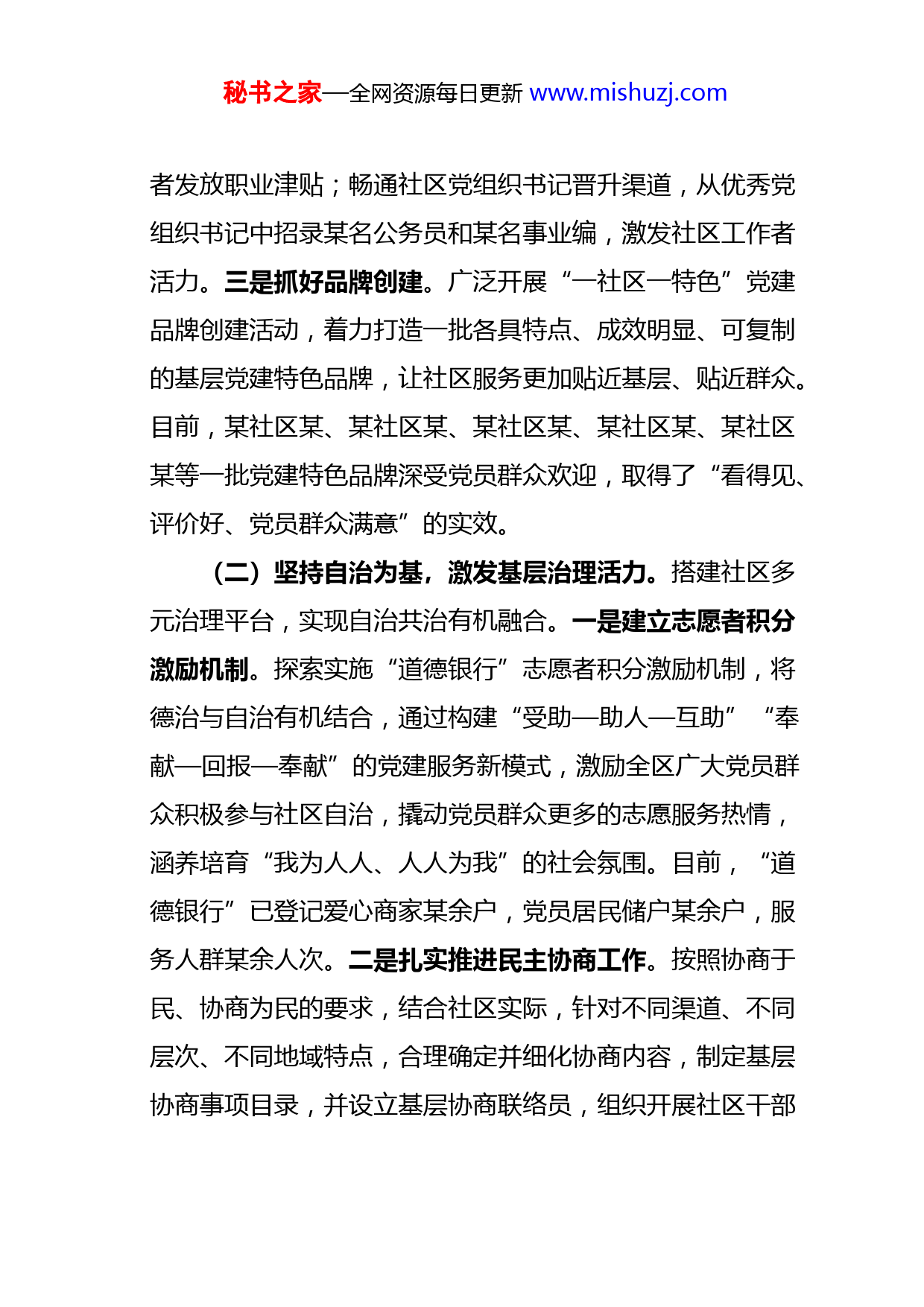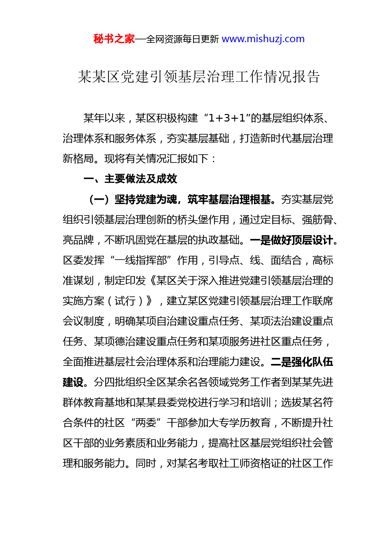 秘书之家—全网资源每日更新www.mishuzj.com某某区党建引领基层治理工作情况报告某年以来,某区积极构建“1+3+1”的基层组织体系、治理体系和服务体系,夯实基层基础,打造新时代基层治理新格局。现将有关情况汇报如下:一、主要做法及成效(一)坚持党建为魂,筑牢基层治理根基。夯实基层党组织引领基层治理创新的桥头堡作用,通过定目标、强筋骨、亮品牌,不断巩固党在基层的执政基础。一是做好顶层设计。区委发挥“一线指挥部”作用,引导点、线、面结合,高标准谋划,制定印发《某区关于深入推进党建引领基层治理的实施方案(试行)》,建立某区党建引领基层治理工作联席会议制度,明确某项自治建设重点任务、某项法治建设重点任务、某项德治建设重点任务和某项服务进社区重点任务,全面推进基层社会治理体系和治理能力建设。二是强化队伍建设。分四批组织全区某余名各领域党务工作者到某某先进群体教育基地和某某县委党校进行学习和培训;选拔某名符合条件的社区“两委”干部参加大专学历教育,不断提升社区干部的业务素质和业务能力,提高社区基层党组织社会管理和服务能力。同时,对某名考取社工师资格证的社区工作秘书之家—全网资源每日更新www.mishuzj.com者发放职业津贴;畅通社区党组织书记晋升渠道,从优秀党组织书记中招录某名公务员和某名事业编,激发社区工作者活力。三是抓好品牌创建。广泛开展“一社区一特色”党建品牌创建活动,着力打造一批各具特点、成效明显、可复制的基层党建特色品牌,让社区服务更加贴近基层、贴近群众。目前,某社区某、某社区某、某社区某、某社区某、某社区某等一批党建特色品牌深受党员群众欢迎,取得了“看得见、评价好、党员群众满意”的实效。(二)坚持自治为基,激发基层治理活力。搭建社区多元治理平台,实现自治共治有机融合。一是建立志愿者积分激励机制。探索实施“道德银行”志愿者积分激励机制,将德治与自治有机结合,通过构建“受助—助人—互助”“奉献—回报—奉献”的党建服务新模式,激励全区广大党员群众积极参与社区自治,撬动党员群众更多的志愿服务热情,涵养培育“我为人人、人人为我”的社会氛围。目前,“道德银行”已登记爱心商家某余户,党员居民储户某余户,服务人群某余人次。二是扎实推进民主协商工作。按照协商于民、协商为民的要求,结合社区实际,针对不同渠道、不同层次、不同地域特点,合理确定并细化协商内容,制定基层协商事项目录,并设立基层协商联络员,组织开展社区干部秘书之家—全网资源每日更新www.mishuzj.com和社区工作者基层协商专题培训,提高组织开展协商工作的能力和水平。截至目前,已有某个社区制定协商目录,某个社区设立协商联络员,共开展社区协商某余场,形成协商成果某个。三是构建区域化党建格局。坚持和完善社区区域化党建联席会议制度,积极吸纳发展优秀的驻区单位党员、非公企业党支部书记、热心社会工作者和社会组织负责人担任区域党(工)委兼职委员,共同讨论决定辖区内重大问题。目前,全区某个街道和某个社区均已建立“区域党(工)委”,参与共驻共建党组织某个,协调解决问题某余项。(三)坚持法治为纲,强化基层治理保障。发挥法治护航作用,推动社区治理有序运行。一是完善矛盾纠纷多元化解机制。以网格化管理为依托,搭建矛盾纠纷多元化解指挥中心,采用“互联网+大调解”的工作模式,运用“网格+调解”、“政府+民间”、“行业+专业”等矛盾纠纷多元排查调处手段,不断满足人民群众对多元化解矛盾纠纷的需求。截至目前,共排查纠纷某件,化解办结案件某件,矛盾调处化解率达某%。二是扎实推进“雪亮工程”建设。投资某万元,完成了对区级视频监控中心的数字化系统升级,加强了人脸识别、智能巡屏等信息化技术的升级改造,实现社会法治治理智能化。目前,辖区一类联网已完成某路,二类秘书之家—全网资源每日更新www.mishuzj.com网络已完成某个单位某路联网,辖区商业中心、医院等人员密集场所的社会监控资源已接入区级视频监控中心。三是稳步开展“四官服务进社区”。组建某支四官服务队,深入社区开展矛盾调解、法律咨询、普法宣传等,将矛盾纠纷化解在源头、解决在基层,筑牢预防化解矛盾纠纷“前沿阵地”。截至目前,共组织警民恳谈会某余场,开展法律咨询某余场,服务居民某余人次,化解矛盾纠纷某余起。(四)坚持德治为先,培树基层治理新风。传承红色基因,实现红色教育正心、道德教化润心、文化服务暖心。一是开展党建创新提升活动。持续推进党建创新提升活动,开展“某精神大讨论”“我身边的优秀共产党员大家谈”“寻找某式好党员、好干部”等活动,挖掘各行各业优秀共产党员,选树“道德榜样”某名,让广大党员干部学有榜样、行有示范。同时,拍摄《某某》《某某》等某部微视频,目前全网点击播放量已超某万次,在全区范围内掀起了传承弘扬某精神的热潮。二是积极弘扬“德治”新风。推进“党的创新理论万场宣讲进基层”活动,开展理论宣讲活动某余场,受众某余人;建成新时代文明实践中心某个、新时代文明实践所某个、新时代文明实践站某个,组建了某支某区“新时代文明实践中心”教师志愿服务队伍,举办各类实践活动某秘书之家—全