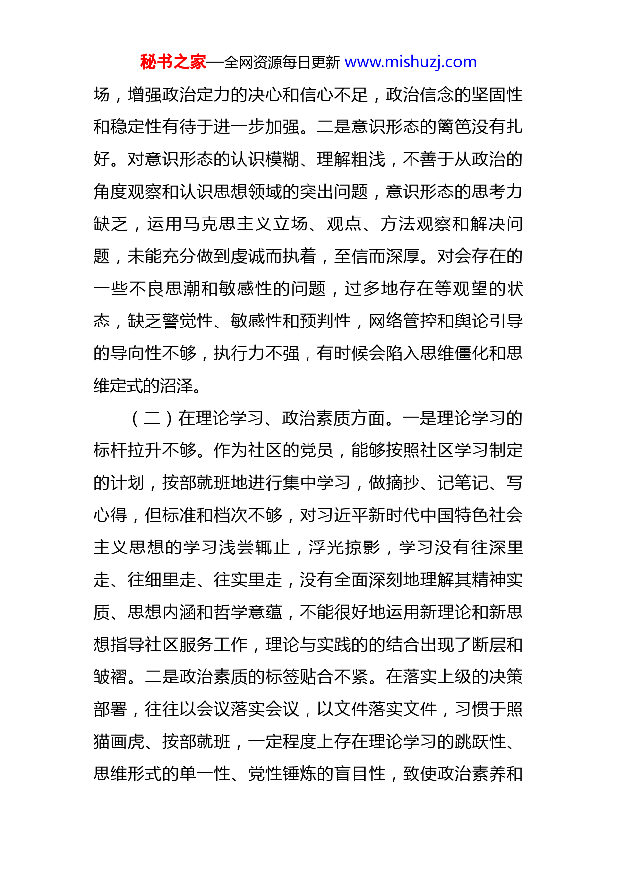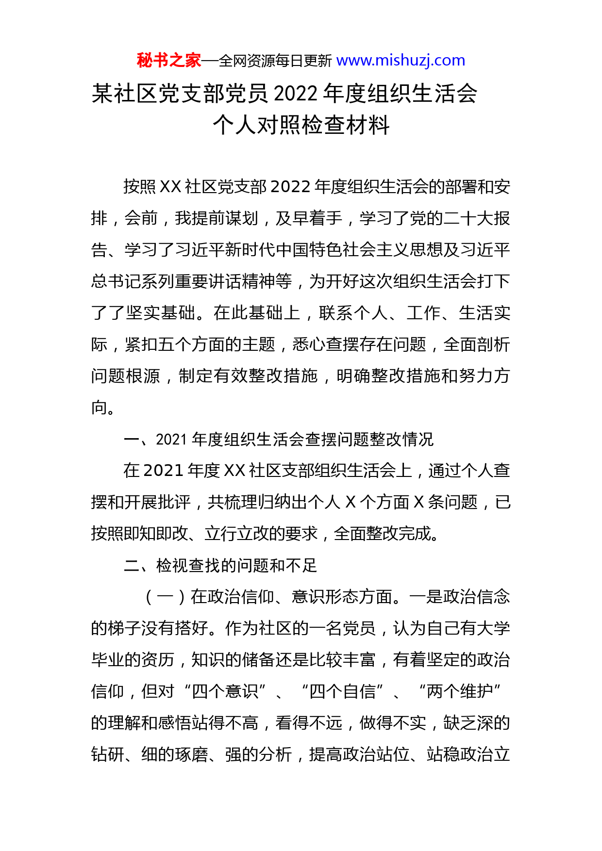 秘书之家—全网资源每日更新www.mishuzj.com某社区党支部党员2022年度组织生活会个人对照检查材料按照XX社区党支部2022年度组织生活会的部署和安排,会前,我提前谋划,及早着手,学习了党的二十大报告、学习了习近平新时代中国特色社会主义思想及习近平总书记系列重要讲话精神等,为开好这次组织生活会打下了了坚实基础。在此基础上,联系个人、工作、生活实际,紧扣五个方面的主题,悉心查摆存在问题,全面剖析问题根源,制定有效整改措施,明确整改措施和努力方向。一、2021年度组织生活会查摆问题整改情况在2021年度XX社区支部组织生活会上,通过个人查摆和开展批评,共梳理归纳出个人X个方面X条问题,已按照即知即改、立行立改的要求,全面整改完成。二、检视查找的问题和不足(一)在政治信仰、意识形态方面。一是政治信念的梯子没有搭好。作为社区的一名党员,认为自己有大学毕业的资历,知识的储备还是比较丰富,有着坚定的政治信仰,但对“四个意识”、“四个自信”、“两个维护”的理解和感悟站得不高,看得不远,做得不实,缺乏深的钻研、细的琢磨、强的分析,提高政治站位、站稳政治立秘书之家—全网资源每日更新www.mishuzj.com场,增强政治定力的决心和信心不足,政治信念的坚固性和稳定性有待于进一步加强。二是意识形态的篱笆没有扎好。对意识形态的认识模糊、理解粗浅,不善于从政治的角度观察和认识思想领域的突出问题,意识形态的思考力缺乏,运用马克思主义立场、观点、方法观察和解决问题,未能充分做到虔诚而执着,至信而深厚。对会存在的一些不良思潮和敏感性的问题,过多地存在等观望的状态,缺乏警觉性、敏感性和预判性,网络管控和舆论引导的导向性不够,执行力不强,有时候会陷入思维僵化和思维定式的沼泽。(二)在理论学习、政治素质方面。一是理论学习的标杆拉升不够。作为社区的党员,能够按照社区学习制定的计划,按部就班地进行集中学习,做摘抄、记笔记、写心得,但标准和档次不够,对习近平新时代中国特色社会主义思想的学习浅尝辄止,浮光掠影,学习没有往深里走、往细里走、往实里走,没有全面深刻地理解其精神实质、思想内涵和哲学意蕴,不能很好地运用新理论和新思想指导社区服务工作,理论与实践的的结合出现了断层和皱褶。二是政治素质的标签贴合不紧。在落实上级的决策部署,往往以会议落实会议,以文件落实文件,习惯于照猫画虎、按部就班,一定程度上存在理论学习的跳跃性、思维形式的单一性、党性锤炼的盲目性,致使政治素养和秘书之家—全网资源每日更新www.mishuzj.com政治素质的提升速度缓慢,提升质量较低,提升档次不够,运用理论知识和惠民政策,指导社区便民服务存在差距,提升政治素养,履行岗位职责、主动担当作为的能力有待于进一步加强。(三)在党员意识、作用发挥方面。一是党员的意识不突出。虽然能够认识到自己是一名光荣的党员,在别人面前由衷迸发出别样的自豪感和荣耀感,但扪心自问,真正按照党员的标准为辖区居民群众提供便利和服务,存在着短板和差距。参加党的组织生活会和主题党日活动被动性强,贯彻落实“三会一课”标准不高、要求不严、力度不大,存在开小差、走形式、下跳棋的倾向。比如:结合“我为群众办实事”实践活动,主动深入群众,察民情、解民忧、纾民怨较少,主动破解居民群众提出的急难愁盼问题少之又少,思考谋划措施不够,措施运行不畅,甚至有畏难情绪和推诿扯皮的现象。二是党员的表率作用不突出。作为一名社区的党员,不能时时刻刻以党员的标准和要求,规范自己的言行,为民服务的宗旨意识淡化。党员的示范引领和模范带头作用不够突出,以榜样和典范为标杆,继承党的优良传统,发扬乐于奉献的精神不足,缺乏比学赶超、争先进位的闯劲和拼劲,关键时刻掉链子,危急时刻不敢冲,缺少履职担当,奋发有为的魄力和勇气。(四)在能力本领、履职尽责方面。一是能力本领需秘书之家—全网资源每日更新www.mishuzj.com要进一步锤炼和打造。对于如何开展新常态、新形势下的社区各项服务工作,心理没有一盘棋的思想,思考谋划不到位、分析研判不到位、措施运行不到位。面对棘手和难以破解的问题,经常处于心动而无行动的状态,不愿大胆地尝试,出实招、出硬招、出新招的意识不够,喜欢袖手旁观,当“吃瓜群众”。主动解决问题,犹如丈二和尚摸不着头脑,动作不利索、解决不及时、效率不够高,显得手忙脚乱和素手无策,明显地存在本领恐慌和能力恐慌,打破瓶颈、破解难题、强化服务的能力急需要进一步提高。二是履职担当需要进一步强化和加压。在履行工作责任和推进工作落实上,虽然能够做到尽职尽责,扎实敬业,但工作的责任感和使命感不强,想着尽快完成领导交办的任务,往往一味地追求速度,忽视质量,存在明显的过关思想,工作上按部就班、求稳保底,不愿在完成任务的基础上,发挥自己的优势和潜力,创造性地开展工作,没有站在新时代的背景下思考问题和解决问题,喜欢用老思想、老套路、老办法,持续提标、提压、提升不够,缺乏动真碰硬、亮剑争锋、刮骨疗毒的精神。(五)在纪律作风、廉洁自律方面。一是纪律作风不够扎实。虽然能够遵守各项纪律规定,但执行过程中没有起到很好的作用,纪律管束执行不够到位,缺乏严