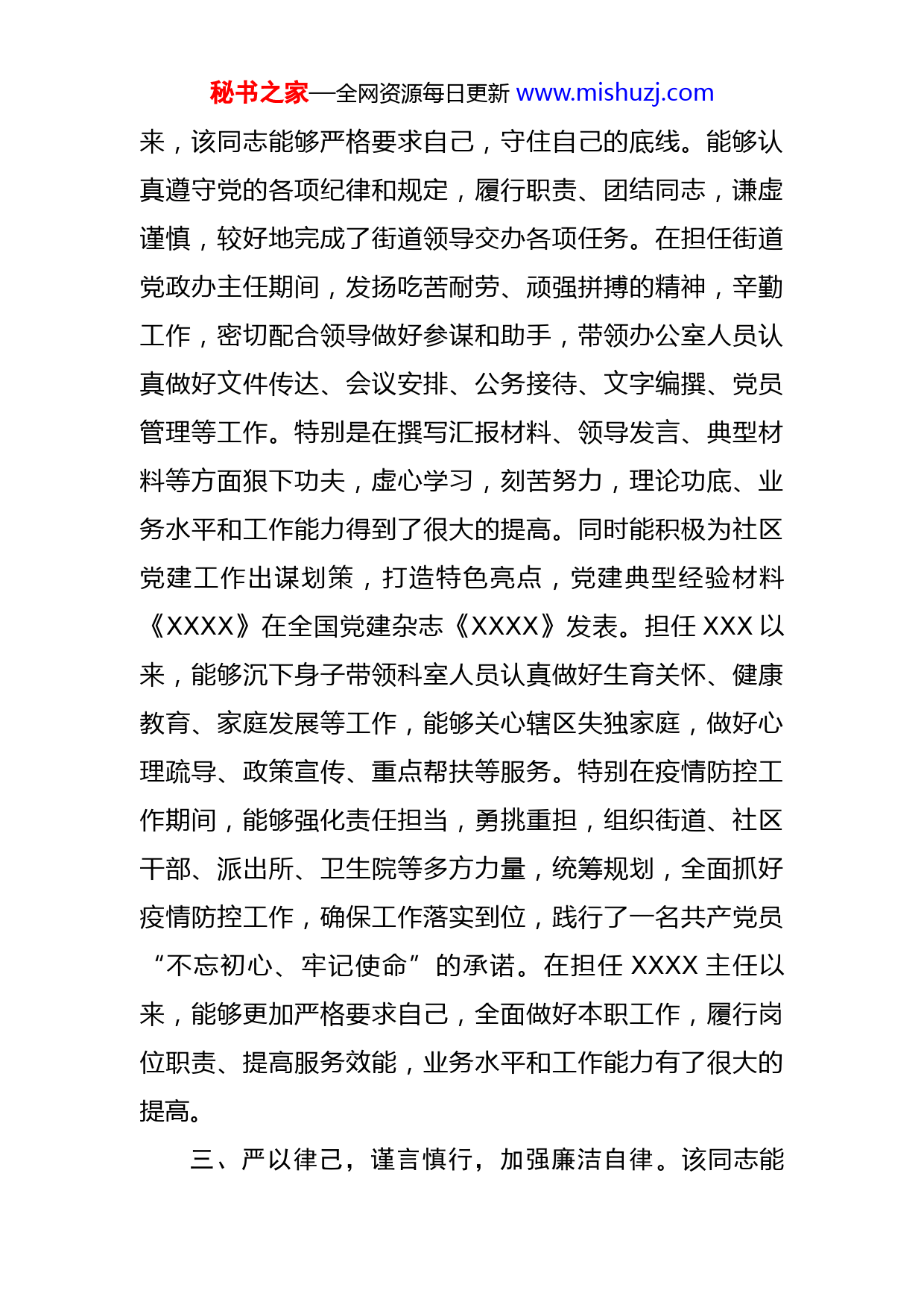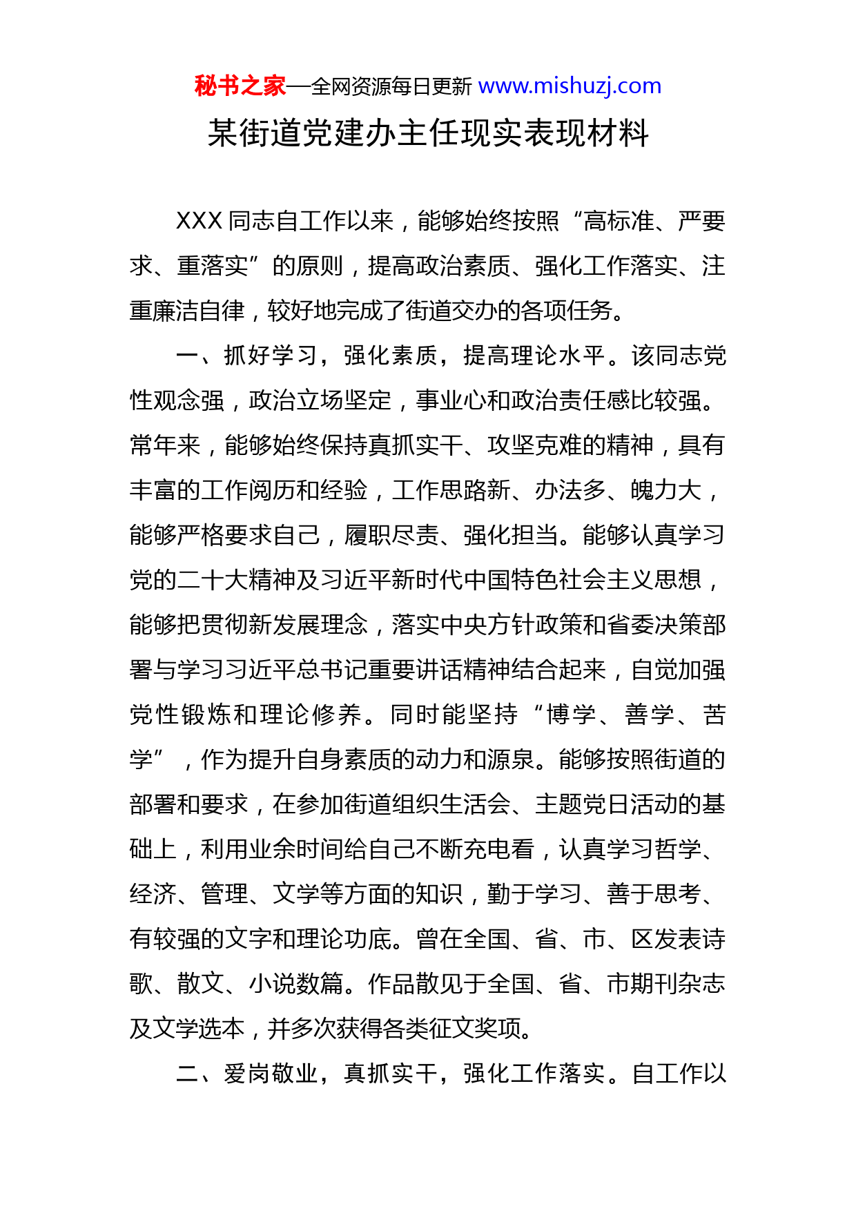 秘书之家—全网资源每日更新www.mishuzj.com某街道党建办主任现实表现材料XXX同志自工作以来,能够始终按照“高标准、严要求、重落实”的原则,提高政治素质、强化工作落实、注重廉洁自律,较好地完成了街道交办的各项任务。一、抓好学习,强化素质,提高理论水平。该同志党性观念强,政治立场坚定,事业心和政治责任感比较强。常年来,能够始终保持真抓实干、攻坚克难的精神,具有丰富的工作阅历和经验,工作思路新、办法多、魄力大,能够严格要求自己,履职尽责、强化担当。能够认真学习党的二十大精神及习近平新时代中国特色社会主义思想,能够把贯彻新发展理念,落实中央方针政策和省委决策部署与学习习近平总书记重要讲话精神结合起来,自觉加强党性锻炼和理论修养。同时能坚持“博学、善学、苦学”,作为提升自身素质的动力和源泉。能够按照街道的部署和要求,在参加街道组织生活会、主题党日活动的基础上,利用业余时间给自己不断充电看,认真学习哲学、经济、管理、文学等方面的知识,勤于学习、善于思考、有较强的文字和理论功底。曾在全国、省、市、区发表诗歌、散文、小说数篇。作品散见于全国、省、市期刊杂志及文学选本,并多次获得各类征文奖项。二、爱岗敬业,真抓实干,强化工作落实。自工作以秘书之家—全网资源每日更新www.mishuzj.com来,该同志能够严格要求自己,守住自己的底线。能够认真遵守党的各项纪律和规定,履行职责、团结同志,谦虚谨慎,较好地完成了街道领导交办各项任务。在担任街道党政办主任期间,发扬吃苦耐劳、顽强拼搏的精神,辛勤工作,密切配合领导做好参谋和助手,带领办公室人员认真做好文件传达、会议安排、公务接待、文字编撰、党员管理等工作。特别是在撰写汇报材料、领导发言、典型材料等方面狠下功夫,虚心学习,刻苦努力,理论功底、业务水平和工作能力得到了很大的提高。同时能积极为社区党建工作出谋划策,打造特色亮点,党建典型经验材料《XXXX》在全国党建杂志《XXXX》发表。担任XXX以来,能够沉下身子带领科室人员认真做好生育关怀、健康教育、家庭发展等工作,能够关心辖区失独家庭,做好心理疏导、政策宣传、重点帮扶等服务。特别在疫情防控工作期间,能够强化责任担当,勇挑重担,组织街道、社区干部、派出所、卫生院等多方力量,统筹规划,全面抓好疫情防控工作,确保工作落实到位,践行了一名共产党员“不忘初心、牢记使命”的承诺。在担任XXXX主任以来,能够更加严格要求自己,全面做好本职工作,履行岗位职责、提高服务效能,业务水平和工作能力有了很大的提高。三、严以律己,谨言慎行,加强廉洁自律。该同志能秘书之家—全网资源每日更新www.mishuzj.com够筑牢对党忠诚的理念,严格遵守党的各项纪律和规定,团结同志、谦虚谨慎、待人热情、乐于助人,自觉维护自身形象,自觉接受组织和群众监督,自觉抵制各种不正之风,不信歪理学说,不信各种教派,不涉黑涉恶。能够结合“我为群众办实事”实践活动,深刻检视自身存在的问题和不足,以刀刃向内的勇气,及时查摆工作中遇到的问题,强化整改措施、补齐短板弱项,着力在思想觉悟、能力素质、道德修养、家风建设、作风形象上找差距、促整改,强落实;能够发挥党员模范带头作用,踏实敬业、务实高效,努力为辖区居民做好政策宣传、帮扶救助等工作,争做信念坚定、为民服务、勤政务实、敢于担当、清正廉洁的好干部。四、找准差距,弥补短板,提高整体素质。在推进理论学习中,学习在前、思考在前、建议在前、行动在前的标准立得不高,统筹抓好街道服务工作,缺乏思考谋划,工作务实不够,工作激情不浓,缺乏攻坚克难和突破创新的精神,离“高、精、尖”标准还有一定的差距。今后要自觉把精益求精作为工作的终身追求,履行岗位职责、强化责任担当、发挥先锋引领。面对发展中遇到的难点问题、主要矛盾,能够发扬攻坚克难、披荆斩棘、动真碰硬的精神,力求做到细致、精致、极致,确保街道各项工作取得实实在在的成效。