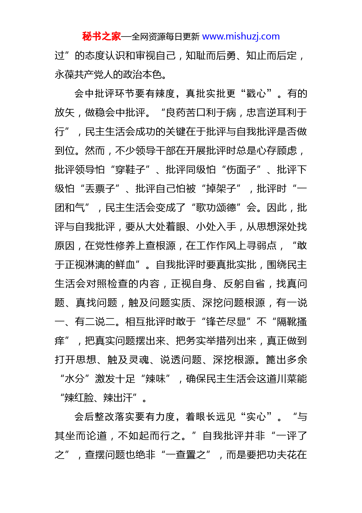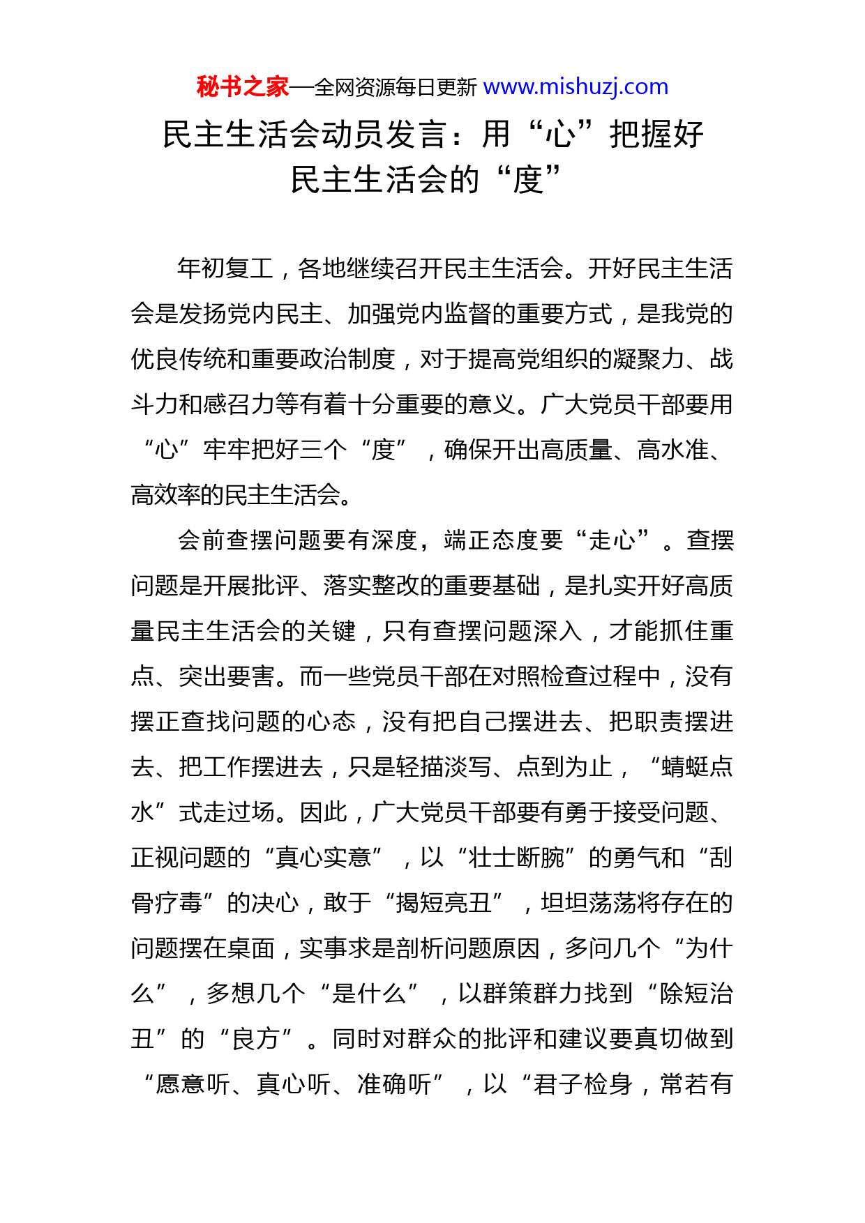 秘书之家—全网资源每日更新www.mishuzj.com民主生活会动员发言:用“心”把握好民主生活会的“度”年初复工,各地继续召开民主生活会。开好民主生活会是发扬党内民主、加强党内监督的重要方式,是我党的优良传统和重要政治制度,对于提高党组织的凝聚力、战斗力和感召力等有着十分重要的意义。广大党员干部要用“心”牢牢把好三个“度”,确保开出高质量、高水准、高效率的民主生活会。会前查摆问题要有深度,端正态度要“走心”。查摆问题是开展批评、落实整改的重要基础,是扎实开好高质量民主生活会的关键,只有查摆问题深入,才能抓住重点、突出要害。而一些党员干部在对照检查过程中,没有摆正查找问题的心态,没有把自己摆进去、把职责摆进去、把工作摆进去,只是轻描淡写、点到为止,“蜻蜓点水”式走过场。因此,广大党员干部要有勇于接受问题、正视问题的“真心实意”,以“壮士断腕”的勇气和“刮骨疗毒”的决心,敢于“揭短亮丑”,坦坦荡荡将存在的问题摆在桌面,实事求是剖析问题原因,多问几个“为什么”,多想几个“是什么”,以群策群力找到“除短治丑”的“良方”。同时对群众的批评和建议要真切做到“愿意听、真心听、准确听”,以“君子检身,常若有秘书之家—全网资源每日更新www.mishuzj.com过”的态度认识和审视自己,知耻而后勇、知止而后定,永葆共产党人的政治本色。会中批评环节要有辣度,真批实批更“戳心”。有的放矢,做稳会中批评。“良药苦口利于病,忠言逆耳利于行”,民主生活会成功的关键在于批评与自我批评是否做到位。然而,不少领导干部在开展批评时总是心存顾虑,批评领导怕“穿鞋子”、批评同级怕“伤面子”、批评下级怕“丢票子”、批评自己怕被“掉架子”,批评时“一团和气”,民主生活会变成了“歌功颂德”会。因此,批评与自我批评,要从大处着眼、小处入手,从思想深处找原因,在党性修养上查根源,在工作作风上寻弱点,“敢于正视淋漓的鲜血”。自我批评时要真批实批,围绕民主生活会对照检查的内容,正视自身、反躬自省,找真问题、真找问题,触及问题实质、深挖问题根源,有一说一、有二说二。相互批评时敢于“锋芒尽显”不“隔靴搔痒”,把真实问题摆出来、把务实举措列出来,真正做到打开思想、触及灵魂、说透问题、深挖根源。篦出多余“水分”激发十足“辣味”,确保民主生活会这道川菜能“辣红脸、辣出汗”。会后整改落实要有力度,着眼长远见“实心”。“与其坐而论道,不如起而行之。”自我批评并非“一评了之”,查摆问题也绝非“一查置之”,而是要把功夫花在秘书之家—全网资源每日更新www.mishuzj.com整改落实上,用干货满满的“成绩单”让组织检验、让人民阅卷,用科学有效的“规划图”为事业助力、为大局服务。要把问题找出来,把整改措施落实到位,要以高标准、严要求逐条逐项落实各项整改任务为实效,扎实做好整改“后半篇文章”。对于能力范围内可以整改的问题,要制定整改清单,将任务落实到个人,立行立改,同时畅通监督渠道,让人民充分行使监督权力;对于暂时无法彻底解决的问题,要限定整改期限,边学边改,一点一点学,一步一步改,坚决不观望、不敷衍、不推诿,切实让人民群众看到民主生活会的执行能力,看到整改诚意和整改实效。同时,对于整改落实过程中好的办法和形式,要形成制度固定下来,久久为功、长期坚持,确保民主生活会开出实效,看到成效。