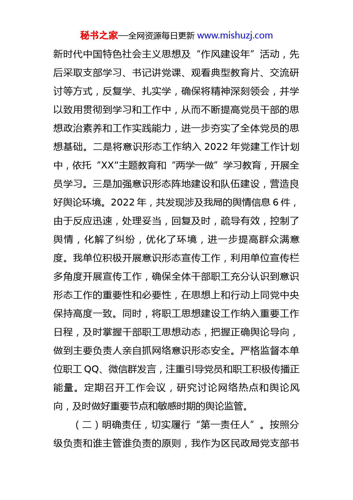 秘书之家—全网资源每日更新www.mishuzj.com民政局落实意识形态工作责任制述职报告2022年,本人深入学习贯彻习近平新时代中国特色社会主义思想和党的十九届六中全会、党的XX大精神,贯彻落实《中国共产党宣传工作条例》《党委(党组)意识形态工作责任制实施办法》,认真履行党支部书记落实意识形态工作第一责任人职责,有效促进了民政局各项工作的开展。现将本人2022年度落实意识形态工作责任制情况述职如下:一、履职工作特色和亮点(一)认真履行职责,不断提高领导能力。作为区民政局党支部书记,我对意识形态工作高度重视,充分发挥职能作用和党员示范带头作用。一是狠抓理论武装,凝集思想共识。在局党支部党课会议上和“学习强国”学习平台深入学习党的十九届六中全会、党的XX大精神,将中央、XX省委、市委和区委有关宣传思想和意识形态工作的重要指示精神、重大决策部署作为干部年度学习重要内容。重点领会党中央治国理政的新理念、新思想、新战略,不断健全支部政治理论学习制度,切实抓好支部党员的学习,将意识形态列入每月的党课常态化学习,开展了中国特色社会主义理论体系、社会主义核心价值体系、党性党风党纪的教育培训。尤其针对党的XX大精神和习近平秘书之家—全网资源每日更新www.mishuzj.com新时代中国特色社会主义思想及“作风建设年”活动,先后采取支部学习、书记讲党课、观看典型教育片、交流研讨等方式,反复学、扎实学,确保将精神深刻领会,并学以致用贯彻到学习和工作中,从而不断提高党员干部的思想政治素养和工作实践能力,进一步夯实了全体党员的思想基础。二是将意识形态工作纳入2022年党建工作计划中,依托“XX”主题教育和“两学一做”学习教育,开展全员学习。三是加强意识形态阵地建设和队伍建设,营造良好舆论环境。2022年,共发现涉及我局的舆情信息6件,由于反应迅速,处理妥当,回复及时,疏导有效,控制了舆情,化解了纠纷,优化了环境,进一步提高群众满意度。我单位积极开展意识形态宣传工作,利用单位宣传栏多角度开展宣传工作,确保全体干部职工充分认识到意识形态工作的重要性和必要性,在思想上和行动上同党中央保持高度一致。同时,将职工思想建设工作纳入重要工作日程,及时掌握干部职工思想动态,把握正确舆论导向,做到主要负责人亲自抓网络意识形态安全。严格监督本单位职工QQ、微信群发言,注重引导党员和职工积极传播正能量。定期召开工作会议,研究讨论网络热点和舆论风向,及时做好重要节点和敏感时期的舆论监管。(二)明确责任,切实履行“第一责任人”。按照分级负责和谁主管谁负责的原则,我作为区民政局党支部书秘书之家—全网资源每日更新www.mishuzj.com记,为“第一责任人”,分管领导为履行“直接责任人”,其他班子成员负责“一岗双责”职责,全面保证贯彻落实好相关文件要求,履行从严治党主体责任。(三)强化党建引领,聚力乡村振兴。党建工作要与精准扶贫工作相结合,充分发挥基层党组织的战斗堡垒作用和党员先锋模范作用,才能强化责任落实,推动乡村振兴各项工作再上新台阶。我局包联XX社区的XX户脱贫户现已脱贫。局干部连同社区干部对照XX省交叉检查、XX市通报黑榜中提出的问题,明确整改问题,落实整改措施,把扶贫工作做实。落实好各项扶贫政策,让脱贫户实实在在享受到好政策的照顾。同时激发贫困群众脱贫内生动力,社区干部、党员起好头,并带好头,克服“等、靠、要”的思想。二、存在的主要问题及原因分析2022年,虽然在意识形态方面做了一些工作,取得了一定的成绩,但是还存在着一些薄弱环节。一是对意识形态工作的重要性认识不足的问题,没有将意识形态工作摆上重要议事日程,往往把意识形态工作作为一项软任务,存在“重业务轻思想教育”的倾向,没有真正认识到意识形态工作是基层工作的重要组成部分。二是应对舆情的方式方法创新不足,在工作方式上,主要体现在意识形态工作抓手不多,未能从多方面着手,工作方式较为单一,落秘书之家—全网资源每日更新www.mishuzj.com实意识形态工作的能力仍需加强。三是对意识形态工作缺乏深入研究和统一部署,缺乏组织性和指导性,任务交办不明确,责任目标不清晰,有时处于被动应付状态,整个意识形态传工作显得较为疲软和被动。四是对党支部党员关心不够,与党员谈心谈话次数不够多,谈话内容流于形式,未及时交流思想、交换意见、坦诚相见。对困难党员、年老体弱党员主动关怀不够。三、下一步工作思路和主要措施(一)抓责任,强化意识形态工作领导权。习近平总书记指出:意识形态工作是党的一项极端重要的工作。习近平总书记的重要讲话,为做好意识形态工作指明了方向。作为支部负责人,今后我要进一步提高对意识形态工作重要性的认识,把意识形态工作作为事关党的前途命运,事关国家长治久安,事关民族凝聚力和向心力的高度来抓好落实。牢牢把握宣传思想工作的根本任务和着力点,牢牢掌握意识形态工作的领导权、管理权、话语权。(二)抓阵地,扩大意识形态工作影响力。进一步抓好本单位、本系统及联系社区宣传思想文化阵地的建设管理,充分利用教育希望小学、社区宣传栏等宣传文化阵地,抓好群众自发组织起来的健康娱乐健身阵地等建设和管理,积极探索