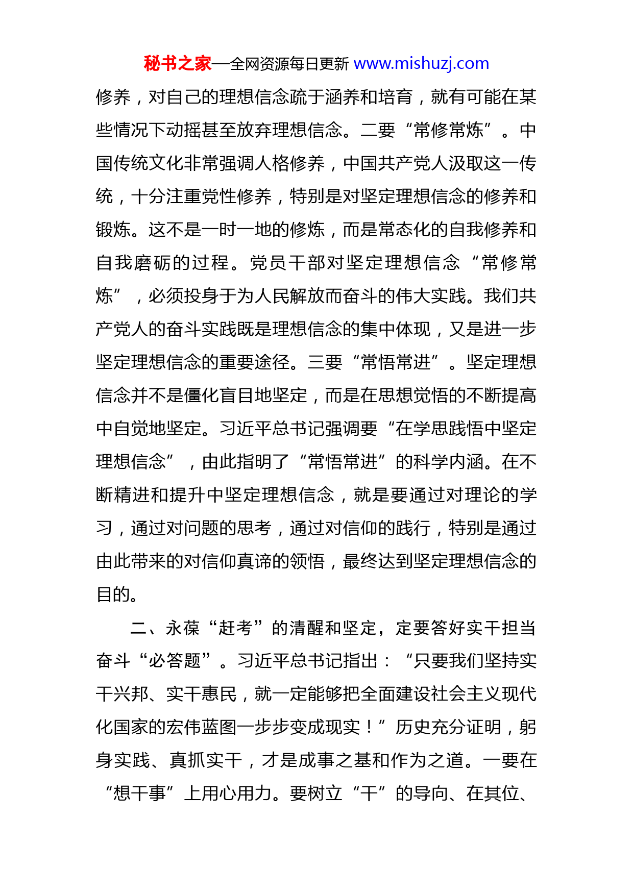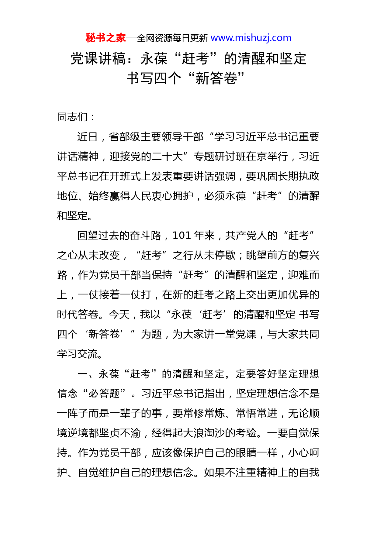 秘书之家—全网资源每日更新www.mishuzj.com党课讲稿:永葆“赶考”的清醒和坚定书写四个“新答卷”同志们:近日,省部级主要领导干部“学习习近平总书记重要讲话精神,迎接党的二十大”专题研讨班在京举行,习近平总书记在开班式上发表重要讲话强调,要巩固长期执政地位、始终赢得人民衷心拥护,必须永葆“赶考”的清醒和坚定。回望过去的奋斗路,101年来,共产党人的“赶考”之心从未改变,“赶考”之行从未停歇;眺望前方的复兴路,作为党员干部当保持“赶考”的清醒和坚定,迎难而上,一仗接着一仗打,在新的赶考之路上交出更加优异的时代答卷。今天,我以“永葆‘赶考’的清醒和坚定书写四个‘新答卷’”为题,为大家讲一堂党课,与大家共同学习交流。一、永葆“赶考”的清醒和坚定,定要答好坚定理想信念“必答题”。习近平总书记指出,坚定理想信念不是一阵子而是一辈子的事,要常修常炼、常悟常进,无论顺境逆境都坚贞不渝,经得起大浪淘沙的考验。一要自觉保持。作为党员干部,应该像保护自己的眼睛一样,小心呵护、自觉维护自己的理想信念。如果不注重精神上的自我秘书之家—全网资源每日更新www.mishuzj.com修养,对自己的理想信念疏于涵养和培育,就有可能在某些情况下动摇甚至放弃理想信念。二要“常修常炼”。中国传统文化非常强调人格修养,中国共产党人汲取这一传统,十分注重党性修养,特别是对坚定理想信念的修养和锻炼。这不是一时一地的修炼,而是常态化的自我修养和自我磨砺的过程。党员干部对坚定理想信念“常修常炼”,必须投身于为人民解放而奋斗的伟大实践。我们共产党人的奋斗实践既是理想信念的集中体现,又是进一步坚定理想信念的重要途径。三要“常悟常进”。坚定理想信念并不是僵化盲目地坚定,而是在思想觉悟的不断提高中自觉地坚定。习近平总书记强调要“在学思践悟中坚定理想信念”,由此指明了“常悟常进”的科学内涵。在不断精进和提升中坚定理想信念,就是要通过对理论的学习,通过对问题的思考,通过对信仰的践行,特别是通过由此带来的对信仰真谛的领悟,最终达到坚定理想信念的目的。二、永葆“赶考”的清醒和坚定,定要答好实干担当奋斗“必答题”。习近平总书记指出:“只要我们坚持实干兴邦、实干惠民,就一定能够把全面建设社会主义现代化国家的宏伟蓝图一步步变成现实!”历史充分证明,躬身实践、真抓实干,才是成事之基和作为之道。一要在“想干事”上用心用力。要树立“干”的导向、在其位、秘书之家—全网资源每日更新www.mishuzj.com谋其政、司其职、尽其责。要真抓实干,不能空谈,实干才能兴邦,给老百姓做实事,不断提高服务质量。要拿出时不我待、只争朝夕的劲头,用心想事、用力干事,扑下身子,静下心来,才能干成事。全面提高适应新时代、实现新目标、落实新部署的能力,以勇于担当、善于作为的底气和勇气,赢得主动、赢得优势、赢得未来。二要在“会干事”上提质提效。一切难题,只有在实干中才能破解;一切办法,只有在实干中才能见效。党员干部要发扬斗争精神,关键时刻站得出来、顶得上去,挺起宽肩膀,种好责任田。从大处着眼,大处着手,突出重点,集中精力抓好大事、难事、急事,不拖泥带水,不患得患失,坚定不移地推进大项工作的落实。要时刻牢记自己的使命和职责,牢记党和人民的重托,在其位就要谋其政,尽其责,要以高昂的状态,创新的姿态,务实的作风,寝食不安、夜以继日的精神,殚精竭虑,鞠躬尽瘁,立足本职岗位,尽心尽责,扑下身子抓好各项工作的落实。三要在“干成事”上善作善为。作为新时代的党员干部,要立足岗位,提高站位,胸怀大局,在服务发展中找准位置,在抓落实中强化责任,扑下身子干工作,勇于担当挑重担。全身心投入到发展富民上,让党放心,让人民满意;对群众要充满真情,关心群众疾苦,全心全意为群众谋利益,一心一意帮助群众办好事、办实事。秘书之家—全网资源每日更新www.mishuzj.com三、永葆“赶考”的清醒和坚定,定要答好践行初心使命“必答题”。中国共产党为人民而生,因人民而兴,必须永远保持同人民群众的血肉联系,始终同人民想在一起、干在一起,这是党执政兴国的最大底气。一要增进“全心全意为人民服务”的情怀涵养。全心全意为人民服务是共产党人必备的政治情怀。从“情”的维度来看,人民情怀是中国共产党最鲜明的执政本色。人心向背事关党的生死存亡,作为党员干部,只有不断涵养“全心全意为人民服务”的情怀,才能够做到奋斗目标奔人民而去,手中权力为人民所用,根本利益为人民所谋,心中位置数人民最高,工作好坏由人民判定,才能始终涵养深厚的爱民情怀,真心诚意地为人民群众办实事、做好事、解难事,成为人民心中最信任和最依赖的人。二要树立“全心全意为人民服务”的执政理念。全心全意为人民服务是中国共产党的科学执政理念。从“理”的维度来看,中国共产党“全心全意为人民服务”的立场观点已经形成了系统的科学执政理念。人民群众在改造世界中的具体实践是理论的源头活水,要树立“全心全意为人民服务”执政理念,就要有意识地将人民群众在社会主义现代化建设和中华民族伟大复兴征程中创造的新鲜经验进行及时概括和科学总结,使之上升为指导新的实践的新
