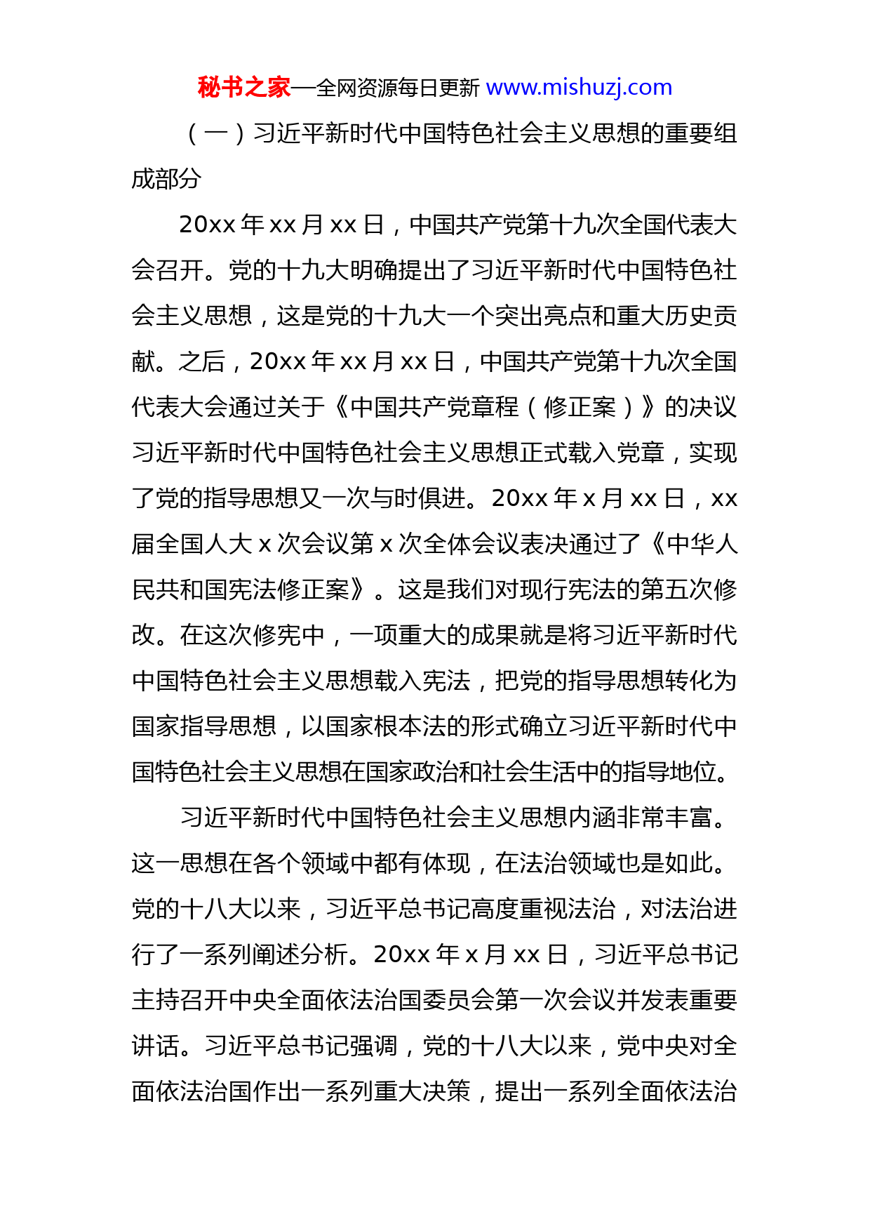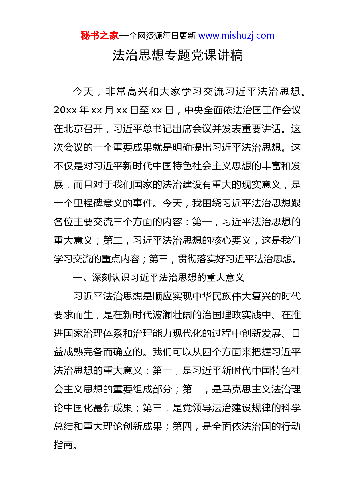 秘书之家—全网资源每日更新www.mishuzj.com法治思想专题党课讲稿今天,非常高兴和大家学习交流习近平法治思想。20xx年xx月xx日至xx日,中央全面依法治国工作会议在北京召开,习近平总书记出席会议并发表重要讲话。这次会议的一个重要成果就是明确提出习近平法治思想。这不仅是对习近平新时代中国特色社会主义思想的丰富和发展,而且对于我们国家的法治建设有重大的现实意义,是一个里程碑意义的事件。今天,我围绕习近平法治思想跟各位主要交流三个方面的内容:第一,习近平法治思想的重大意义;第二,习近平法治思想的核心要义,这是我们学习交流的重点内容;第三,贯彻落实好习近平法治思想。一、深刻认识习近平法治思想的重大意义习近平法治思想是顺应实现中华民族伟大复兴的时代要求而生,是在新时代波澜壮阔的治国理政实践中、在推进国家治理体系和治理能力现代化的过程中创新发展、日益成熟完备而确立的。我们可以从四个方面来把握习近平法治思想的重大意义:第一,是习近平新时代中国特色社会主义思想的重要组成部分;第二,是马克思主义法治理论中国化最新成果;第三,是党领导法治建设规律的科学总结和重大理论创新成果;第四,是全面依法治国的行动指南。秘书之家—全网资源每日更新www.mishuzj.com(一)习近平新时代中国特色社会主义思想的重要组成部分20xx年xx月xx日,中国共产党第十九次全国代表大会召开。党的十九大明确提出了习近平新时代中国特色社会主义思想,这是党的十九大一个突出亮点和重大历史贡献。之后,20xx年xx月xx日,中国共产党第十九次全国代表大会通过关于《中国共产党章程(修正案)》的决议习近平新时代中国特色社会主义思想正式载入党章,实现了党的指导思想又一次与时俱进。20xx年x月xx日,xx届全国人大x次会议第x次全体会议表决通过了《中华人民共和国宪法修正案》。这是我们对现行宪法的第五次修改。在这次修宪中,一项重大的成果就是将习近平新时代中国特色社会主义思想载入宪法,把党的指导思想转化为国家指导思想,以国家根本法的形式确立习近平新时代中国特色社会主义思想在国家政治和社会生活中的指导地位。习近平新时代中国特色社会主义思想内涵非常丰富。这一思想在各个领域中都有体现,在法治领域也是如此。党的十八大以来,习近平总书记高度重视法治,对法治进行了一系列阐述分析。20xx年x月xx日,习近平总书记主持召开中央全面依法治国委员会第一次会议并发表重要讲话。习近平总书记强调,党的十八大以来,党中央对全面依法治国作出一系列重大决策,提出一系列全面依法治秘书之家—全网资源每日更新www.mishuzj.com国新理念新思想新战略。党的十八大以来习近平总书记关于法治的重要论述,我们梳理发现可以分为两个方面:一方面是在综合的经济社会分析中涉及法治,比如党的十九大、党的十九届四中全会、党的十九届五中全会,是在一个全面的报告分析中涉及法治;另一方面是专门讲法治。我们可以看到,党的十八大以来讲的次数之多、涉及内容之广,是前所未有的xx23日,习近平总书记在党的十八届四中全会第二次全体会议上发表重要讲话。习近平总书记指出:“法律是什么最形象的说法就是准绳。用法律的准绳去衡量、规范、引导社会生活,这就是法治。”习近平总书记强调:“小智治事,中智治人,大智立法。治理一个国家、一个社会,关键是要立规矩、讲规矩、守规矩。法律是治国理政最大最重要的规矩。”习近平总书记用规矩、准绳来定性法治同时又指出法律是治国理政最大最重要的规矩。习近平总书记对法治的定位也作出了阐释。在党的十八届四中全会第二次全体会议上,习近平总书记指出:“法治和人治问题是人类政治文明史上的一个基本问题,也是各国在实现现代化过程中必须面对和解决的一个重大问题。纵观世界近现代史,凡是顺利实现现代化的国家,没有一个不是较好解决了法治和人治问题的。”习近平总书记旗帜鲜明地指出法治和人治问题是人类政治文明史上秘书之家—全网资源每日更新www.mishuzj.com的一个基本问题,也是各国在实现现代化过程中必须面对和解决的一个重大问题。我们必须面对,那自然我们今天要选择的是法治。我们理解习近平总书记对法治的定位,可以从三个方面来把握:第一,是“四个全面”战略布局的重要一环。党的十八大以来,我们提出了“五位一体”总体布局和“四个全面”战略布局,这构成了我国建设发展中的两个层面的问题。“五位一体”总体布局解决建设什么、发展什么的问题,“四个全面”战略布局解决怎么建设、怎么发展的问题。在“四个全面”战略布局中,全面依法治国是其中之一。20xx年x月x日,习近平总书记在省部级主要领导干部学习贯彻党的十八届四中全会精神全面推进依法治国专题研讨班上发表重要讲话。习近平总书记全面辩证地梳理了“四个全面”战略布局。第一个“全面”:全面建成小康社会,这是我们的发展目标。2021年x月x日,习近平总书记在庆祝中国共产党成立100周年大会上发表重要讲话。习近平总书记庄严宣告“在中华大地上全面建成了小康社会”。党的十九届五中全会将“全面建成小康社会”表述更新为“全面建设社会主义现代化国家”,明确了我们新的发展目标。秘书之家—