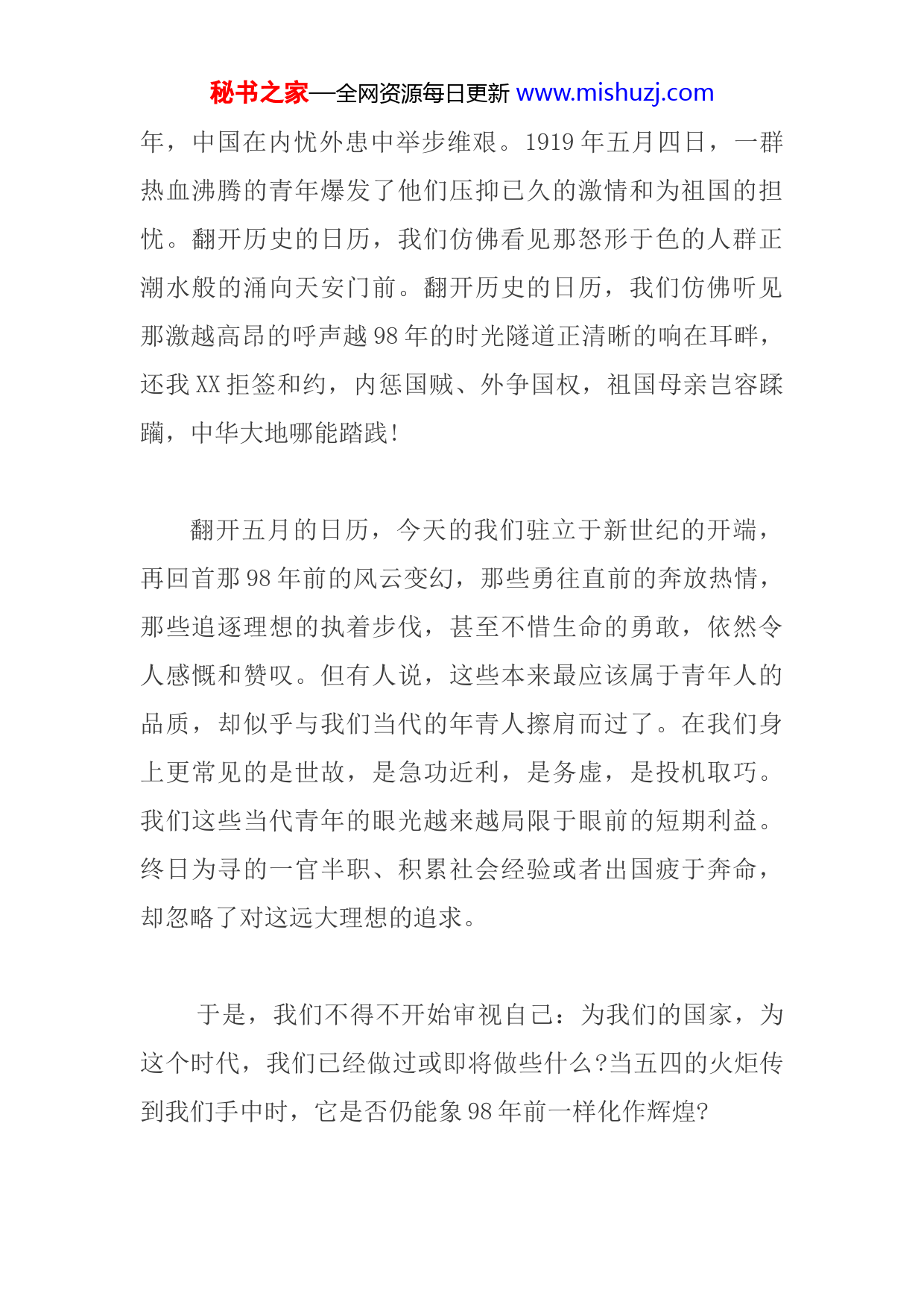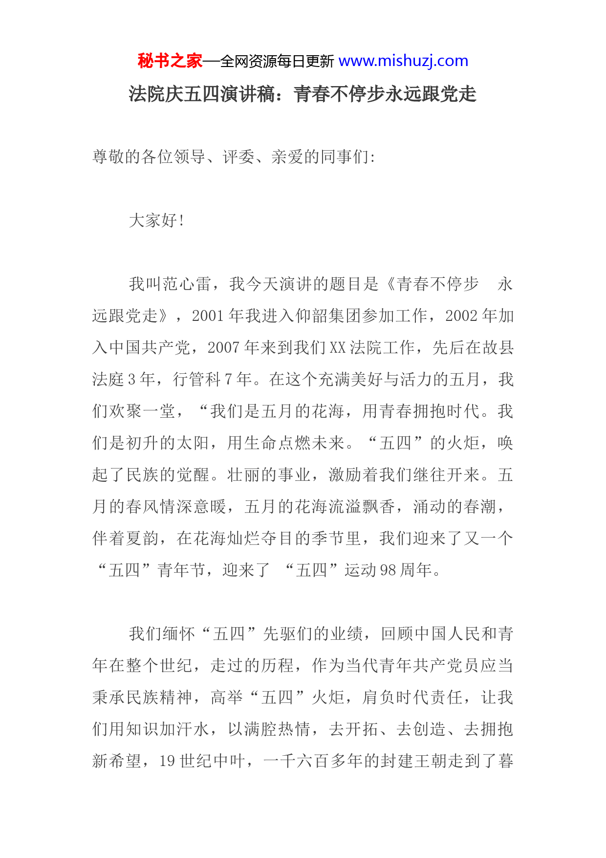 秘书之家—全网资源每日更新www.mishuzj.com法院庆五四演讲稿:青春不停步永远跟党走尊敬的各位领导、评委、亲爱的同事们:大家好!我叫范心雷,我今天演讲的题目是《青春不停步永远跟党走》,2001年我进入仰韶集团参加工作,2002年加入中国共产党,2007年来到我们XX法院工作,先后在故县法庭3年,行管科7年。在这个充满美好与活力的五月,我们欢聚一堂,“我们是五月的花海,用青春拥抱时代。我们是初升的太阳,用生命点燃未来。“五四”的火炬,唤起了民族的觉醒。壮丽的事业,激励着我们继往开来。五月的春风情深意暖,五月的花海流溢飘香,涌动的春潮,伴着夏韵,在花海灿烂夺目的季节里,我们迎来了又一个“五四”青年节,迎来了“五四”运动98周年。我们缅怀“五四”先驱们的业绩,回顾中国人民和青年在整个世纪,走过的历程,作为当代青年共产党员应当秉承民族精神,高举“五四”火炬,肩负时代责任,让我们用知识加汗水,以满腔热情,去开拓、去创造、去拥抱新希望,19世纪中叶,一千六百多年的封建王朝走到了暮秘书之家—全网资源每日更新www.mishuzj.com年,中国在内忧外患中举步维艰。1919年五月四日,一群热血沸腾的青年爆发了他们压抑已久的激情和为祖国的担忧。翻开历史的日历,我们仿佛看见那怒形于色的人群正潮水般的涌向天安门前。翻开历史的日历,我们仿佛听见那激越高昂的呼声越98年的时光隧道正清晰的响在耳畔,还我XX拒签和约,内惩国贼、外争国权,祖国母亲岂容蹂躏,中华大地哪能踏践!翻开五月的日历,今天的我们驻立于新世纪的开端,再回首那98年前的风云变幻,那些勇往直前的奔放热情,那些追逐理想的执着步伐,甚至不惜生命的勇敢,依然令人感慨和赞叹。但有人说,这些本来最应该属于青年人的品质,却似乎与我们当代的年青人擦肩而过了。在我们身上更常见的是世故,是急功近利,是务虚,是投机取巧。我们这些当代青年的眼光越来越局限于眼前的短期利益。终日为寻的一官半职、积累社会经验或者出国疲于奔命,却忽略了对这远大理想的追求。于是,我们不得不开始审视自己:为我们的国家,为这个时代,我们已经做过或即将做些什么?当五四的火炬传到我们手中时,它是否仍能象98年前一样化作辉煌?秘书之家—全网资源每日更新www.mishuzj.com生命不仅仅是一滴滴的鲜血,它更是渴望燃烧的激情;青春也不仅仅是一声声的赞美,它更是拥有使命并为之奋斗不息的源泉。因为生命的光环,一个个被践踏的躯体赋予了新的灵魂;因为青春的绚丽,一个个飞舞的思绪会聚成一首悲壮的挽歌。穿岁月峰头,伴历史云烟,五四青年的精神走过了98年的风雨征程。五四运动至今,一代代优秀青年为民族复兴作出了卓越的贡献,社会主义现代化的宏伟事业需要我们去建设,中华民族的伟大复兴将在我们手中实现。党在召唤,时代在召唤,只要我们以“崇高的理想、创新的意识、无畏的勇气”发挥青年的智慧、风采和力量,就能乘风破浪、与时俱进!青年同事们,让我们团结一致,强力实施我院提出的“12345”工程,即瞄准一个目标(全国优秀法院),践行两个主题(公正与效率),突出三大理念(政治建院、业务强院、文化兴院),强化四项措施(服务大局、执法办案、司法改革、廉政建设),争创五个一流(一流管理、一流质效、一流服务、一流队伍、一流业绩),忠实履行宪法法律赋予的职责,撸起袖子加油干,以更加饱满的热情、更加昂扬的斗志、更加务实的作风,投入到维护公平正义和法律权威的事业中,让司法更加阳光透明、更加贴近人民群众,为建设“产业优、城市美、百姓富”的新秘书之家—全网资源每日更新www.mishuzj.comXX,为实现“12345”工程做出新的更大贡献!