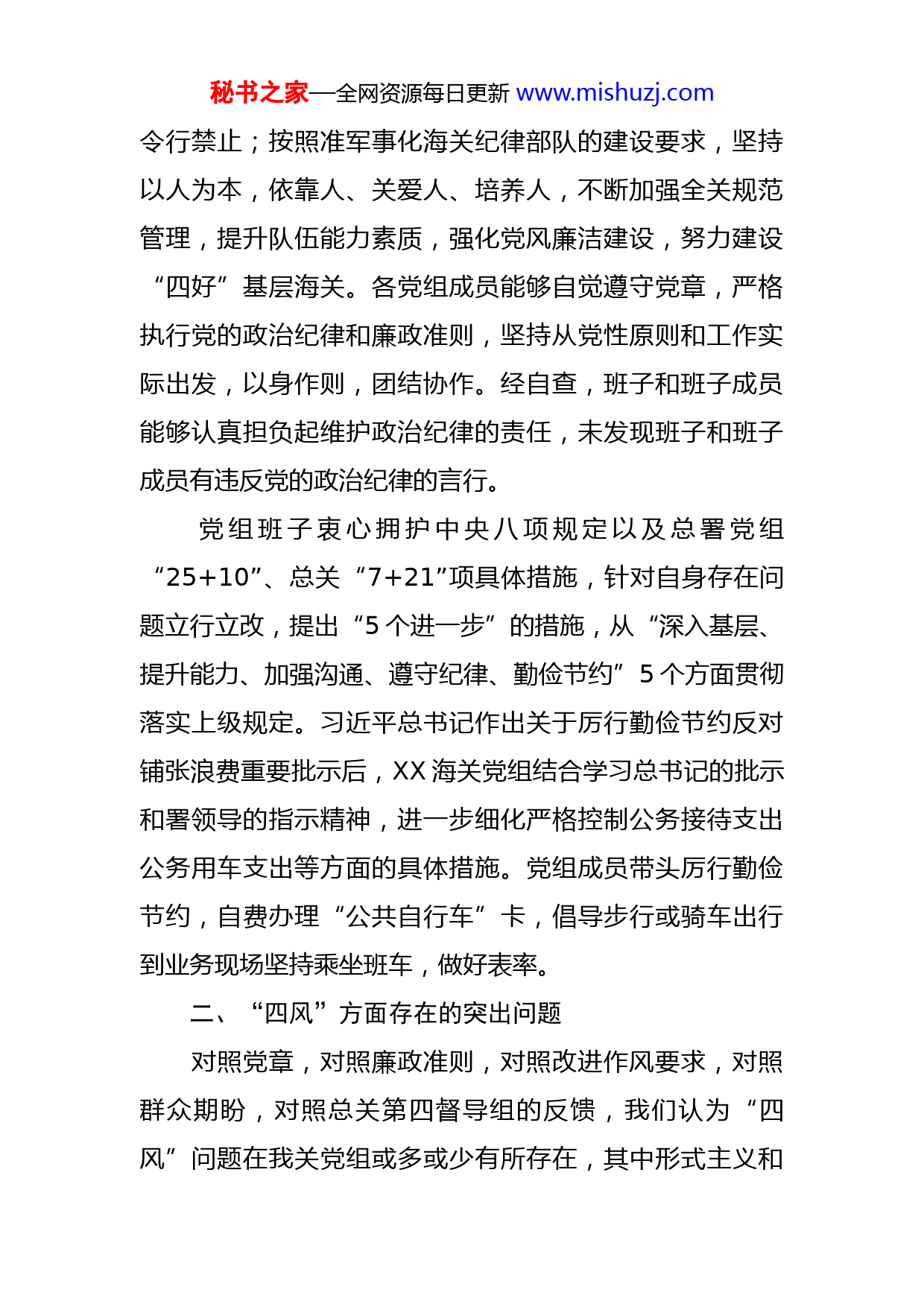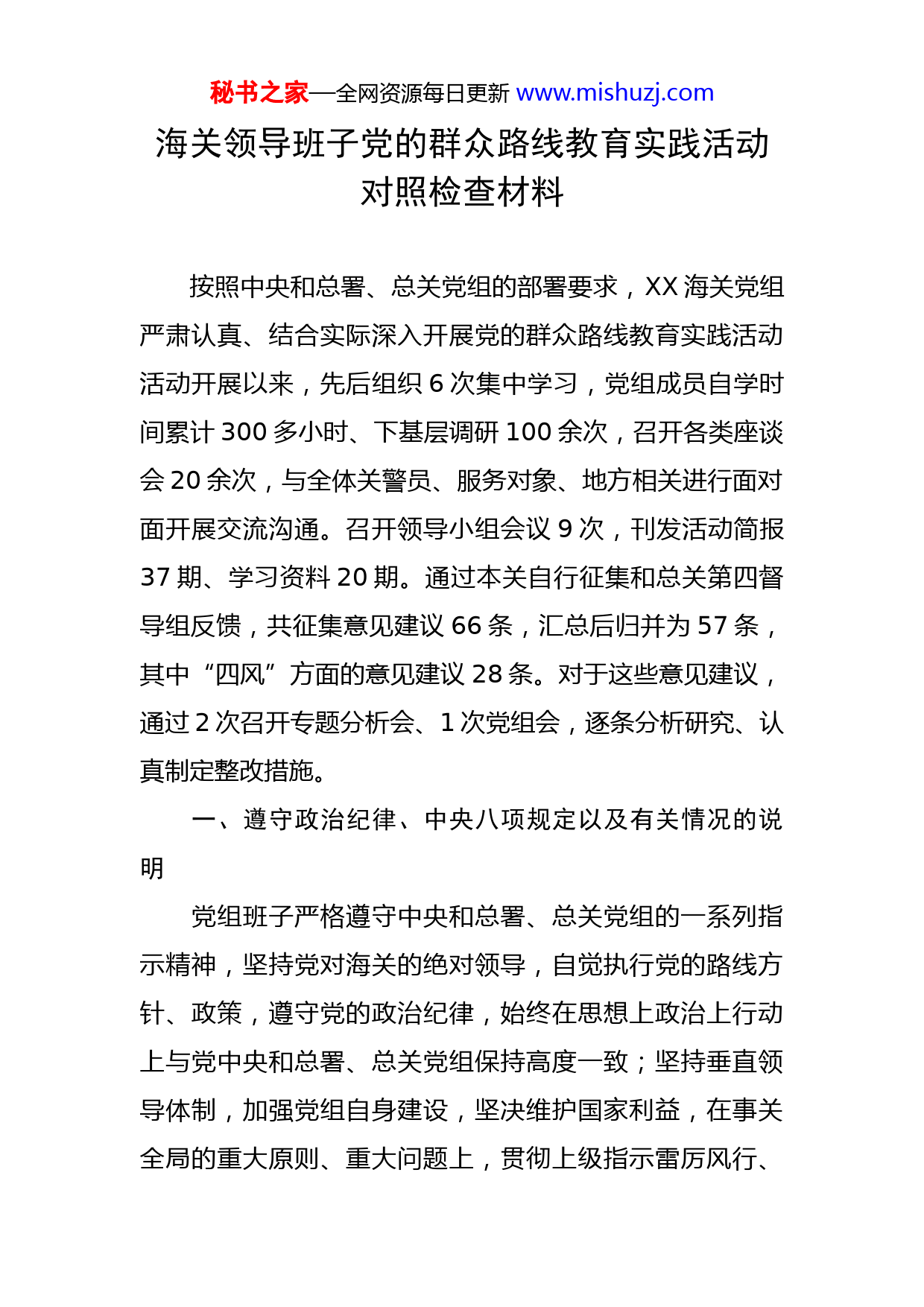 秘书之家—全网资源每日更新www.mishuzj.com海关领导班子党的群众路线教育实践活动对照检查材料按照中央和总署、总关党组的部署要求,XX海关党组严肃认真、结合实际深入开展党的群众路线教育实践活动活动开展以来,先后组织6次集中学习,党组成员自学时间累计300多小时、下基层调研100余次,召开各类座谈会20余次,与全体关警员、服务对象、地方相关进行面对面开展交流沟通。召开领导小组会议9次,刊发活动简报37期、学习资料20期。通过本关自行征集和总关第四督导组反馈,共征集意见建议66条,汇总后归并为57条,其中“四风”方面的意见建议28条。对于这些意见建议,通过2次召开专题分析会、1次党组会,逐条分析研究、认真制定整改措施。一、遵守政治纪律、中央八项规定以及有关情况的说明党组班子严格遵守中央和总署、总关党组的一系列指示精神,坚持党对海关的绝对领导,自觉执行党的路线方针、政策,遵守党的政治纪律,始终在思想上政治上行动上与党中央和总署、总关党组保持高度一致;坚持垂直领导体制,加强党组自身建设,坚决维护国家利益,在事关全局的重大原则、重大问题上,贯彻上级指示雷厉风行、秘书之家—全网资源每日更新www.mishuzj.com令行禁止;按照准军事化海关纪律部队的建设要求,坚持以人为本,依靠人、关爱人、培养人,不断加强全关规范管理,提升队伍能力素质,强化党风廉洁建设,努力建设“四好”基层海关。各党组成员能够自觉遵守党章,严格执行党的政治纪律和廉政准则,坚持从党性原则和工作实际出发,以身作则,团结协作。经自查,班子和班子成员能够认真担负起维护政治纪律的责任,未发现班子和班子成员有违反党的政治纪律的言行。党组班子衷心拥护中央八项规定以及总署党组“25+10”、总关“7+21”项具体措施,针对自身存在问题立行立改,提出“5个进一步”的措施,从“深入基层、提升能力、加强沟通、遵守纪律、勤俭节约”5个方面贯彻落实上级规定。习近平总书记作出关于厉行勤俭节约反对铺张浪费重要批示后,XX海关党组结合学习总书记的批示和署领导的指示精神,进一步细化严格控制公务接待支出公务用车支出等方面的具体措施。党组成员带头厉行勤俭节约,自费办理“公共自行车”卡,倡导步行或骑车出行到业务现场坚持乘坐班车,做好表率。二、“四风”方面存在的突出问题对照党章,对照廉政准则,对照改进作风要求,对照群众期盼,对照总关第四督导组的反馈,我们认为“四风”问题在我关党组或多或少有所存在,其中形式主义和秘书之家—全网资源每日更新www.mishuzj.com官僚主义相对集中一些。(一)形式主义方面。1.理论学习还不够扎实。理论学习抓的不扎实,钻研不深。文件看了,政策学了,有时仅仅停留在文字表面,或应付差事,或批转相关部门阅处,没有对其背景、细节和内涵进行深层次的思考,表现在单纯追求形式阅知,而忽略了促进、规范和指导工作;集体政策学习研究不够,对中央和省、市重大战略部署,以及群众利益密切相关的政策,往往集体学习宣读和深入研究不够,讨论不充分,特别是利用集体智慧研究提出与实际工作相结合举措的研讨活动较少。。2.调查研究还不够深入。主要表现为工作作风还不够扎实,深入细致程度不够到位,总结思考的能力有待提高根据上级的要求和本关的部署,虽然在工作中也要求领导班子成员开展调研,每年撰写至少一篇调研报告,但在调研主题、内容、形式指导不够,领导班子调研时间和频率还有提升空间,调研内容不够具体,有的调研只是开个座谈会,提出问题多,分析解决少,提出的具有价值的措施办法不多。3.工作落实还不够有力。工作存在重部署、轻检查现象,研究工作部署较为透彻,但对工作的责任主体督促不够,导致少数工作得不到落实,存在干好干坏一个样的局秘书之家—全网资源每日更新www.mishuzj.com面。还没有建立完善的监督、检查长效机制,谁来监督、怎样监督、监督结果如何使用等问题长期议而不决;监督工作想起就做,缺乏持续跟踪,造成有些工作即使没有落实,也无人过问,或不了了之,或临时处置,疲于应付,影响了工作质量。(二)官僚主义方面。1.服务意识存在不足。主动深入社会和服务社会的意识不强,对地方、企业的发展热点和突出困难把握还不充分,工作落实的力度和社会的期盼仍存在一定差距。例如有企业反映海关政策宣讲的针对性上还显不足,在帮助企业应对当前严峻贸易形势上还要多想办法;有企业建议要帮助企业建立业务传带机制,促进企业之间的相互学习和交流,共同提升海关相关业务水平。关心群众思想、生活和掌握群众需求不够,缺乏主动关心的意识。平时交任务提要求多,教方法、帮助解决困难不够;出了问题对下埋怨多、批评多,主动承担责任少、查找自身原因少,使关员感到缺乏理解和关心。2.群众意识还有差距。征求群众意见不够,充分倾听民意、广泛集中民智、反映各方诉求的科学民主决策体系不够健全;想问题、作决策有时还存在片面性。与干部群众谈心交流不够,思想交流不充分,即便交流和谈心也是说教多、倾听少,公事多、感情少。听座谈汇报多、看信秘书之家—全网资源每日更新www.mishuzj.com息反映多,多为接受二手信息,直接倾听基层诉求不够,与基层群众的直接感情、直接体验不足。例如对群众多样