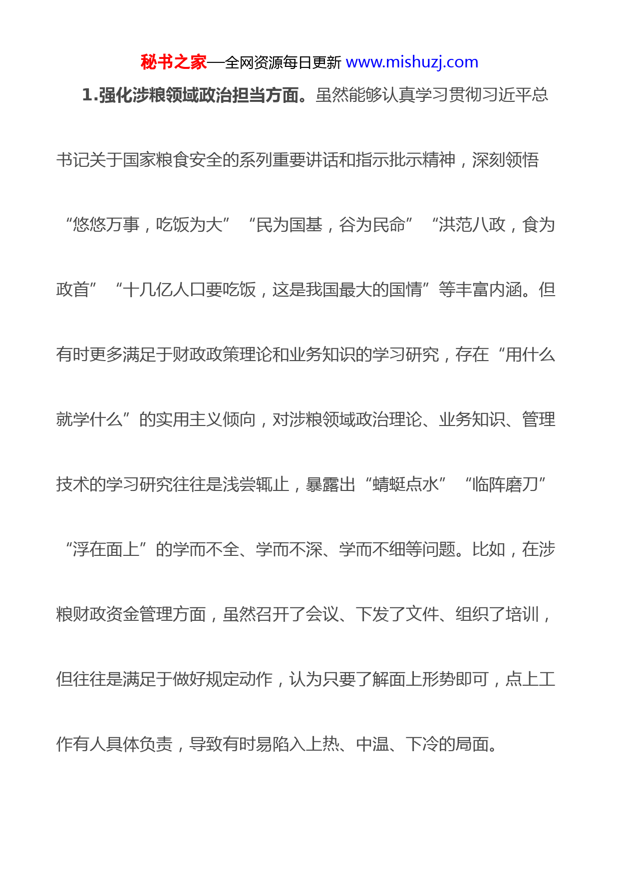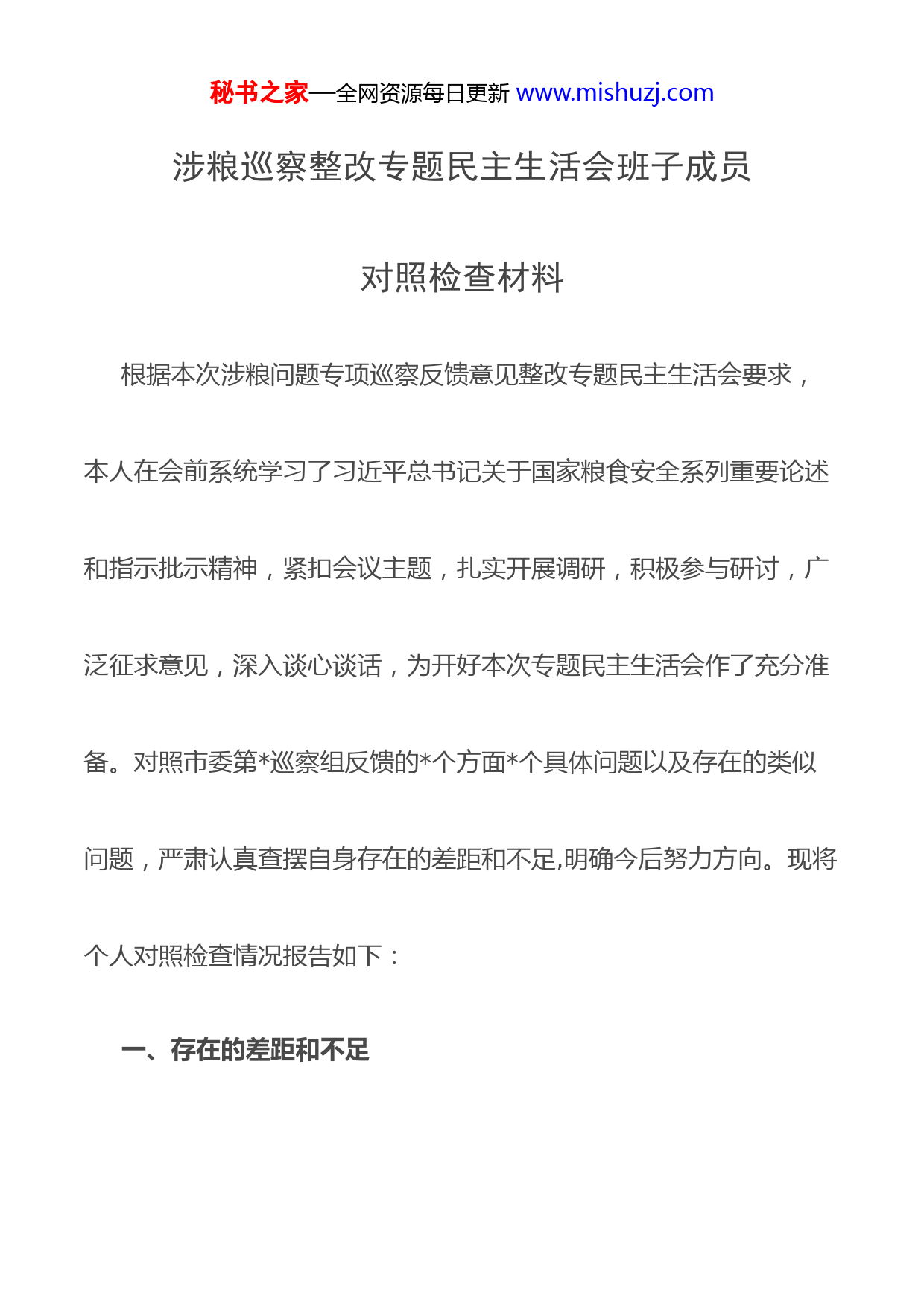 秘书之家—全网资源每日更新www.mishuzj.com涉粮巡察整改专题民主生活会班子成员对照检查材料根据本次涉粮问题专项巡察反馈意见整改专题民主生活会要求,本人在会前系统学习了习近平总书记关于国家粮食安全系列重要论述和指示批示精神,紧扣会议主题,扎实开展调研,积极参与研讨,广泛征求意见,深入谈心谈话,为开好本次专题民主生活会作了充分准备。对照市委第巡察组反馈的个方面个具体问题以及存在的类似问题,严肃认真查摆自身存在的差距和不足,明确今后努力方向。现将个人对照检查情况报告如下:一、存在的差距和不足秘书之家—全网资源每日更新www.mishuzj.com1.强化涉粮领域政治担当方面。虽然能够认真学习贯彻习近平总书记关于国家粮食安全的系列重要讲话和指示批示精神,深刻领悟“悠悠万事,吃饭为大”“民为国基,谷为民命”“洪范八政,食为政首”“十几亿人口要吃饭,这是我国最大的国情”等丰富内涵。但有时更多满足于财政政策理论和业务知识的学习研究,存在“用什么就学什么”的实用主义倾向,对涉粮领域政治理论、业务知识、管理技术的学习研究往往是浅尝辄止,暴露出“蜻蜓点水”“临阵磨刀”“浮在面上”的学而不全、学而不深、学而不细等问题。比如,在涉粮财政资金管理方面,虽然召开了会议、下发了文件、组织了培训,但往往是满足于做好规定动作,认为只要了解面上形势即可,点上工作有人具体负责,导致有时易陷入上热、中温、下冷的局面。秘书之家—全网资源每日更新www.mishuzj.com2.强化涉粮领域探索研究方面。涉粮领域资金监管是财政资金管理的重要组成部分。虽然能够按照《预算法》及其《实施条例》精神,对照涉粮财政资金管理办法,着力加强资金规范管理,严格落实项目申报、指标下达、资金拨付、资金监管、公示公开等程序。但有时往往是站在财政部门角度考虑问题,认为只要项目对口、资金对位即可,没有从权责对等的高度深入思考财政管理创新的务实举措。比如,资金拨付后未能与资金使用单位常态化对接,对资金使用的实际成效以及存在的问题掌握不透彻,在耕地地力保护资金管理中出现了重复投入、资金效益不高等问题,虽然进行了整改,但也只能算是事后补救,未能从源头上加强管控。秘书之家—全网资源每日更新www.mishuzj.com3.强化涉粮领域务实作风方面。由于事务性工作比较多,忙于应付业务工作,主动调研、系统调研少,只注重自己想要了解的方面与问题,存在调研不广泛不透彻、了解情况不及时不全面的问题。有时习惯于会议上听汇报、电话里问情况、资料上找数据,导致实情摸得不准、底子吃得不透。比如,虽然经常性开展对口帮扶、走访慰问、政策宣传等活动,但基本是根据上级工作要求或年度工作安排进行,主动深入农村组织、农业经营主体、农民群众开展“下沉式”调研较少,形式也较为机械刻板,表现为工作不接地气、调研不冒暖气、落实不传热气,需要转变作风,真正把工作贴在群众心上,把成效体现在群众满意上,让工作效果经得起检验。秘书之家—全网资源每日更新www.mishuzj.com4.强化涉粮领域机制建设方面。虽然能够坚持认真负责、兢兢业业的态度,积极做好本职工作,主动配合相关部门开展工作督导,形成了以制度管事、管钱、管人的良好氛围。但对如何通过长效机制建设来推动部门履职、资金提效、管理升级的研究不够深入,制度的约束力、震慑力还未充分彰显。比如,在当前财政“紧平衡”状态下,加强各领域财政资金绩效管理是亟需攻克的难题。但目前的绩效管理中还存在目标设置不科学、评估指标不全面、跟踪监控不严谨、结果运用不刚性等问题,如何把钱用在刀刃上、花最少的钱办最多的事,让“花钱必问效、无效必问责”成为共识和遵循,还需要形成更加完备、标准、科学的制度体系。二、今后努力方向秘书之家—全网资源每日更新www.mishuzj.com针对以上查摆出的问题,深刻剖析思想根源,找准原因症结所在,以本次专题民主生活会为契机,聚焦关键抓整改,在今后工作中努力做到以下几点。1.自觉跳出本位看站位。进一步提升思想认识,深刻认识粮食安全是事关国计民生的“国之大者”,将学习贯彻习近平总书记关于国家粮食安全的系列重要讲话和指示批示精神,与抓好本次涉粮问题专项巡察整改结合起来,不断增强政治自觉、思想自觉、行动自觉,坚决有力抓好涉粮巡察整改落实。自觉加强涉粮领域政策理论和业务知识学习,以财政资金管理为切入点、突破口,找准与涉粮领域工作的结合点、联结处,避免陷入少知而迷、不知而茫、无知而乱的困境,秘书之家—全网资源每日更新www.mishuzj.com不断养成在大局下工作、在大势中推进、在大事里作为的财政干部精气神。2.自觉跳出当下看长远。自觉把本次专题民主生活会检视问题整改和涉粮问题专项巡察整改有机结合起来,进一步落细工作举措,严格落实整改工作要求,突出抓好集中整改,实行挂图作战、挂牌督战,实现解决一个、销号一个、巩固一个。突出标本兼治,抓紧补短板、堵漏洞、强弱项,推动从源头上健全涉粮安全长效机制,建立完善涉粮资金监管、涉粮资金绩效管理、涉粮问题整改等制度,切实提高涉粮领域治理能力、完善治理体系,净化涉粮领域生态。对短期内能整改到位的,坚决做到立行