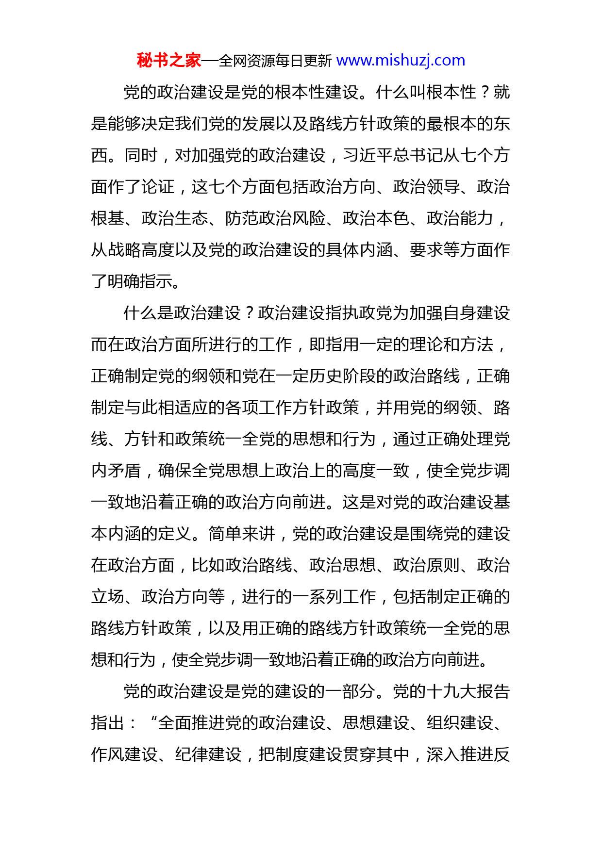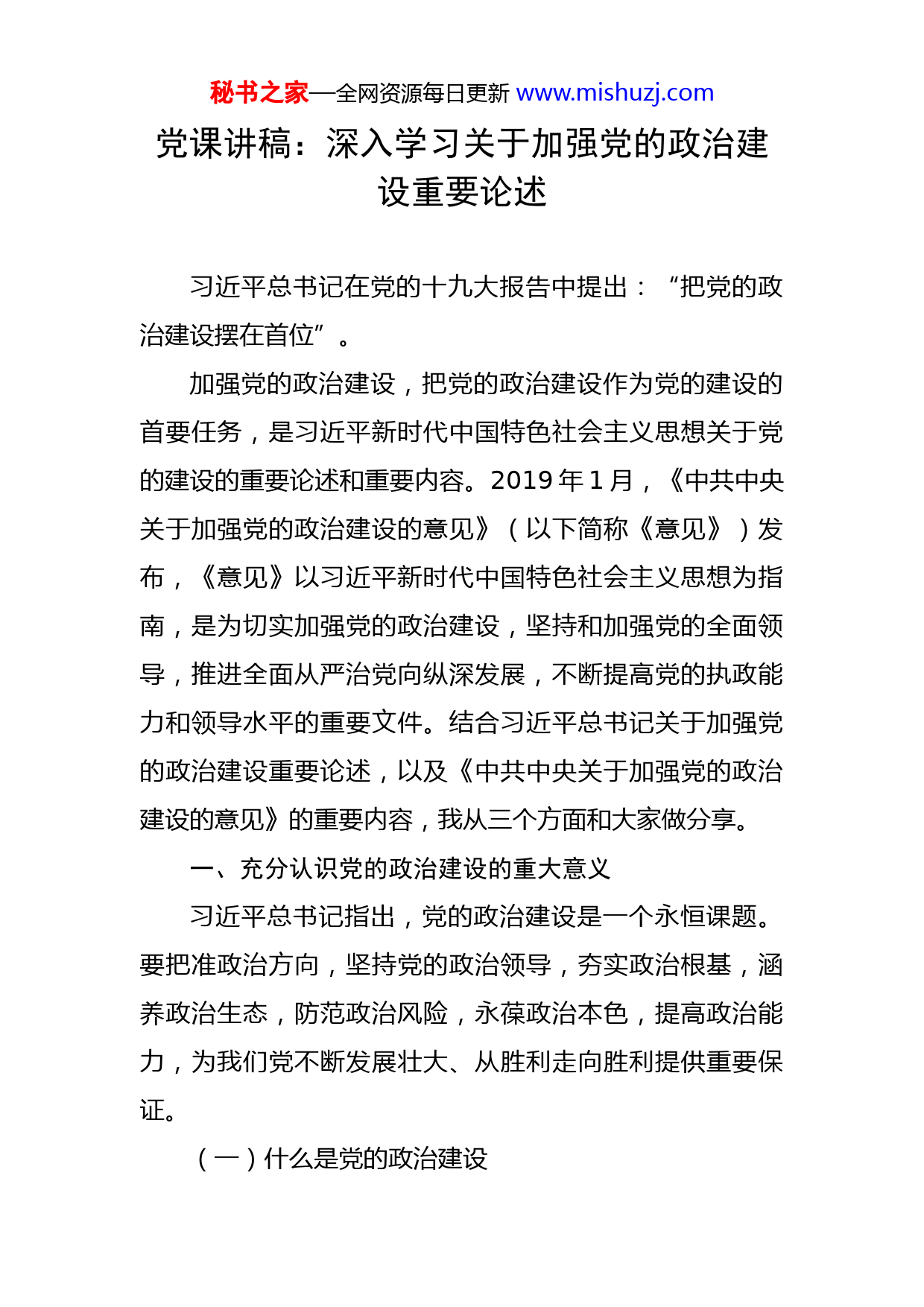 秘书之家—全网资源每日更新www.mishuzj.com党课讲稿:深入学习关于加强党的政治建设重要论述习近平总书记在党的十九大报告中提出:“把党的政治建设摆在首位”。加强党的政治建设,把党的政治建设作为党的建设的首要任务,是习近平新时代中国特色社会主义思想关于党的建设的重要论述和重要内容。2019年1月,《中共中央关于加强党的政治建设的意见》(以下简称《意见》)发布,《意见》以习近平新时代中国特色社会主义思想为指南,是为切实加强党的政治建设,坚持和加强党的全面领导,推进全面从严治党向纵深发展,不断提高党的执政能力和领导水平的重要文件。结合习近平总书记关于加强党的政治建设重要论述,以及《中共中央关于加强党的政治建设的意见》的重要内容,我从三个方面和大家做分享。一、充分认识党的政治建设的重大意义习近平总书记指出,党的政治建设是一个永恒课题。要把准政治方向,坚持党的政治领导,夯实政治根基,涵养政治生态,防范政治风险,永葆政治本色,提高政治能力,为我们党不断发展壮大、从胜利走向胜利提供重要保证。(一)什么是党的政治建设秘书之家—全网资源每日更新www.mishuzj.com党的政治建设是党的根本性建设。什么叫根本性?就是能够决定我们党的发展以及路线方针政策的最根本的东西。同时,对加强党的政治建设,习近平总书记从七个方面作了论证,这七个方面包括政治方向、政治领导、政治根基、政治生态、防范政治风险、政治本色、政治能力,从战略高度以及党的政治建设的具体内涵、要求等方面作了明确指示。什么是政治建设?政治建设指执政党为加强自身建设而在政治方面所进行的工作,即指用一定的理论和方法,正确制定党的纲领和党在一定历史阶段的政治路线,正确制定与此相适应的各项工作方针政策,并用党的纲领、路线、方针和政策统一全党的思想和行为,通过正确处理党内矛盾,确保全党思想上政治上的高度一致,使全党步调一致地沿着正确的政治方向前进。这是对党的政治建设基本内涵的定义。简单来讲,党的政治建设是围绕党的建设在政治方面,比如政治路线、政治思想、政治原则、政治立场、政治方向等,进行的一系列工作,包括制定正确的路线方针政策,以及用正确的路线方针政策统一全党的思想和行为,使全党步调一致地沿着正确的政治方向前进。党的政治建设是党的建设的一部分。党的十九大报告指出:“全面推进党的政治建设、思想建设、组织建设、作风建设、纪律建设,把制度建设贯穿其中,深入推进反秘书之家—全网资源每日更新www.mishuzj.com腐败斗争,不断提高党的建设质量”。党的建设是一个大系统,在党的建设中,要把党的政治建设摆在首位。习近平总书记提出的“把党的政治建设摆在首位”,是具有现实性、针对性和科学性的。党的十八大通过的党章指出,整体推进党的思想建设、组织建设、作风建设、反腐倡廉建设、制度建设。由此可见,在党的十九大提出“把党的政治建设摆在首位”之前,党的思想建设是放在第一位的。有人问,思想建设是不是让位于政治建设了?大家注意,其实这个问题不是这样理解的。提出“把党的政治建设摆在首位”,是我们党根据形势的发展,根据执政党建设的自身规律,总结历史经验,立足于当下而提出的。实际上,对于党的政治建设和党的思想建设这两个重要的建设,我们可以从逻辑和内涵的角度来理解。首先,从逻辑上看,党的政治建设是一个更大的概念。党的政治建设内在地包含了党的思想理论建设。党的政治建设中非常重要的一个内容就是用什么思想作为指导,从这个意义上讲,党的政治建设是涵盖思想理论建设的。因此,提出“把党的政治建设摆在首位”,并不是削弱党的思想建设,也不是党的思想建设不重要,而是党的思想建设首先要有一个政治方向,要坚持马克思列宁主义、毛泽东思想、邓小平理论、“三个代表”重要思想、秘书之家—全网资源每日更新www.mishuzj.com科学发展观、习近平新时代中国特色社会主义思想的指导,这是根本。其次,从内涵来看,“把党的政治建设摆在首位”也是根据我们党的发展变化作出的观念上的变革。为什么这样讲?我们从党的历史来看。在新民主主义革命时期,革命的主要力量是工人阶级、农民阶级、城市小资产阶级和民族资产阶级。这一时期,大部分农民文化程度不高,因此在建党之初,以及红军在创建之初,我们党面临的一个非常急迫的问题,就是要把以农民为主要成分的革命军队建设成为一支无产阶级性质的、马克思主义的革命队伍,这样首先就需要理论武装、思想武装。我们今天回过头来看,思想武装、理论武装其实也就是政治武装,只是在当时理论问题更加凸显。随着历史的发展,党员队伍的构成发生了很大变化,党员的文化素养大幅度提升,党员干部的马克思主义理论素养不断提升。党的十九大报告提出把党的政治建设摆在首位。那么,思想建设在党的建设中又是什么样的任务?党的十九大报告指出:“思想建设是党的基础性建设。”简单讲,一个党员如果没有马克思主义理论素养,那就不可能是一个合格党员。理论上的成熟是政治上成熟的基础,政治上的坚定源于理论上的清醒。但同时,最终考验一个党员是否合格,关键还是要用政治标准来评价和衡量。以我自身为例,我是中国