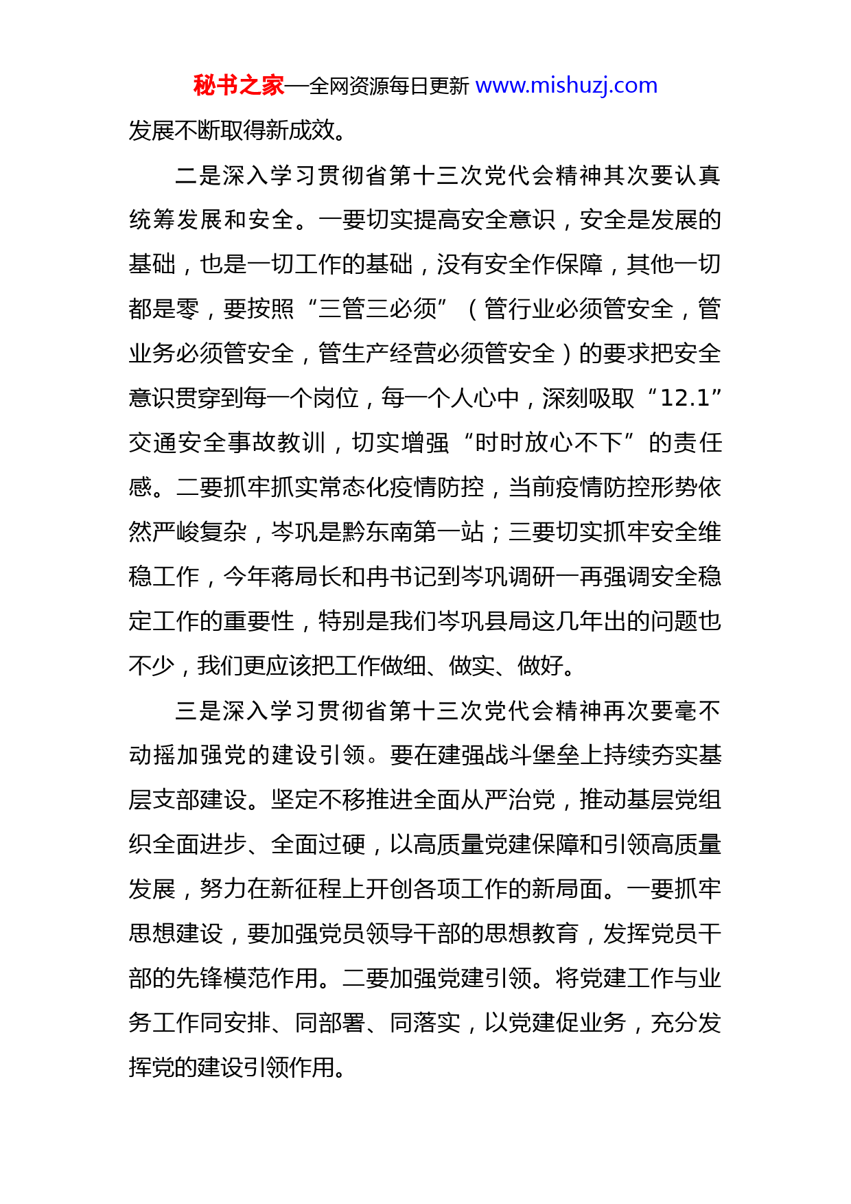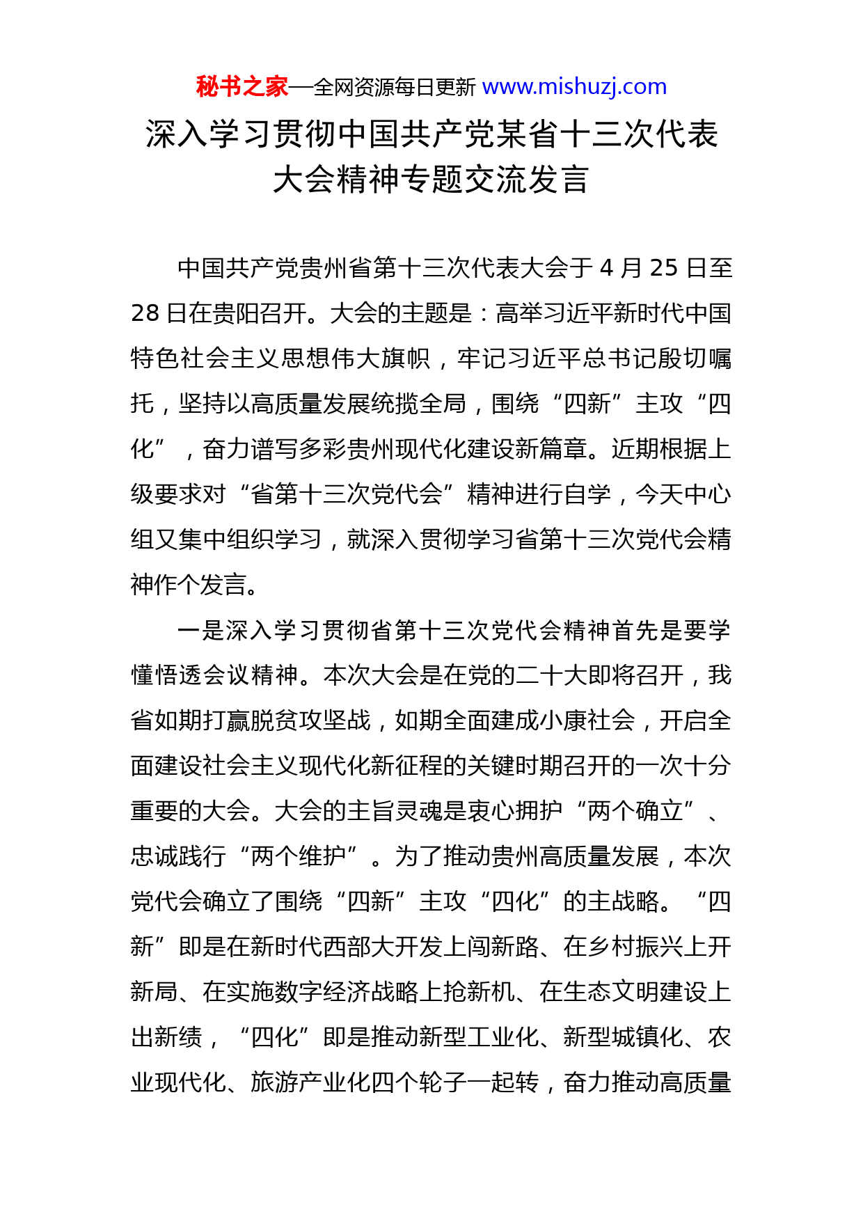 秘书之家—全网资源每日更新www.mishuzj.com深入学习贯彻中国共产党某省十三次代表大会精神专题交流发言中国共产党贵州省第十三次代表大会于4月25日至28日在贵阳召开。大会的主题是:高举习近平新时代中国特色社会主义思想伟大旗帜,牢记习近平总书记殷切嘱托,坚持以高质量发展统揽全局,围绕“四新”主攻“四化”,奋力谱写多彩贵州现代化建设新篇章。近期根据上级要求对“省第十三次党代会”精神进行自学,今天中心组又集中组织学习,就深入贯彻学习省第十三次党代会精神作个发言。一是深入学习贯彻省第十三次党代会精神首先是要学懂悟透会议精神。本次大会是在党的二十大即将召开,我省如期打赢脱贫攻坚战,如期全面建成小康社会,开启全面建设社会主义现代化新征程的关键时期召开的一次十分重要的大会。大会的主旨灵魂是衷心拥护“两个确立”、忠诚践行“两个维护”。为了推动贵州高质量发展,本次党代会确立了围绕“四新”主攻“四化”的主战略。“四新”即是在新时代西部大开发上闯新路、在乡村振兴上开新局、在实施数字经济战略上抢新机、在生态文明建设上出新绩,“四化”即是推动新型工业化、新型城镇化、农业现代化、旅游产业化四个轮子一起转,奋力推动高质量秘书之家—全网资源每日更新www.mishuzj.com发展不断取得新成效。二是深入学习贯彻省第十三次党代会精神其次要认真统筹发展和安全。一要切实提高安全意识,安全是发展的基础,也是一切工作的基础,没有安全作保障,其他一切都是零,要按照“三管三必须”(管行业必须管安全,管业务必须管安全,管生产经营必须管安全)的要求把安全意识贯穿到每一个岗位,每一个人心中,深刻吸取“12.1”交通安全事故教训,切实增强“时时放心不下”的责任感。二要抓牢抓实常态化疫情防控,当前疫情防控形势依然严峻复杂,岑巩是黔东南第一站;三要切实抓牢安全维稳工作,今年蒋局长和冉书记到岑巩调研一再强调安全稳定工作的重要性,特别是我们岑巩县局这几年出的问题也不少,我们更应该把工作做细、做实、做好。三是深入学习贯彻省第十三次党代会精神再次要毫不动摇加强党的建设引领。要在建强战斗堡垒上持续夯实基层支部建设。坚定不移推进全面从严治党,推动基层党组织全面进步、全面过硬,以高质量党建保障和引领高质量发展,努力在新征程上开创各项工作的新局面。一要抓牢思想建设,要加强党员领导干部的思想教育,发挥党员干部的先锋模范作用。二要加强党建引领。将党建工作与业务工作同安排、同部署、同落实,以党建促业务,充分发挥党的建设引领作用。秘书之家—全网资源每日更新www.mishuzj.com四是深入学习贯彻省第十三次党代会精神最后要认真落实高质量发展。一要在稳烟区、稳烟农上着力。要优化烟区布局,积极对接县人民政府相关部门,抓实基本烟田规划和保护。推动省、州《关于加强基本烟田保护的实施意见》落实落地。以培育职业烟农为抓手,控大户,提小户,稳中户,把培育40亩左右种植主体作为工作重点,进一步稳定烟农队伍。二要在抓好科技创新和生产技术落地上着力。围绕优质高产目标,强化标准化生产技术措施落地落实。加大技术推广的力度,重点围绕优良品种种植、油枯有机肥施用、深沟高垄、绿色防控、成熟采烤等关键适用技术着力推广,提升我县烟叶生产质量和整体生产水平。三要在落实生态环保责任着力。以地膜回收面源污染治理为抓手,积极推广有机肥使用,减少化肥农药使用,恢复地力;大力推广生物质烤房,减少燃煤污染排放,切实履行好XX行业社会责任。