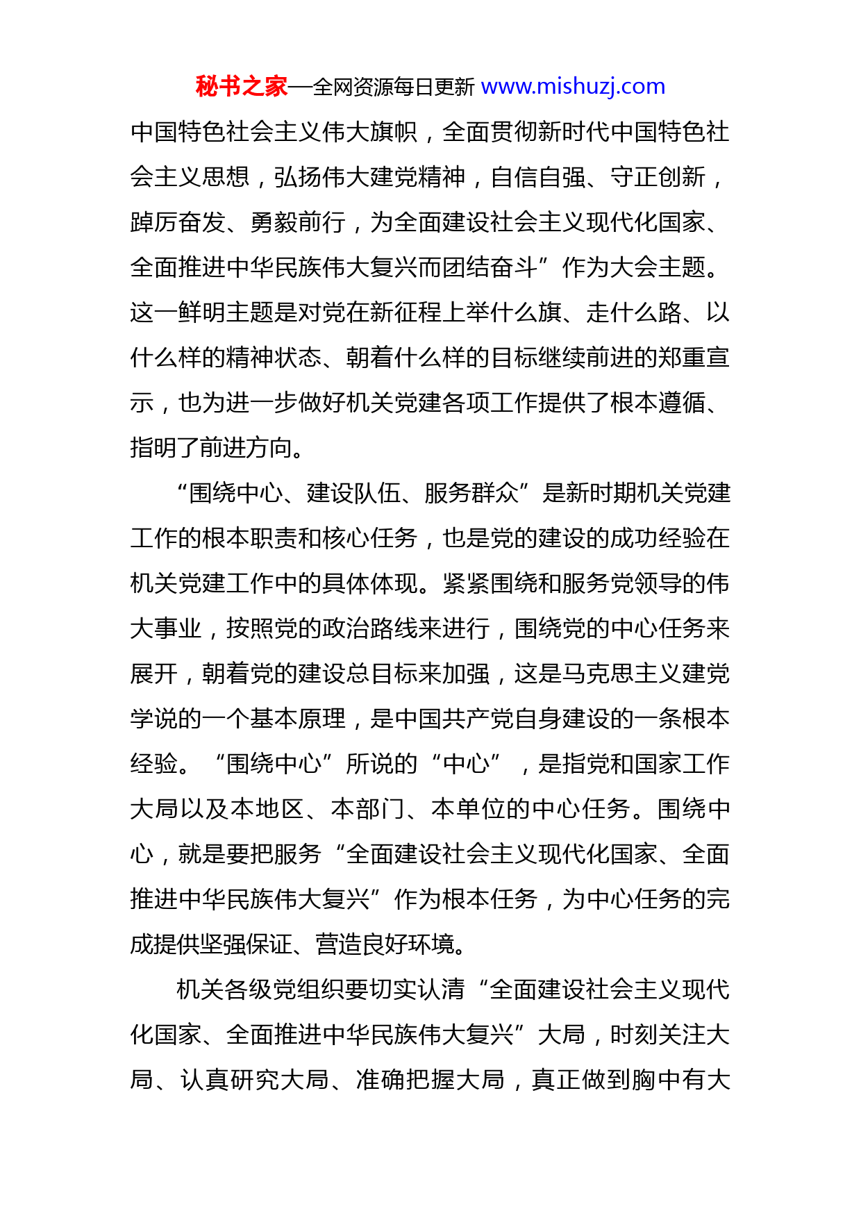 秘书之家—全网资源每日更新www.mishuzj.com党课:深入学习贯彻二十大精神扎实推进基层党建高质量发展同志们:党的二十大是在全党全国各族人民迈上全面建设社会主义现代化国家新征程、向第二个百年奋斗目标进军的关键时刻召开的一次十分重要的大会,党的二十大报告对过去十年全面从严治党工作作了总结,对未来五年工作进行了全面部署。全市各级党组(党委)要充分发挥表率作用,凝聚智慧力量,通过举办中心组(扩大)专题读书班,党支部集中学习、交流研讨,与党的二十大代表座谈,举办市级机关大讲堂,开展“点单式”党的二十大精神进机关下基层宣讲,推动市级机关深入学习领会党的二十大报告精髓内涵,兴起广泛学习宣传贯彻落实的热潮,推动党的二十大精神在XX大地落地生根。一、高举思想旗帜,把“围绕中心”作为根本要求贯穿到机关党建各个方面中国共产党作为马克思主义的忠实传播者和坚定践行者,始终坚持以科学的态度对待科学,以真理的精神追求真理,不断推进马克思主义中国化时代化。思想建党、理论强党一直是我们党的优良传统和政治优势。党之所以有力量,根本在于思想理论上的力量。党的二十大把“高举秘书之家—全网资源每日更新www.mishuzj.com中国特色社会主义伟大旗帜,全面贯彻新时代中国特色社会主义思想,弘扬伟大建党精神,自信自强、守正创新,踔厉奋发、勇毅前行,为全面建设社会主义现代化国家、全面推进中华民族伟大复兴而团结奋斗”作为大会主题。这一鲜明主题是对党在新征程上举什么旗、走什么路、以什么样的精神状态、朝着什么样的目标继续前进的郑重宣示,也为进一步做好机关党建各项工作提供了根本遵循、指明了前进方向。“围绕中心、建设队伍、服务群众”是新时期机关党建工作的根本职责和核心任务,也是党的建设的成功经验在机关党建工作中的具体体现。紧紧围绕和服务党领导的伟大事业,按照党的政治路线来进行,围绕党的中心任务来展开,朝着党的建设总目标来加强,这是马克思主义建党学说的一个基本原理,是中国共产党自身建设的一条根本经验。“围绕中心”所说的“中心”,是指党和国家工作大局以及本地区、本部门、本单位的中心任务。围绕中心,就是要把服务“全面建设社会主义现代化国家、全面推进中华民族伟大复兴”作为根本任务,为中心任务的完成提供坚强保证、营造良好环境。机关各级党组织要切实认清“全面建设社会主义现代化国家、全面推进中华民族伟大复兴”大局,时刻关注大局、认真研究大局、准确把握大局,真正做到胸中有大秘书之家—全网资源每日更新www.mishuzj.com局、工作有目标、行动有方向,有的放矢围绕中心开展工作。必须善于总结探索围绕中心的工作规律,把围绕中心作为根本要求贯穿到机关党建工作各个方面,确立“围绕中心抓党建、抓好党建促发展”的工作思路,在“融合”“渗透”“贯穿”上下功夫,将党建与业务工作有机融合起来,协调推进,相互促进,相得益彰;把党组织的教育、管理和监督等基本职责渗透到机关中心工作的方方面面,使各项任务的完成都有机关党员的身影和奉献;把机关党建工作贯穿于中心工作的全过程,使中心工作取得的每一项进展都凝聚着机关党组织的支持和努力。二、不断夯实基层基础,把“建设队伍”作为开创机关党建工作新局面的重要保证党的二十大作出了坚定不移全面从严治党、深入推进新时代党的建设新的伟大工程的重大部署。机关党建是新时代党的建设新的伟大工程的重要组成部分,“建设队伍”是新时代机关党建至关重要的一环,是打基础、利长远的根基所在。学习贯彻党的二十大精神,市级机关要聚焦更高的政治站位、以更严的工作标准,不断夯实基层基础,全面建设过硬队伍。锻造坚强有力的机关基层党组织。习近平总书记强调,各部门各单位职责分工不同,但都不是单纯的业务机关,必须牢固树立政治机关的意识。市级机关的地位和特秘书之家—全网资源每日更新www.mishuzj.com点,决定了必须加强党的政治建设。要强化基层党组织政治功能,聚焦解决基层党组织弱化、虚化、边缘化问题,大力开展对党忠诚教育,健全完善“三会一课”制度,创新开展主题党日,加强对支部党员的教育、管理、监督,进一步规范党组织设置,把带头践行“两个维护”体现在坚决贯彻落实党中央决策部署的具体行动上。要突出模范机关建设、深化党建与业务深度融合、党建共建联建、党员队伍建设等重点内容,设计、开展系列活动,搭建平台载体,不断提升机关党建服务京津冀协同发展和XX经济社会高质量发展的层次和水平,认真选树总结具有本行业本领域特色、可复制、能推广的先进典型和经验做法,深入挖掘,总结提炼,努力培育出优秀的“高质量机关党建助推高质量发展”特色品牌、服务平台和工作载体。要聚焦市级机关摊子大、类型多、职能各异的特点加强分类指导和精准施策,根据党员性别、年龄、党龄、学历等不同特征加强分层指导,根据工作推进的不同阶段、不同进度、不同情况等加强分时指导,根据市级机关、中央驻津单位、社会团体等单位的不同类型实施差异化机关党建考核,变大水漫灌为精准滴灌,持续增强机关党建的吸引力、感染力和实效性。提升广大党员干部综合素质能力。基层党组织承