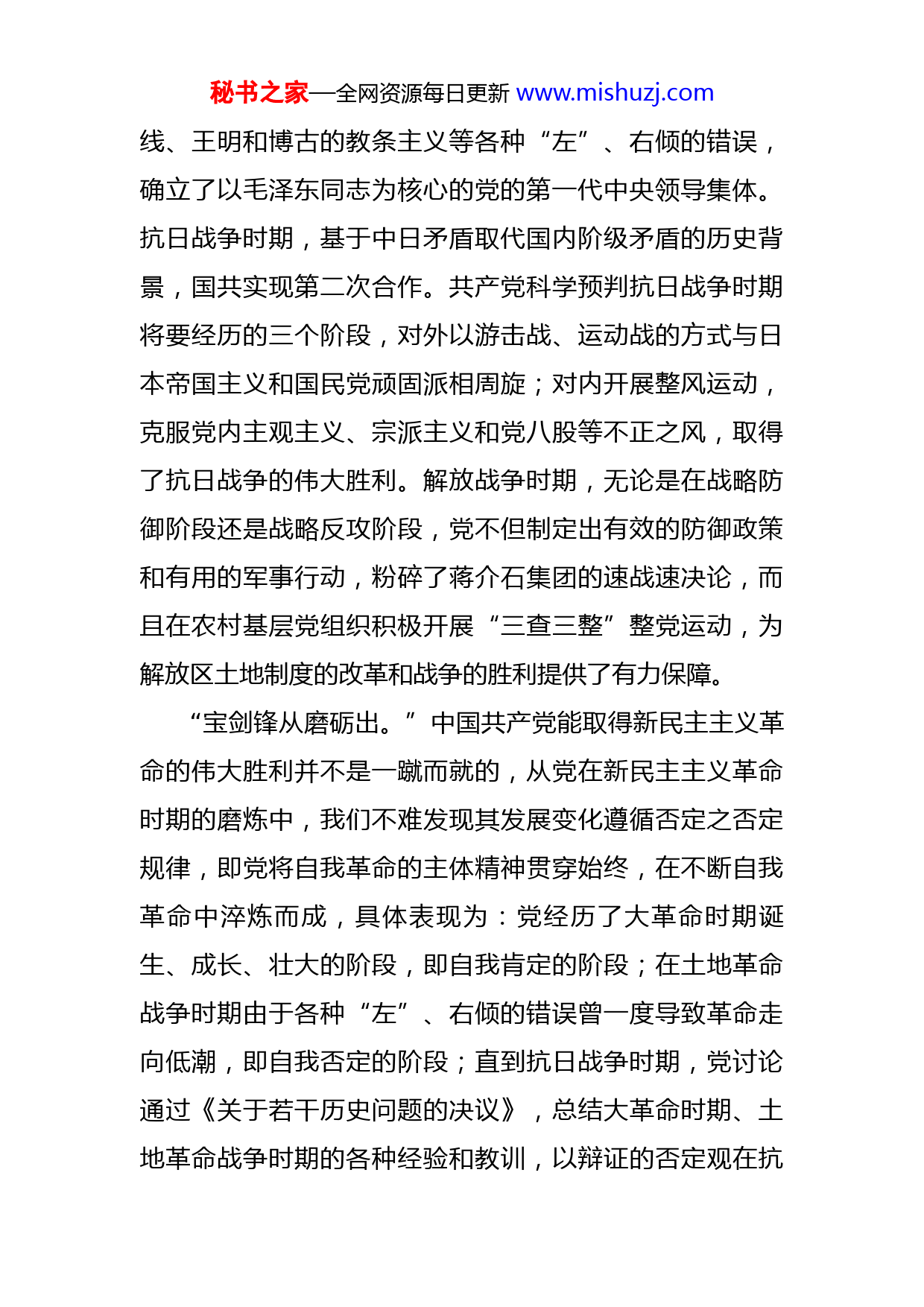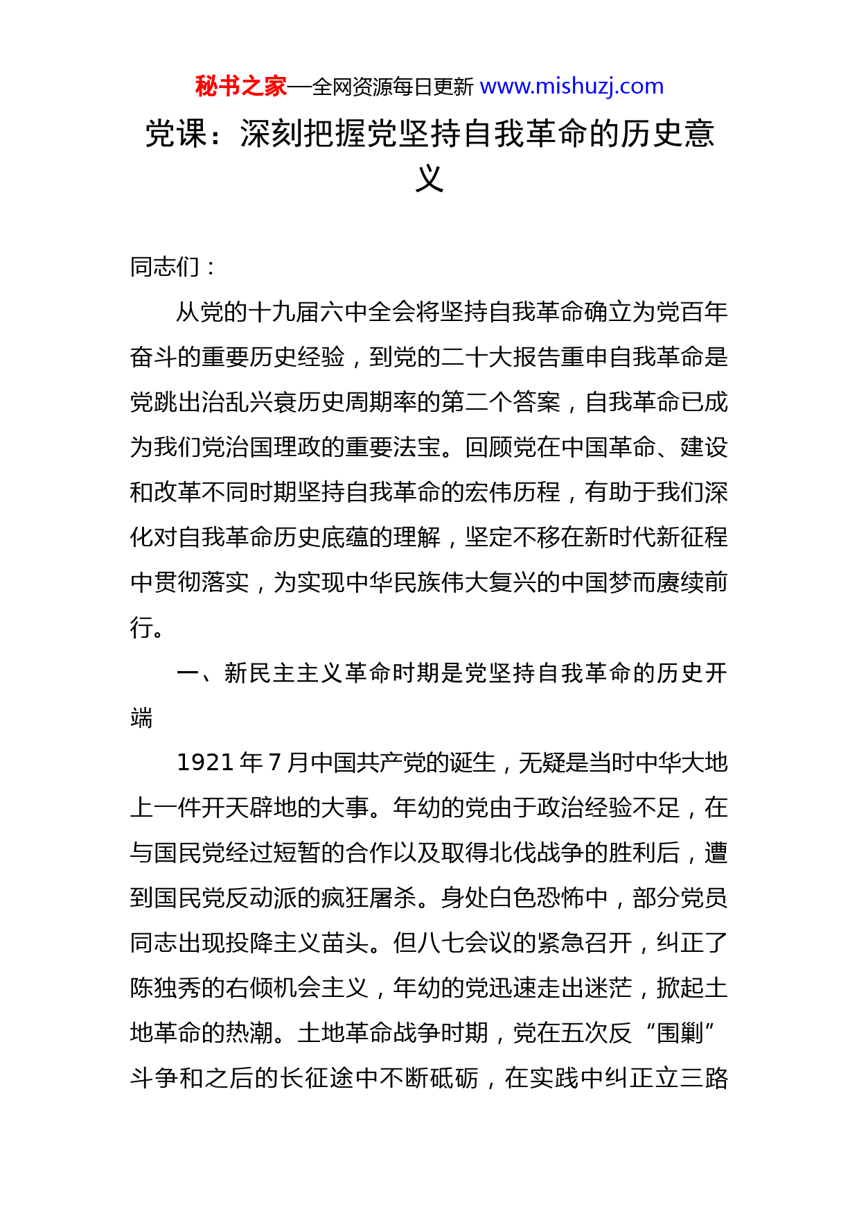 秘书之家—全网资源每日更新www.mishuzj.com党课:深刻把握党坚持自我革命的历史意义同志们:从党的十九届六中全会将坚持自我革命确立为党百年奋斗的重要历史经验,到党的二十大报告重申自我革命是党跳出治乱兴衰历史周期率的第二个答案,自我革命已成为我们党治国理政的重要法宝。回顾党在中国革命、建设和改革不同时期坚持自我革命的宏伟历程,有助于我们深化对自我革命历史底蕴的理解,坚定不移在新时代新征程中贯彻落实,为实现中华民族伟大复兴的中国梦而赓续前行。一、新民主主义革命时期是党坚持自我革命的历史开端1921年7月中国共产党的诞生,无疑是当时中华大地上一件开天辟地的大事。年幼的党由于政治经验不足,在与国民党经过短暂的合作以及取得北伐战争的胜利后,遭到国民党反动派的疯狂屠杀。身处白色恐怖中,部分党员同志出现投降主义苗头。但八七会议的紧急召开,纠正了陈独秀的右倾机会主义,年幼的党迅速走出迷茫,掀起土地革命的热潮。土地革命战争时期,党在五次反“围剿”斗争和之后的长征途中不断砥砺,在实践中纠正立三路秘书之家—全网资源每日更新www.mishuzj.com线、王明和博古的教条主义等各种“左”、右倾的错误,确立了以毛泽东同志为核心的党的第一代中央领导集体。抗日战争时期,基于中日矛盾取代国内阶级矛盾的历史背景,国共实现第二次合作。共产党科学预判抗日战争时期将要经历的三个阶段,对外以游击战、运动战的方式与日本帝国主义和国民党顽固派相周旋;对内开展整风运动,克服党内主观主义、宗派主义和党八股等不正之风,取得了抗日战争的伟大胜利。解放战争时期,无论是在战略防御阶段还是战略反攻阶段,党不但制定出有效的防御政策和有用的军事行动,粉碎了蒋介石集团的速战速决论,而且在农村基层党组织积极开展“三查三整”整党运动,为解放区土地制度的改革和战争的胜利提供了有力保障。“宝剑锋从磨砺出。”中国共产党能取得新民主主义革命的伟大胜利并不是一蹴而就的,从党在新民主主义革命时期的磨炼中,我们不难发现其发展变化遵循否定之否定规律,即党将自我革命的主体精神贯穿始终,在不断自我革命中淬炼而成,具体表现为:党经历了大革命时期诞生、成长、壮大的阶段,即自我肯定的阶段;在土地革命战争时期由于各种“左”、右倾的错误曾一度导致革命走向低潮,即自我否定的阶段;直到抗日战争时期,党讨论通过《关于若干历史问题的决议》,总结大革命时期、土地革命战争时期的各种经验和教训,以辩证的否定观在抗秘书之家—全网资源每日更新www.mishuzj.com日战争中越挫越勇,最终夺取了解放战争的全国性胜利。二、社会主义革命和建设时期、改革开放和社会主义现代化建设新时期开启党坚持自我革命的新阶段对比新民主主义革命时期的战争环境,新中国成立之后,中国共产党面临着在国内和平条件下如何从新民主主义社会迈向社会主义社会的重大挑战。一方面,党在国体和政体上确立了人民民主专政和人民代表大会制度,并采取三大改造的方式,由简到繁、从易到难,对农业、手工业和资本主义工商业进行和平改造,为我国建立社会主义制度奠定前提条件。另一方面,开展“三反”运动整顿党政机关内部出现的贪污、浪费和官僚主义,依法对以公谋私、贪污受贿的公职人员刘青山、张子善等判处死刑;发出《关于在全党全军开展整风运动的指示》,延续革命战争时期的优良作风,确保党组织的先进性、纯洁性。1981年,《关于建国以来党的若干历史问题的决议》以始终“坚持真理、修正错误”的科学态度,对新中国成立前28年进行了历史回顾,对新中国成立后32年所取得的主要成就和遭遇的重大挫折进行了社会历史的分析,为我们党进行改革开放和社会主义现代化建设开启光明的前景。“路漫漫其修远兮。”回顾党在革命战争年代通过将马克思主义与中国实际相结合,实现马克思主义中国化的第一次伟大飞跃,诞生了毛泽东思想,让中华民族由战乱走秘书之家—全网资源每日更新www.mishuzj.com向统一。在和平年代,百废待兴的中国急需通过社会主义走向工业化。党经过慎重思考,历时七年顺利完成社会主义改造,成为党在新中国成立后实现自我肯定的重要阶段。在推进社会主义建设的过程中,我们党既收获了如何建设社会主义的宝贵经验,又遭遇了十年“文革”的重大挫折,迫使党曾一度走向自我否定的阶段。但我们党在高度历史自觉中坚定历史自信,于1978年将工作重心转向经济建设,在思想上以自我革命的精神实现马克思主义中国化的第二次伟大飞跃,形成了中国特色社会主义理论体系,使中华民族迎来由站起来走向富起来的伟大转折。三、中国特色社会主义进入新时代开辟党坚持自我革命的新境界党的十八大以来,以习近平同志为主要代表的中国共产党人,将全面从严治党纳入“四个全面”战略布局之中,以党的政治建设为统领,统筹推进思想建设、组织建设、作风建设、纪律建设和制度建设,“打了一套自我革命的‘组合拳’,形成了一整套党自我净化、自我完善、自我革新、自我提高的制度规范体系。”从制度层面明确全面从严治党的总抓手,有效应对了“四大考验”所带来的挑战。如果说“四大考验”深刻阐明了新时代以来党执政所存在的客观