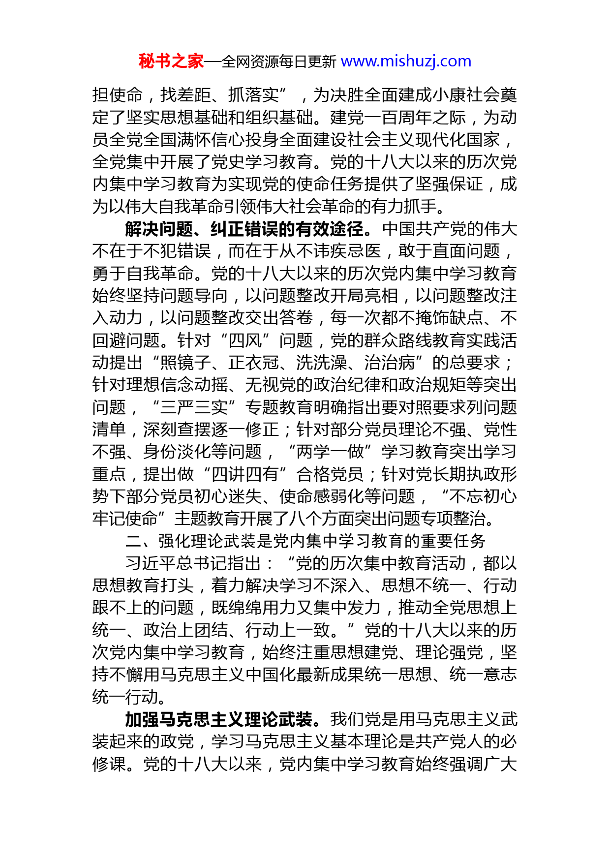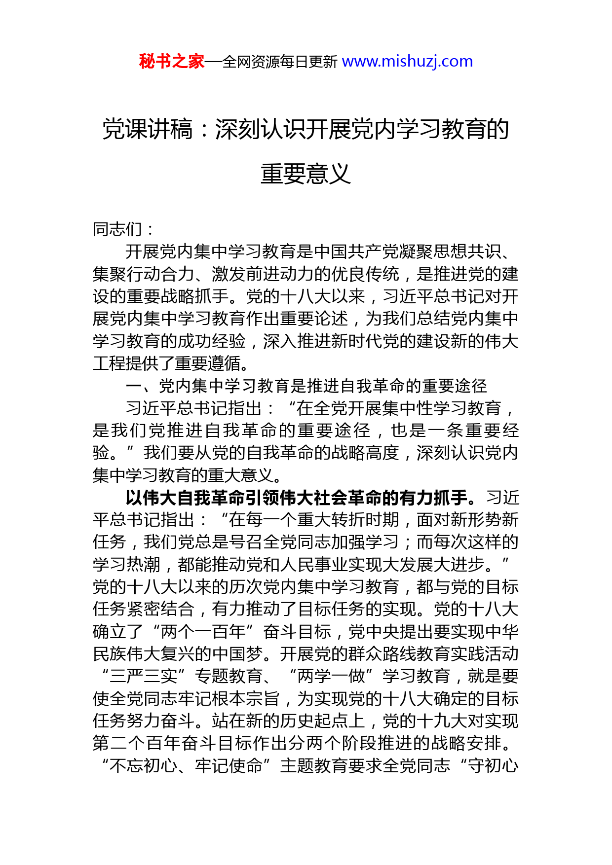 秘书之家—全网资源每日更新www.mishuzj.com党课讲稿:深刻认识开展党内学习教育的重要意义同志们:开展党内集中学习教育是中国共产党凝聚思想共识、集聚行动合力、激发前进动力的优良传统,是推进党的建设的重要战略抓手。党的十八大以来,习近平总书记对开展党内集中学习教育作出重要论述,为我们总结党内集中学习教育的成功经验,深入推进新时代党的建设新的伟大工程提供了重要遵循。一、党内集中学习教育是推进自我革命的重要途径习近平总书记指出:“在全党开展集中性学习教育,是我们党推进自我革命的重要途径,也是一条重要经验。”我们要从党的自我革命的战略高度,深刻认识党内集中学习教育的重大意义。以伟大自我革命引领伟大社会革命的有力抓手。习近平总书记指出:“在每一个重大转折时期,面对新形势新任务,我们党总是号召全党同志加强学习;而每次这样的学习热潮,都能推动党和人民事业实现大发展大进步。”党的十八大以来的历次党内集中学习教育,都与党的目标任务紧密结合,有力推动了目标任务的实现。党的十八大确立了“两个一百年”奋斗目标,党中央提出要实现中华民族伟大复兴的中国梦。开展党的群众路线教育实践活动“三严三实”专题教育、“两学一做”学习教育,就是要使全党同志牢记根本宗旨,为实现党的十八大确定的目标任务努力奋斗。站在新的历史起点上,党的十九大对实现第二个百年奋斗目标作出分两个阶段推进的战略安排。“不忘初心、牢记使命”主题教育要求全党同志“守初心秘书之家—全网资源每日更新www.mishuzj.com担使命,找差距、抓落实”,为决胜全面建成小康社会奠定了坚实思想基础和组织基础。建党一百周年之际,为动员全党全国满怀信心投身全面建设社会主义现代化国家,全党集中开展了党史学习教育。党的十八大以来的历次党内集中学习教育为实现党的使命任务提供了坚强保证,成为以伟大自我革命引领伟大社会革命的有力抓手。解决问题、纠正错误的有效途径。中国共产党的伟大不在于不犯错误,而在于从不讳疾忌医,敢于直面问题,勇于自我革命。党的十八大以来的历次党内集中学习教育始终坚持问题导向,以问题整改开局亮相,以问题整改注入动力,以问题整改交出答卷,每一次都不掩饰缺点、不回避问题。针对“四风”问题,党的群众路线教育实践活动提出“照镜子、正衣冠、洗洗澡、治治病”的总要求;针对理想信念动摇、无视党的政治纪律和政治规矩等突出问题,“三严三实”专题教育明确指出要对照要求列问题清单,深刻查摆逐一修正;针对部分党员理论不强、党性不强、身份淡化等问题,“两学一做”学习教育突出学习重点,提出做“四讲四有”合格党员;针对党长期执政形势下部分党员初心迷失、使命感弱化等问题,“不忘初心牢记使命”主题教育开展了八个方面突出问题专项整治。二、强化理论武装是党内集中学习教育的重要任务习近平总书记指出:“党的历次集中教育活动,都以思想教育打头,着力解决学习不深入、思想不统一、行动跟不上的问题,既绵绵用力又集中发力,推动全党思想上统一、政治上团结、行动上一致。”党的十八大以来的历次党内集中学习教育,始终注重思想建党、理论强党,坚持不懈用马克思主义中国化最新成果统一思想、统一意志统一行动。加强马克思主义理论武装。我们党是用马克思主义武装起来的政党,学习马克思主义基本理论是共产党人的必修课。党的十八大以来,党内集中学习教育始终强调广大秘书之家—全网资源每日更新www.mishuzj.com党员干部要学好用好马克思主义经典著作,熟读精思、学深悟透,熟练掌握马克思主义立场、观点、方法,不断提高马克思主义理论素养。中共中央政治局多次以马克思主义理论为题,带头集体学习马克思主义哲学、政治经济学科学社会主义等方面的内容,带领全党形成了学习马克思主义基本理论的浓厚氛围。广大党员干部全面系统学、及时跟进学、深入思考学、联系实际学,在重温经典中追溯理论源头、感悟真理力量,提高了运用马克思主义基本原理解决当代中国实际问题的能力。用党的创新理论武装全党。理论创新每前进一步,理论武装就要跟进一步。习近平新时代中国特色社会主义思想实现了马克思主义中国化时代化新的飞跃,学深悟透这一思想的精髓要义,是党的十八大以来开展党内集中学习教育的重中之重。党的十八大以来,党内集中学习教育坚持以习近平新时代中国特色社会主义思想为指引,深入阐释习近平新时代中国特色社会主义思想的核心要义、精神实质、丰富内涵、实践要求。全党同志在学习中深刻领悟“两个确立”的决定性意义,增强“四个意识”、坚定“四个自信”、做到“两个维护”,确保全党始终团结成“一块坚硬的钢铁”。同时,党的十八大以来,历次党内集中学习教育突出强调全党要加强学习党的路线方针政策切实把思想和行动统一到各项决策部署上来。全党同志深入学习党章,逐条逐句通读党章,全面理解党的路线方针政策;及时跟进学习决胜全面建成小康社会等重大决策部署,有力推动了党的路线方针政策落地生根。三、砥砺初心使命是党内集中学习教育的根本目的习近平总书记指出:“党的十八大以来,我们先后开展一系列集中学习教育,一个重