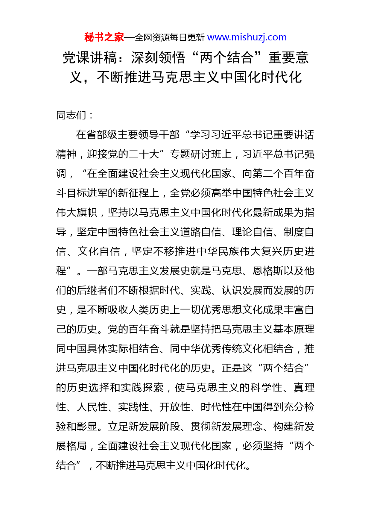 秘书之家—全网资源每日更新www.mishuzj.com党课讲稿:深刻领悟“两个结合”重要意义,不断推进马克思主义中国化时代化同志们:在省部级主要领导干部“学习习近平总书记重要讲话精神,迎接党的二十大”专题研讨班上,习近平总书记强调,“在全面建设社会主义现代化国家、向第二个百年奋斗目标进军的新征程上,全党必须高举中国特色社会主义伟大旗帜,坚持以马克思主义中国化时代化最新成果为指导,坚定中国特色社会主义道路自信、理论自信、制度自信、文化自信,坚定不移推进中华民族伟大复兴历史进程”。一部马克思主义发展史就是马克思、恩格斯以及他们的后继者们不断根据时代、实践、认识发展而发展的历史,是不断吸收人类历史上一切优秀思想文化成果丰富自己的历史。党的百年奋斗就是坚持把马克思主义基本原理同中国具体实际相结合、同中华优秀传统文化相结合,推进马克思主义中国化时代化的历史。正是这“两个结合”的历史选择和实践探索,使马克思主义的科学性、真理性、人民性、实践性、开放性、时代性在中国得到充分检验和彰显。立足新发展阶段、贯彻新发展理念、构建新发展格局,全面建设社会主义现代化国家,必须坚持“两个结合”,不断推进马克思主义中国化时代化。秘书之家—全网资源每日更新www.mishuzj.com一、坚持“两个结合”,推进马克思主义中国化时代化的历史成就百年来,党坚持把马克思主义写在自己的旗帜上,不断推进马克思主义中国化时代化,在“两个结合”中充分吸收人类创造的一切优秀文明成果,坚持以“中国化”和“化中国”并举,用马克思主义中国化的科学理论引领伟大实践,在四个历史时期取得了一系列伟大历史成就。在新民主主义革命“两个结合”的初步探索中,实现了马克思主义中国化的第一次历史性飞跃,引领中华民族真正站起来。马克思主义诞生在欧洲,之所以传入中国后能够得到中国人民的理解和认同,转变为彻底改变中华民族前途命运的物质力量,归根结底在于以毛泽东同志为主要代表的中国共产党人,坚持把马克思主义基本原理同中国具体实际相结合,使马克思主义立足中华文化的精神土壤、依托中国社会的发展实践、满足中国人民的迫切需要、指明中华民族的前进方向。这样的历史选择不是自然而然发生的,而是在经过了多次挫折甚至付出巨大牺牲的艰辛探索过程中完成的。毛泽东指出要反对本本主义、教条主义,强调“马克思列宁主义之箭,必须用了去射中国革命之的”,真正实现了马克思主义同中国的具体环境和特点等充分结合。在社会主义革命和建设时期“两个结合”的历史求索秘书之家—全网资源每日更新www.mishuzj.com中,实现了毛泽东思想的丰富和拓展,为党和人民的社会主义现代化建设事业发展提供了科学指引。在此时期,中国共产党人面对的最大实际就是,实现从新民主主义到社会主义的转变,进行社会主义革命,推进社会主义建设。基于对中国具体实际的深刻把握,党的八大根据我国社会主义改造基本完成后的形势,正确分析了我国社会主要矛盾,并以主要矛盾的判断推进了主要任务的历史发展进程。毛泽东提出要把马克思列宁主义基本原理同中国具体实际进行“第二次结合”,走出一条适合我国国情的工业化道路,努力把我国逐步建设成为“四个现代化”的社会主义强国等重要思想,在社会主义现代化探索方面留下了一系列积极成果。在改革开放和社会主义现代化建设新时期“两个结合”的深入拓展中,实现了马克思主义中国化新的飞跃。以邓小平同志为主要代表的中国共产党人破除思想僵化、迷信盛行的本本主义,围绕着什么是社会主义,怎样建设社会主义这一根本问题,作出把党和国家工作重点转移到经济建设上来、实行改革开放的历史性决策,实现了新中国成立以来党的历史上具有深远意义的伟大转折,在求索中创立了邓小平理论,提出“把马克思主义的普遍真理同我国的具体实际结合起来,走自己的道路,建设有中国特色的社会主义”的科学论断。以江泽民同志为主要代表的秘书之家—全网资源每日更新www.mishuzj.com中国共产党人形成了“三个代表”重要思想,以胡锦涛同志为主要代表的中国共产党人形成了科学发展观,继续推进中国特色社会主义的伟大事业。中国特色社会主义理论体系科学回答了建设中国特色社会主义的发展道路、发展阶段、根本任务、发展动力、发展战略、政治保证、祖国统一、外交和国际战略、领导力量和依靠力量等一系列基本问题,实现了马克思主义中国化新的飞跃,中国大踏步赶上了时代。在中国特色社会主义进入新时代“两个结合”的凝练升华中,实现了马克思主义中国化新的飞跃,中华民族迎来了从站起来、富起来到强起来的伟大飞跃。党的十八大以来,中国社会的主要矛盾发生了深刻变化,“东升西降”的世界百年变局也带来了许多新的机遇和挑战。以习近平同志为主要代表的中国共产党人从新的历史实际出发,统筹国内国际两个大局,坚持“两个结合”,将中华优秀传统文化视为“文化血脉”和“精神命脉”,就新时代坚持和发展什么样的中国特色社会主义、怎样坚持和发展中国特色社会主义,建设什么样的社会主义现代化强国、怎样建设社会主义现代化强国,建设什么样的长期执政的马克思主义政党、