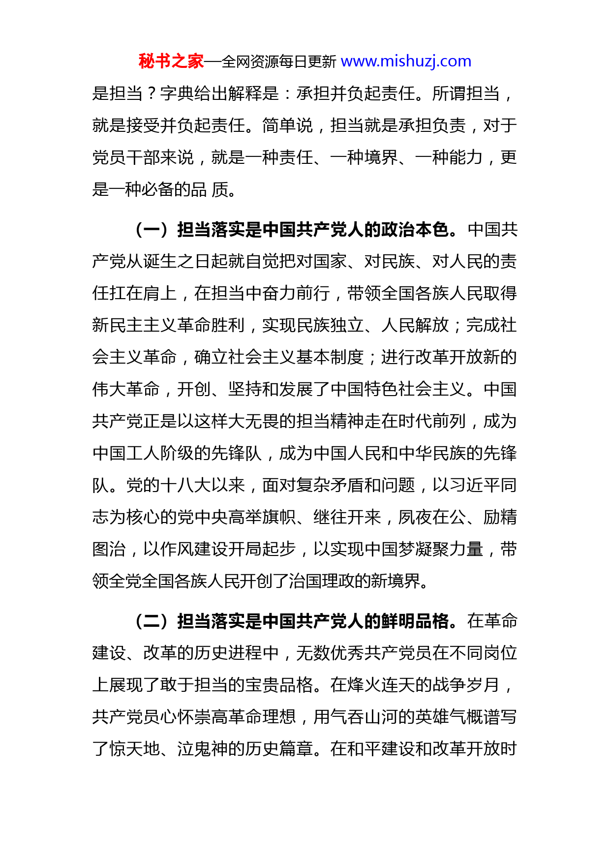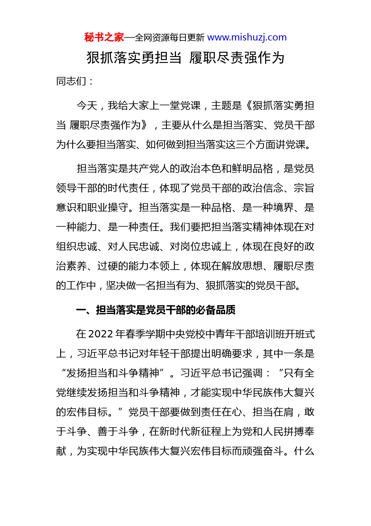 秘书之家—全网资源每日更新www.mishuzj.com狠抓落实勇担当履职尽责强作为同志们:今天,我给大家上一堂党课,主题是《狠抓落实勇担当履职尽责强作为》,主要从什么是担当落实、党员干部为什么要担当落实、如何做到担当落实这三个方面讲党课。担当落实是共产党人的政治本色和鲜明品格,是党员领导干部的时代责任,体现了党员干部的政治信念、宗旨意识和职业操守。担当落实是一种品格、是一种境界、是一种能力、是一种责任。我们要把担当落实精神体现在对组织忠诚、对人民忠诚、对岗位忠诚上,体现在良好的政治素养、过硬的能力本领上,体现在解放思想、履职尽责的工作中,坚决做一名担当有为、狠抓落实的党员干部。一、担当落实是党员干部的必备品质在2022年春季学期中央党校中青年干部培训班开班式上,习近平总书记对年轻干部提出明确要求,其中一条是“发扬担当和斗争精神”。习近平总书记强调:“只有全党继续发扬担当和斗争精神,才能实现中华民族伟大复兴的宏伟目标。”党员干部要做到责任在心、担当在肩,敢于斗争、善于斗争,在新时代新征程上为党和人民拼搏奉献,为实现中华民族伟大复兴宏伟目标而顽强奋斗。什么秘书之家—全网资源每日更新www.mishuzj.com是担当?字典给出解释是:承担并负起责任。所谓担当,就是接受并负起责任。简单说,担当就是承担负责,对于党员干部来说,就是一种责任、一种境界、一种能力,更是一种必备的品质。(一)担当落实是中国共产党人的政治本色。中国共产党从诞生之日起就自觉把对国家、对民族、对人民的责任扛在肩上,在担当中奋力前行,带领全国各族人民取得新民主主义革命胜利,实现民族独立、人民解放;完成社会主义革命,确立社会主义基本制度;进行改革开放新的伟大革命,开创、坚持和发展了中国特色社会主义。中国共产党正是以这样大无畏的担当精神走在时代前列,成为中国工人阶级的先锋队,成为中国人民和中华民族的先锋队。党的十八大以来,面对复杂矛盾和问题,以习近平同志为核心的党中央高举旗帜、继往开来,夙夜在公、励精图治,以作风建设开局起步,以实现中国梦凝聚力量,带领全党全国各族人民开创了治国理政的新境界。(二)担当落实是中国共产党人的鲜明品格。在革命建设、改革的历史进程中,无数优秀共产党员在不同岗位上展现了敢于担当的宝贵品格。在烽火连天的战争岁月,共产党员心怀崇高革命理想,用气吞山河的英雄气概谱写了惊天地、泣鬼神的历史篇章。在和平建设和改革开放时秘书之家—全网资源每日更新www.mishuzj.com期,广大共产党员同样表现出敢为人先的担当精神,哪里有困难、哪里最危险,哪里就有共产党员的身影。像李大钊、方志敏、瞿秋白、刘胡兰、董存瑞,像邱少云、黄继光、雷锋、王进喜、焦裕禄,像孔繁森、牛玉儒、杨善洲沈浩等,就是不同历史时期中国共产党人的杰出楷模。2021感动中国年度人物xx、xxx、xxx、中国航天人等,他们或在危难中逆行,或在逆境中坚守,以凡人之力,书写中国人的年度精神史诗,他们的事迹和精神永远值得人们学习。这些杰出的共产党人都拥有一个共同的优秀品格那就是担当落实。(三)担当落实是人民群众对党员干部的必然要求。习近平总书记指出:“人民群众对美好生活的向往就是我们的奋斗目标”。我们党的根本宗旨是全心全意为人民服务,我们党的利益也是人民的利益,我们党执政的目的就是实现好、维护好、发展好最广大人民的根本利益。要实现这些目的、目标,就需要我们广大党员干部敢于担当、善于担当,想群众之所想、急群众之所急,始终把党和人民的事业放在心中最高位置,时刻把人民群众装在心上,在解决群众的关切上下功夫,多干让人民满意的好事实事我们作为党员干部,凡是要为群众着想,千方百计为群众排忧解难,让人民群众共享改革发展成果。秘书之家—全网资源每日更新www.mishuzj.com二、关于担当落实方面存在的突出问题(一)思想懈怠,境界不高。思想是行动的先导,学习是行动的引擎。上个月,市委下发了关于做好“学习强国”学习平台推广使用工作的通知,绝大多数同志都能高度重视,每天认真上线学习,但个别同志学习缺乏主动性学习时间得不到保证,学习排名靠后,还需进一步抓紧抓实。专业知识学习不够,理论实践结合不紧密,比如在起草综合性文稿时过度依赖部门代为拟稿,修改材料无从下手。理论联系实际不够,对工作进展掌握不全面。(二)思路不宽,缺乏担当。在工作中,有的同志习惯于从本位主义出发,奉命行事,按部就班,凭经验搞服务,按惯例抓落实,把自己束缚在旧有的模式中,难以对领导的决策形成实质性的帮助。少数同志办文、办会、办事习惯于翻书本、文件,循规蹈矩,过去怎么办,现在怎么“搬”,拘泥于一时一事一地,满足于应付得了、过得去。有的同志在综合协调、会议活动、化解矛盾、协调关系方面患得患失,有时把责任和难题一推了之,缺乏责任和担当意识。(三)标准不高,得过且过。有的同志对工作要求不严、标准不高,满足于一般化、过得去,不求过得硬,不秘书之家—全网资源每日更新www.mishuzj.com求出精彩,但求无过,平安应付。有的同志有时对领导的意图都领悟不透,即使是领导安排了也办不到、做不好。这些问题是当前我们整个队伍中存在的问题